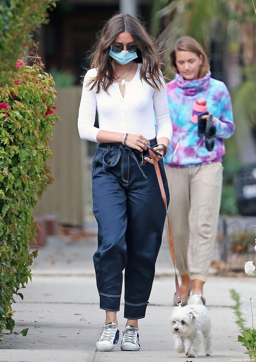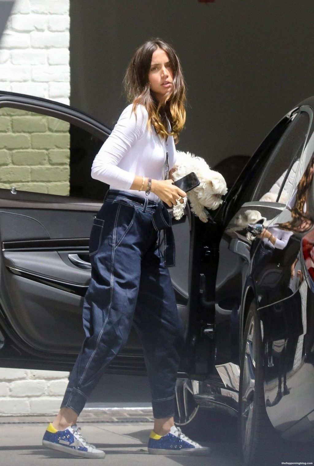 Check this out, guys! Here are a few photos of this hot brunette that some sneaky paparazzi caught while Ana de Armas took her dog for a walk! Ana de Armas arrives with her dog at Ben Affleck’s house in Brentwood, Los Angeles. Ana looks cute and relaxed in baggy jeans and a thin white shirt for her visit to her now ex-boyfriend. Ana de Armas pokies were visible through that top! Because, as usual, she wasn’t wearing a bra!