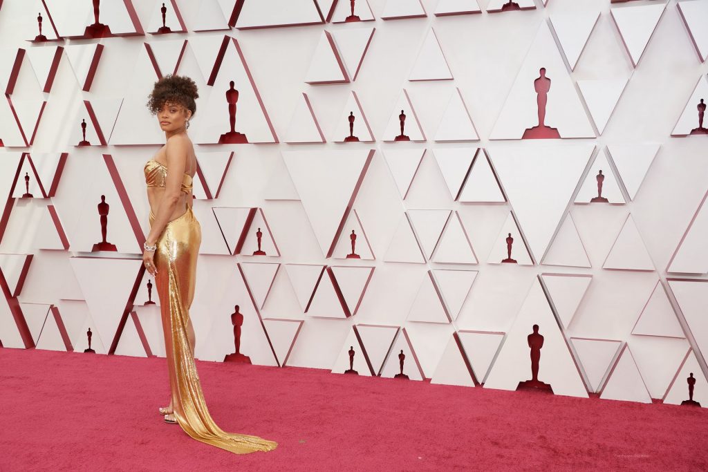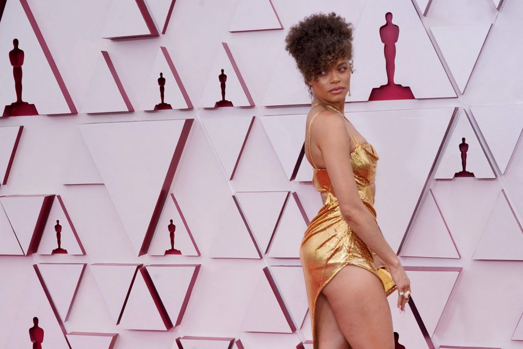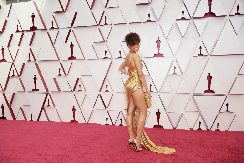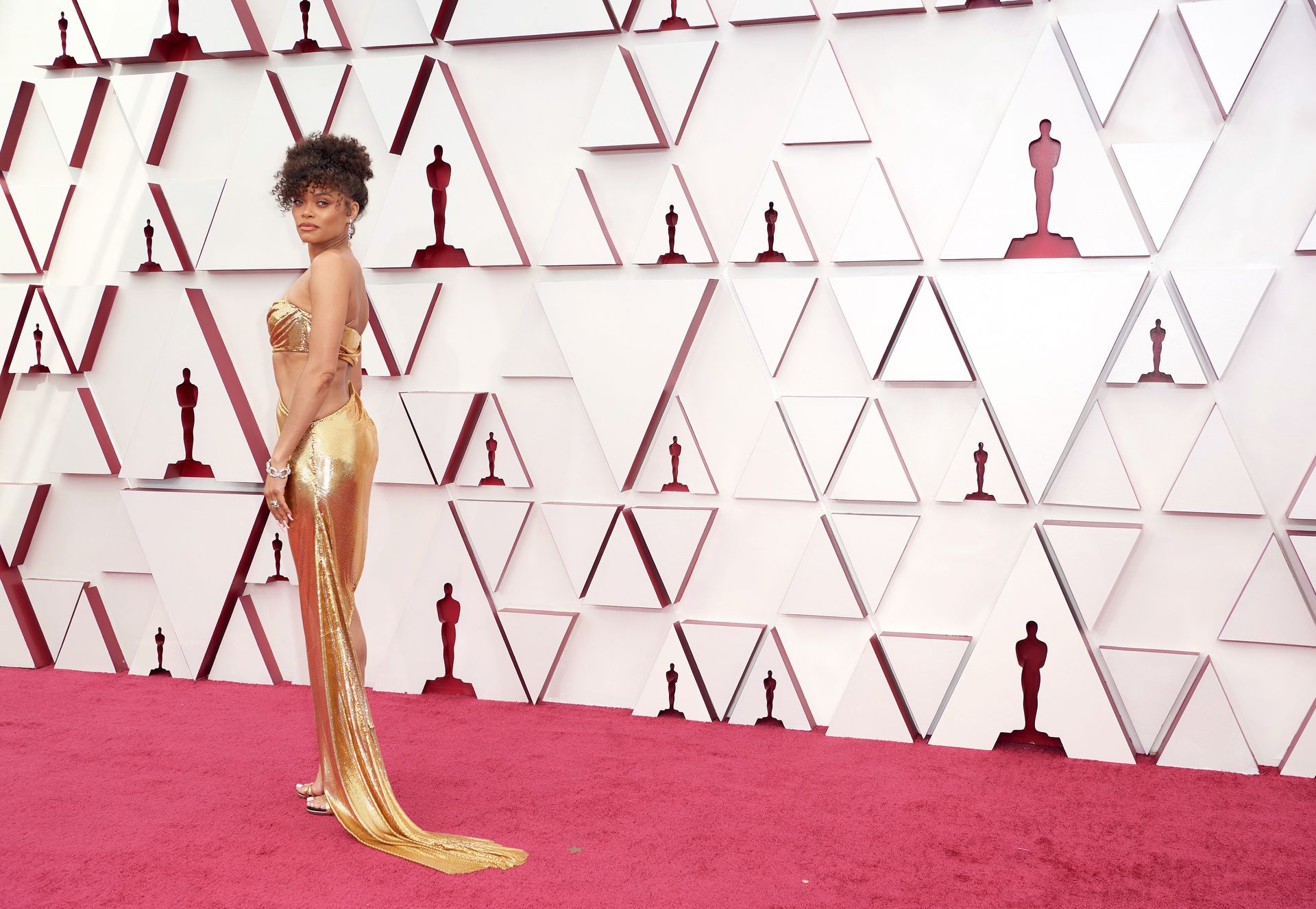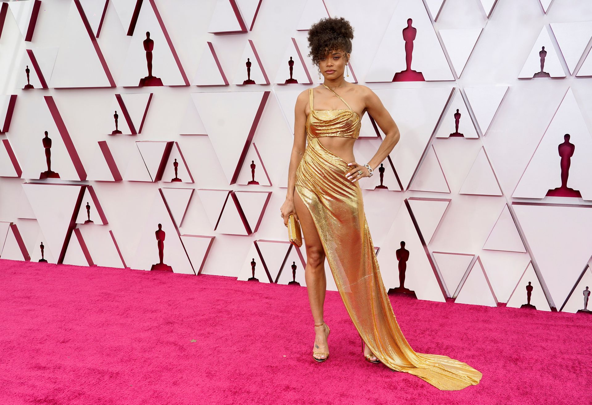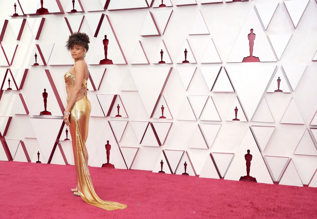 La actriz y cantante estadounidense Andra Day llega a la alfombra roja de la 93ª Entrega de los Oscars en Union Station en Los Ángeles, 25/04/2021.