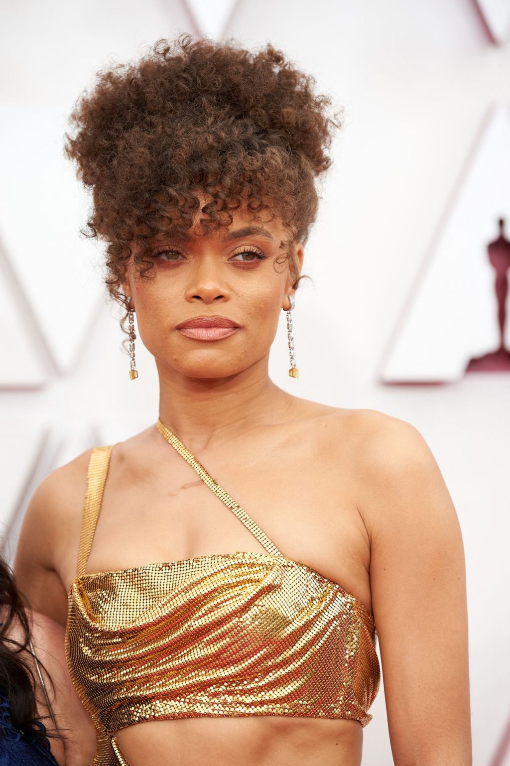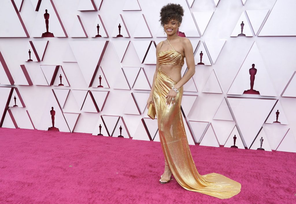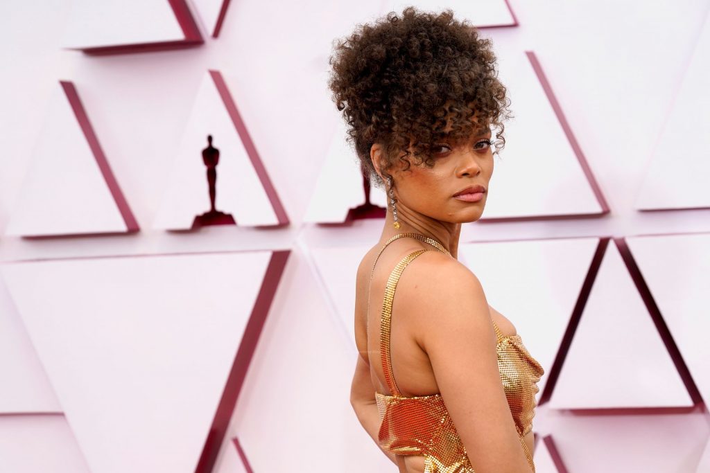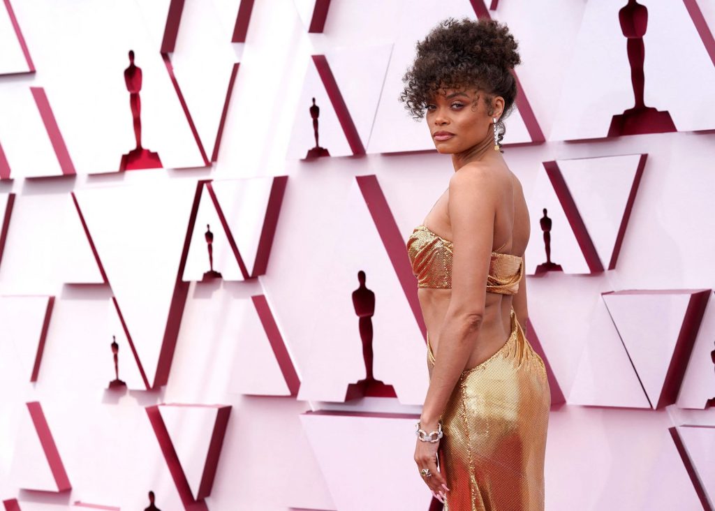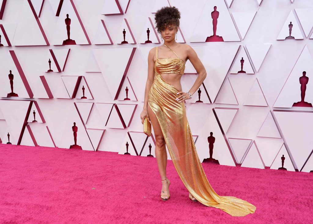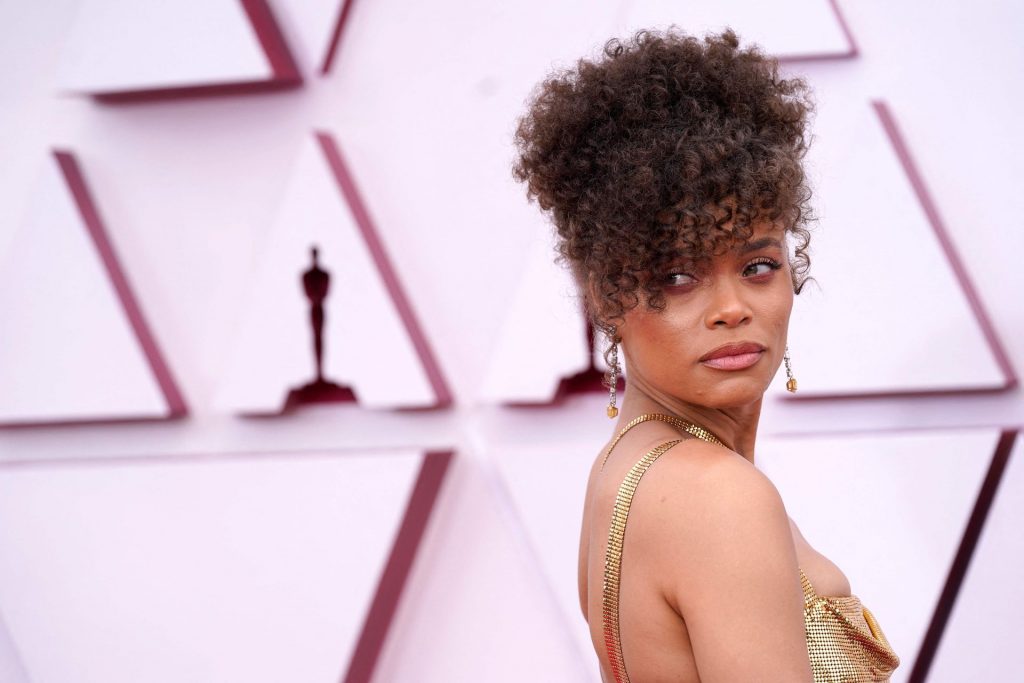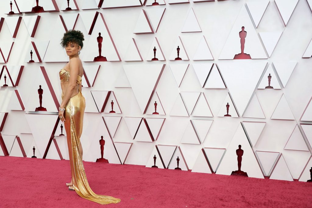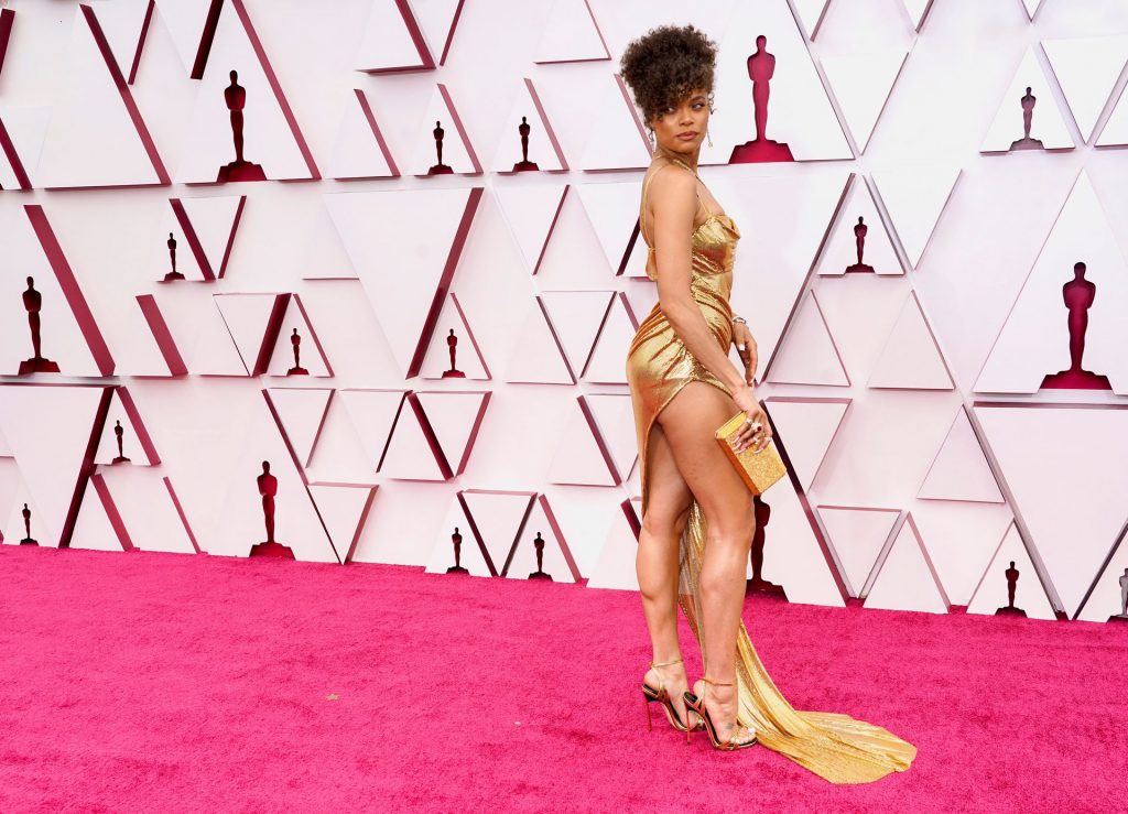 La actriz y cantante estadounidense Andra Day llega a la alfombra roja de la 93ª Entrega de los Oscars en Union Station en Los Ángeles, 25/04/2021.