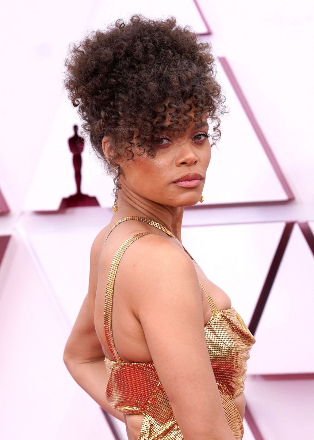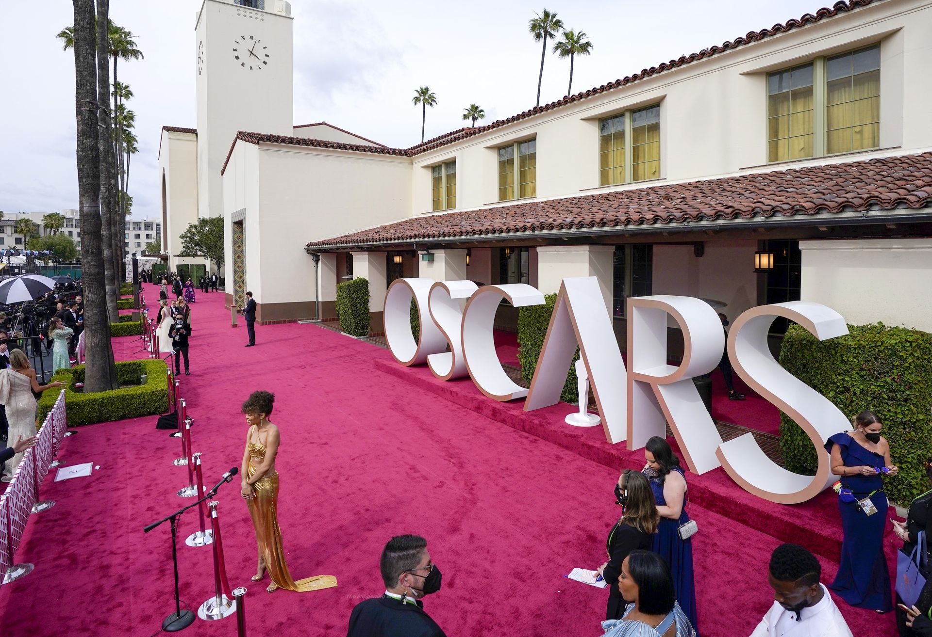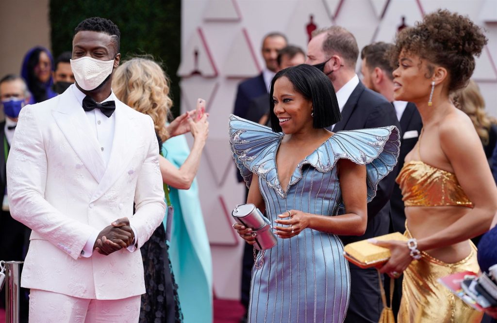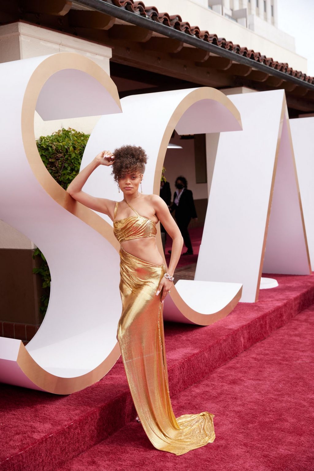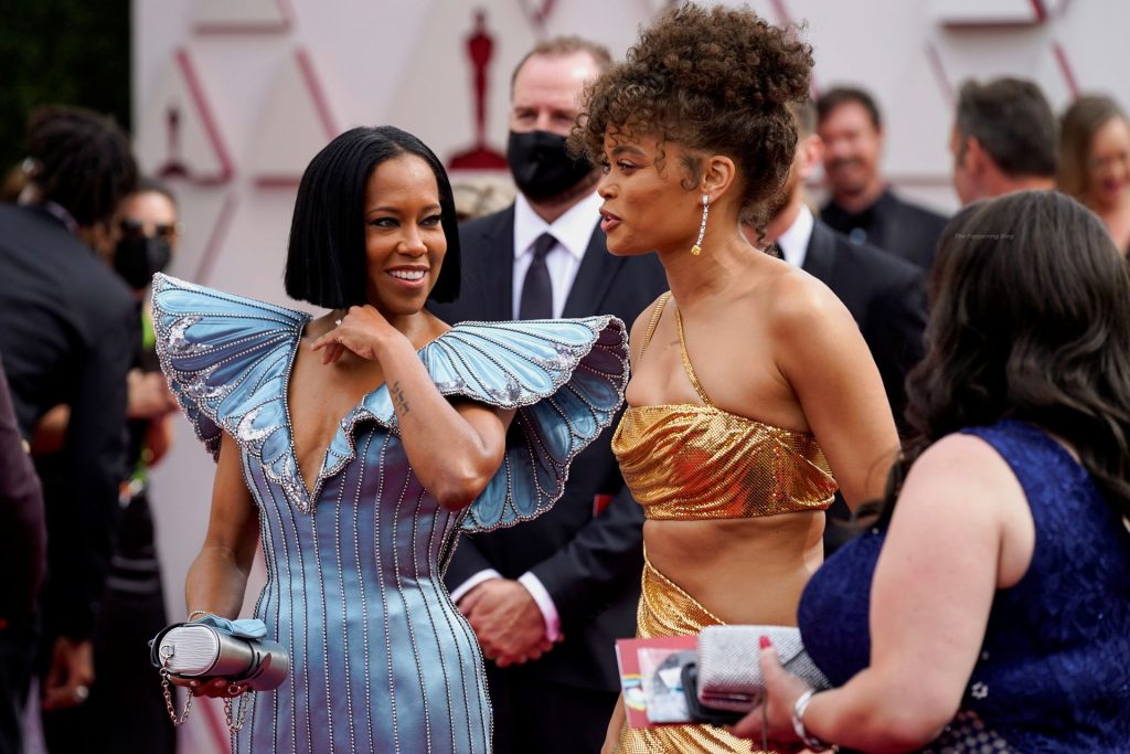 La actriz y cantante estadounidense Andra Day llega a la alfombra roja de la 93ª Entrega de los Oscars en Union Station en Los Ángeles, 25/04/2021.
