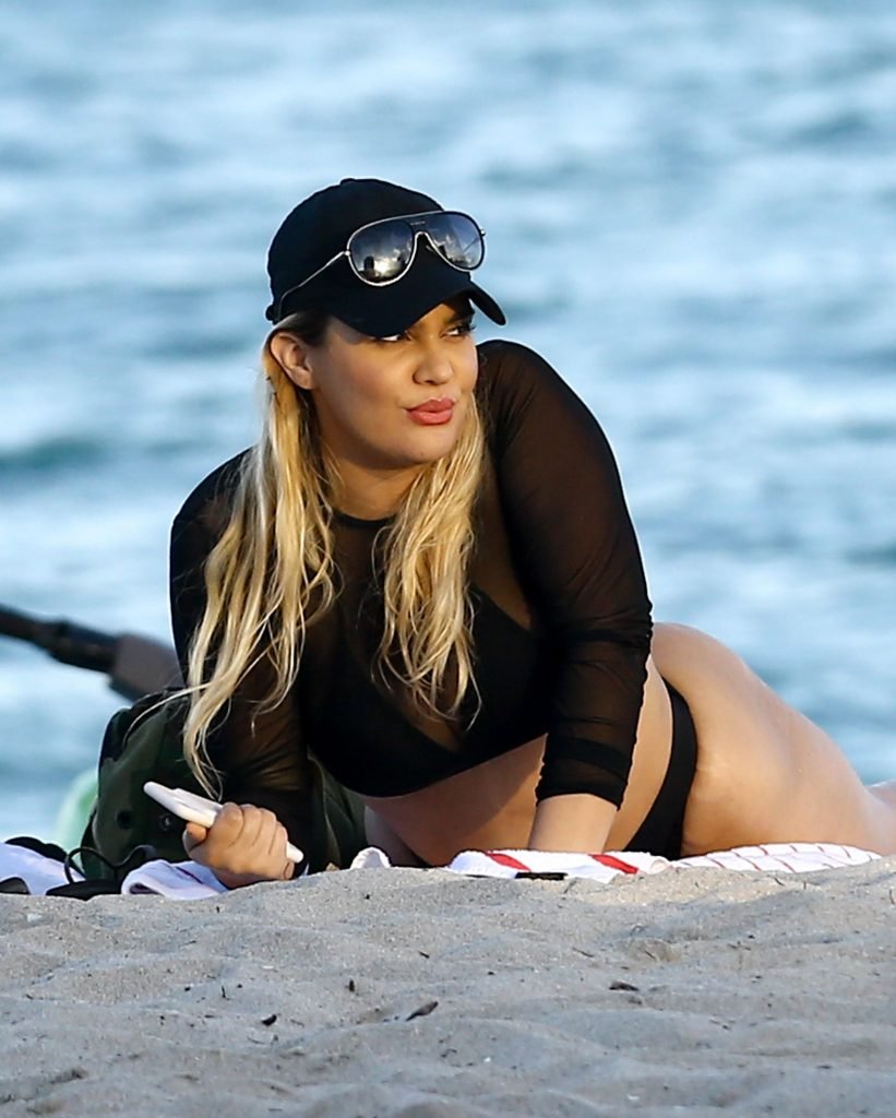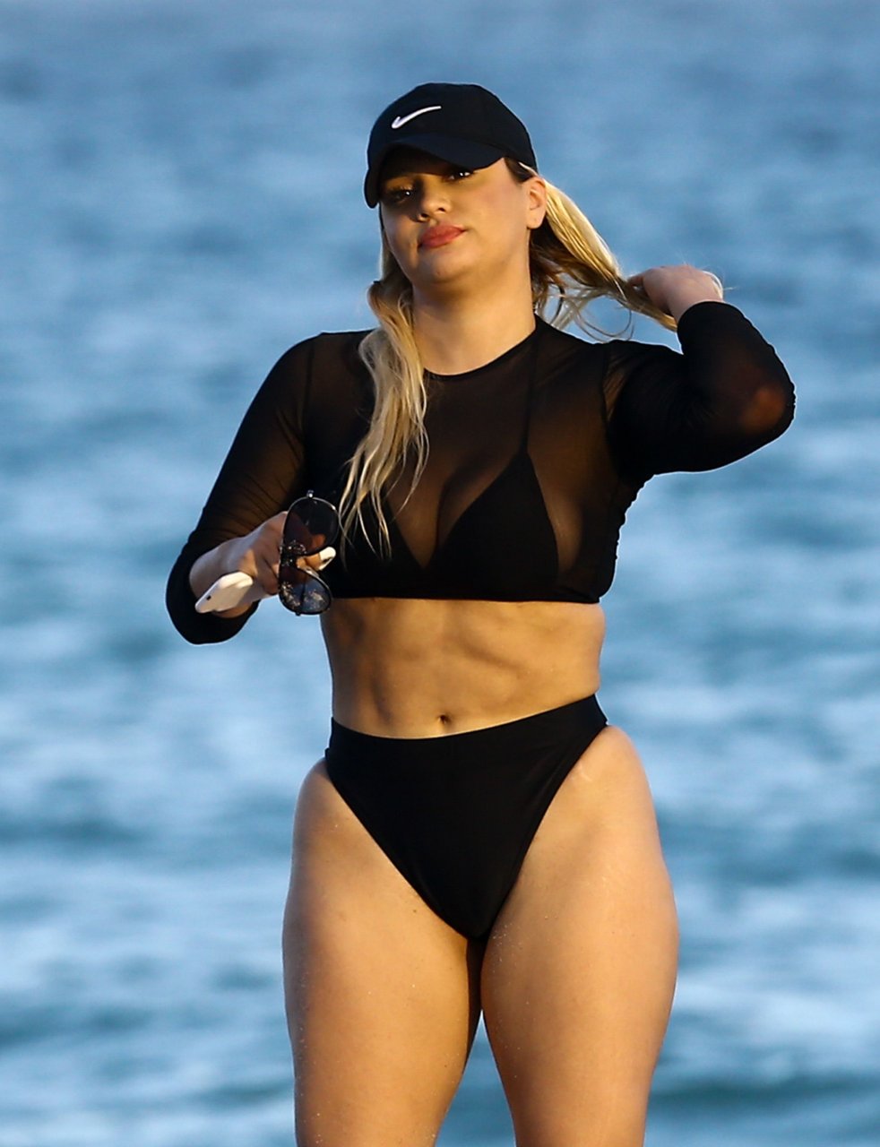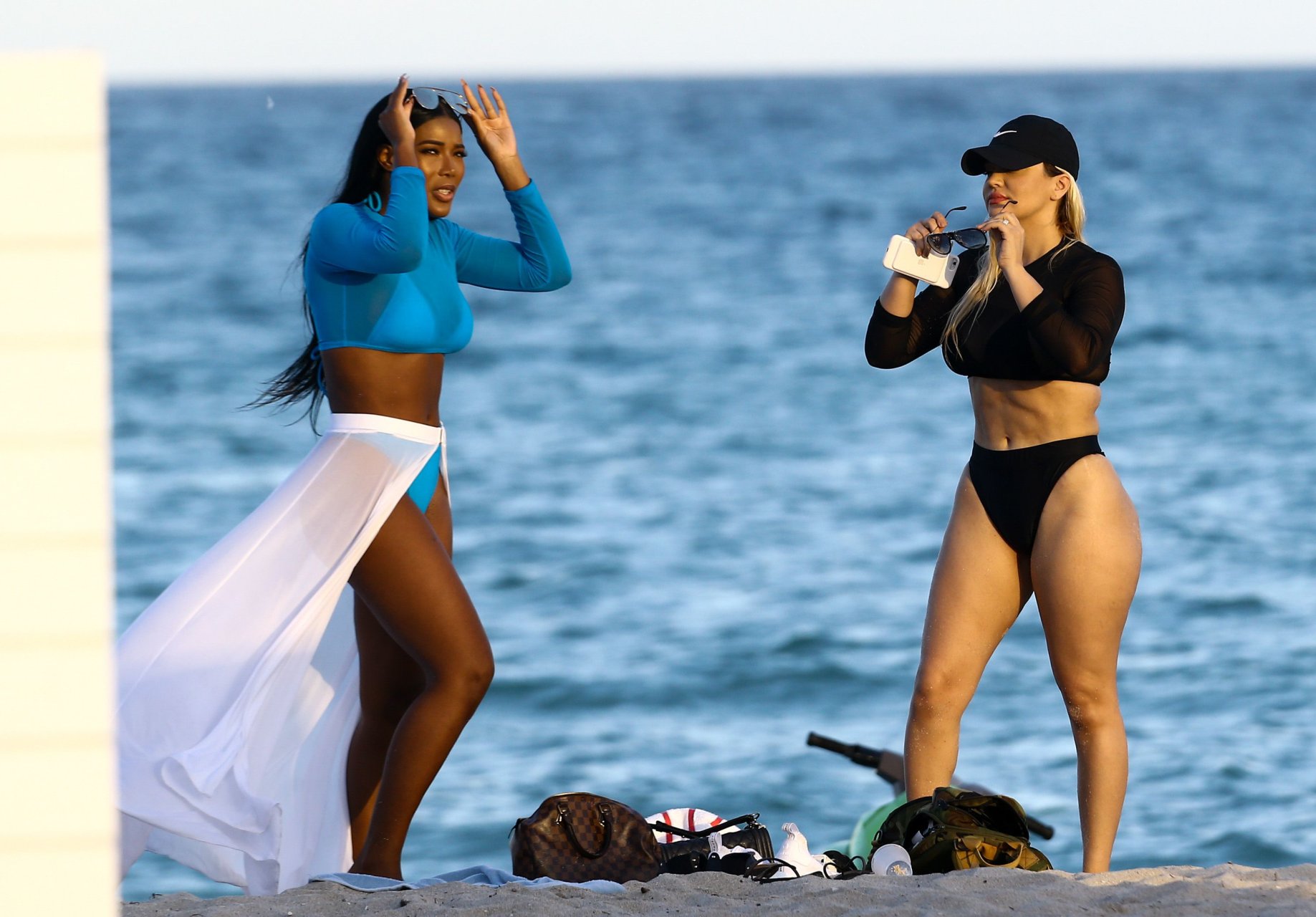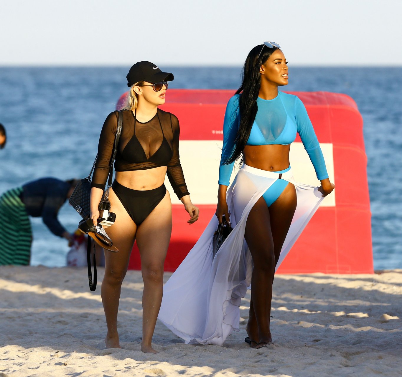Andrea Gaviria muestra su cuerpo curvilíneo con Monifa Jansen en la playa de Miami, 25/02/2017. Andrea Gaviria es una modelo estadounidense y propietaria de OMG swimwear. Edad: 26