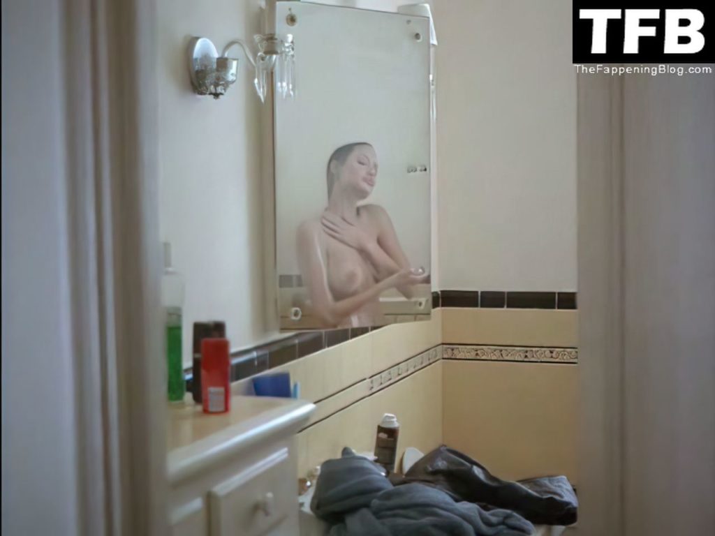 Angelina Jolie se está quitando el sujetador y las bragas frente a un hombre, y luego tenemos una buena vista de sus pechos mientras se ducha sin parte superior y vemos el reflejo en el espejo del baño.