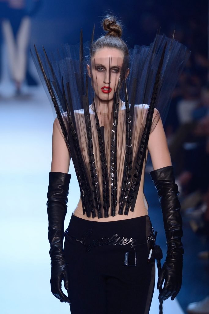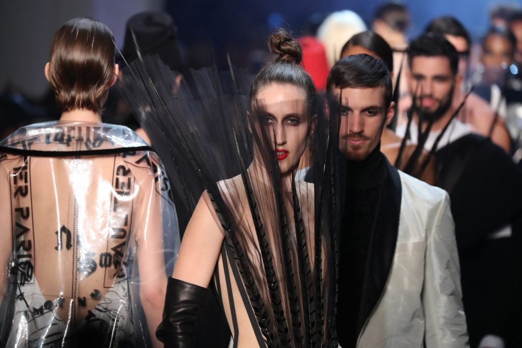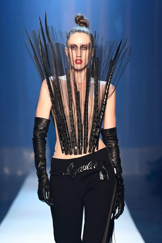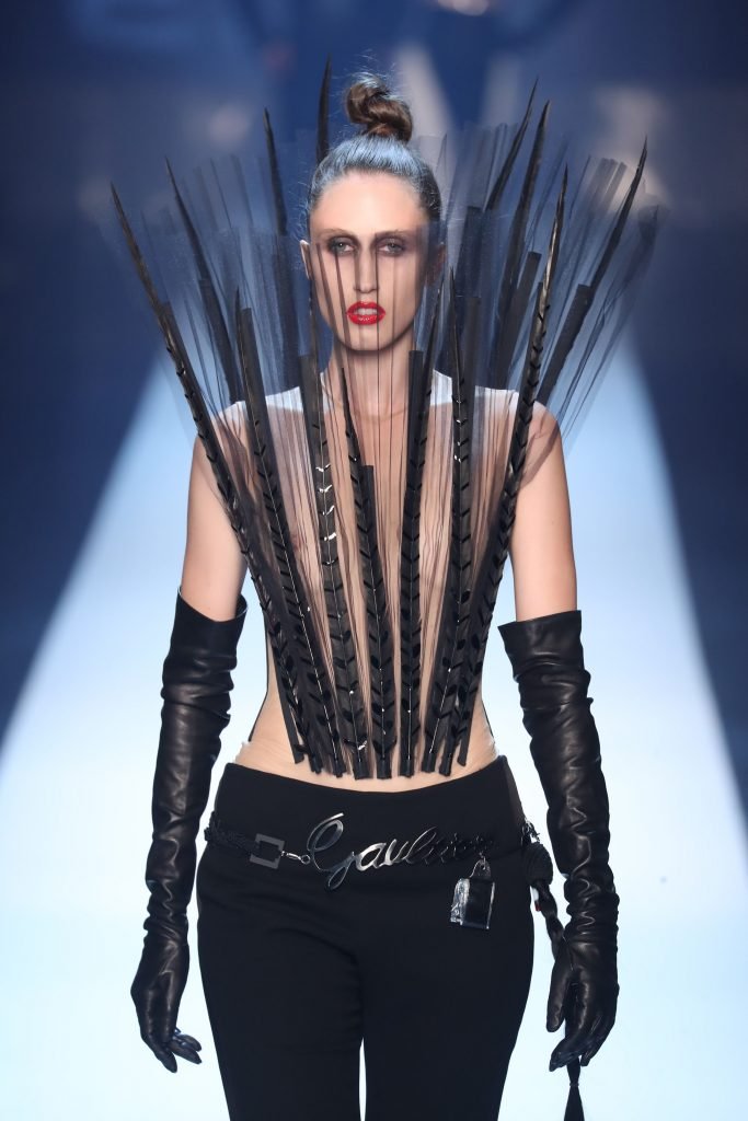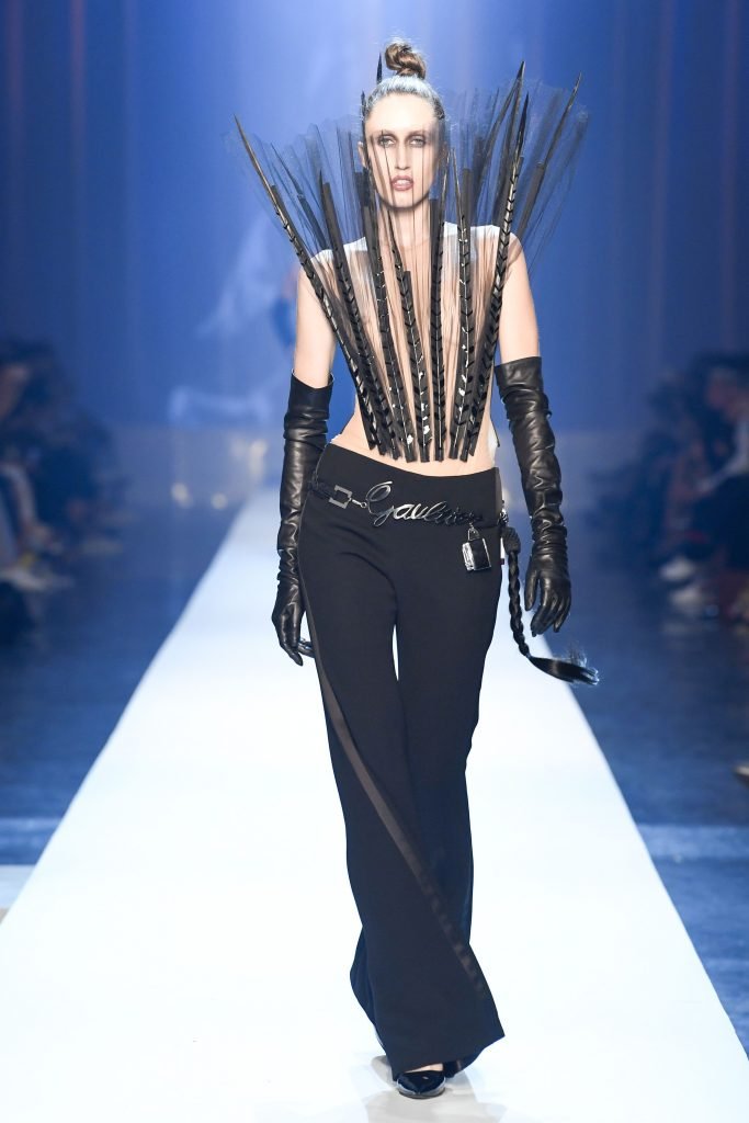 Model Anna Cleveland camina por la pasarela durante la Semana de la Moda Haute Couture de Jean-Paul Gaultier en París Otoño/Invierno 2018/19, celebrada en París, Francia, 07/04/2018. Anna llevaba una blusa extraña sin sujetador.