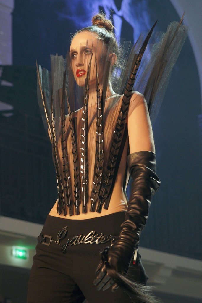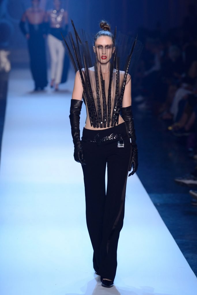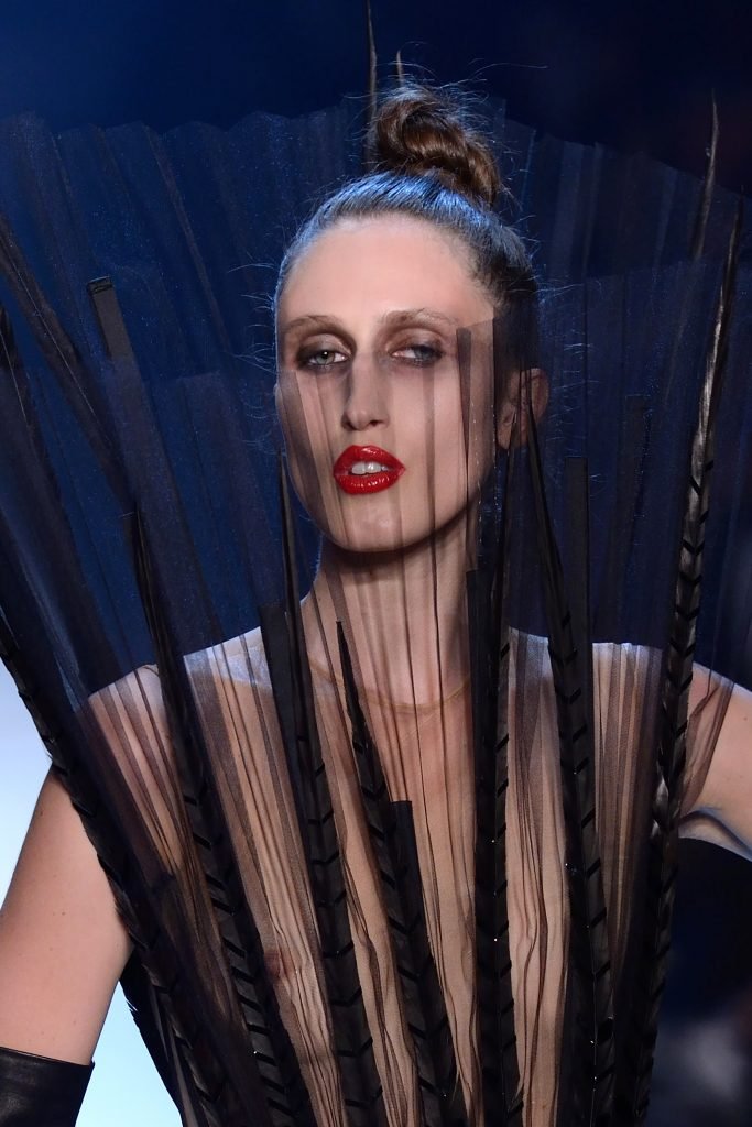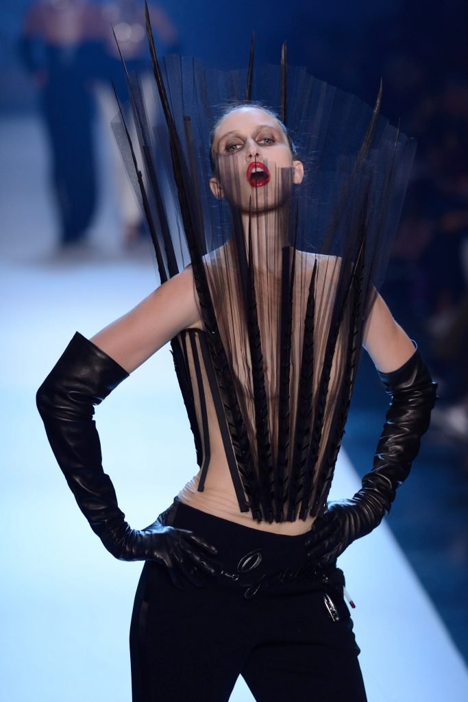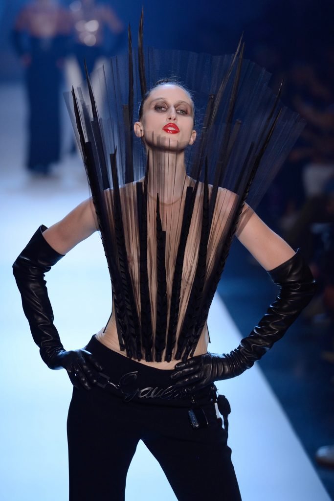 Model Anna Cleveland camina por la pasarela durante la Semana de la Moda Haute Couture de Jean-Paul Gaultier en París Otoño/Invierno 2018/19, celebrada en París, Francia, 07/04/2018. Anna llevaba una blusa extraña sin sujetador.