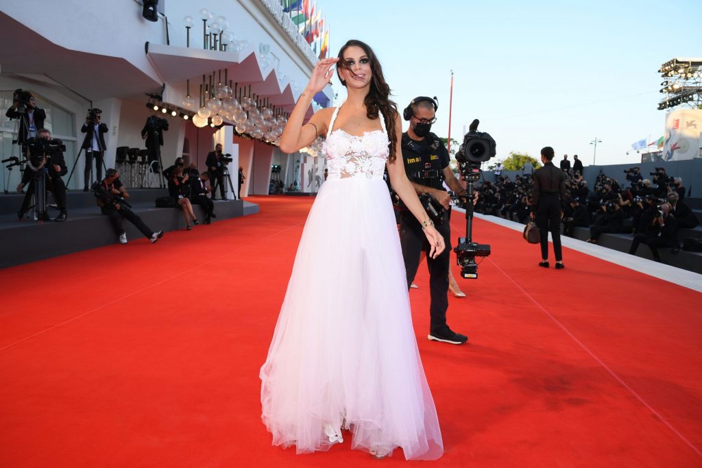 Sexy modelo italiana Antonella Fiordelisi muestra su escote posando con un vestido blanco en la alfombra roja antes de la película “Le Sorelle Macaluso” en el 77º Festival de Cine de Venecia en Venecia, 09/09/2020.