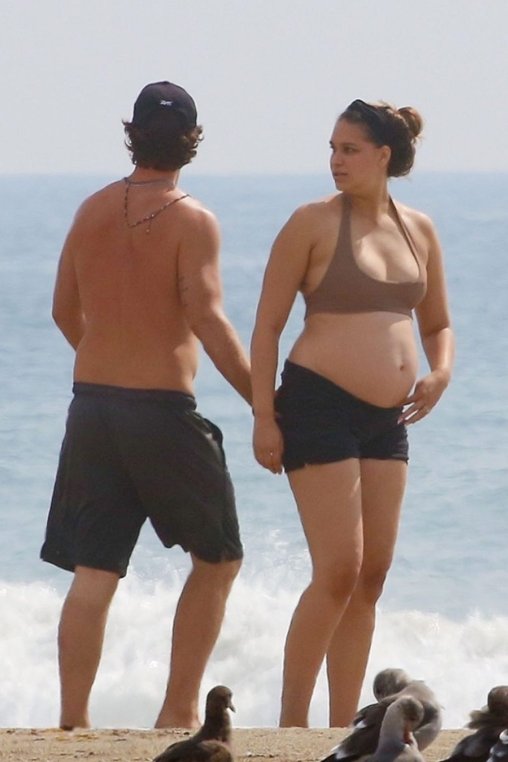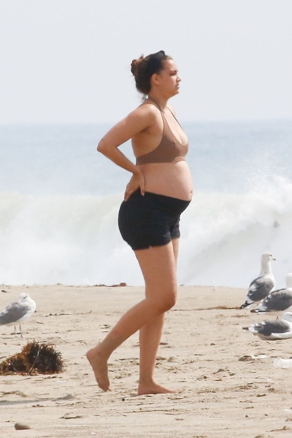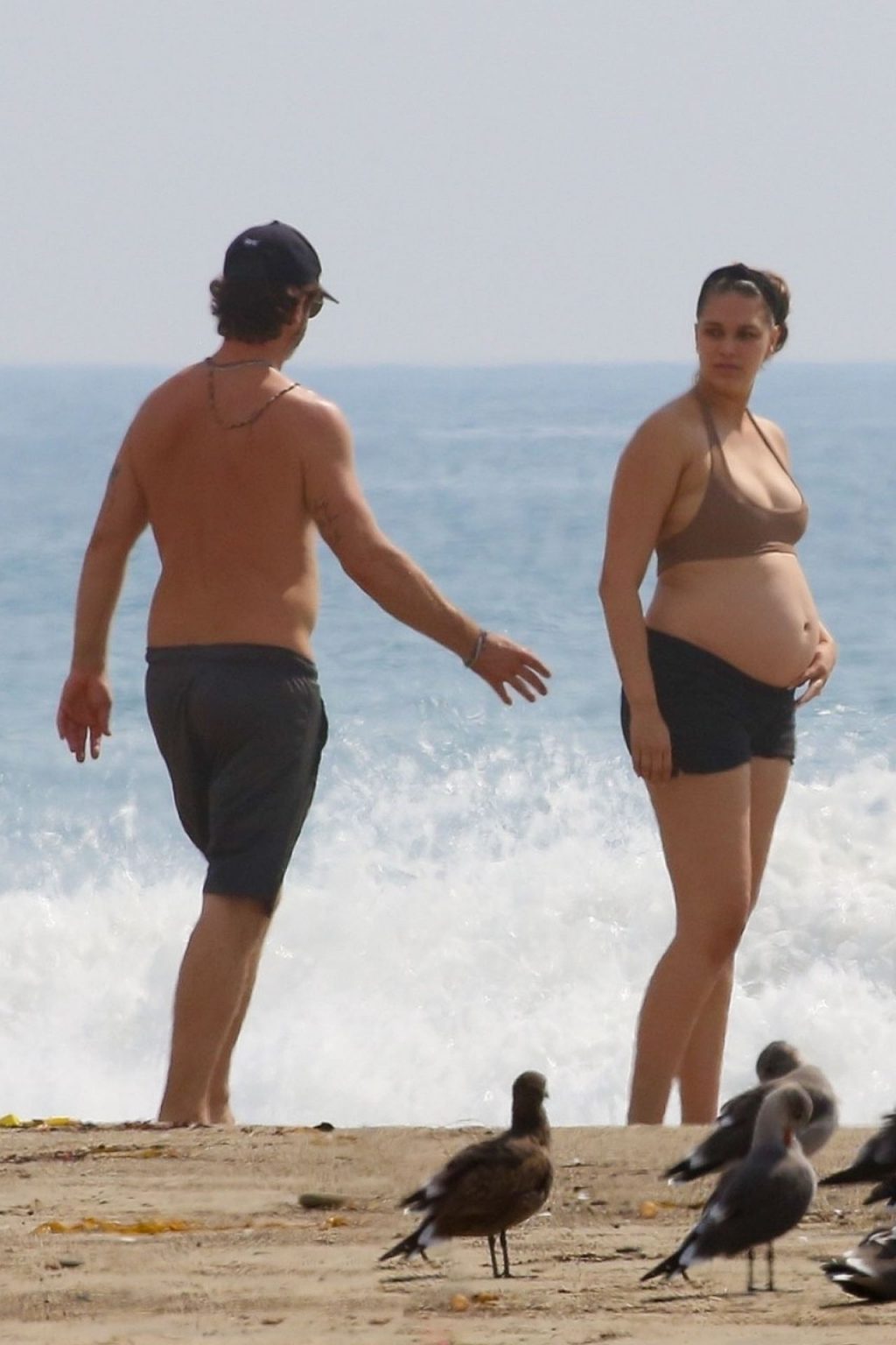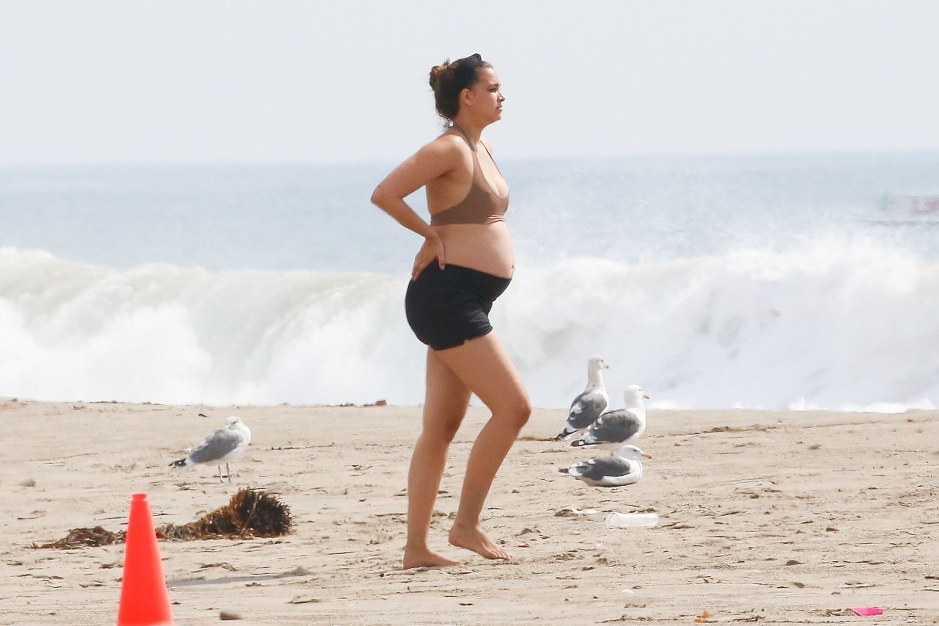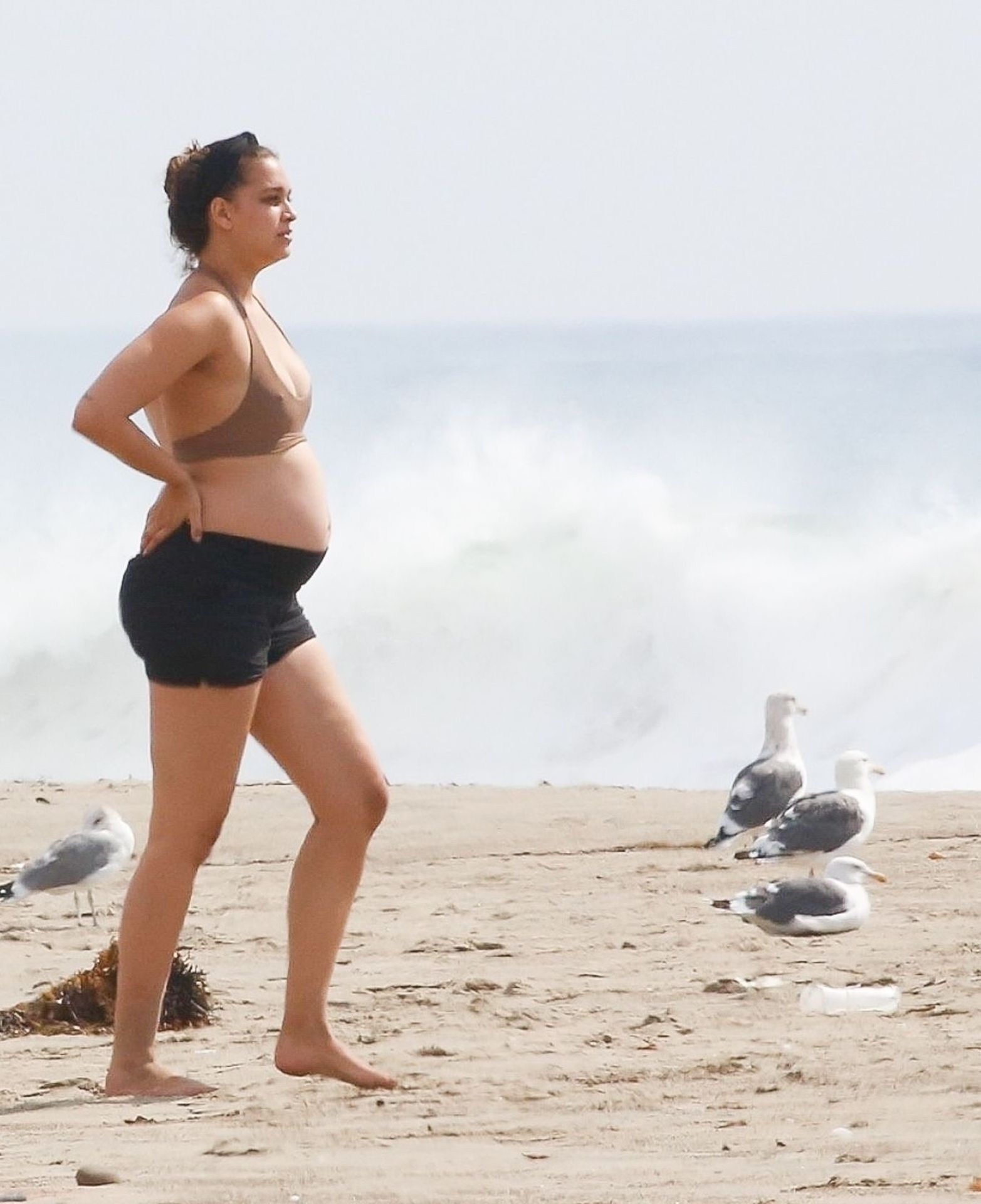 April Love Geary, embarazada, muestra su creciente barriga mientras disfruta de un día en la playa con su esposo Robin Thicke en Malibu, 05/10/2020.