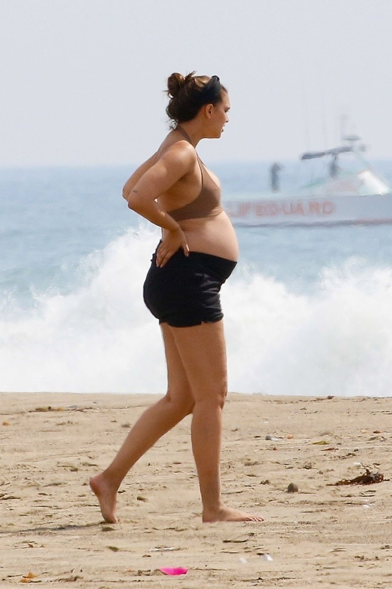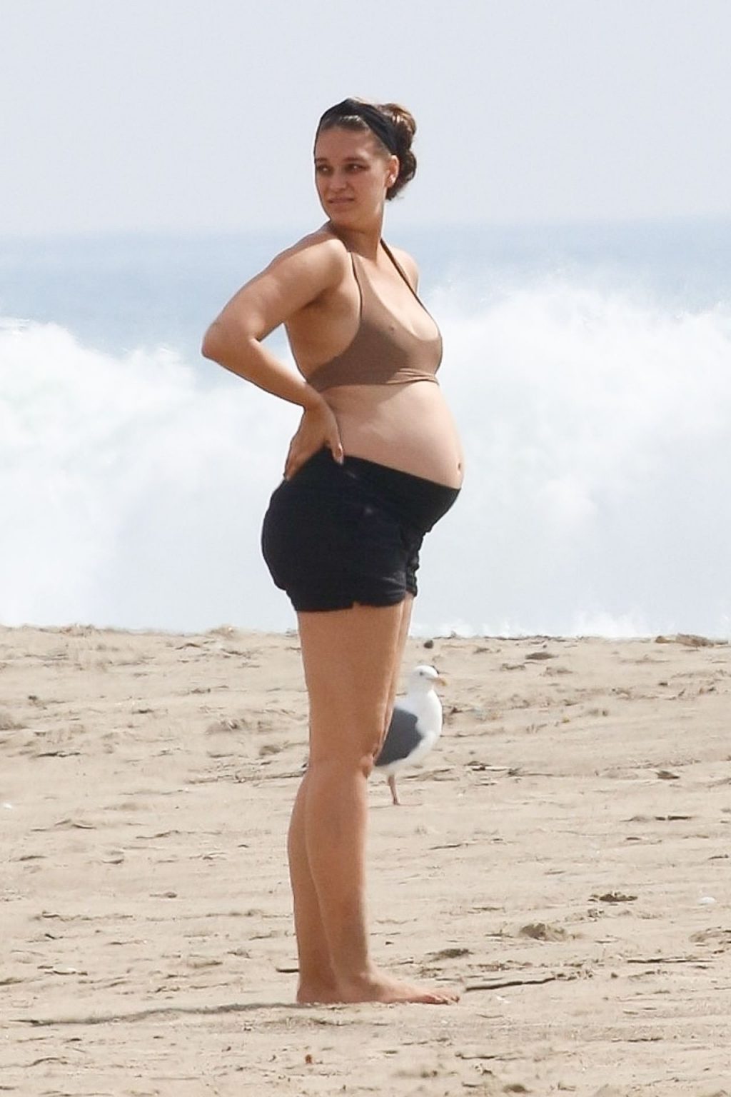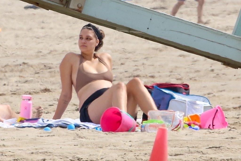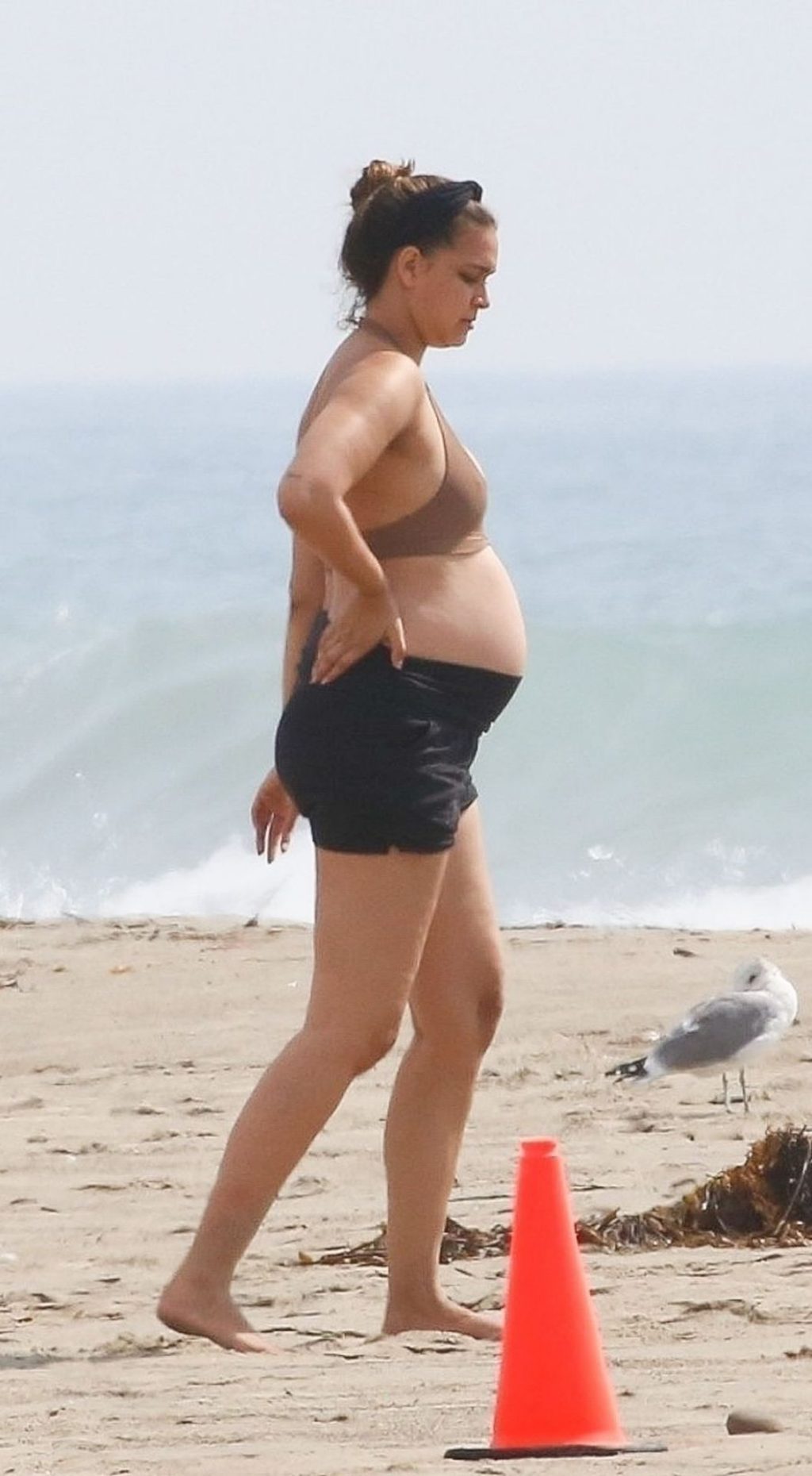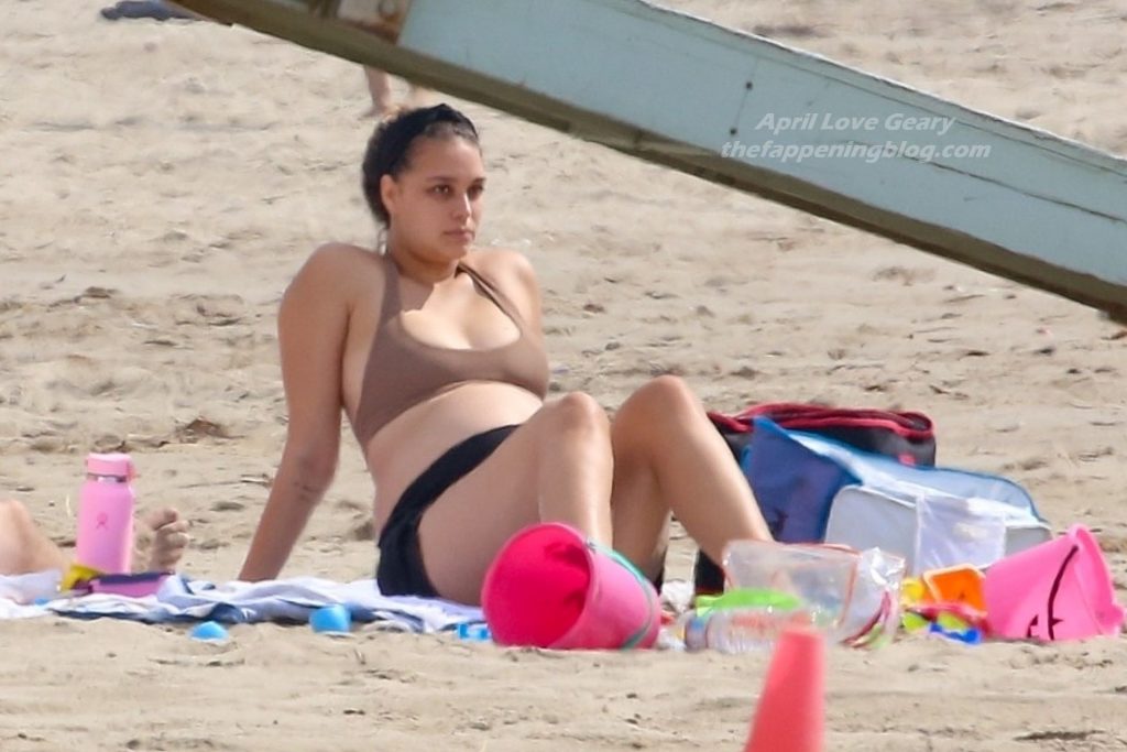April Love Geary, embarazada, muestra su creciente barriga mientras disfruta de un día en la playa con su esposo Robin Thicke en Malibu, 05/10/2020.