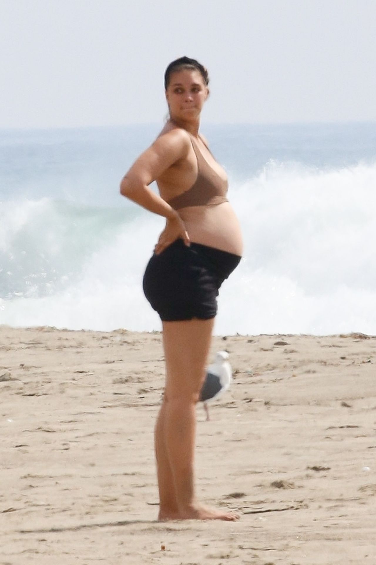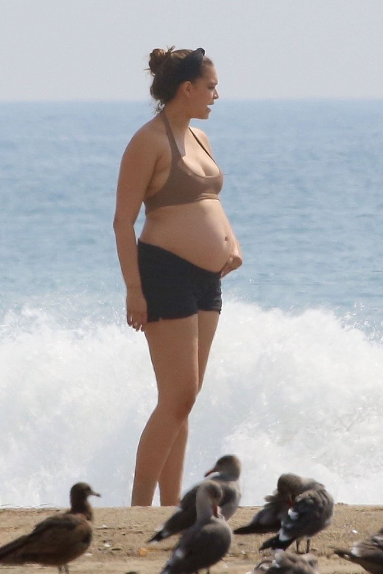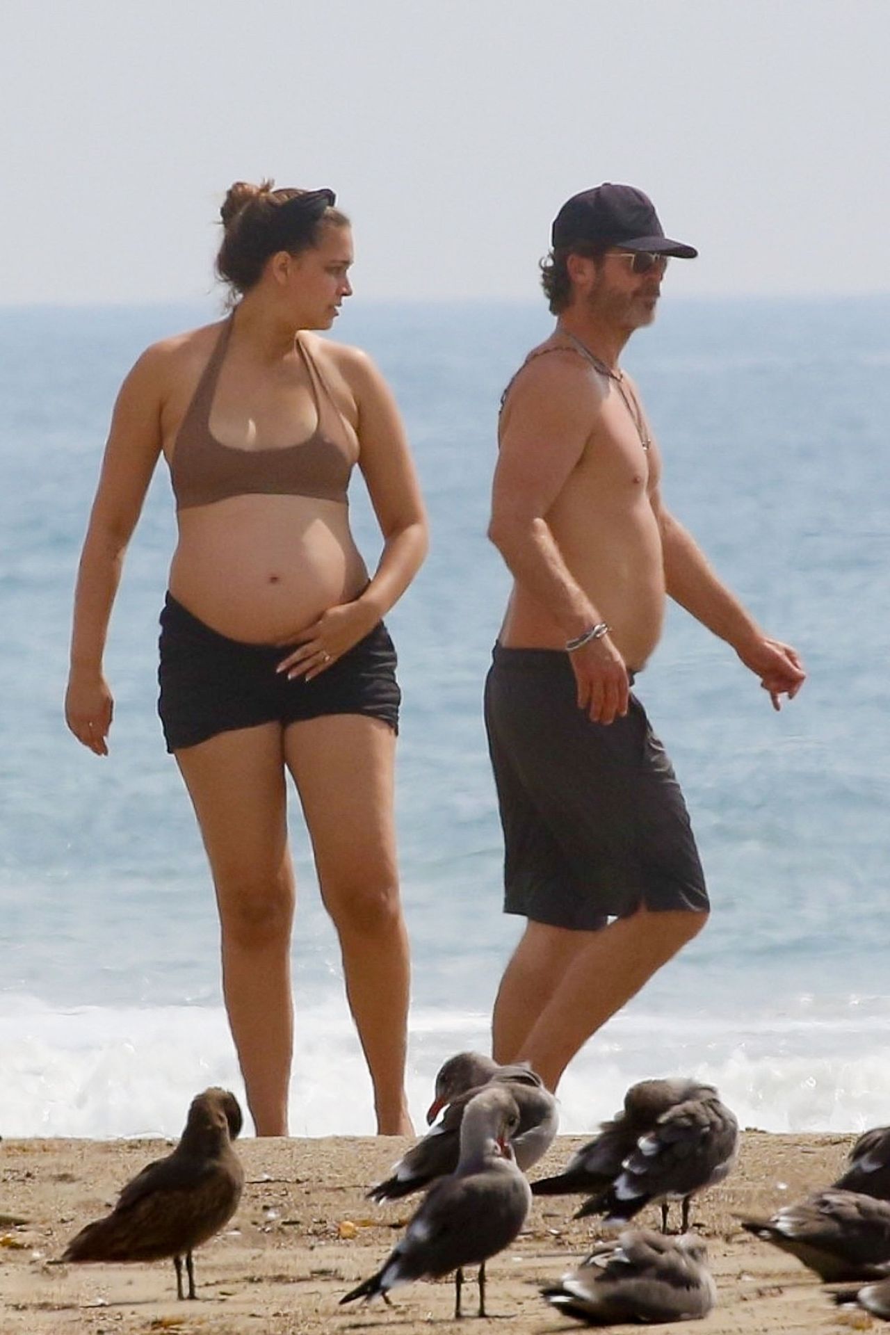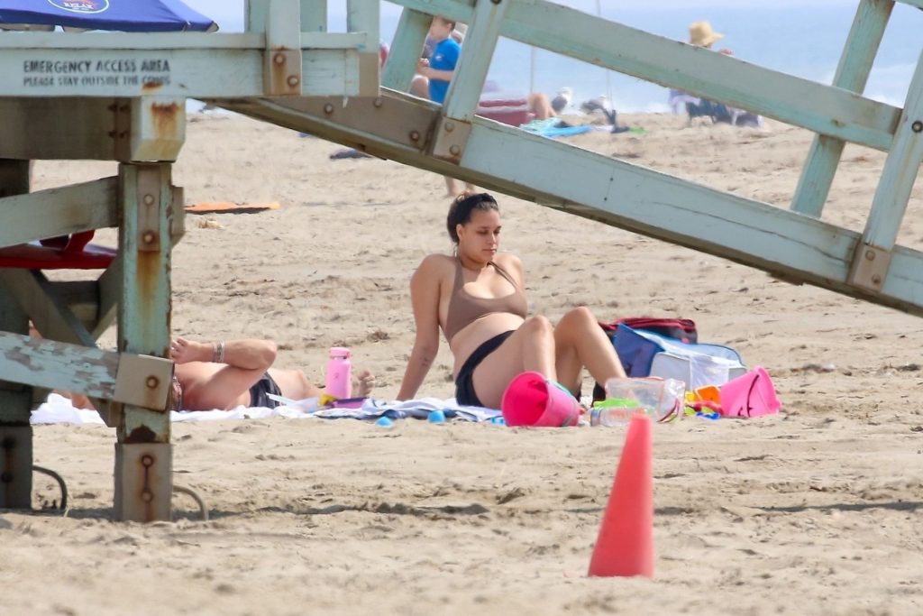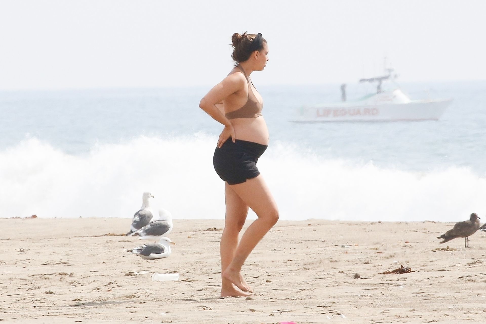April Love Geary, embarazada, muestra su creciente barriga mientras disfruta de un día en la playa con su esposo Robin Thicke en Malibu, 05/10/2020.