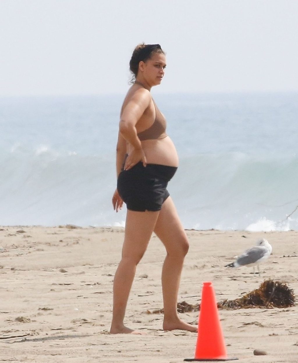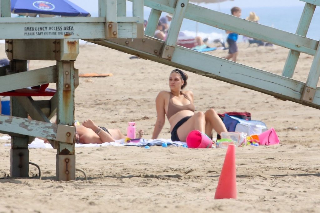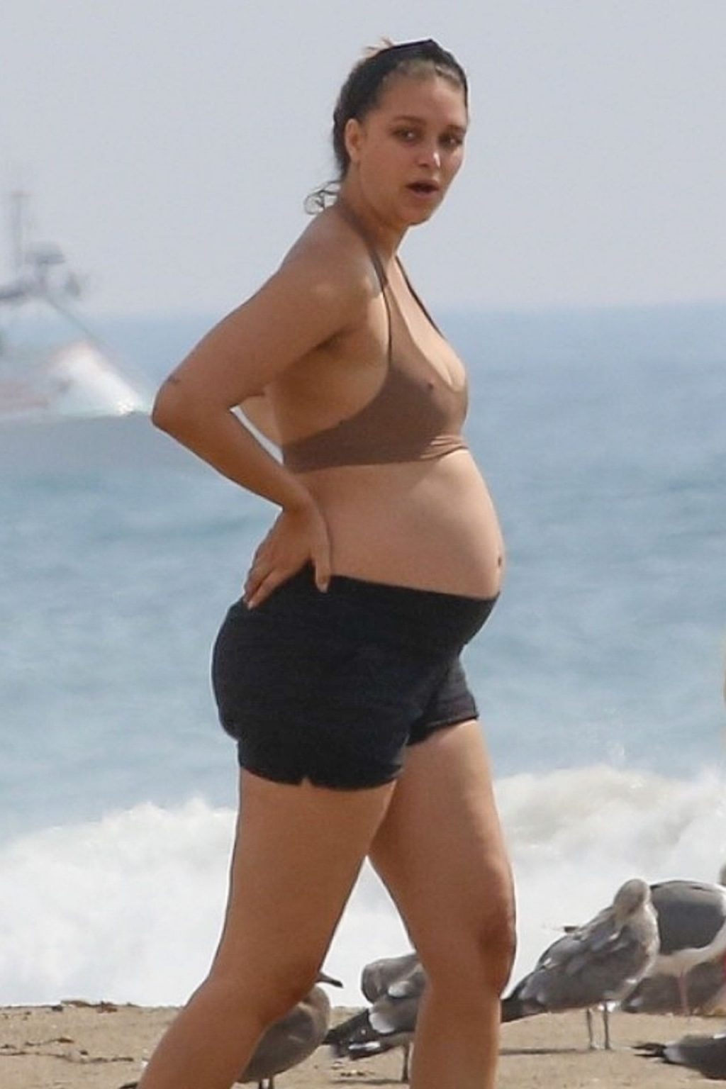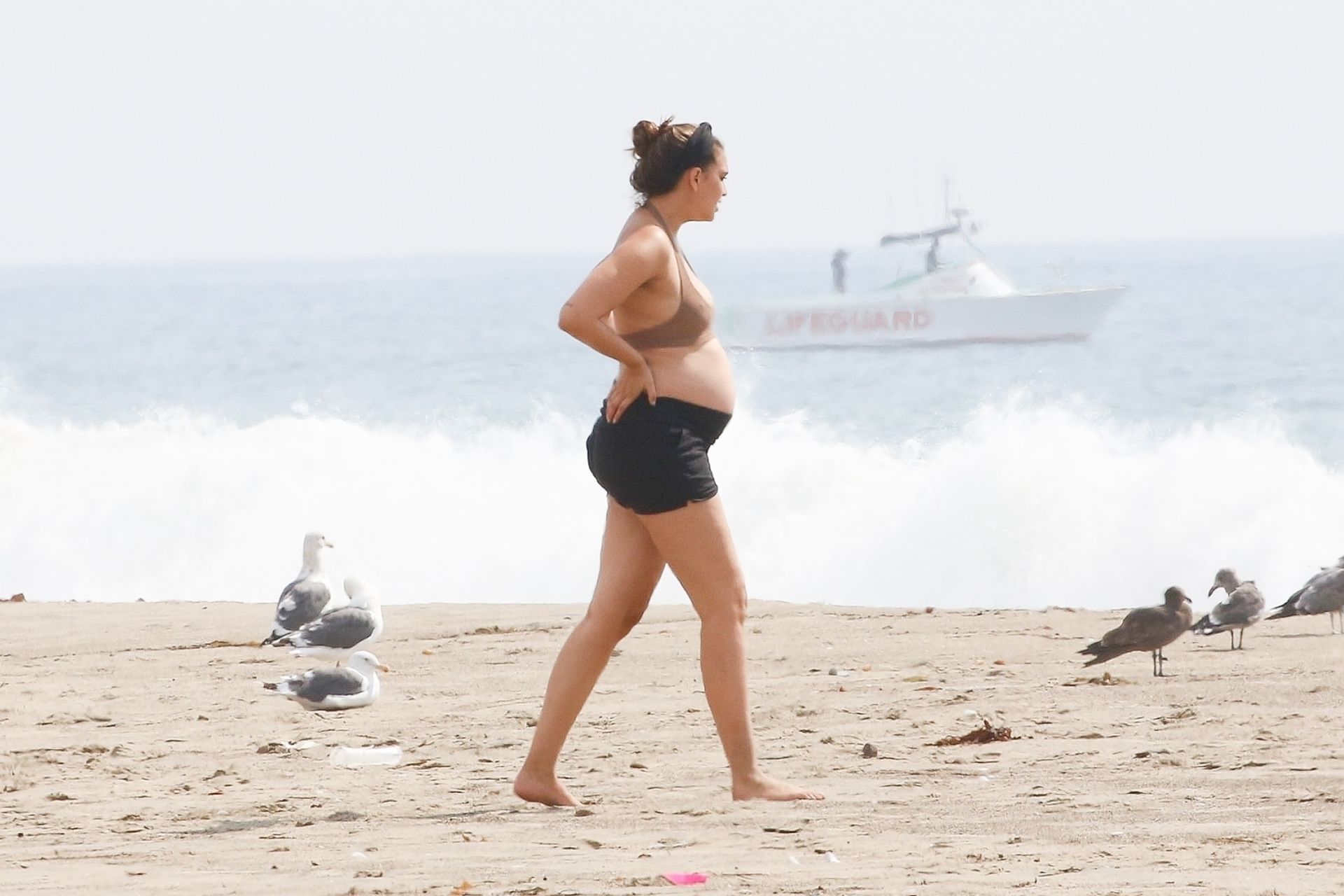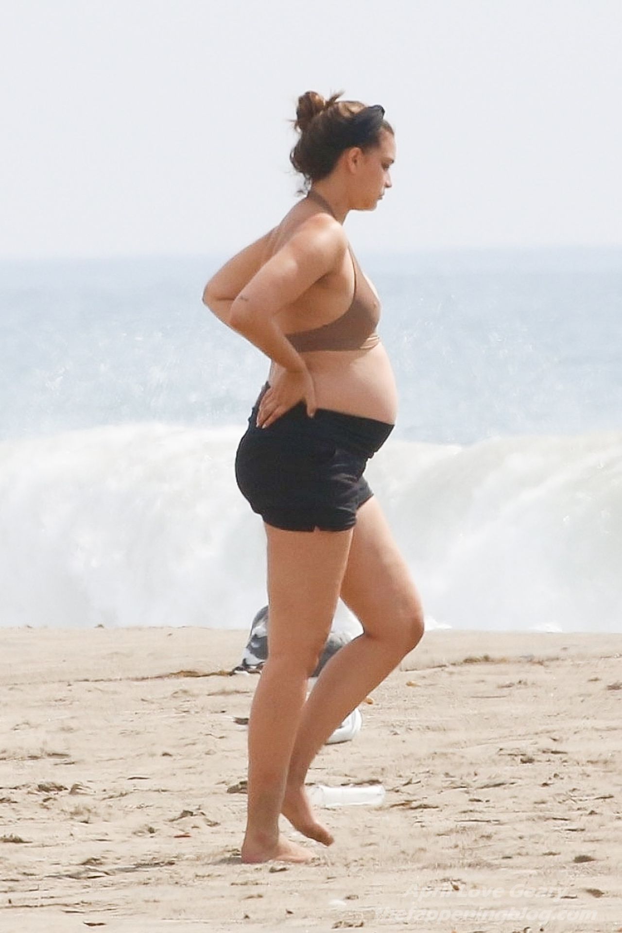 April Love Geary, embarazada, muestra su creciente barriga mientras disfruta de un día en la playa con su esposo Robin Thicke en Malibu, 05/10/2020.