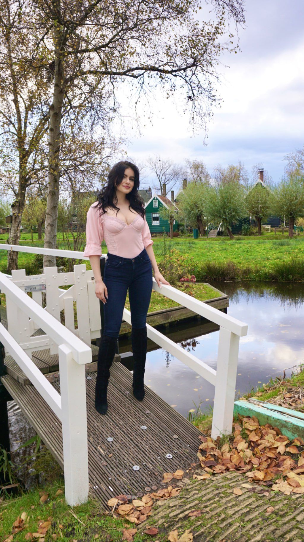 Ariel Winter muestra sus tetas, vistiendo una blusa rosa en Zaanse Schans, Ámsterdam, Holanda – Instagram, 19/11/2019. Aún puedes mirar sus pechos, no la casa desde atrás.