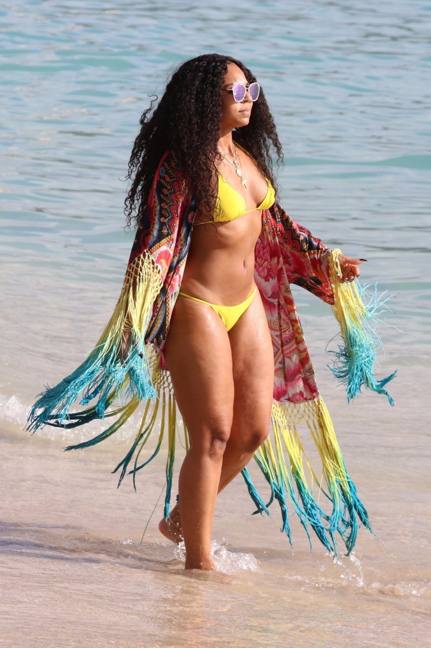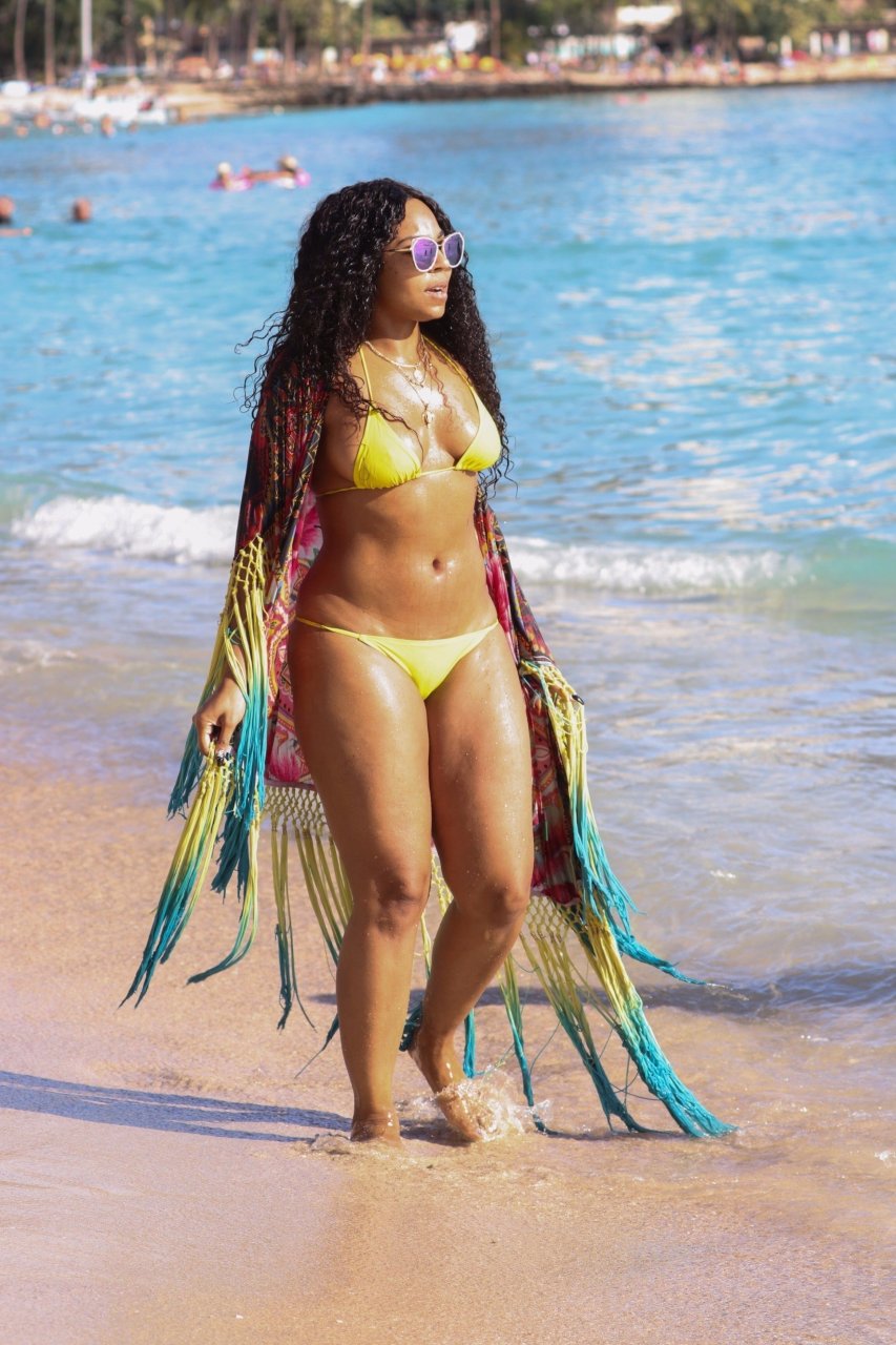 La cantante Ashanti, 37, se ve usando un bikini amarillo brillante en una playa de Hawái, 21/11/2017.