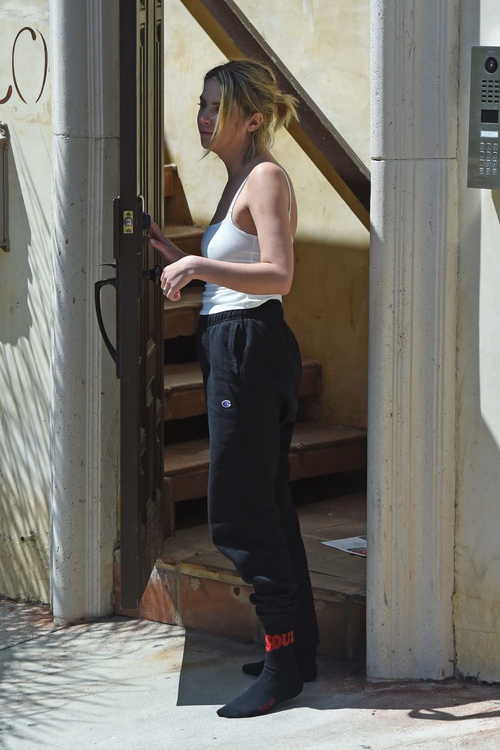 Ashley sale con pantalones deportivos negros, calcetines y una camiseta sin mangas para recoger su comida mientras se la entregan en la casa de G-Eazy. Parece que Ashley pidió algunos artículos de Taco Bell.