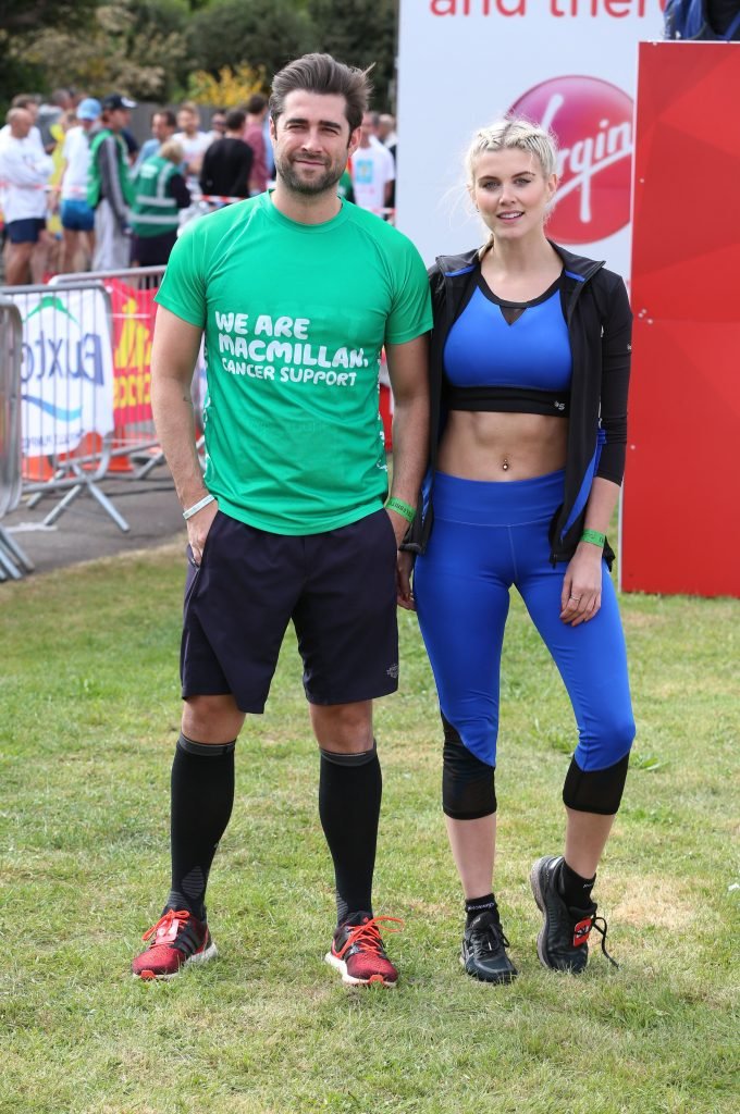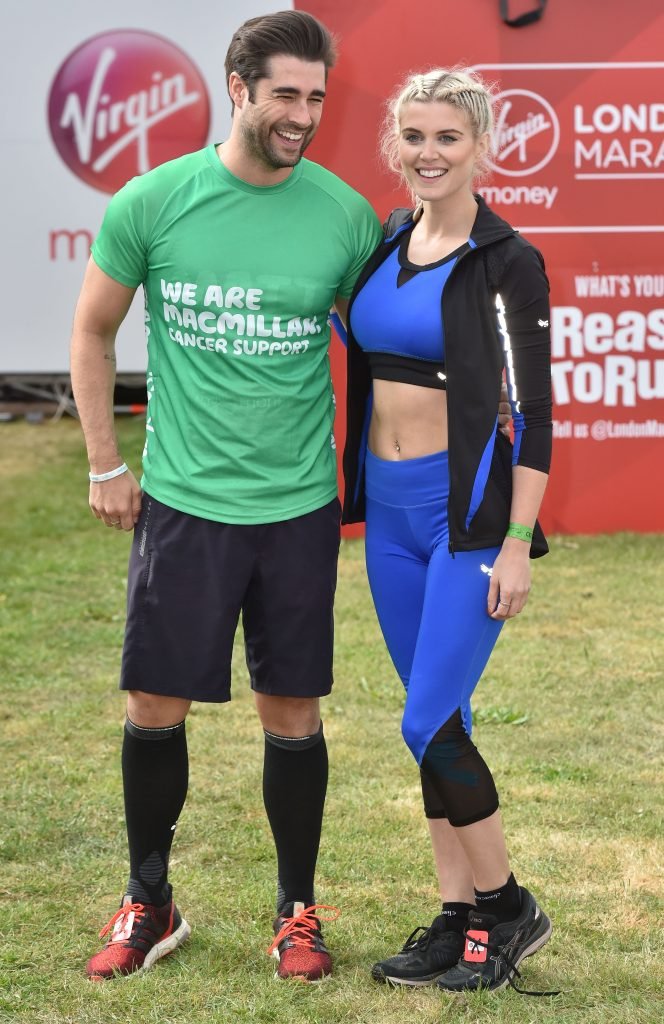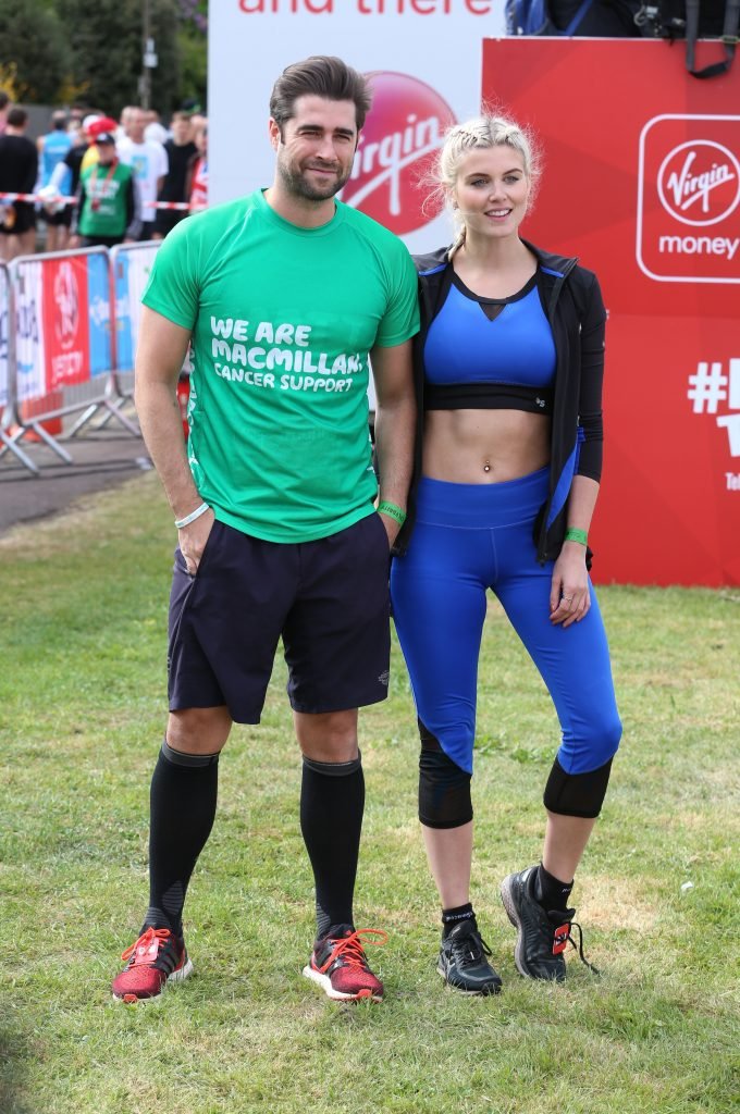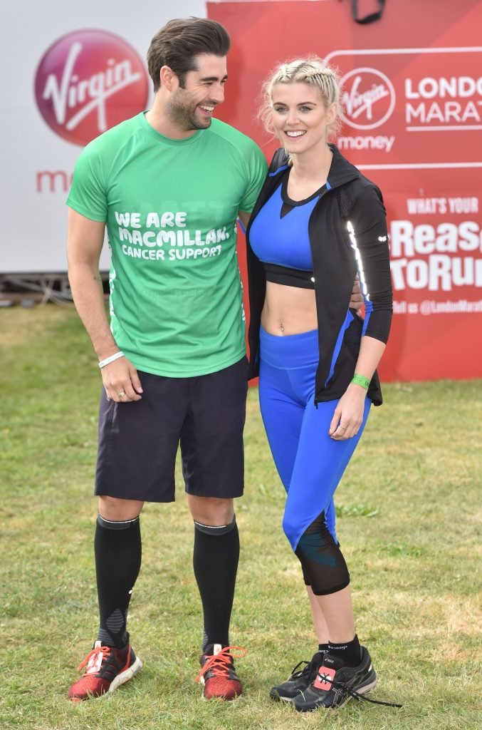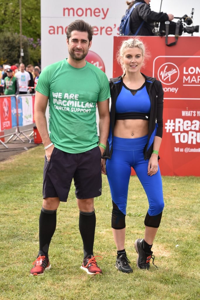 Hot blonde Ashley James wears a blue sports top and leggings during the 2017 London marathon, 04/23/2017. Ashley James is a model, TV presenter, reality TV star (E4’s Made In Chelsea show) and blogger. Age – 30 years old (born April 2, 1987).