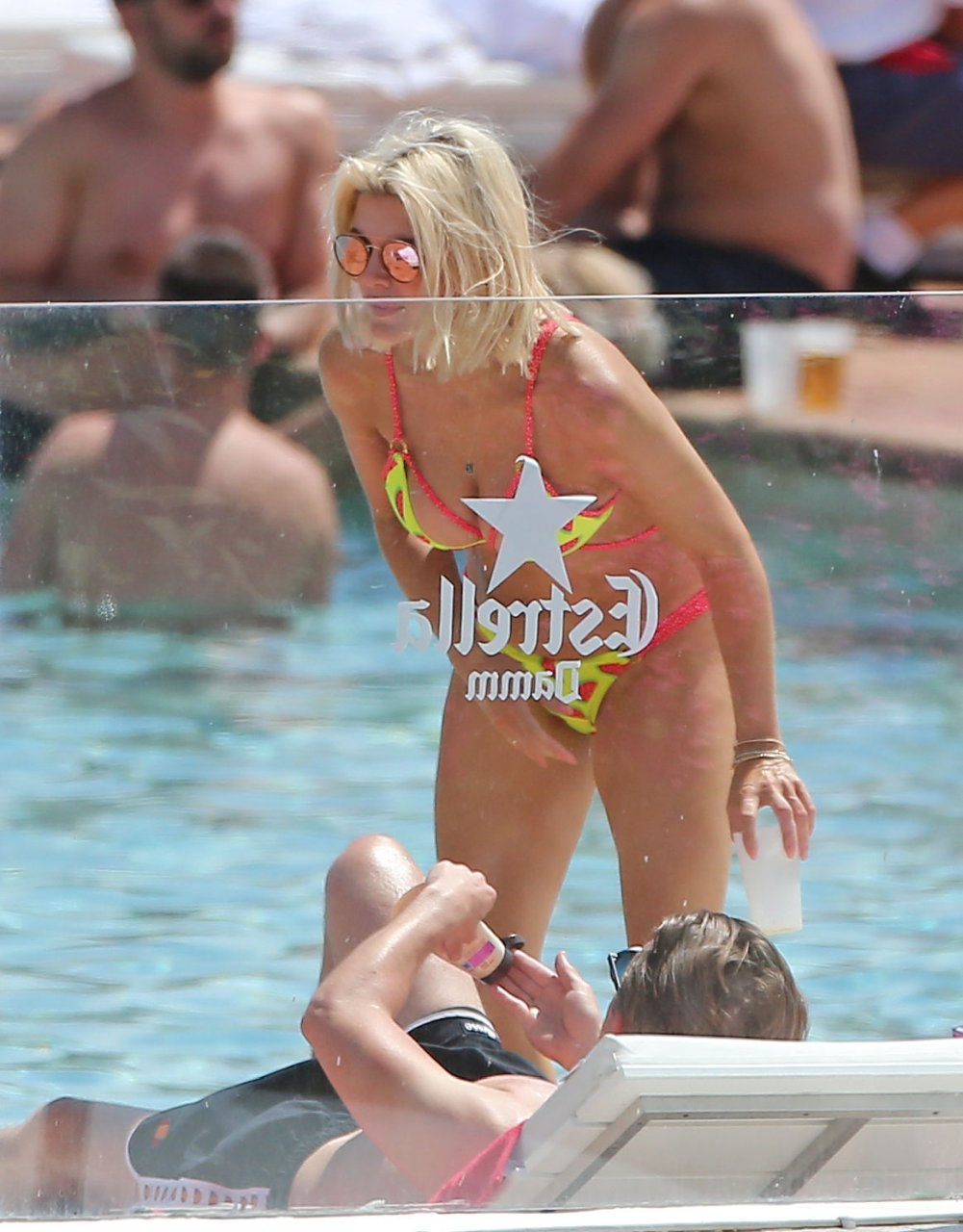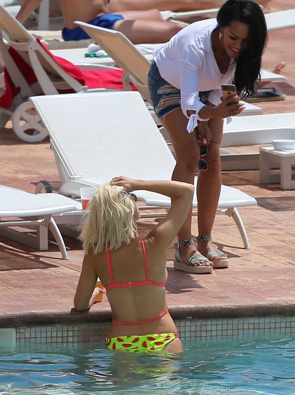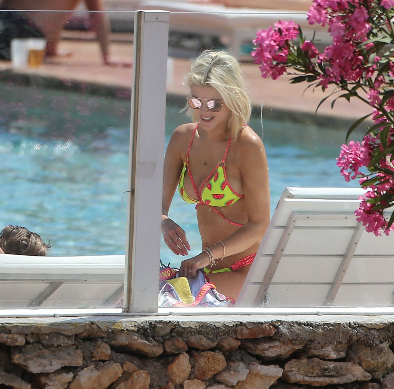 La rubia Ashley James muestra su cuerpo de playa con un sexy bikini de estampado de sandía mientras está de vacaciones en Ibiza, España, 07/06/2018. La estrella de Celebrity Big Brother (también conocido como Big Brother VIP) y Made In Chelsea, de 31 años, disfrutó del sol y fue vista llevando una bebida.