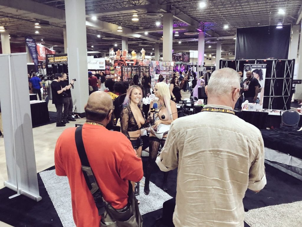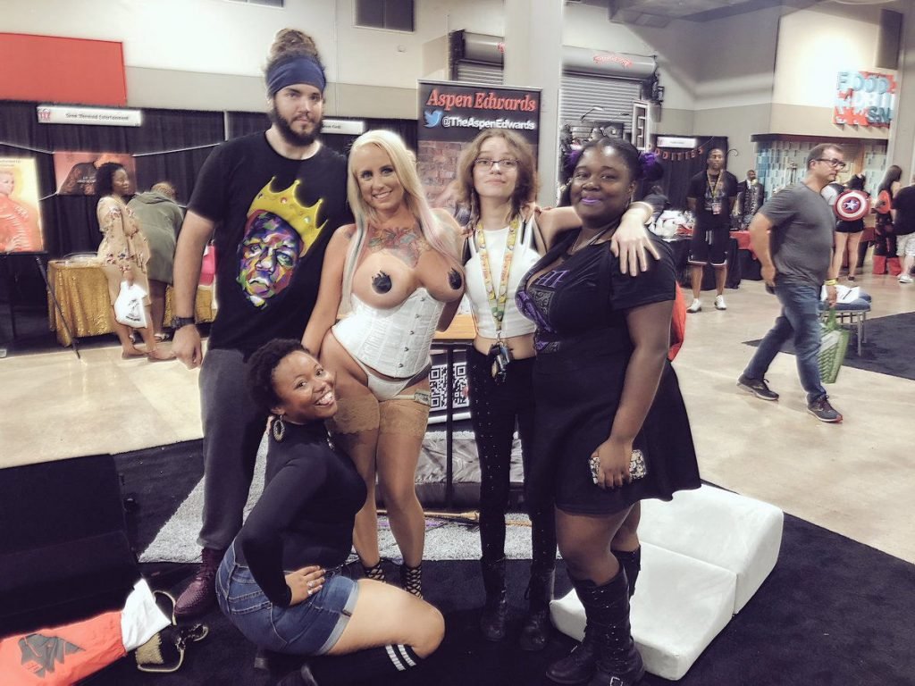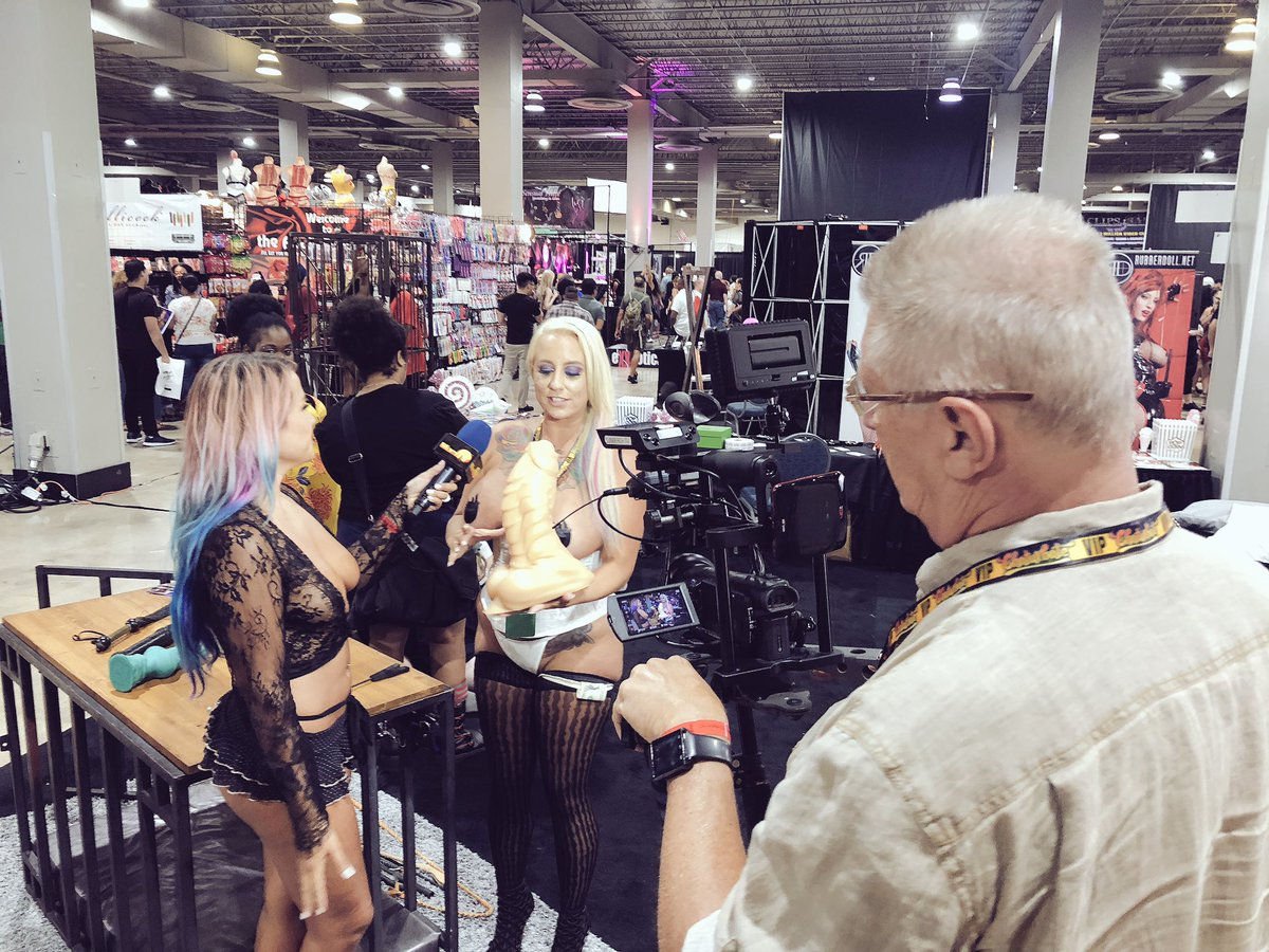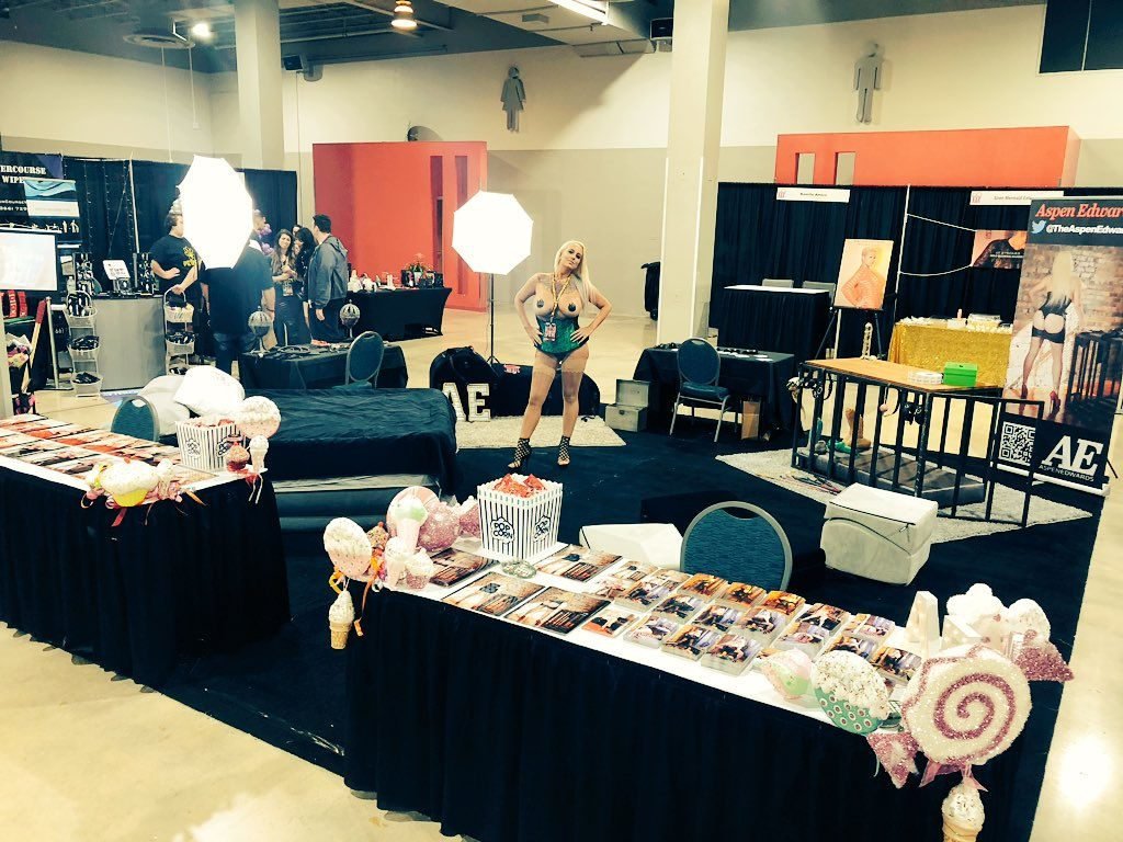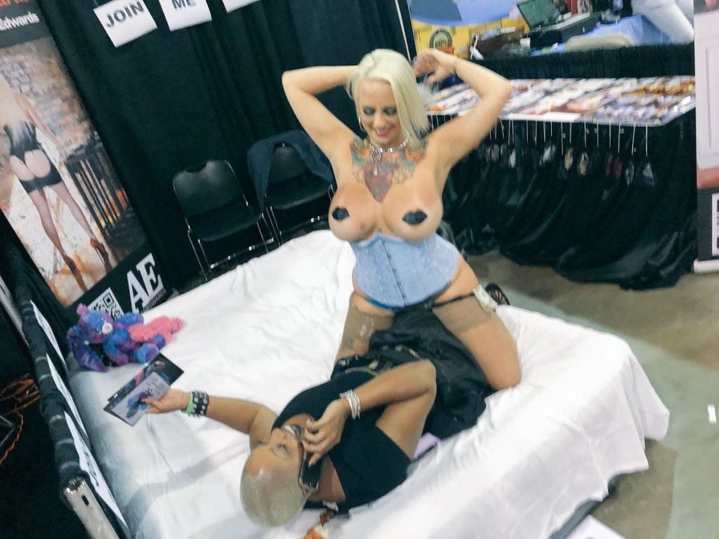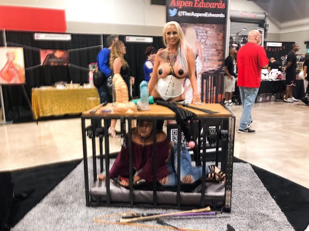Busty rubia Aspen Edwards presentó artículos BDSM, la jaula y enormes consoladores en la Expo EXXXOTICA en el Centro de Convenciones del Aeropuerto de Miami en Florida, 21/07/2018. Aspen Edwards es una modelo estadounidense de fetiches para adultos, actriz porno, productora, directora y empresaria. Nacida: 13 de septiembre de 1985.