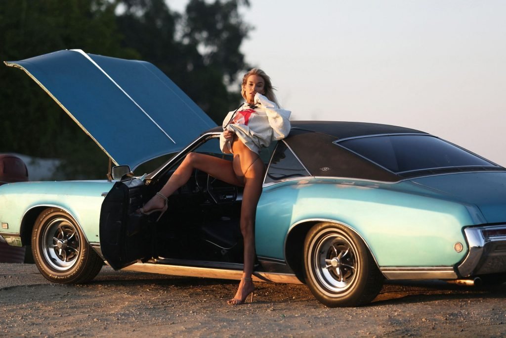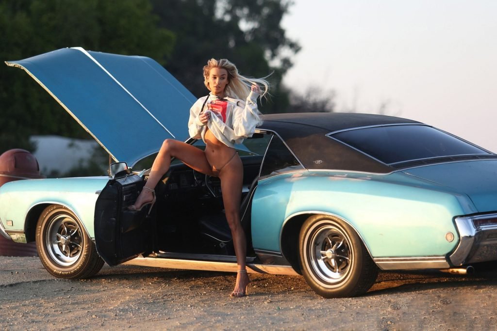 Playmate de Playboy Aubrey Evans realiza acrobacias en una nueva sesión de fotos al aire libre para 138 Water con un Buick Riviera vintage de 1968 en Mulholland Drive en Los Ángeles, 28/10/2019.