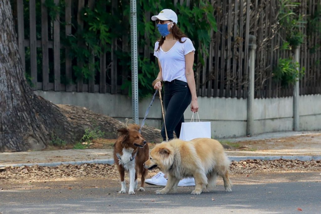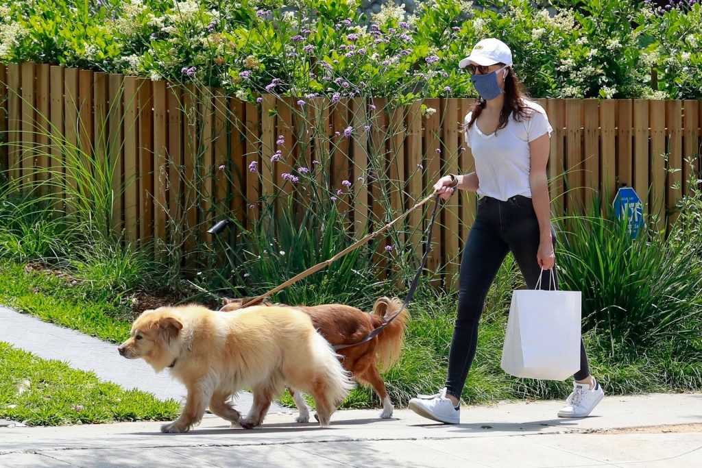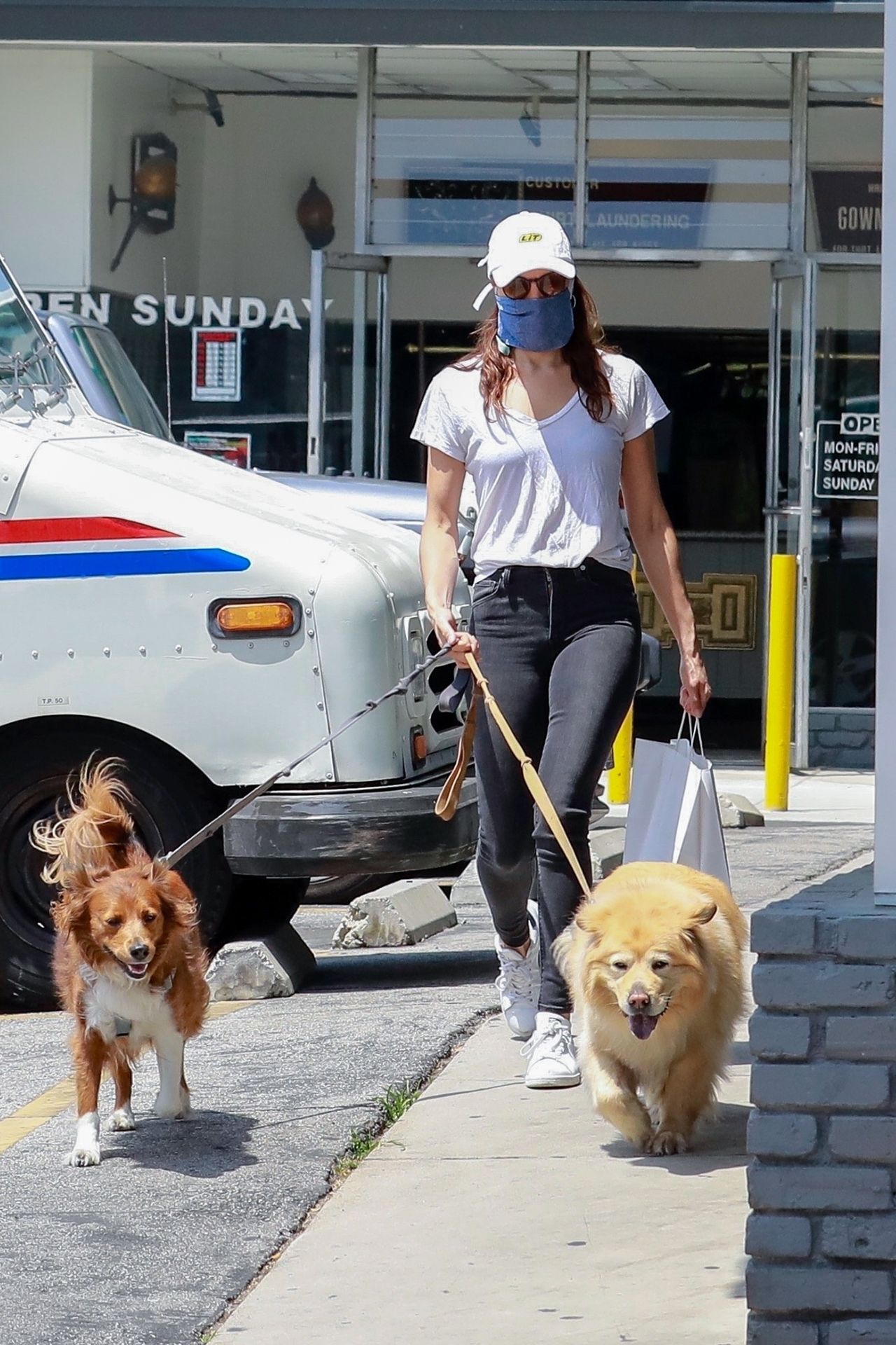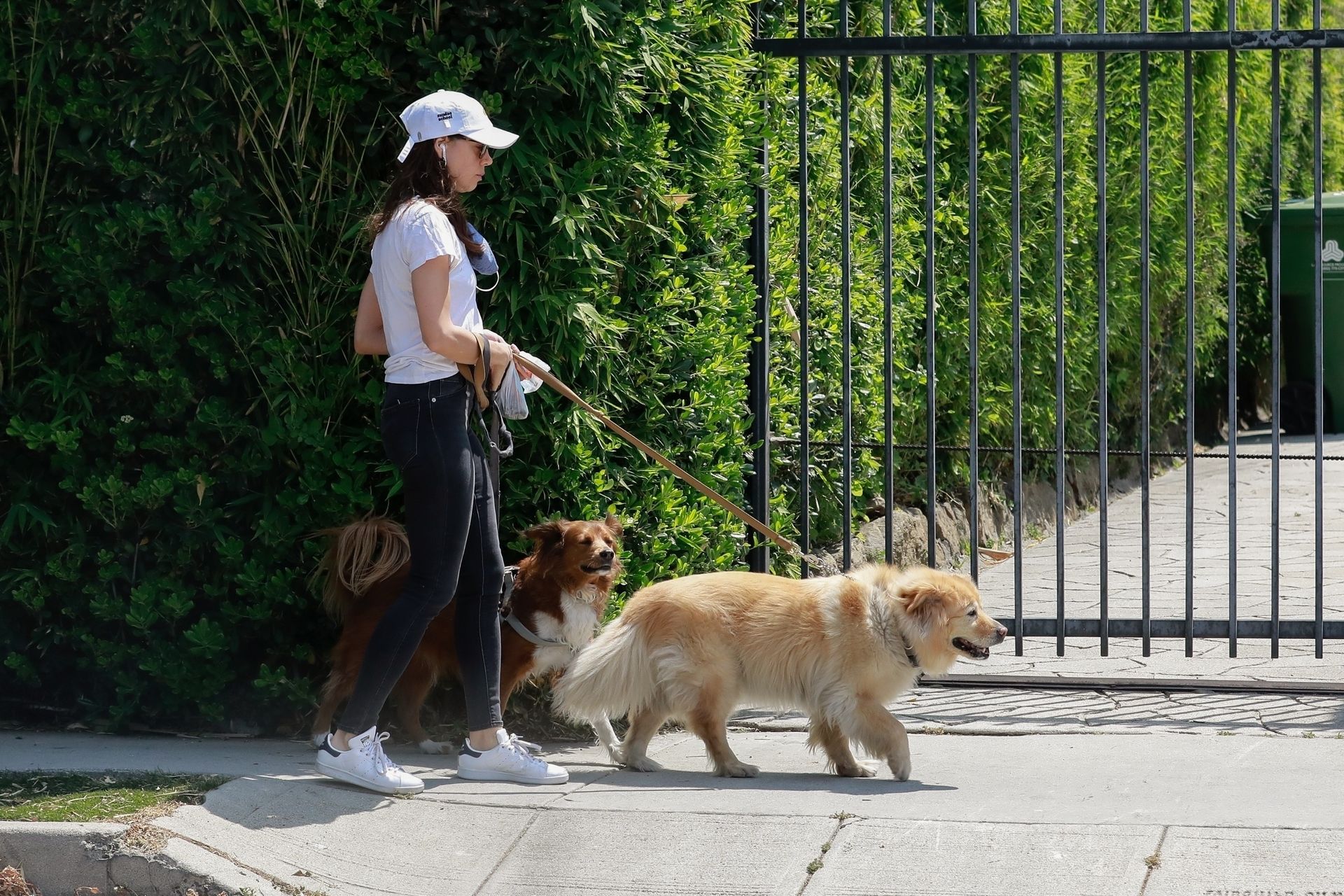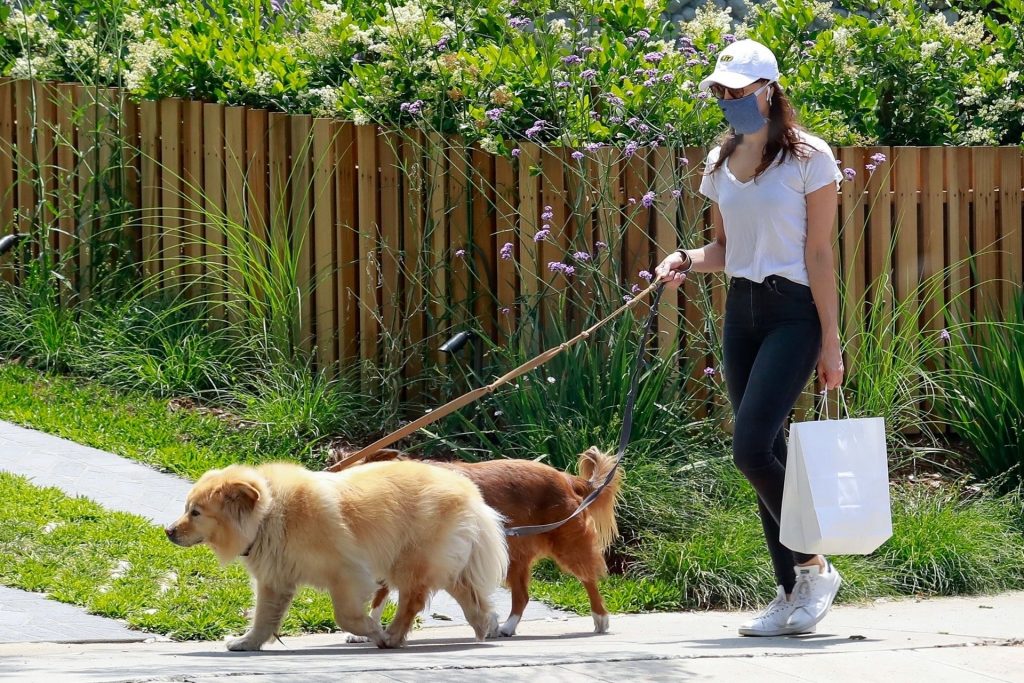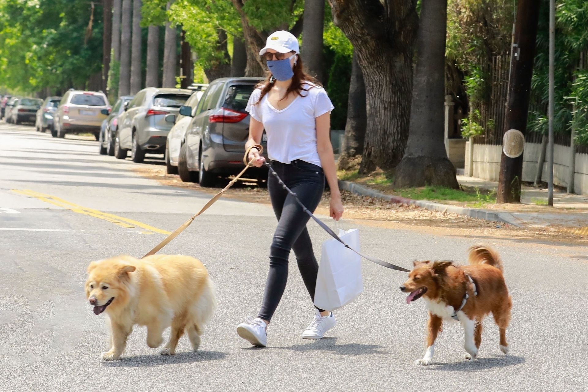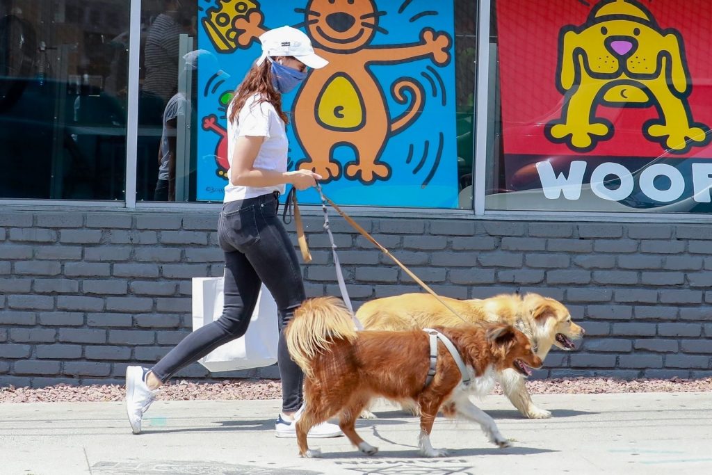Actriz Aubrey Plaza lleva a sus perros a pasear por la calle hasta la tienda de mascotas en Los Feliz, 09/05/2020. Aubrey compró algunos artículos para sus perros y regresó caminando a casa.