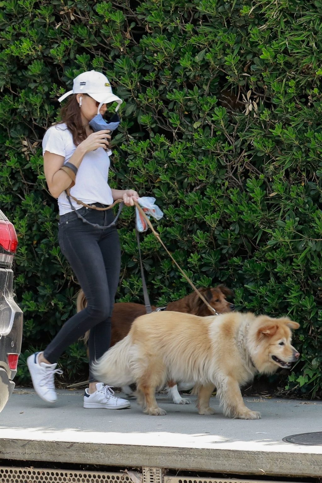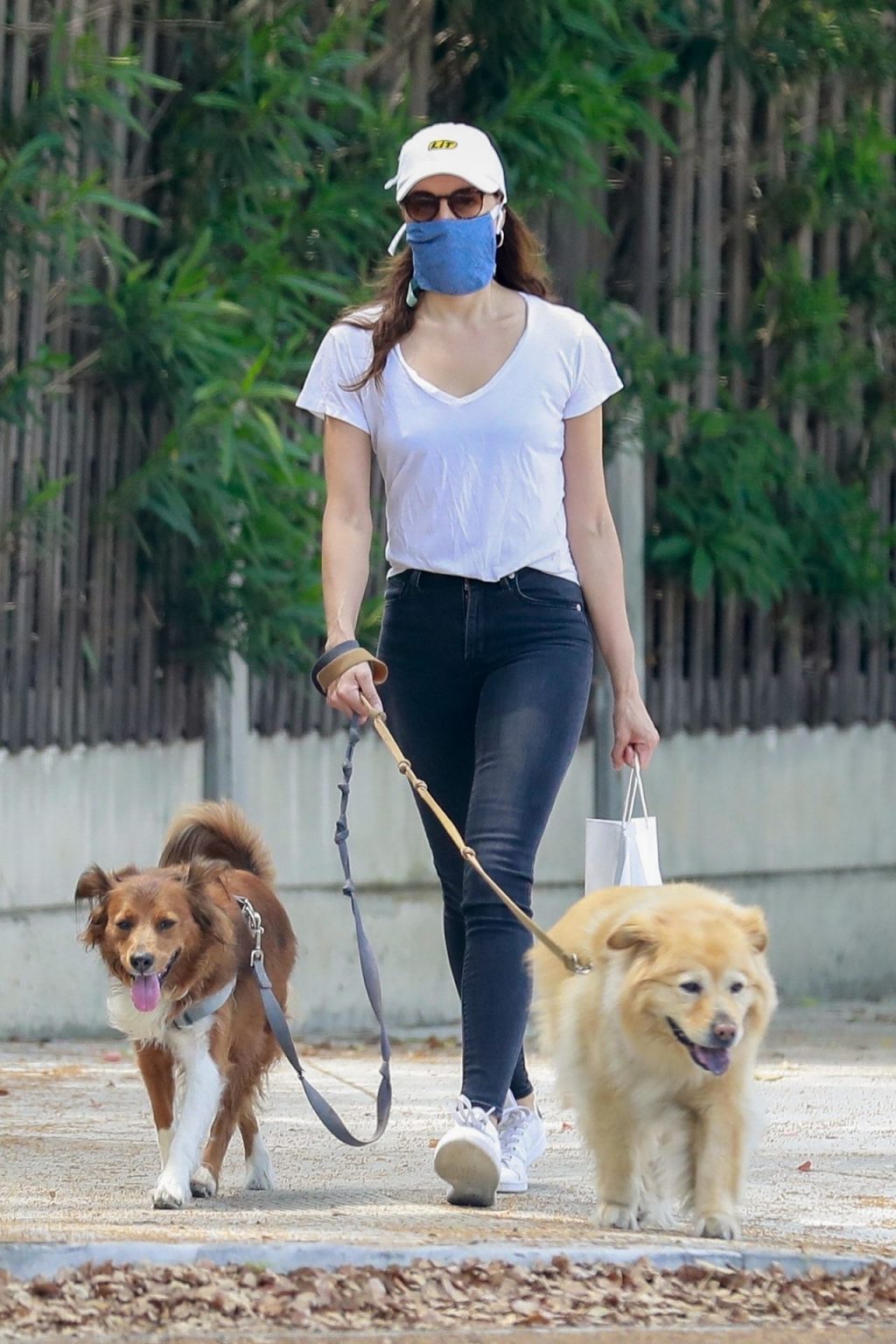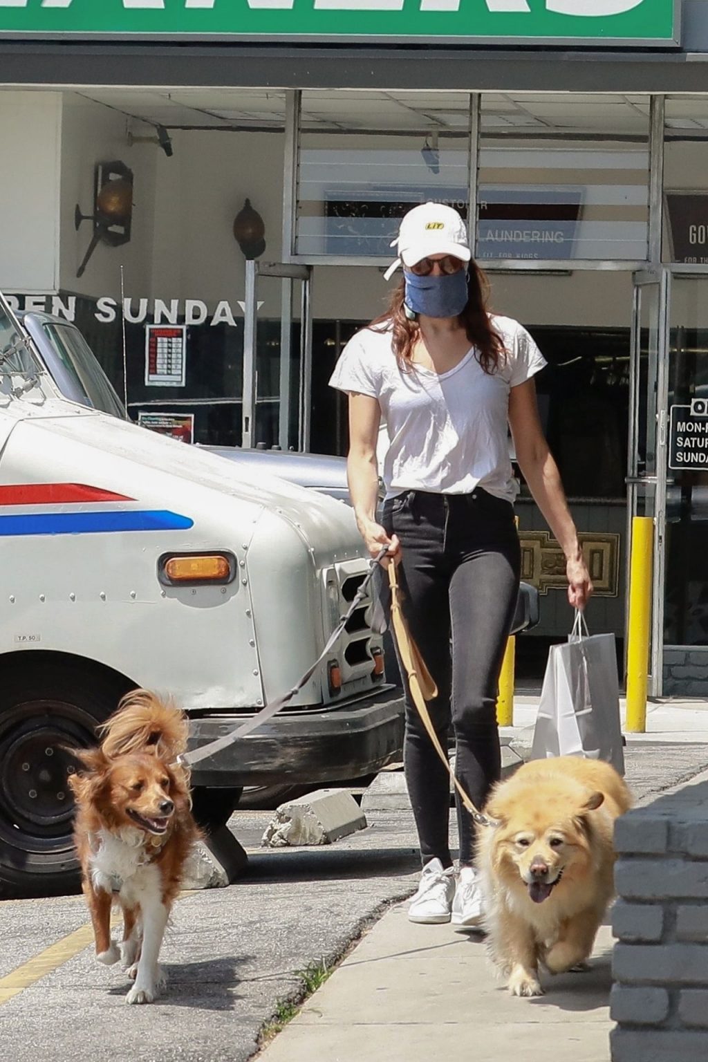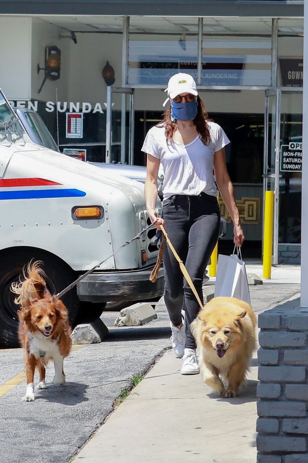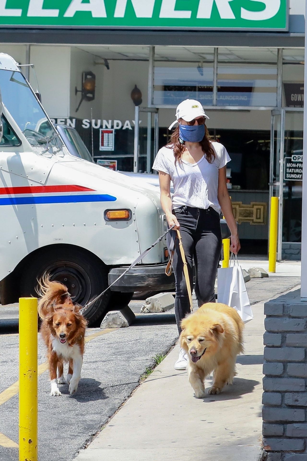 Actriz Aubrey Plaza lleva a sus perros a pasear por la calle hasta la tienda de mascotas en Los Feliz, 09/05/2020. Aubrey compró algunos artículos para sus perros y regresó caminando a casa.