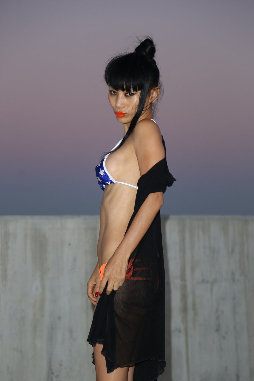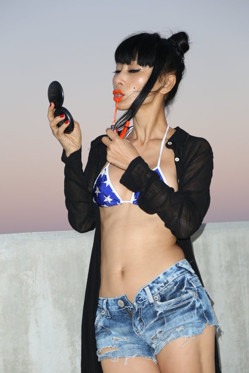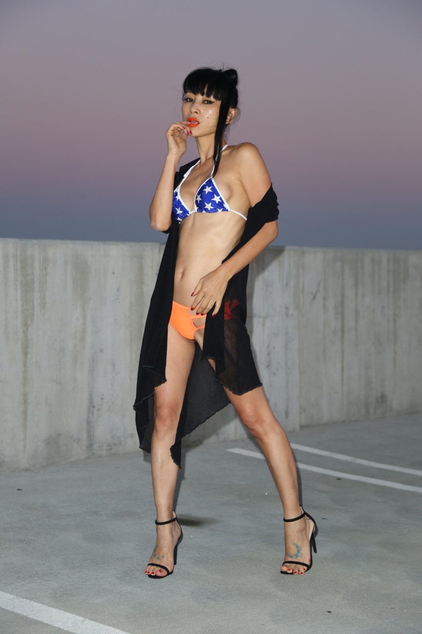 Bai Ling muestra su cintura pequeña con un bikini azul-naranja en el estacionamiento del Teatro ArcLight en Los Ángeles, 10/08/2016. Bai Ling es una actriz chino-estadounidense. Edad: 49 (10 de octubre de 1966).