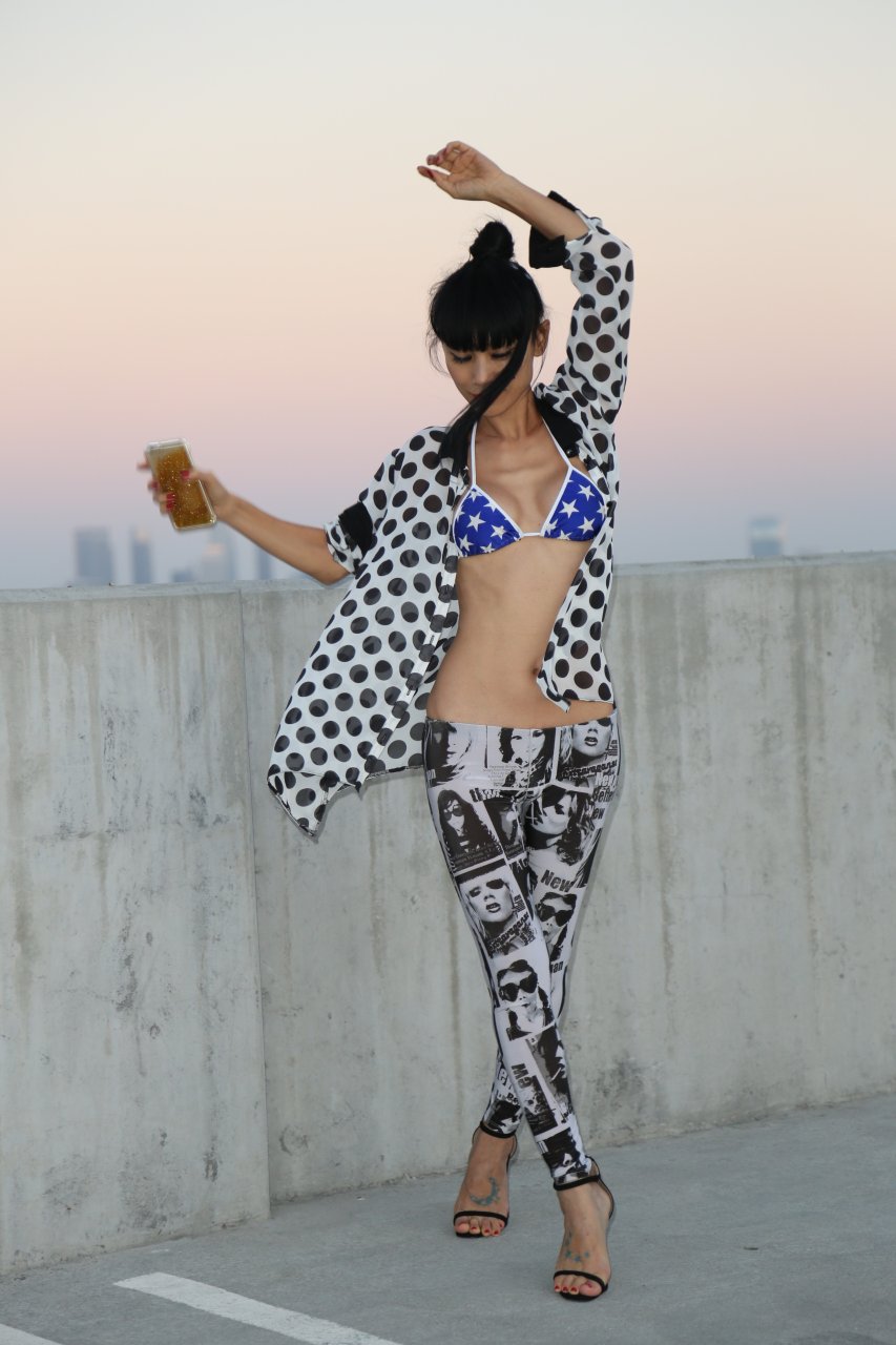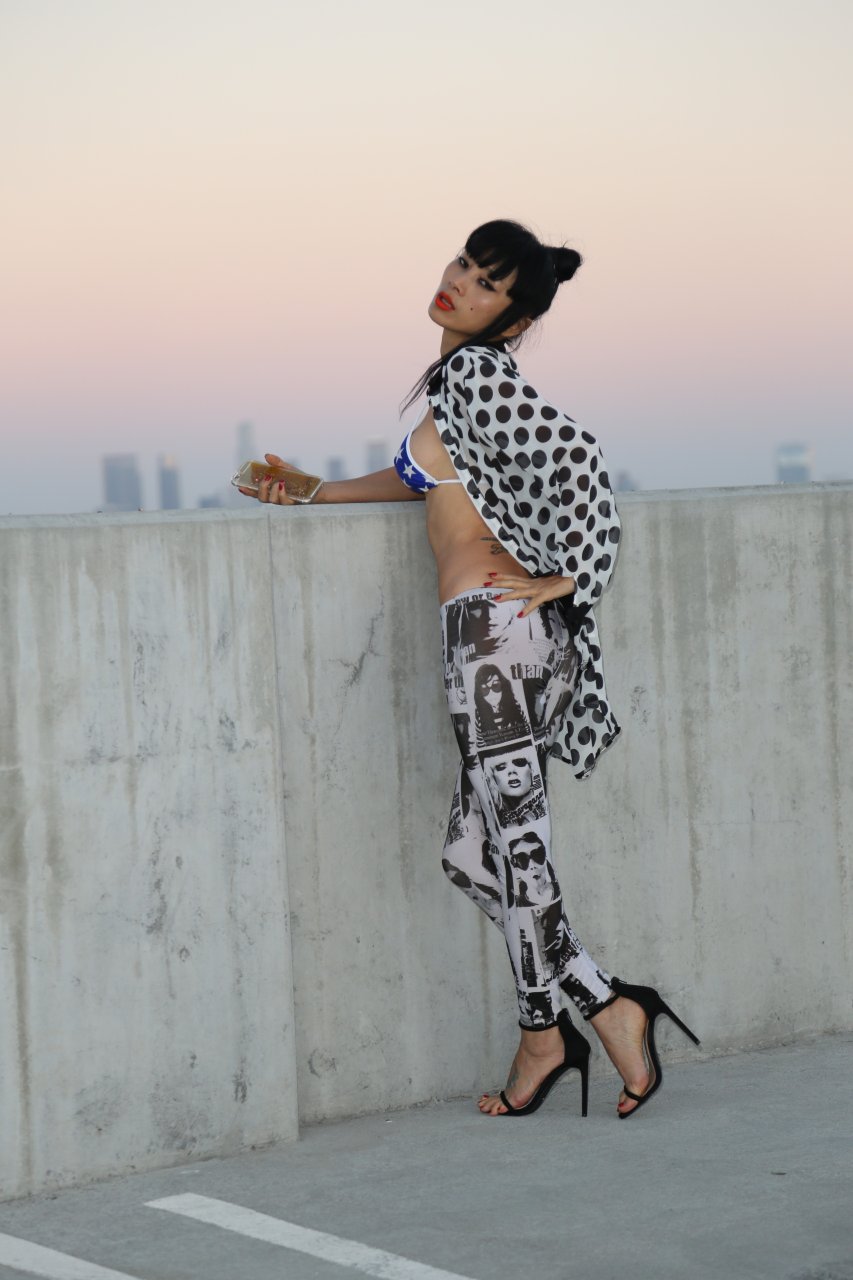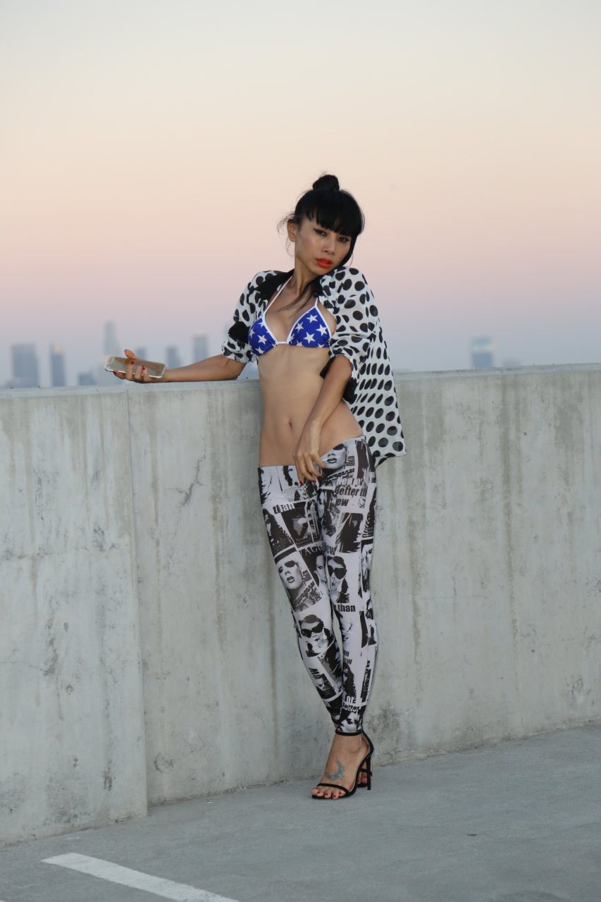 Bai Ling muestra su cintura pequeña con un bikini azul-naranja en el estacionamiento del Teatro ArcLight en Los Ángeles, 10/08/2016. Bai Ling es una actriz chino-estadounidense. Edad: 49 (10 de octubre de 1966).