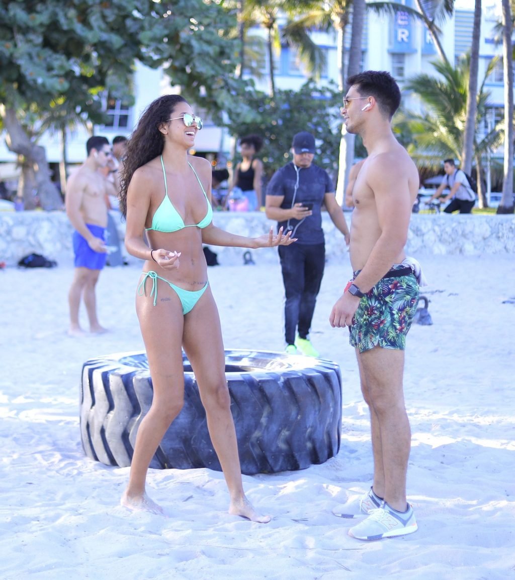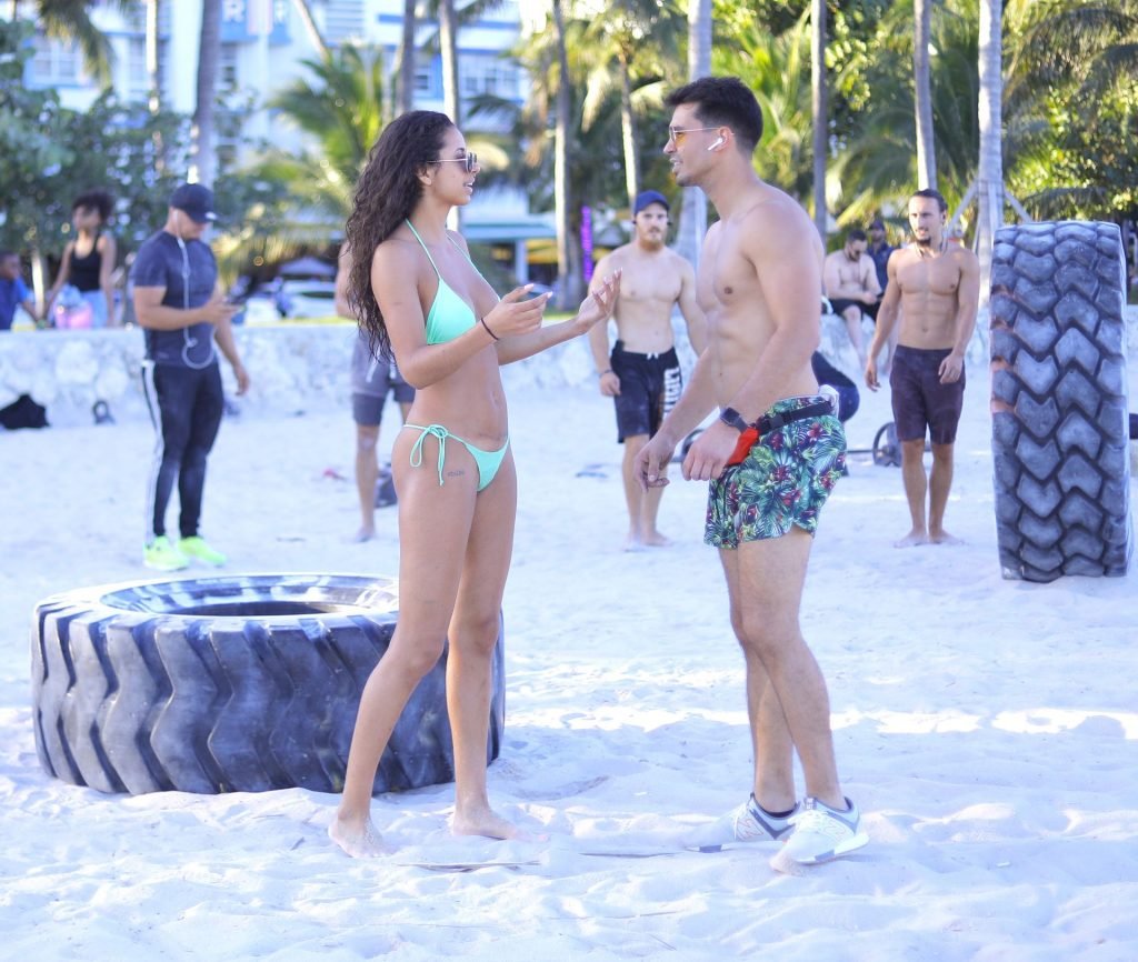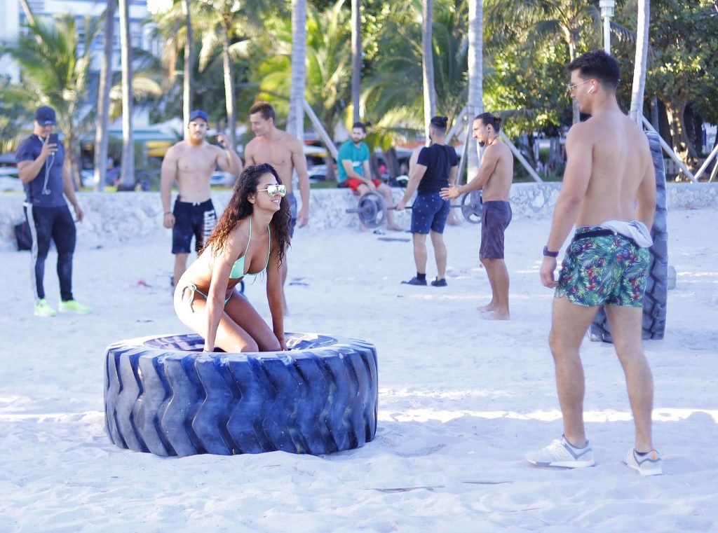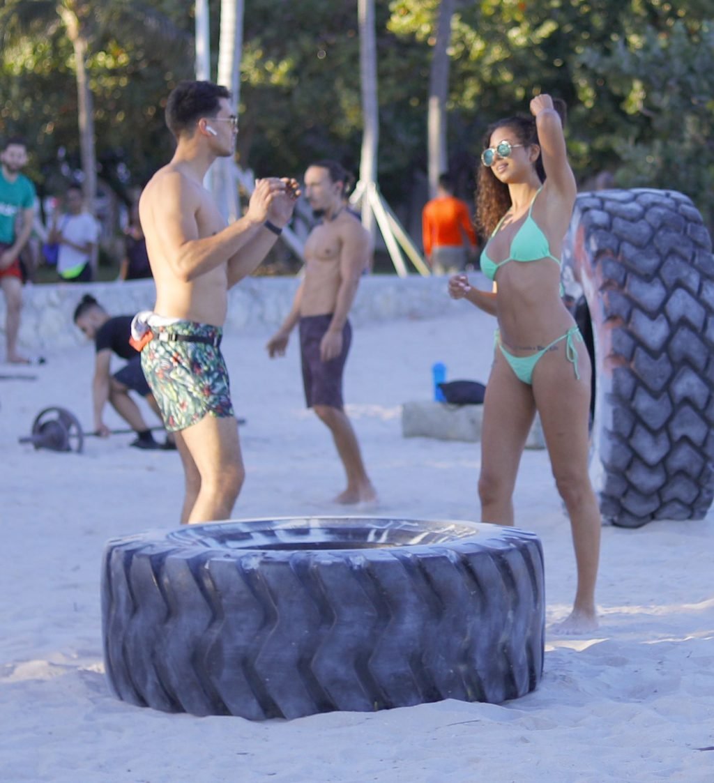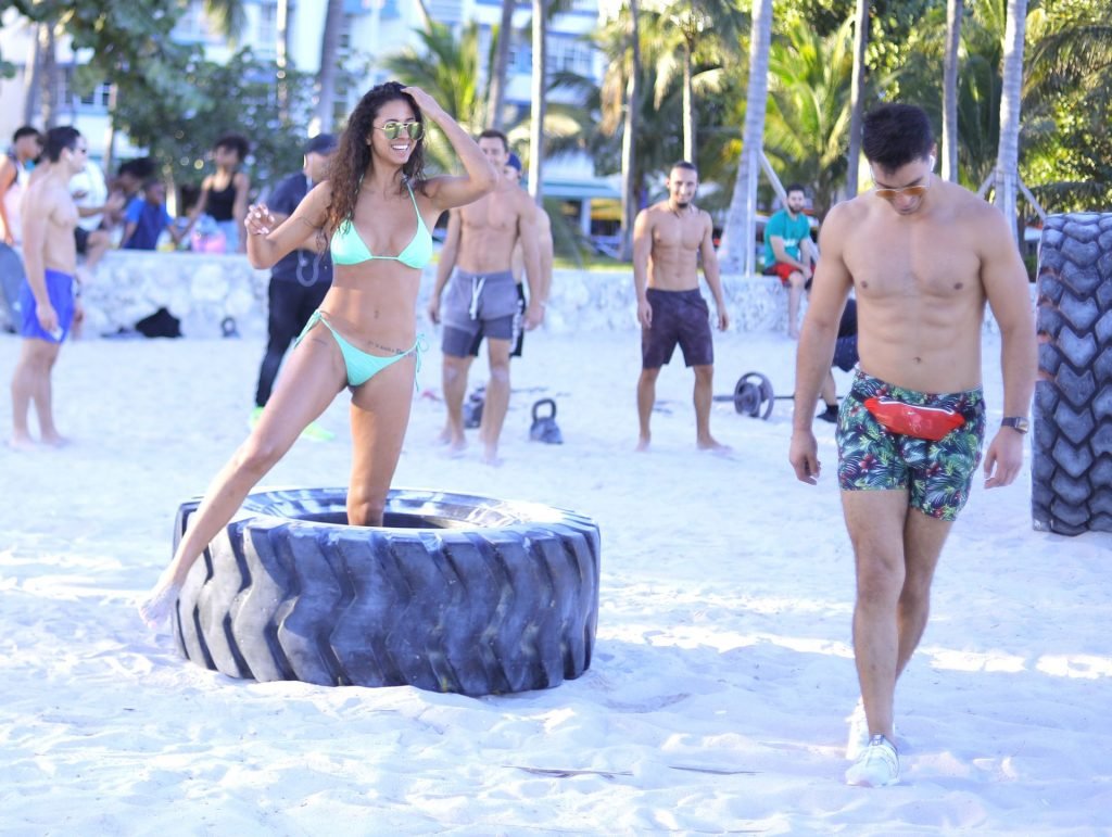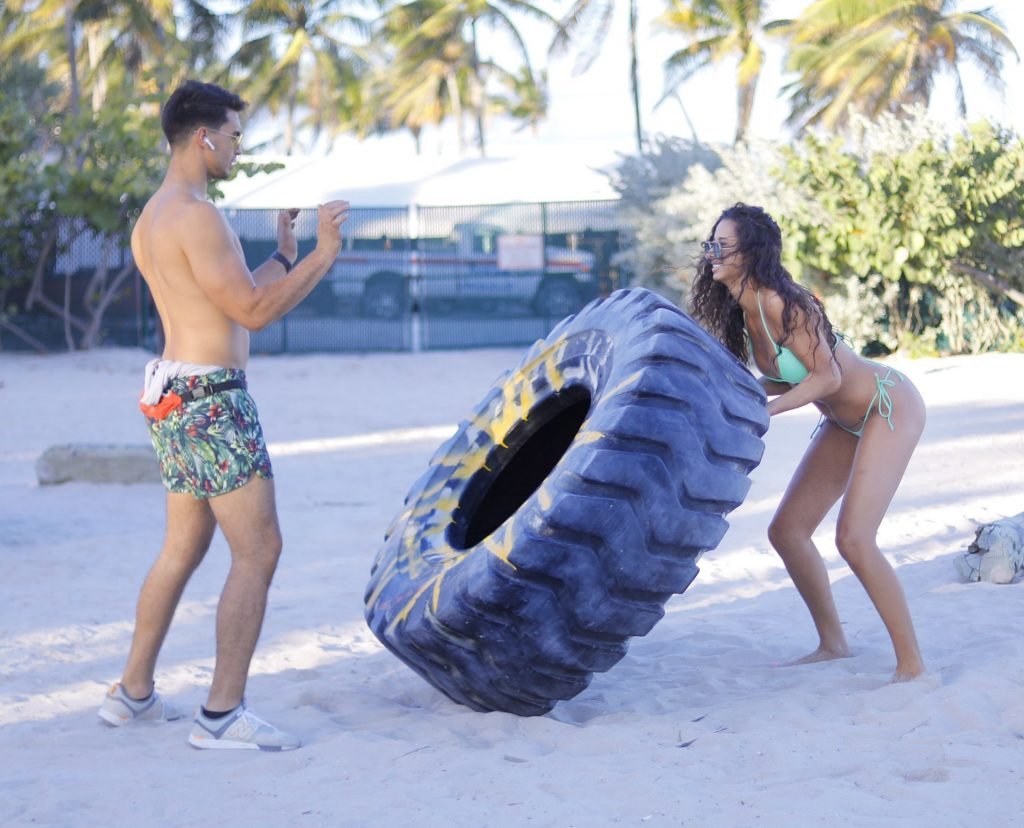 La modelo alemana Rebecca (Becca) Scott muestra su cuerpo tonificado con un traje de baño y realiza un entrenamiento con un entrenador mientras levanta un neumático y se ríe con él en Miami Beach, 01/08/2019.