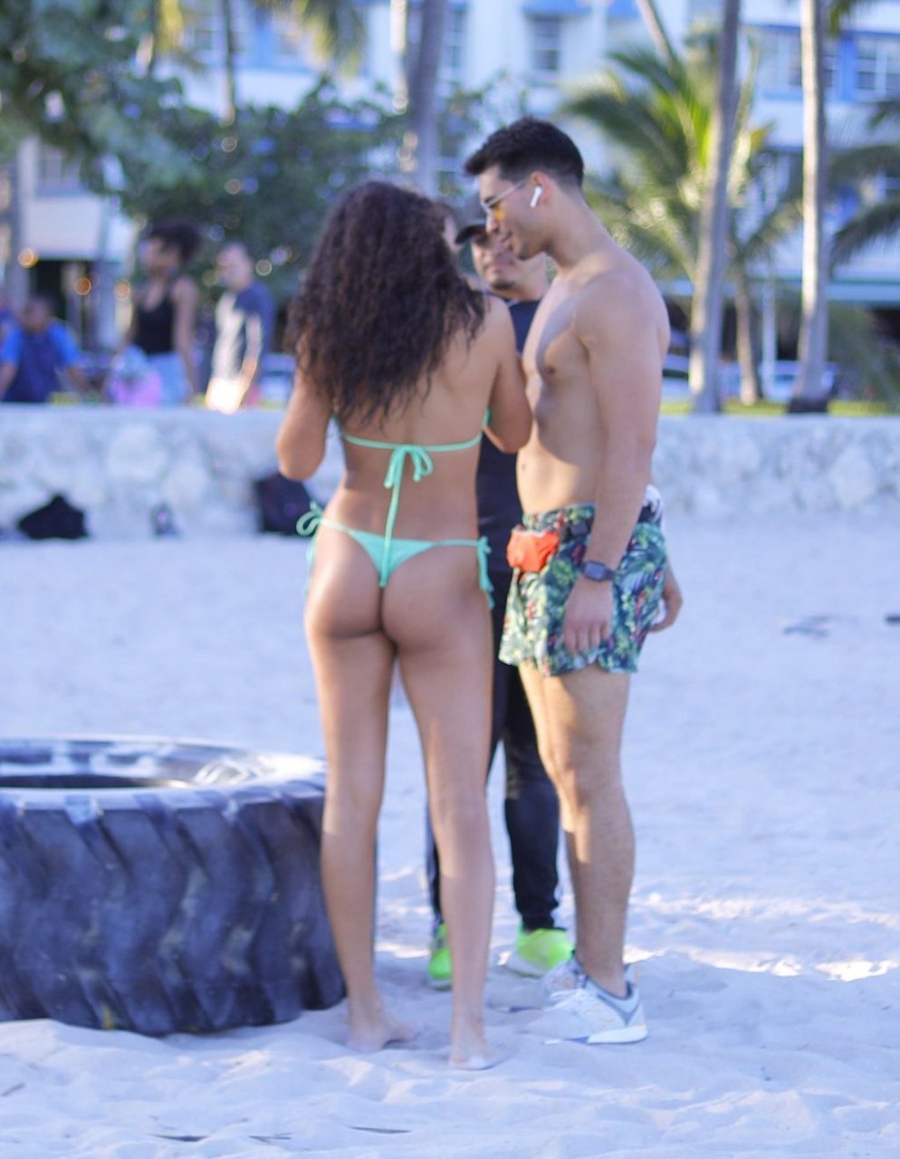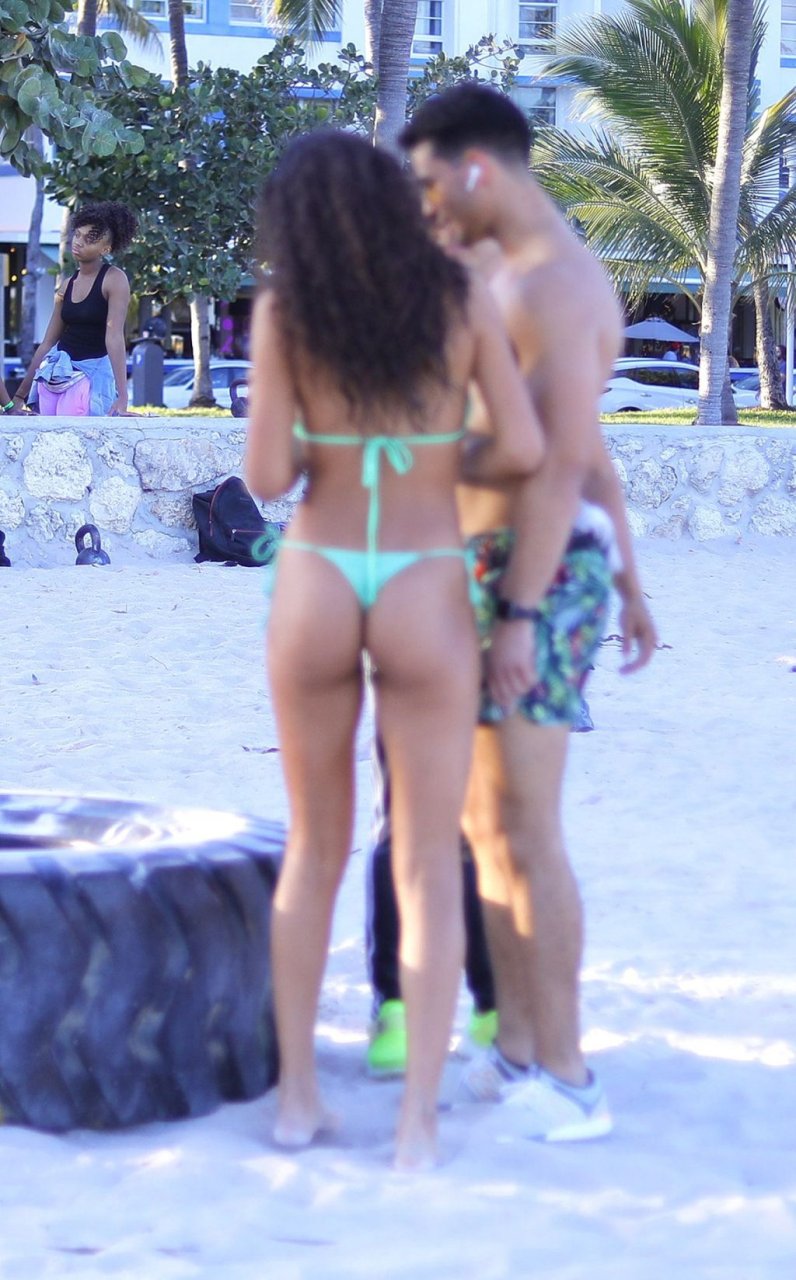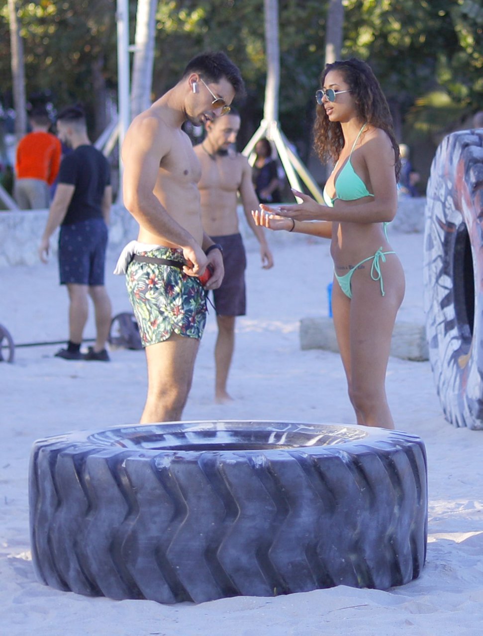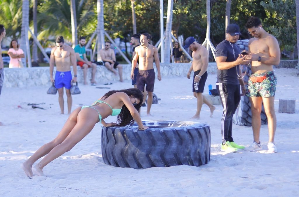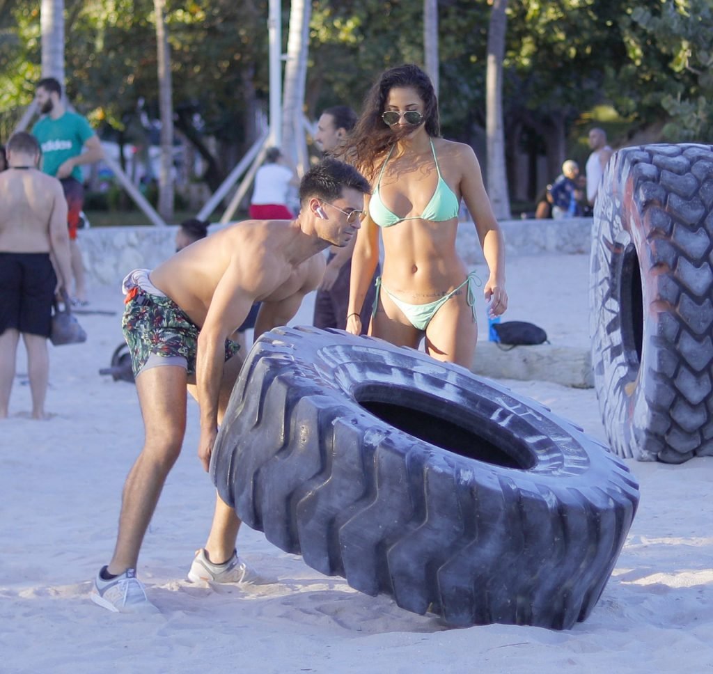 La modelo alemana Rebecca (Becca) Scott muestra su cuerpo tonificado con un traje de baño y realiza un entrenamiento con un entrenador mientras levanta un neumático y se ríe con él en Miami Beach, 01/08/2019.