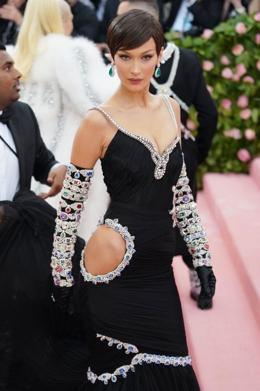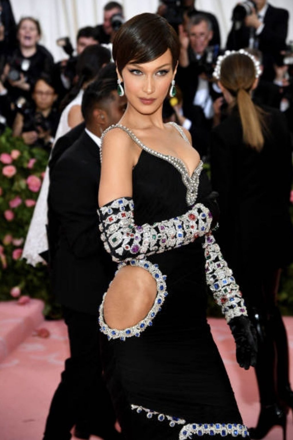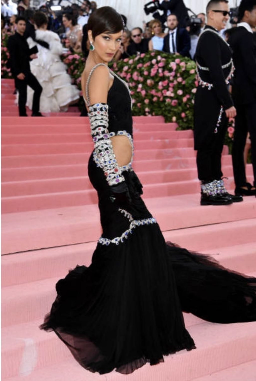 Model Bella Hadid apareció en la alfombra roja del MET Gala 2019 en Nueva York, 05/06/2019. Su vestido largo de terciopelo negro estaba decorado con piedras preciosas y 30 pulseras masivas. ¿Cuál es el peso del vestido de gala?