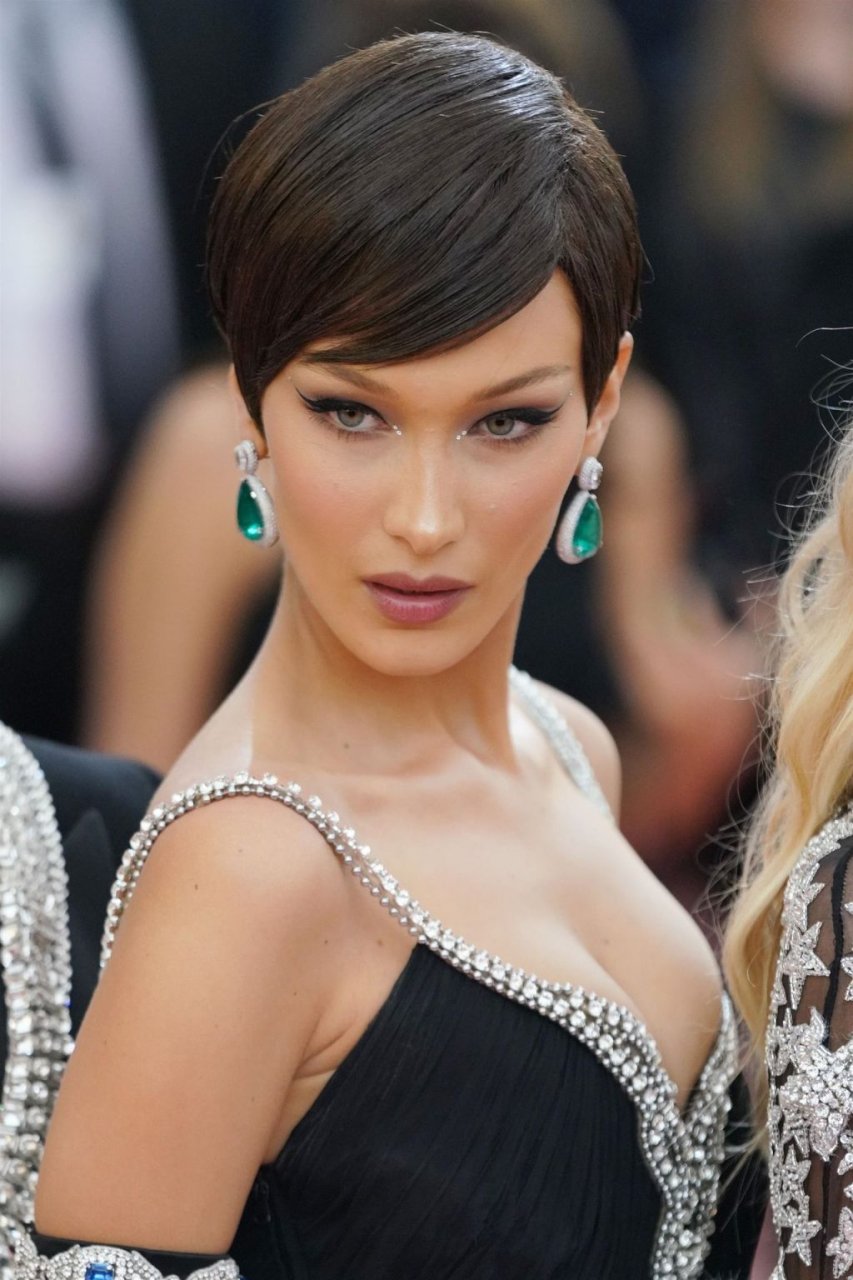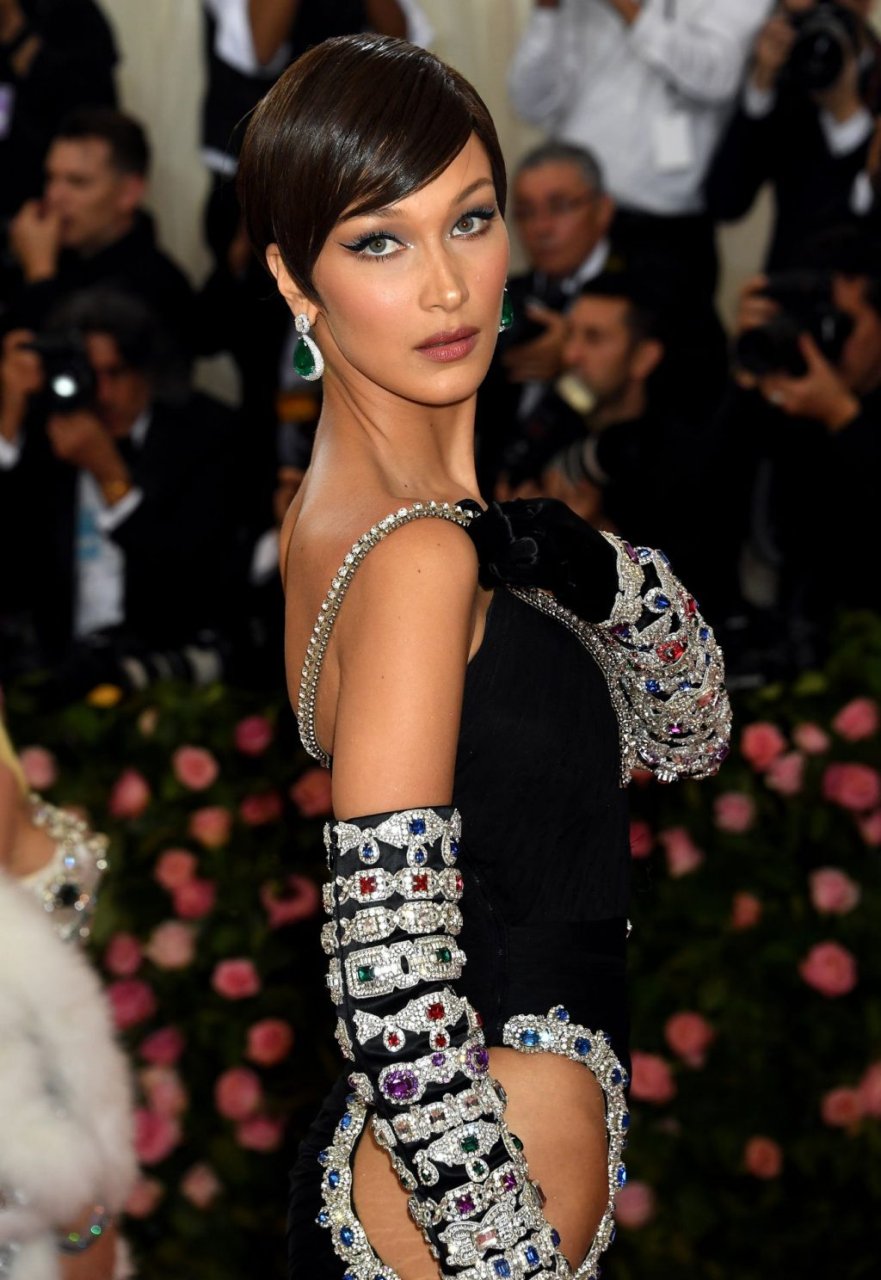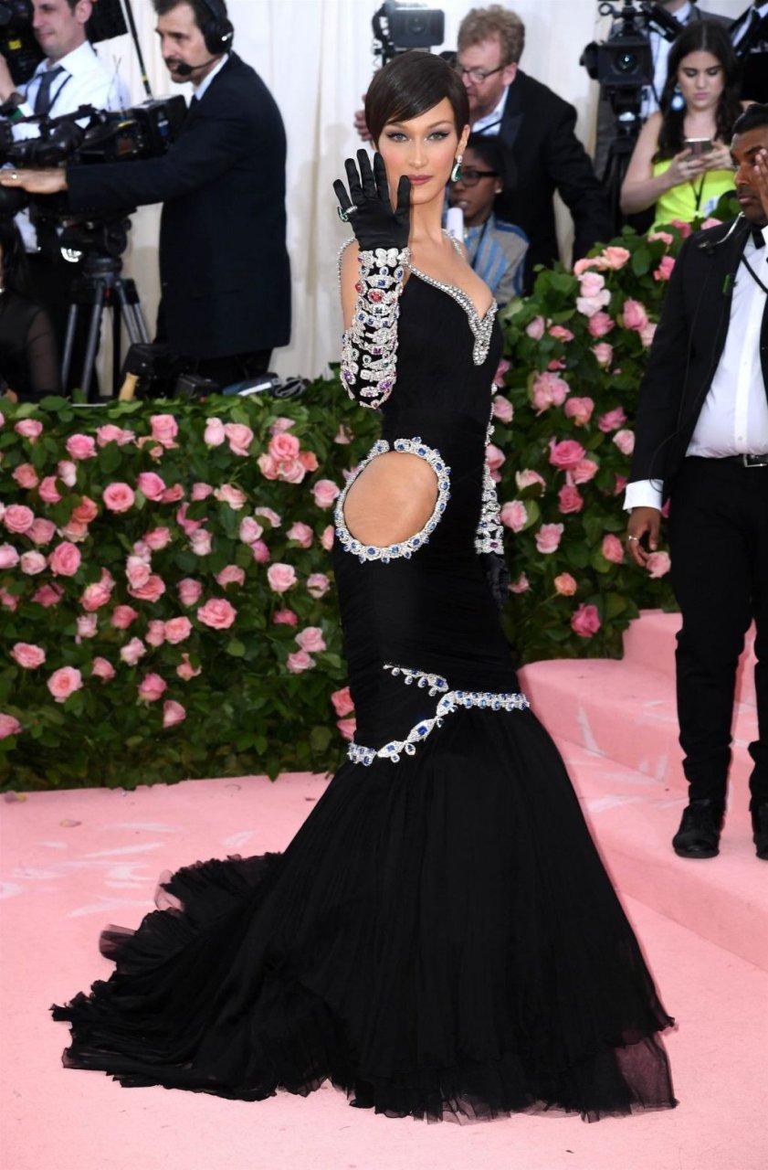 Model Bella Hadid apareció en la alfombra roja del MET Gala 2019 en Nueva York, 05/06/2019. Su vestido largo de terciopelo negro estaba decorado con piedras preciosas y 30 pulseras masivas. ¿Cuál es el peso del vestido de gala?