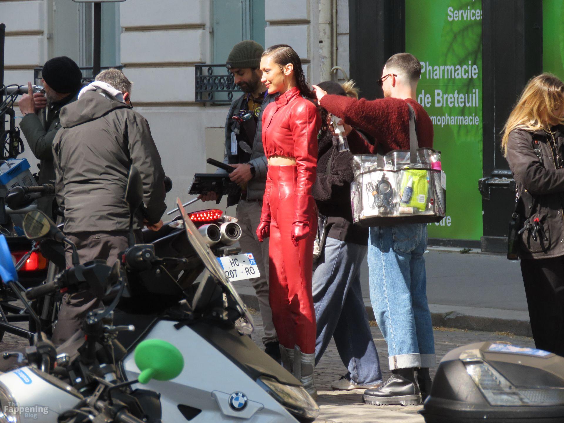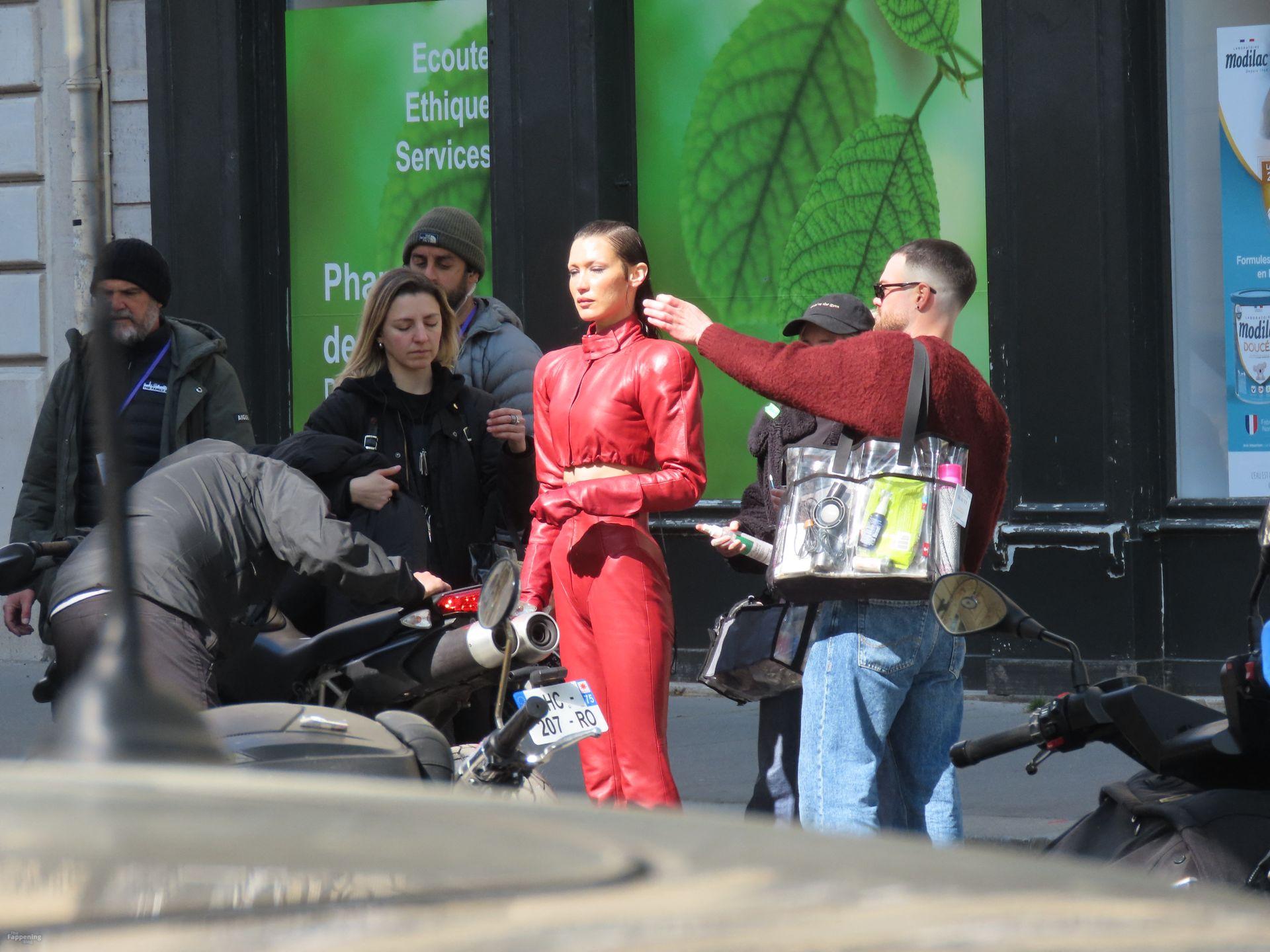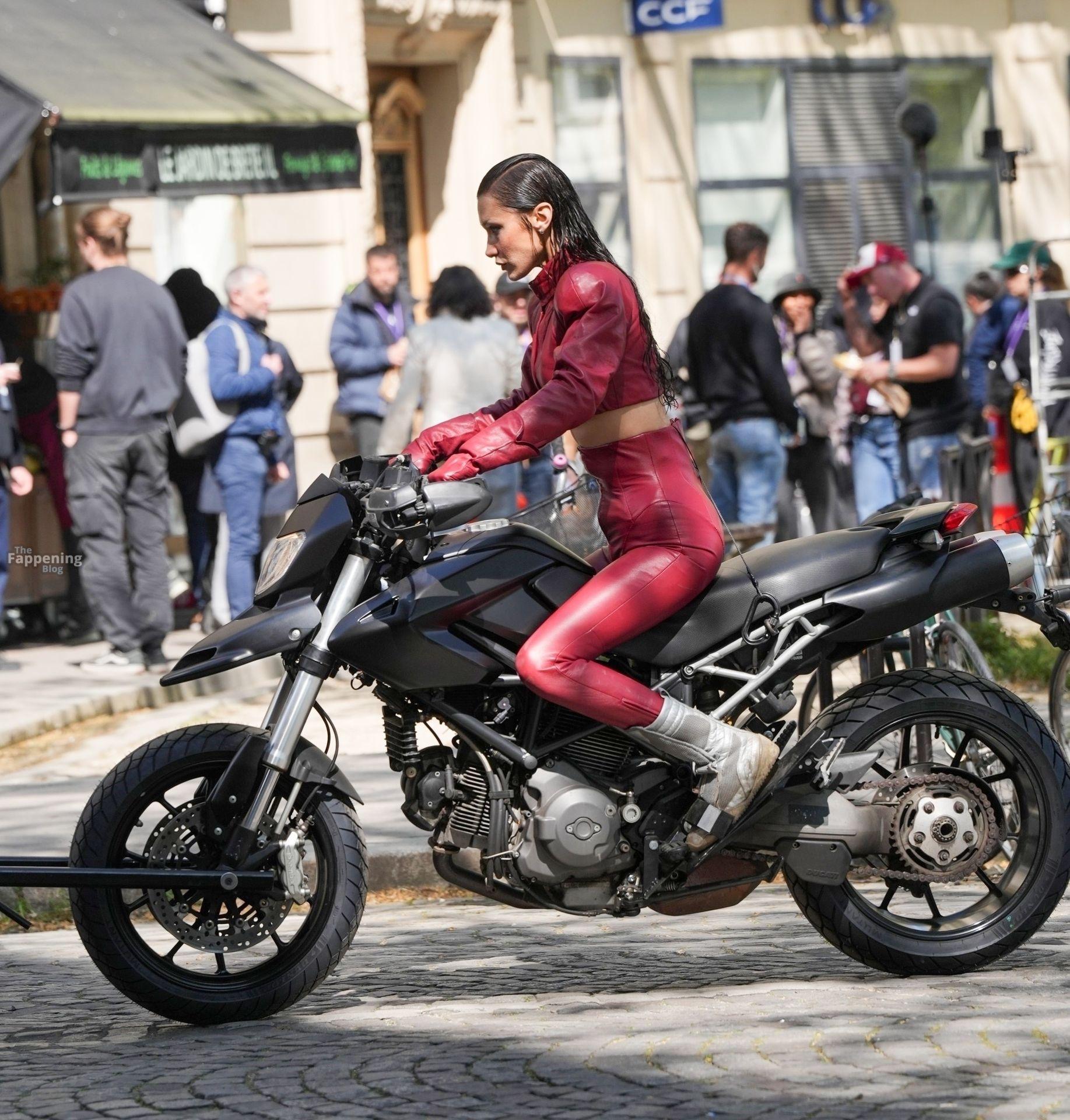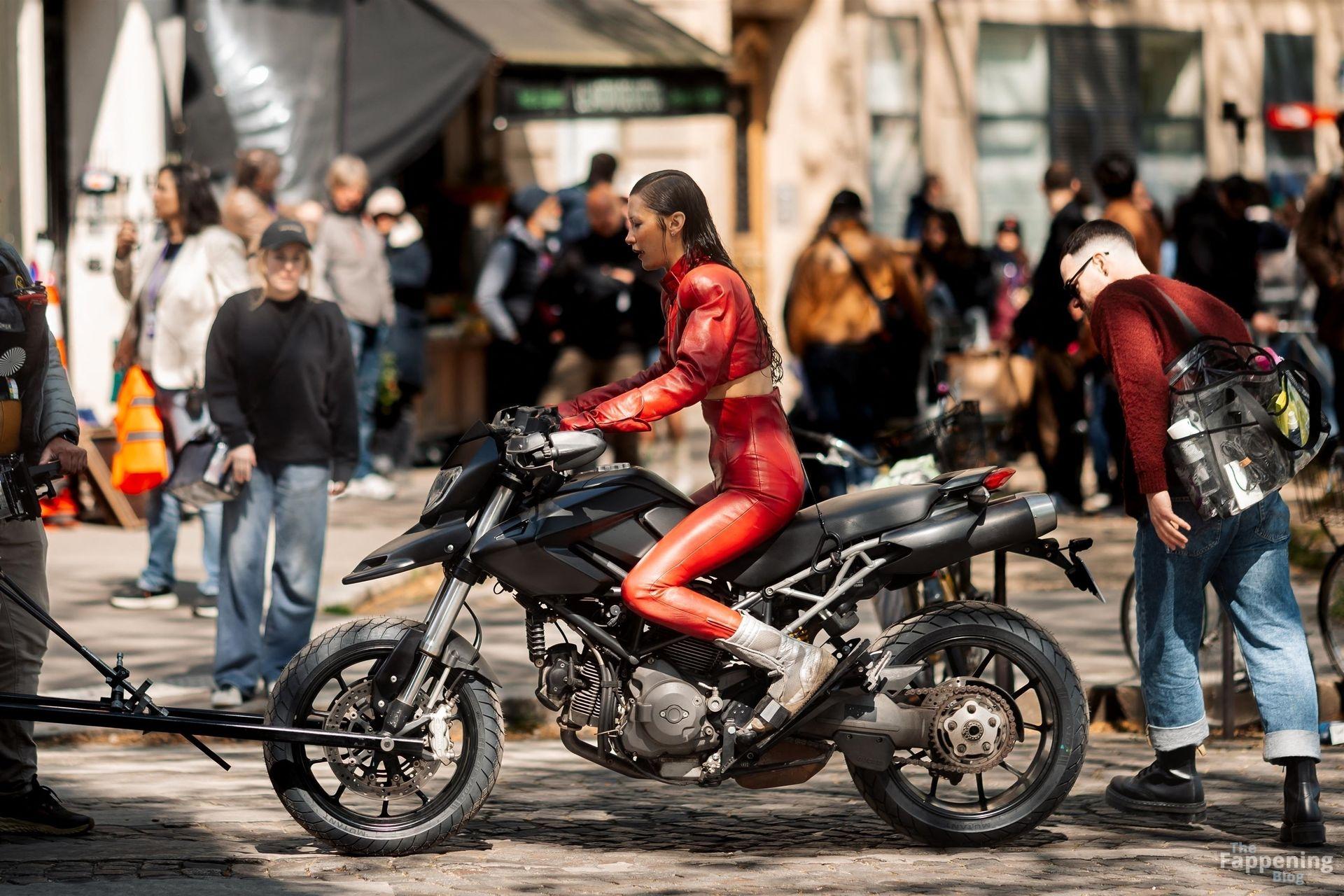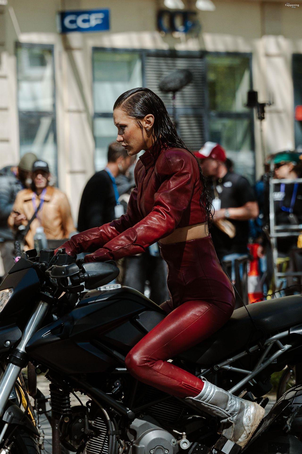 Bella Hadid es fotografiada en París, luciendo un mono de cuero rojo fuego y montando una moto. Después de ese loco accidente con el maniquí, está interpretando un papel duro con una fea lesión en la pierna para una escena en la serie “The Beauty” en París, Francia.