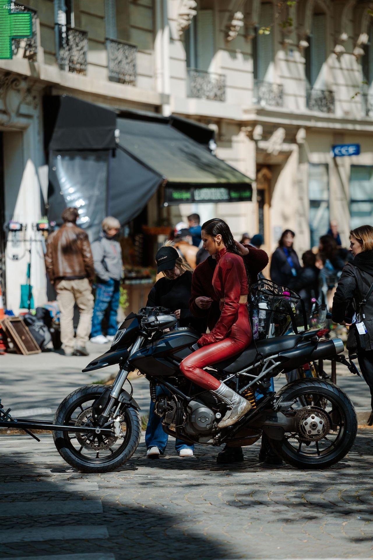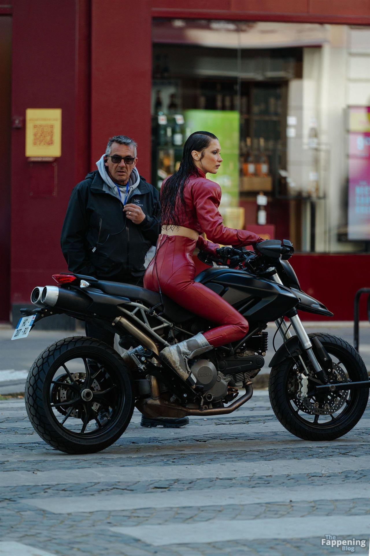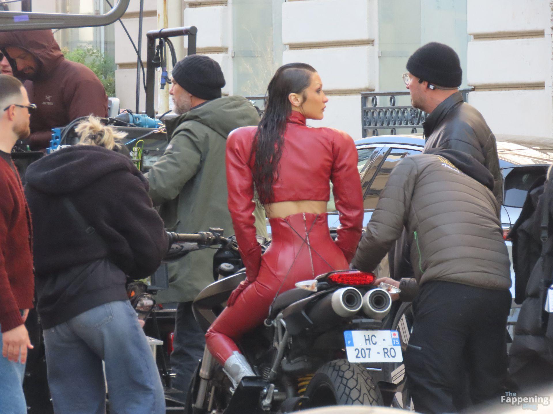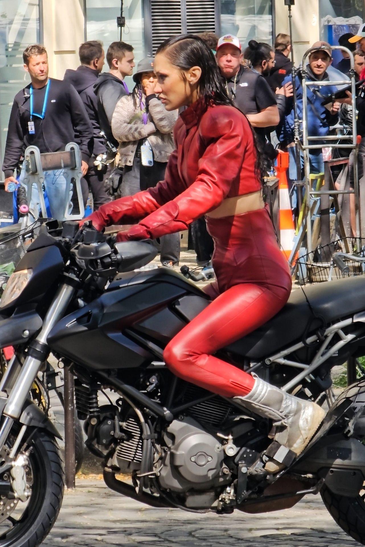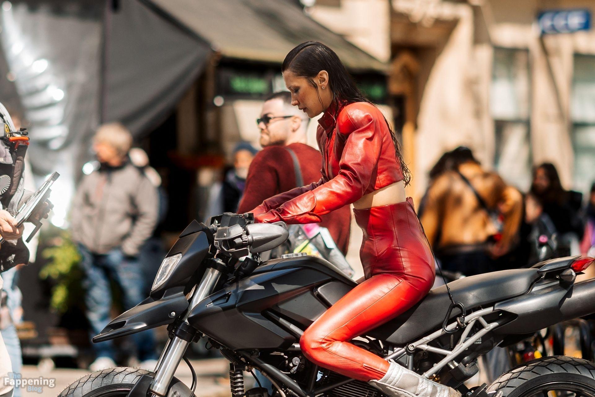 Bella Hadid es fotografiada en París, luciendo un mono de cuero rojo fuego y montando una moto. Después de ese loco accidente con el maniquí, está interpretando un papel duro con una fea lesión en la pierna para una escena en la serie “The Beauty” en París, Francia.