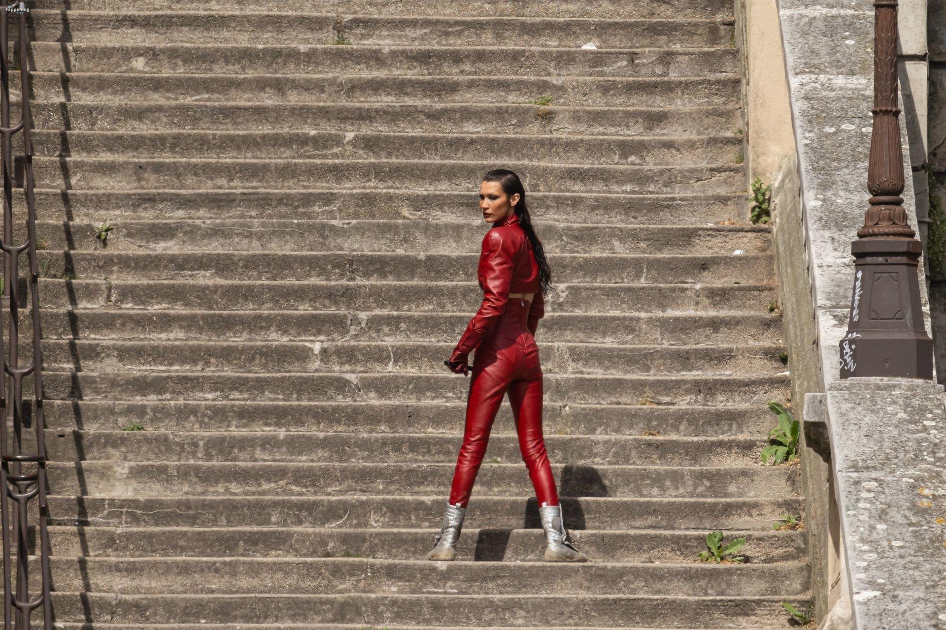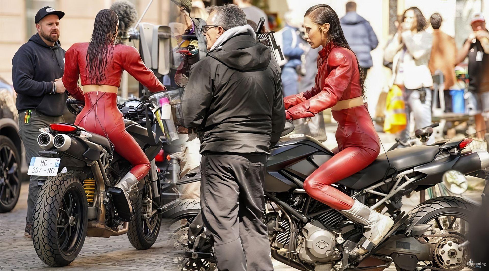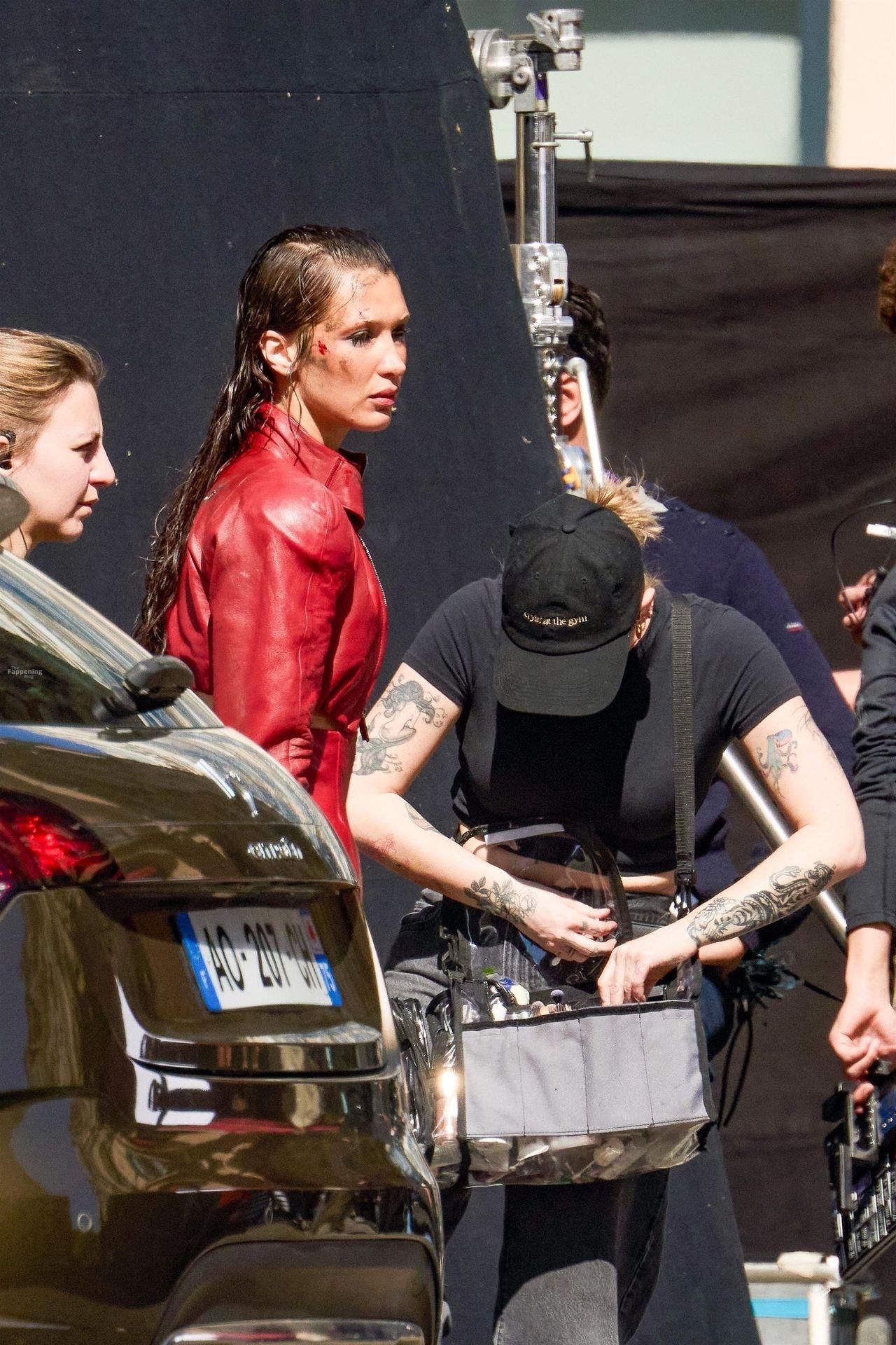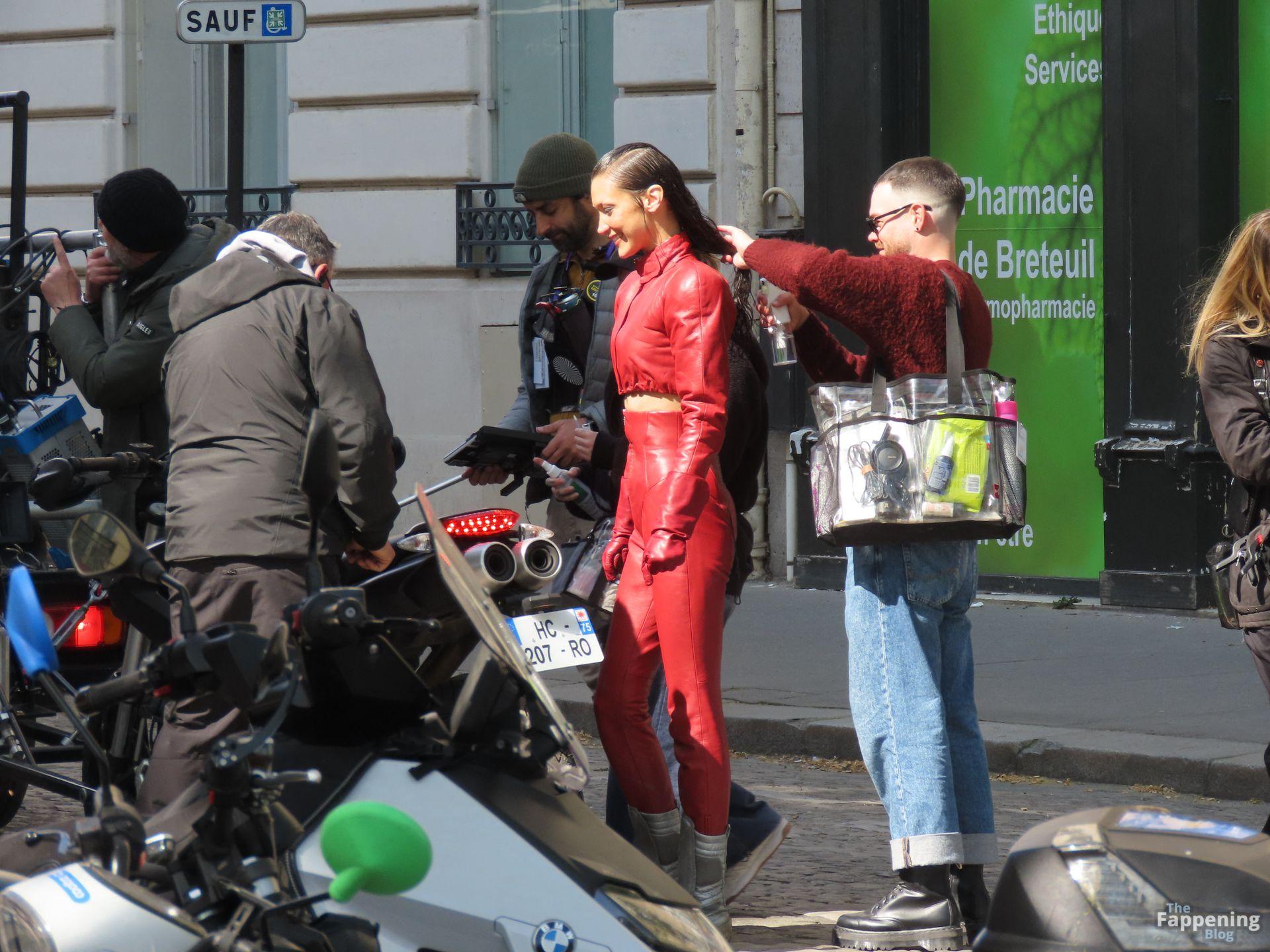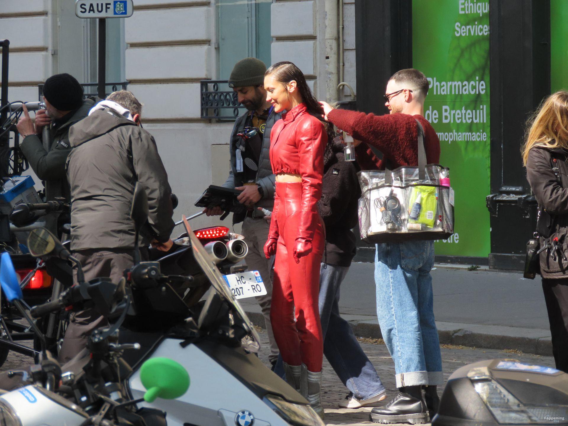 Bella Hadid es fotografiada en París, luciendo un mono de cuero rojo fuego y montando una moto. Después de ese loco accidente con el maniquí, está interpretando un papel duro con una fea lesión en la pierna para una escena en la serie “The Beauty” en París, Francia.