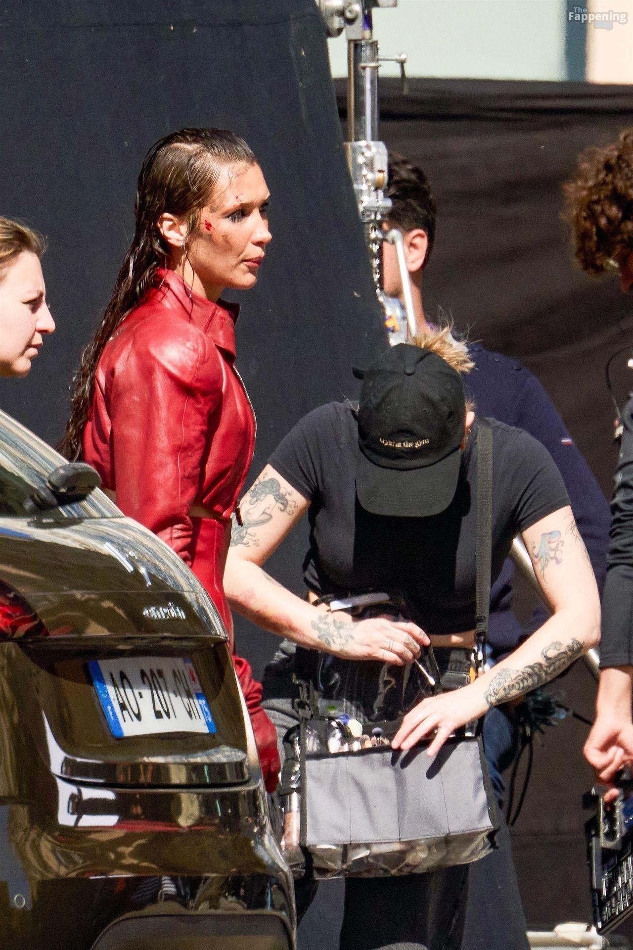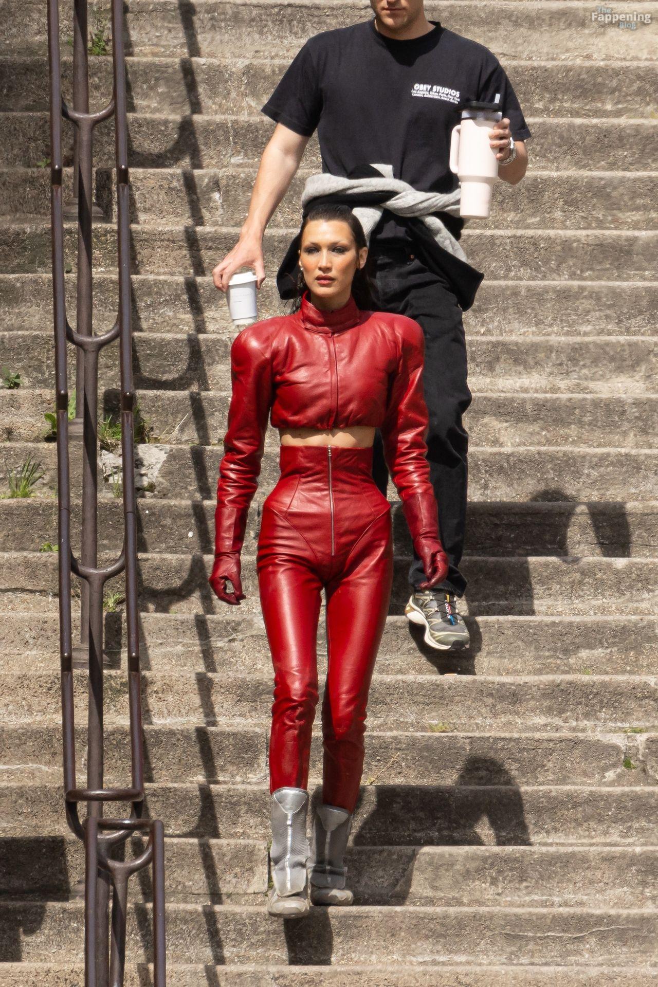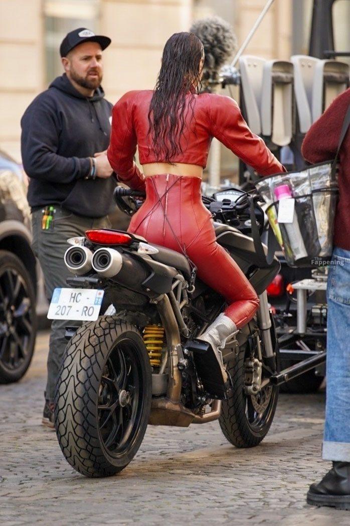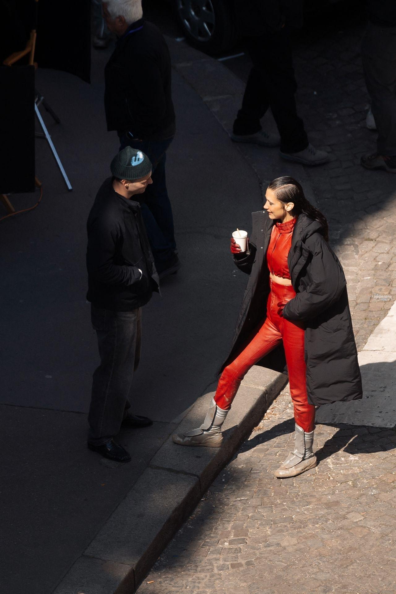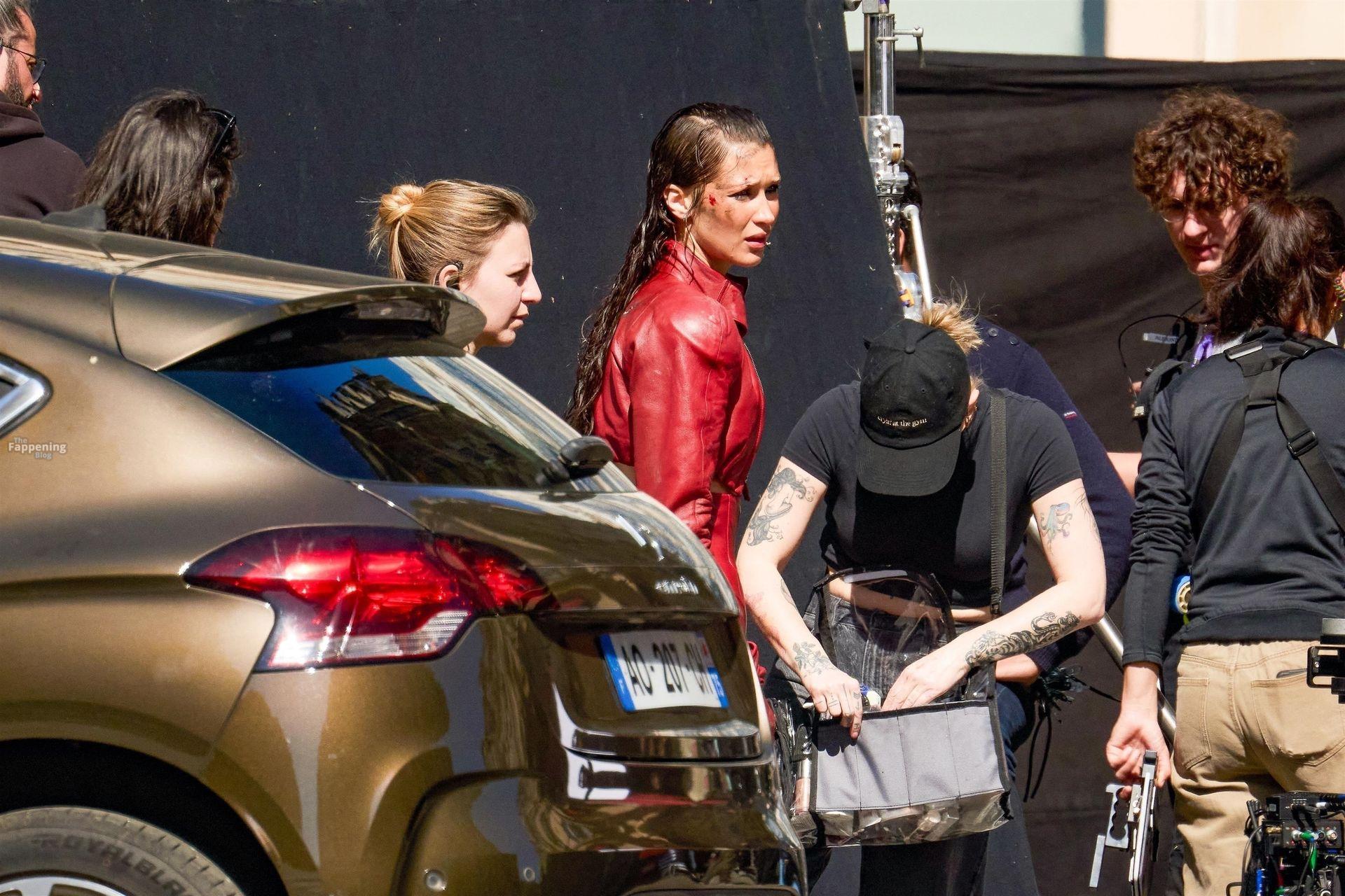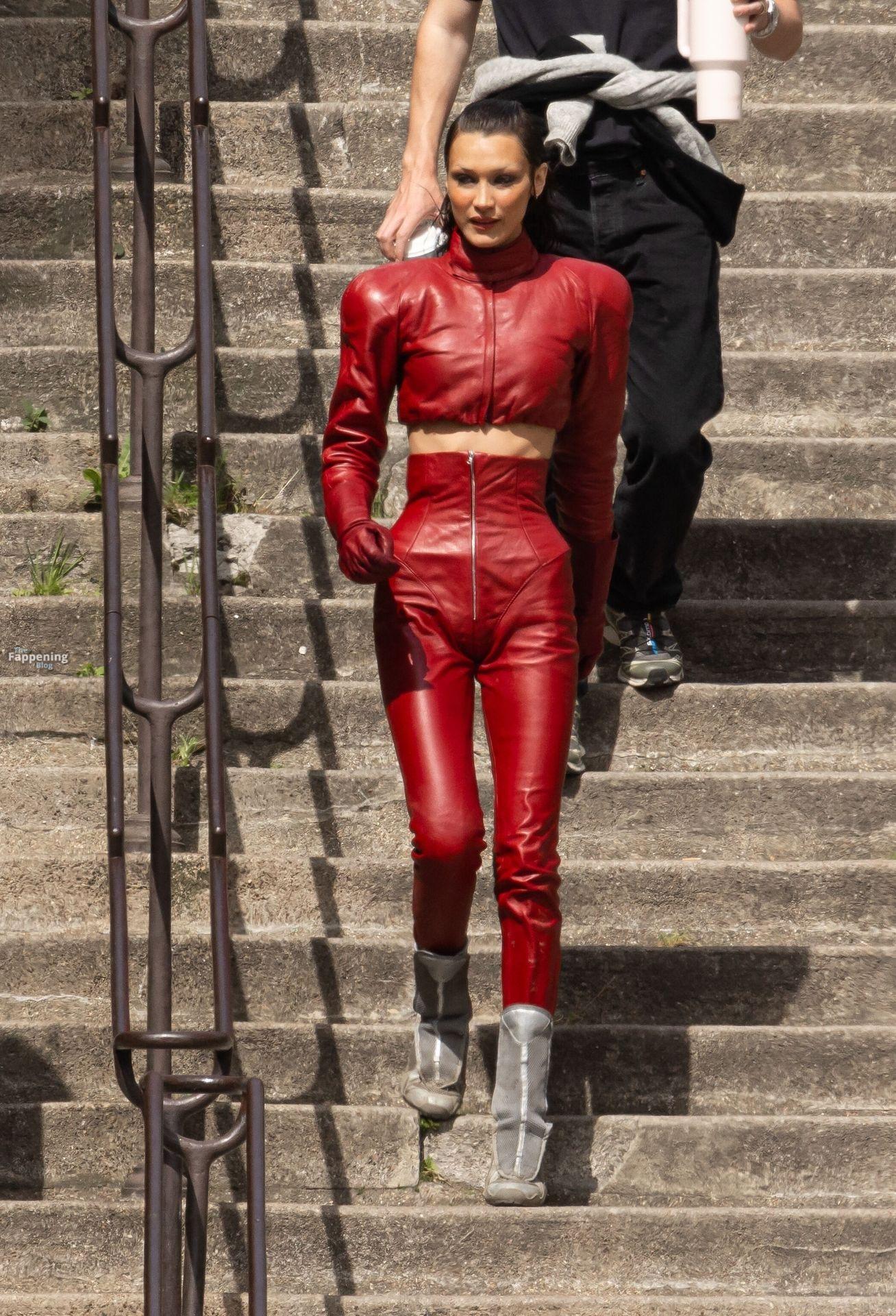 Bella Hadid es fotografiada en París, luciendo un mono de cuero rojo fuego y montando una moto. Después de ese loco accidente con el maniquí, está interpretando un papel duro con una fea lesión en la pierna para una escena en la serie “The Beauty” en París, Francia.