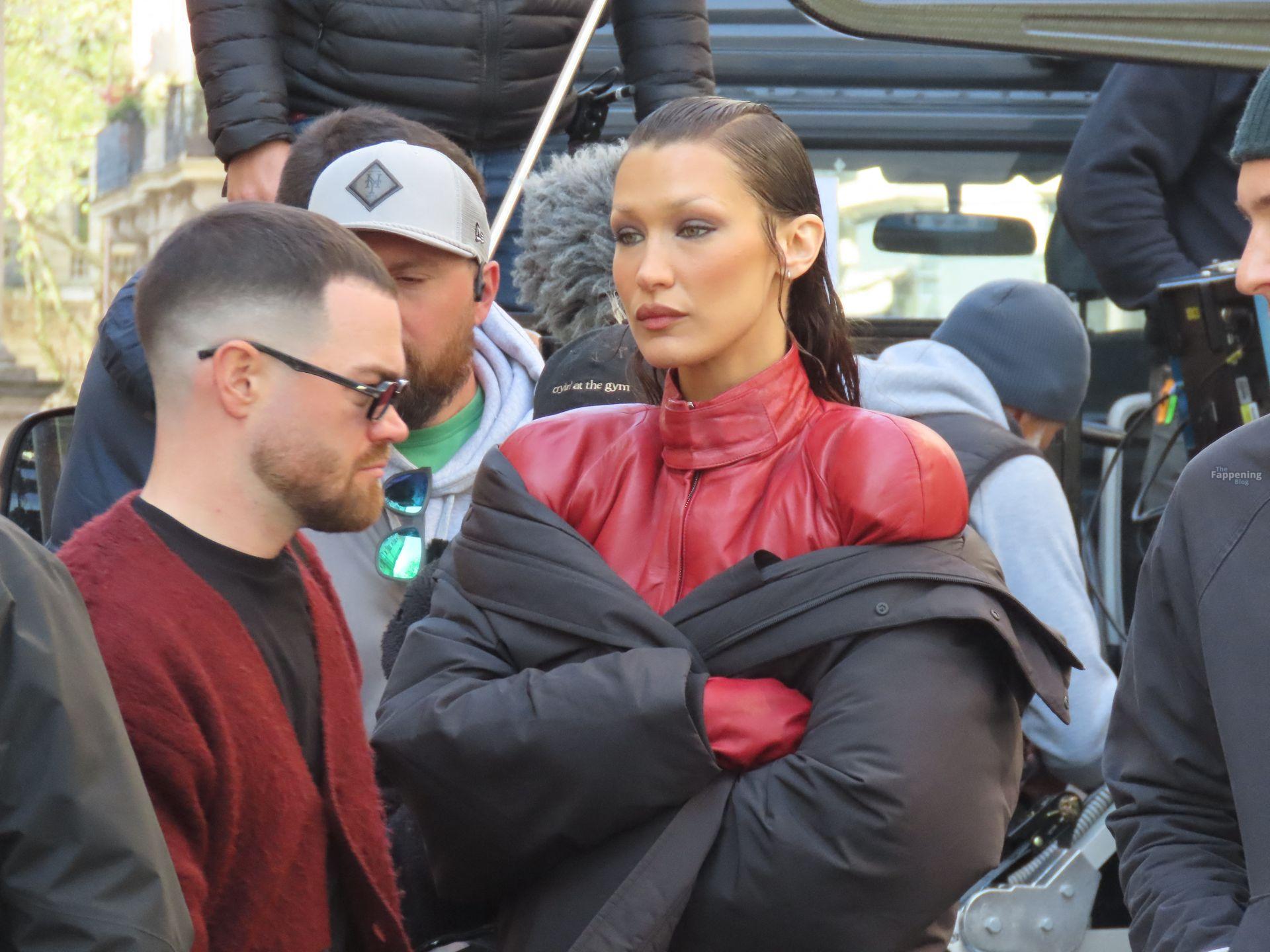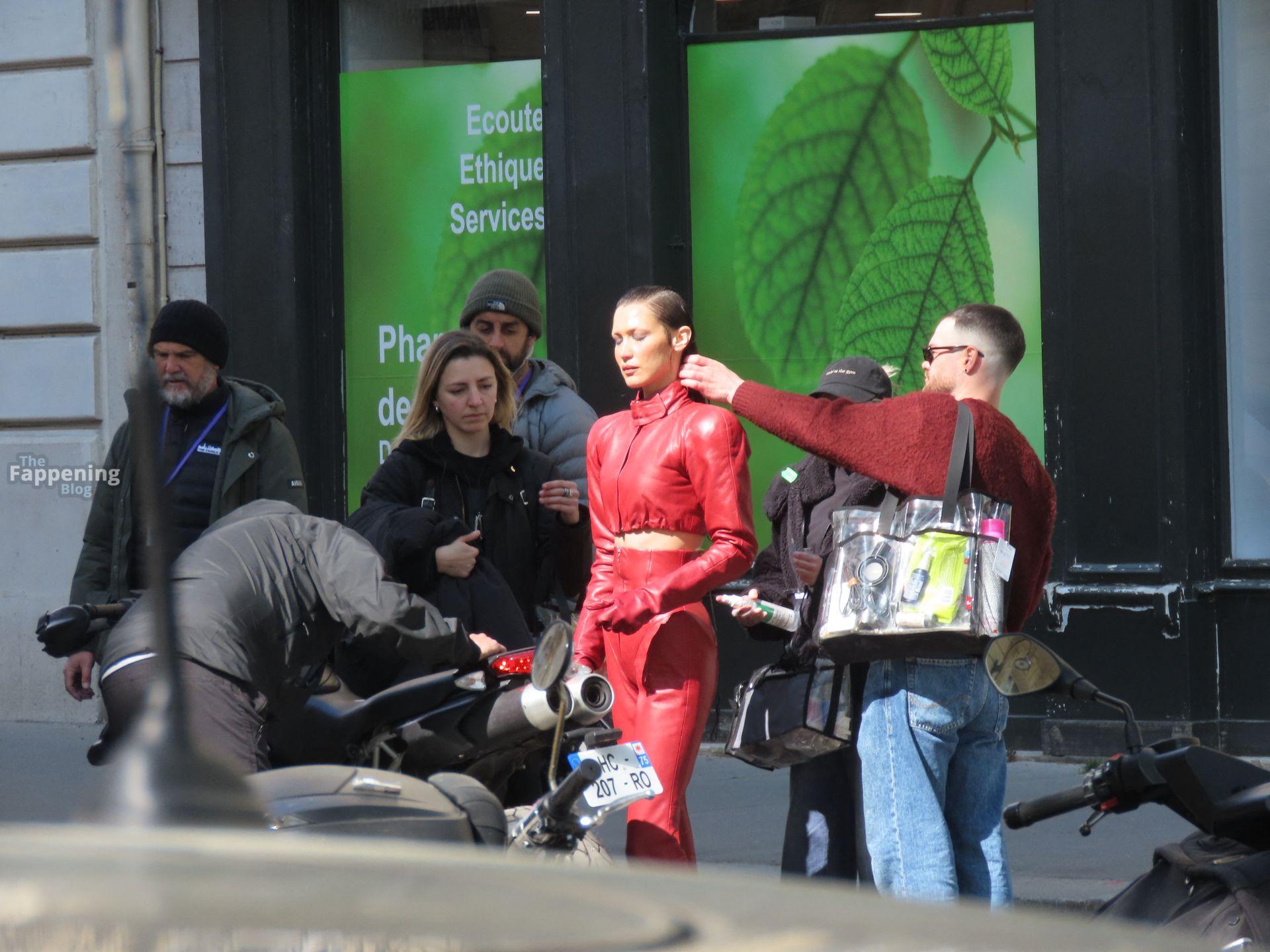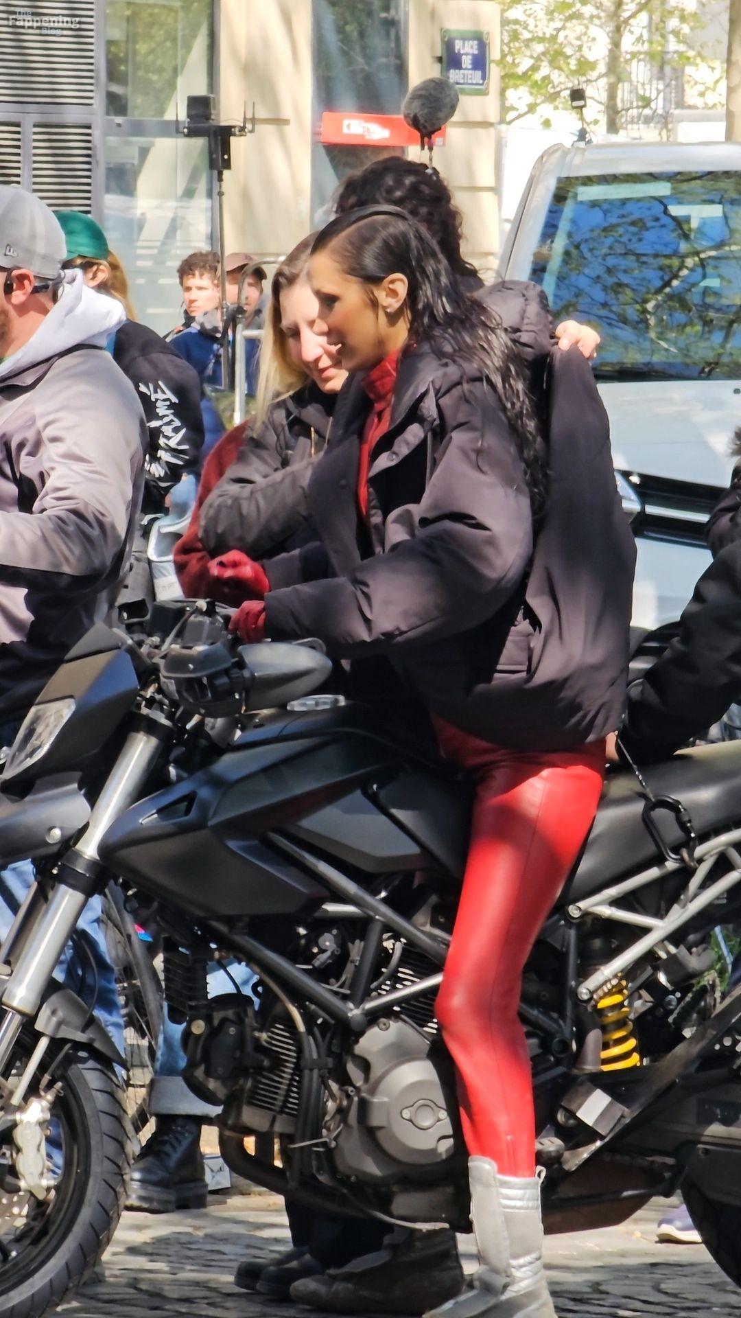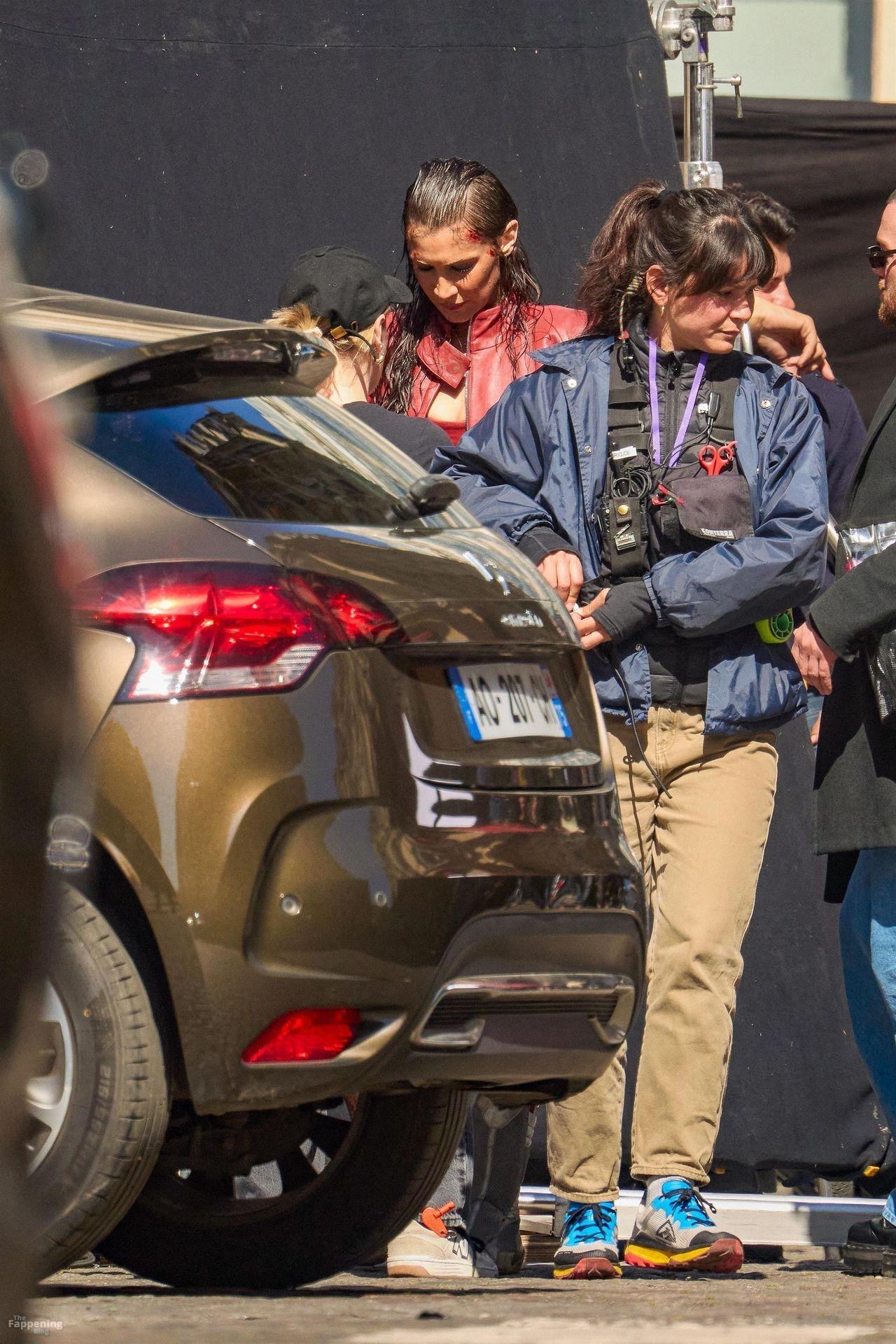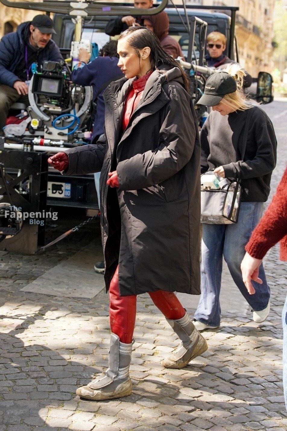 Bella Hadid es fotografiada en París, luciendo un mono de cuero rojo fuego y montando una moto. Después de ese loco accidente con el maniquí, está interpretando un papel duro con una fea lesión en la pierna para una escena en la serie “The Beauty” en París, Francia.