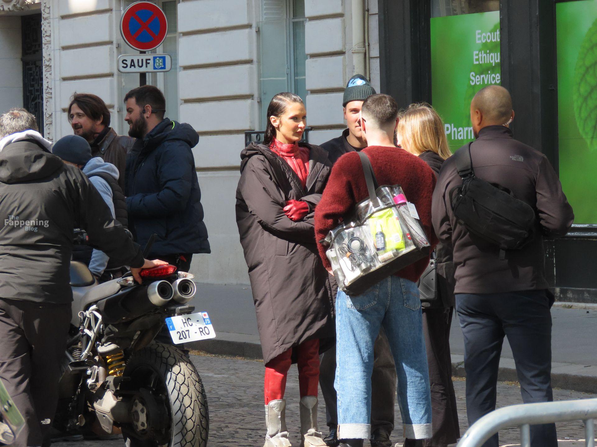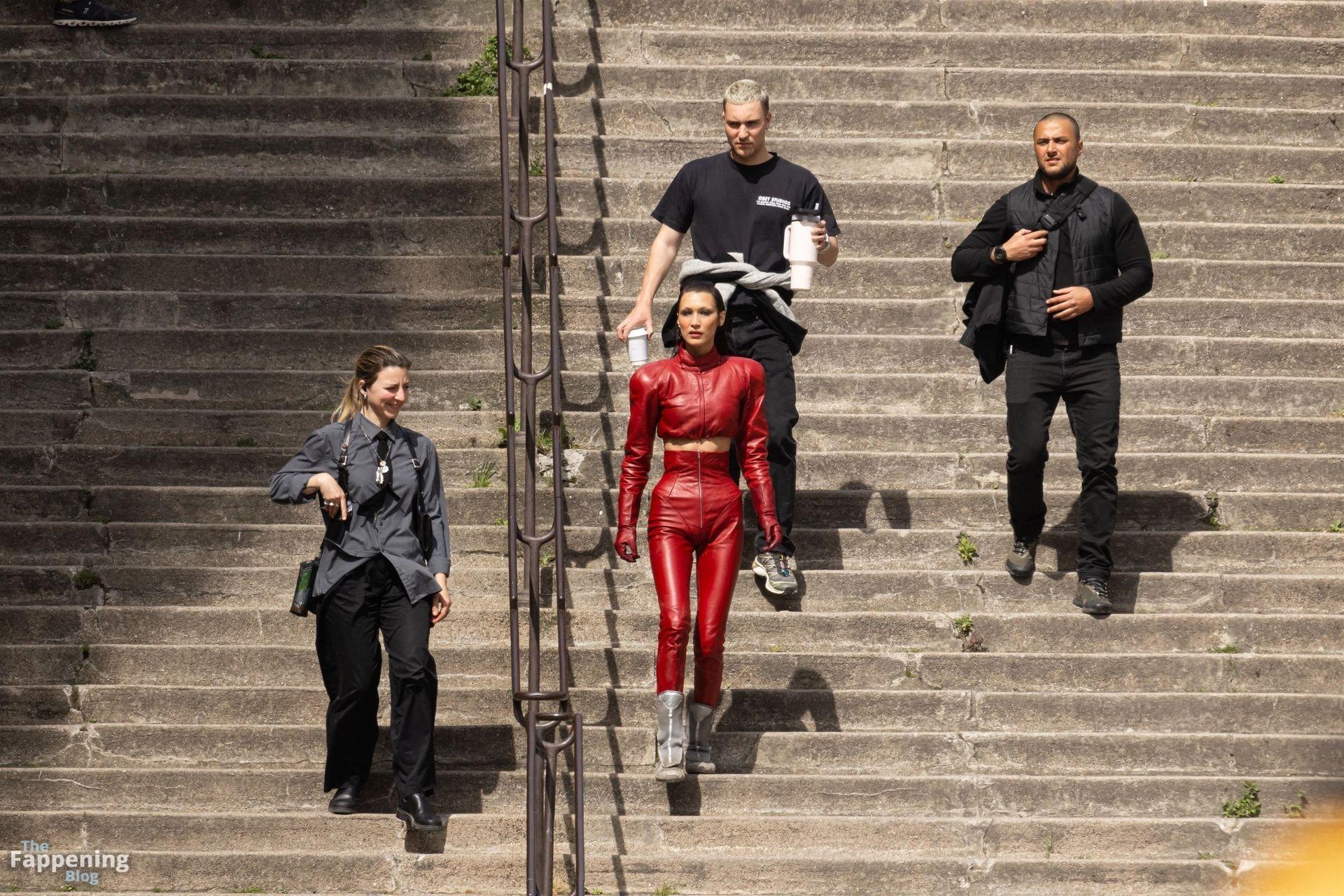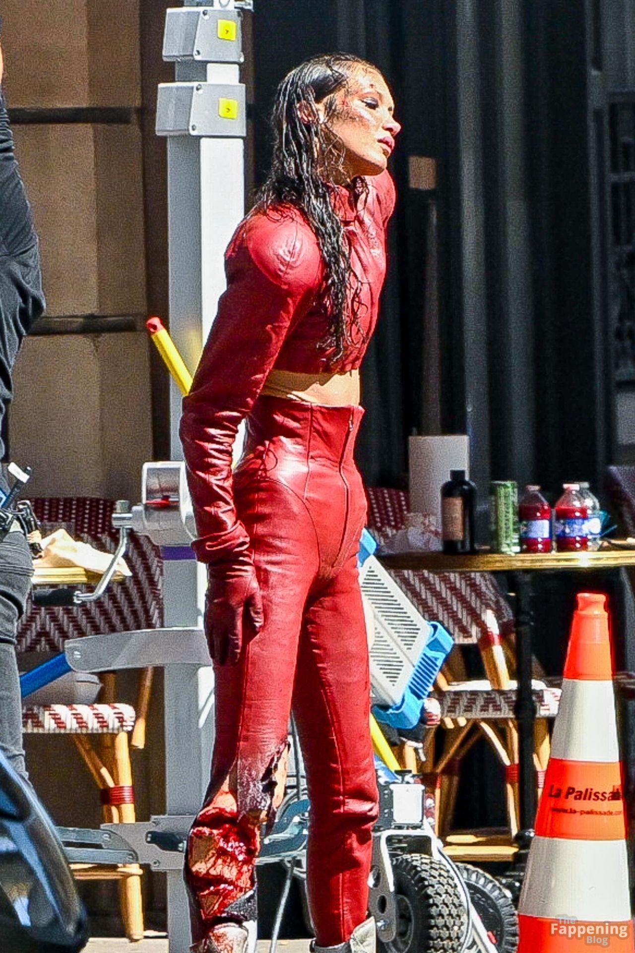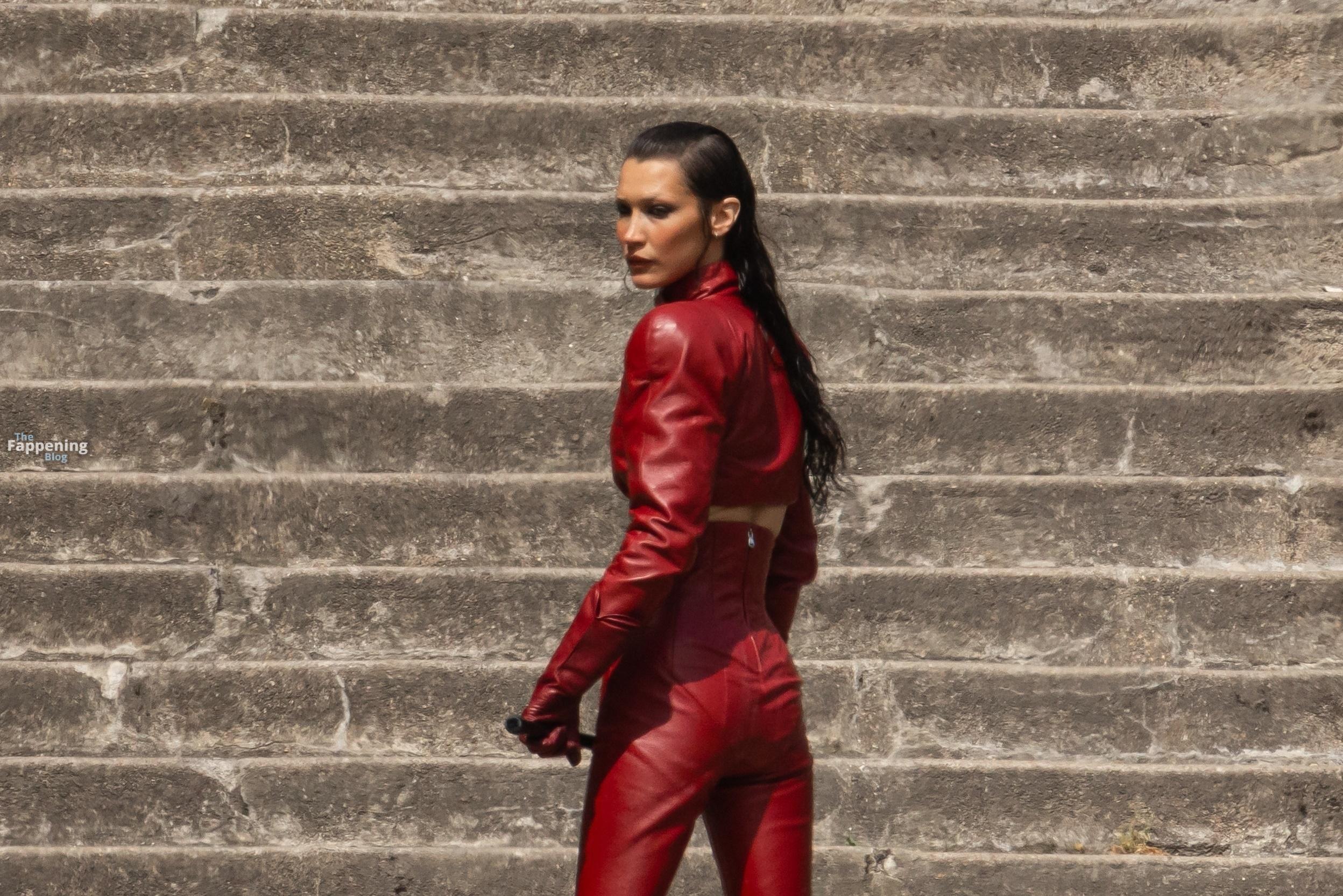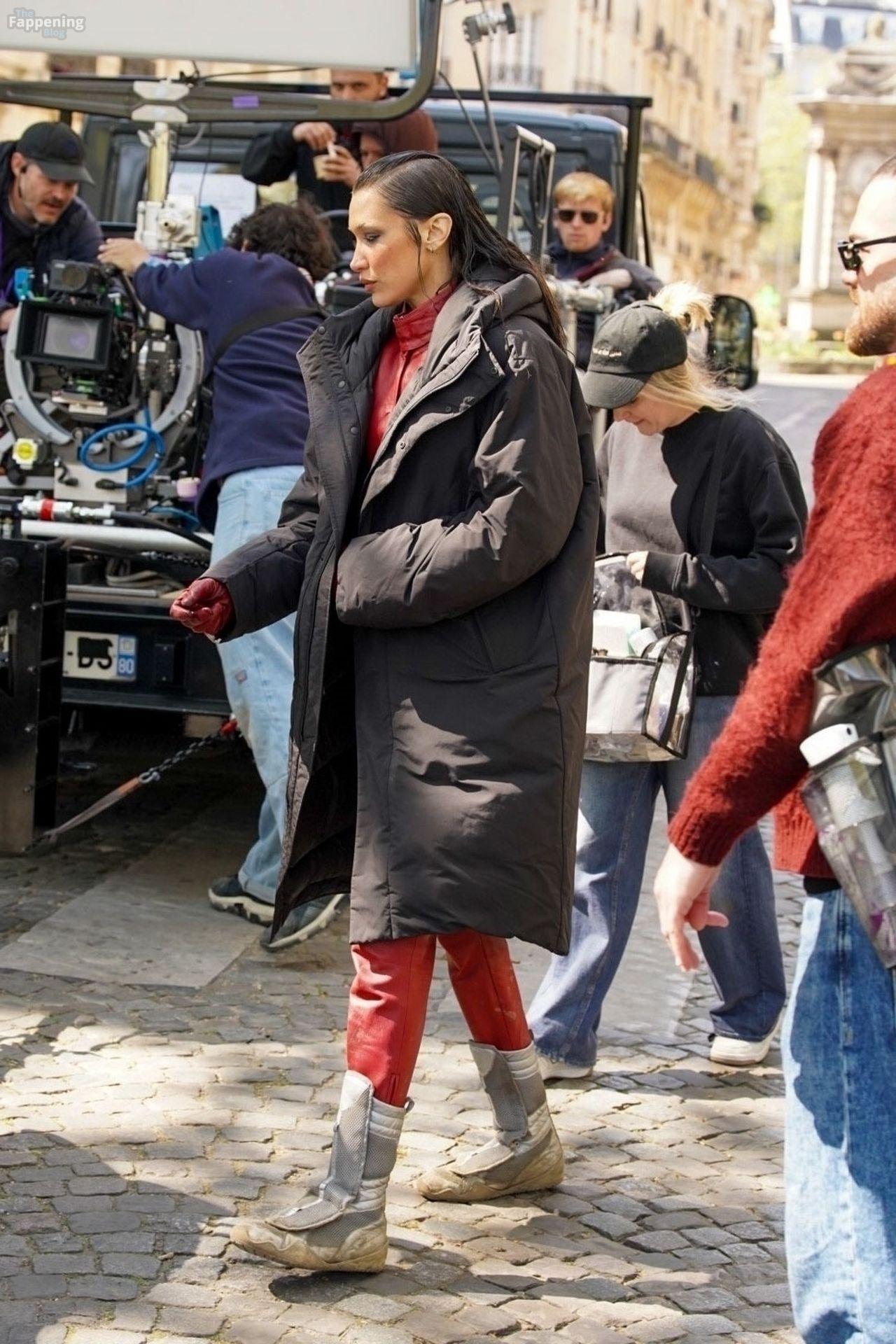 Bella Hadid es fotografiada en París, luciendo un mono de cuero rojo fuego y montando una moto. Después de ese loco accidente con el maniquí, está interpretando un papel duro con una fea lesión en la pierna para una escena en la serie “The Beauty” en París, Francia.