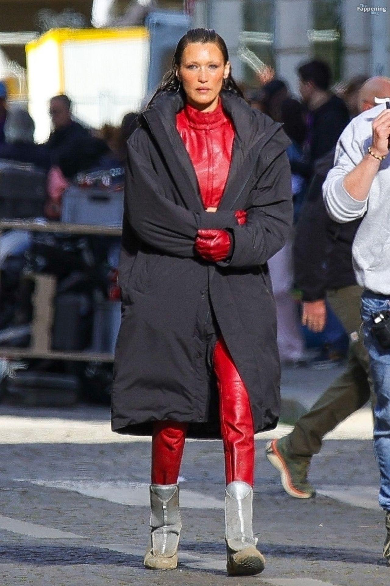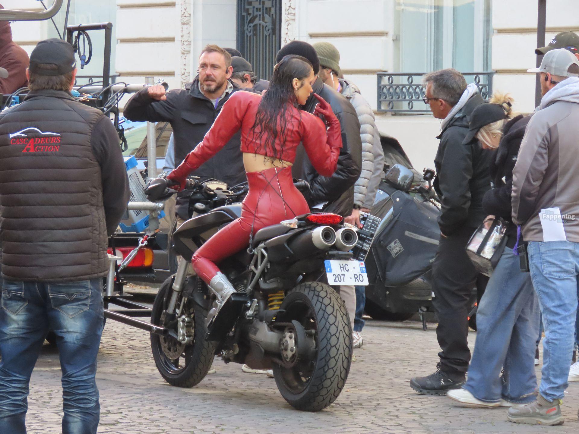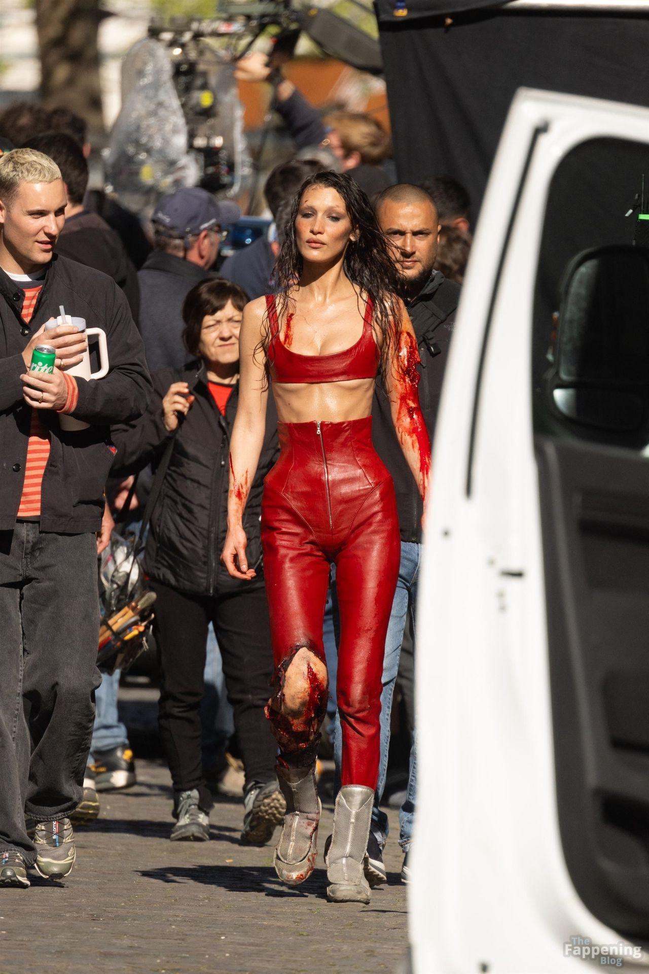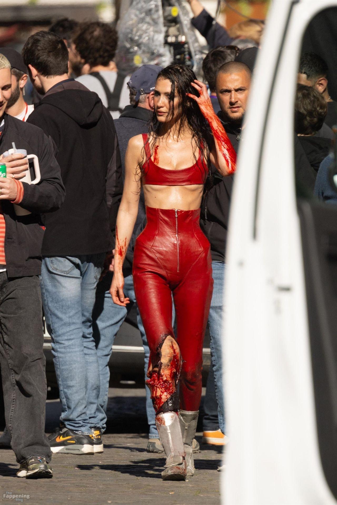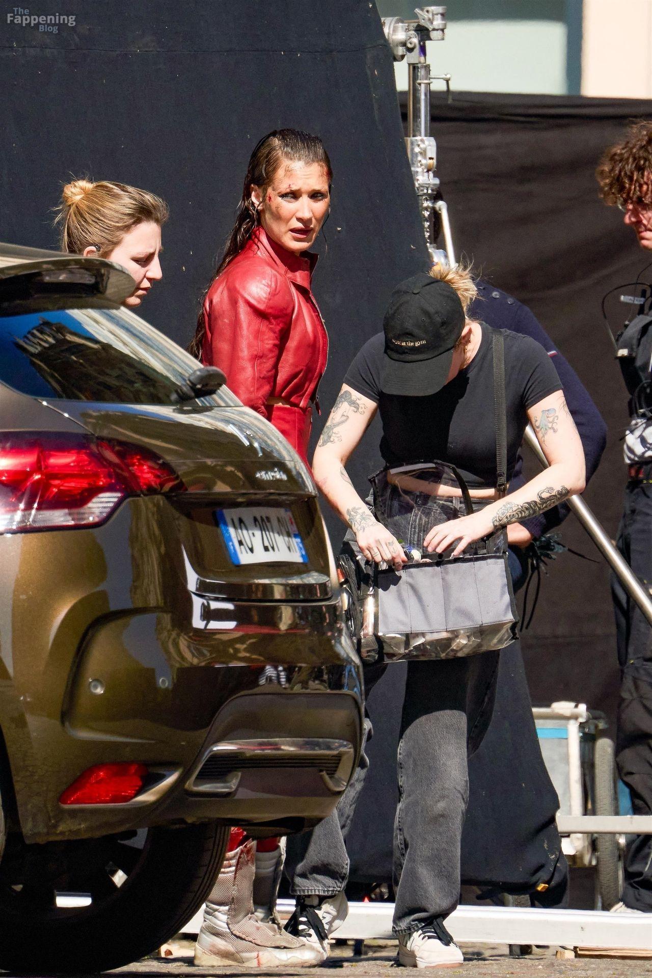 Bella Hadid es fotografiada en París, luciendo un mono de cuero rojo fuego y montando una moto. Después de ese loco accidente con el maniquí, está interpretando un papel duro con una fea lesión en la pierna para una escena en la serie “The Beauty” en París, Francia.