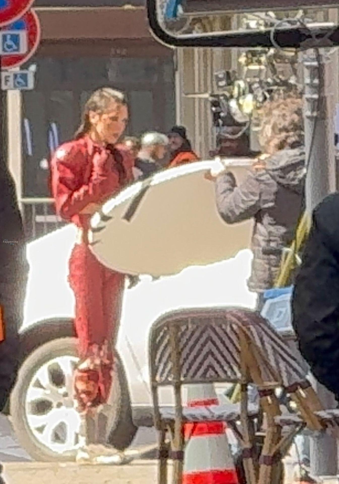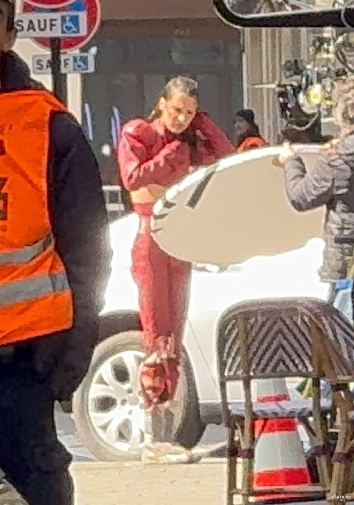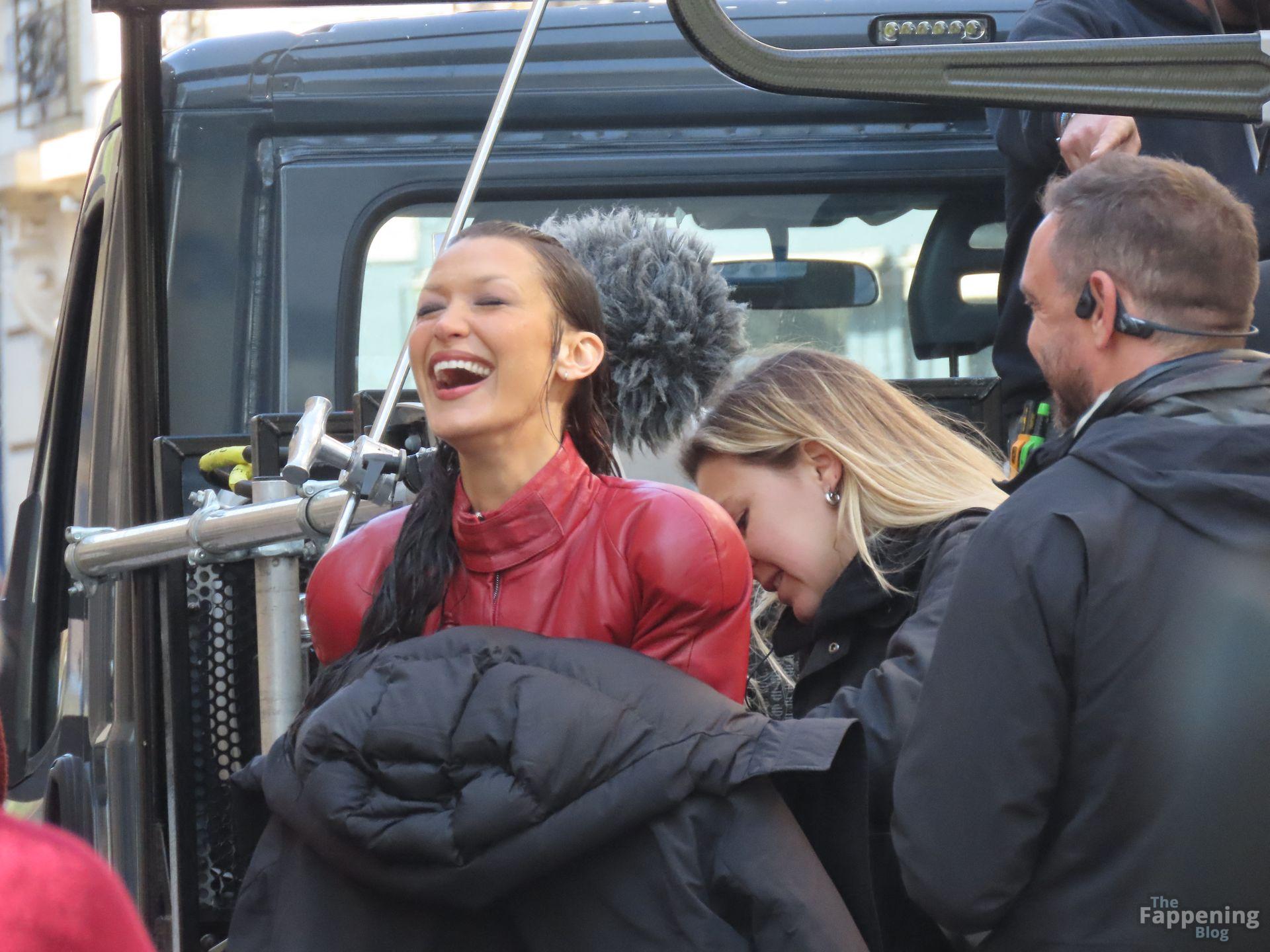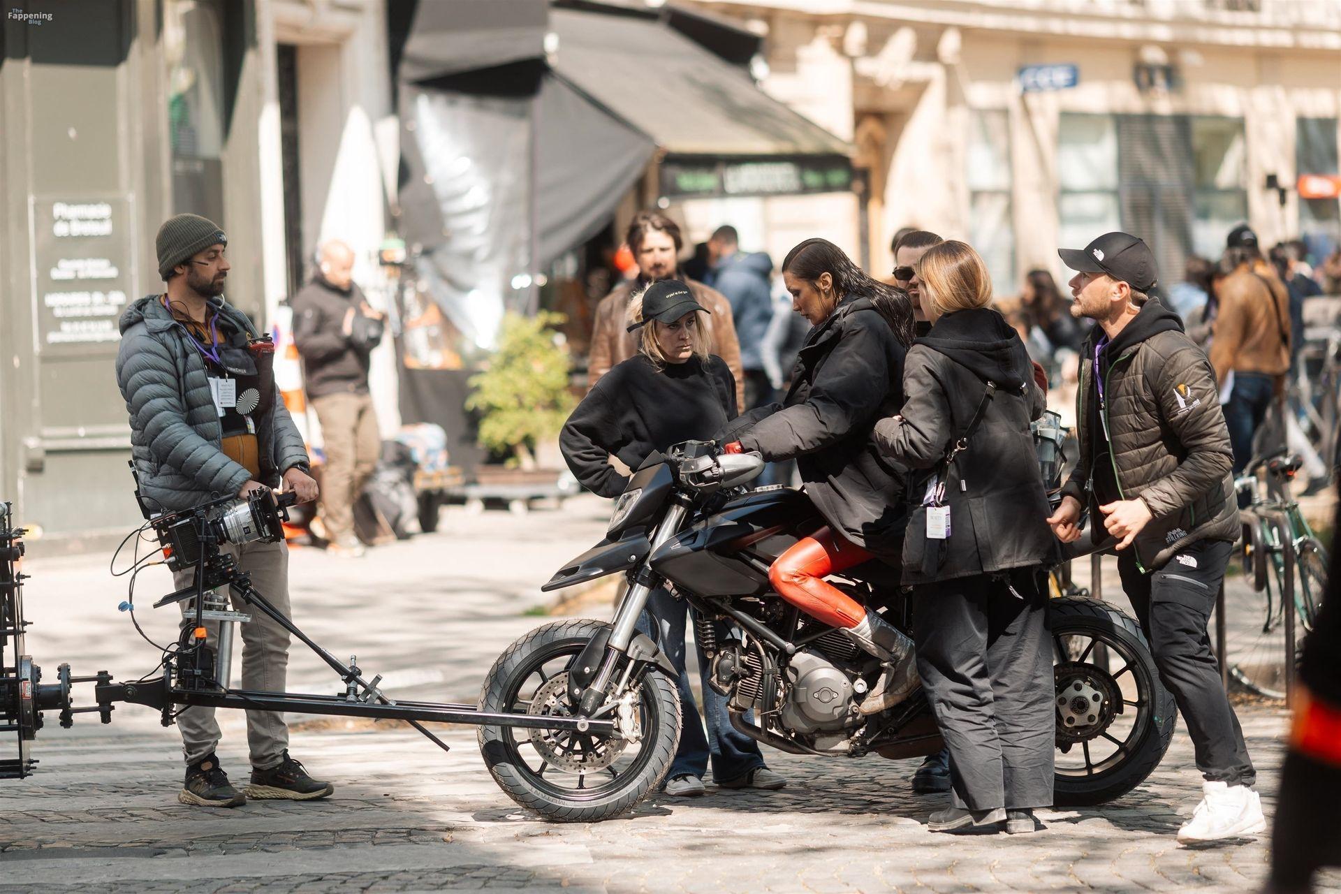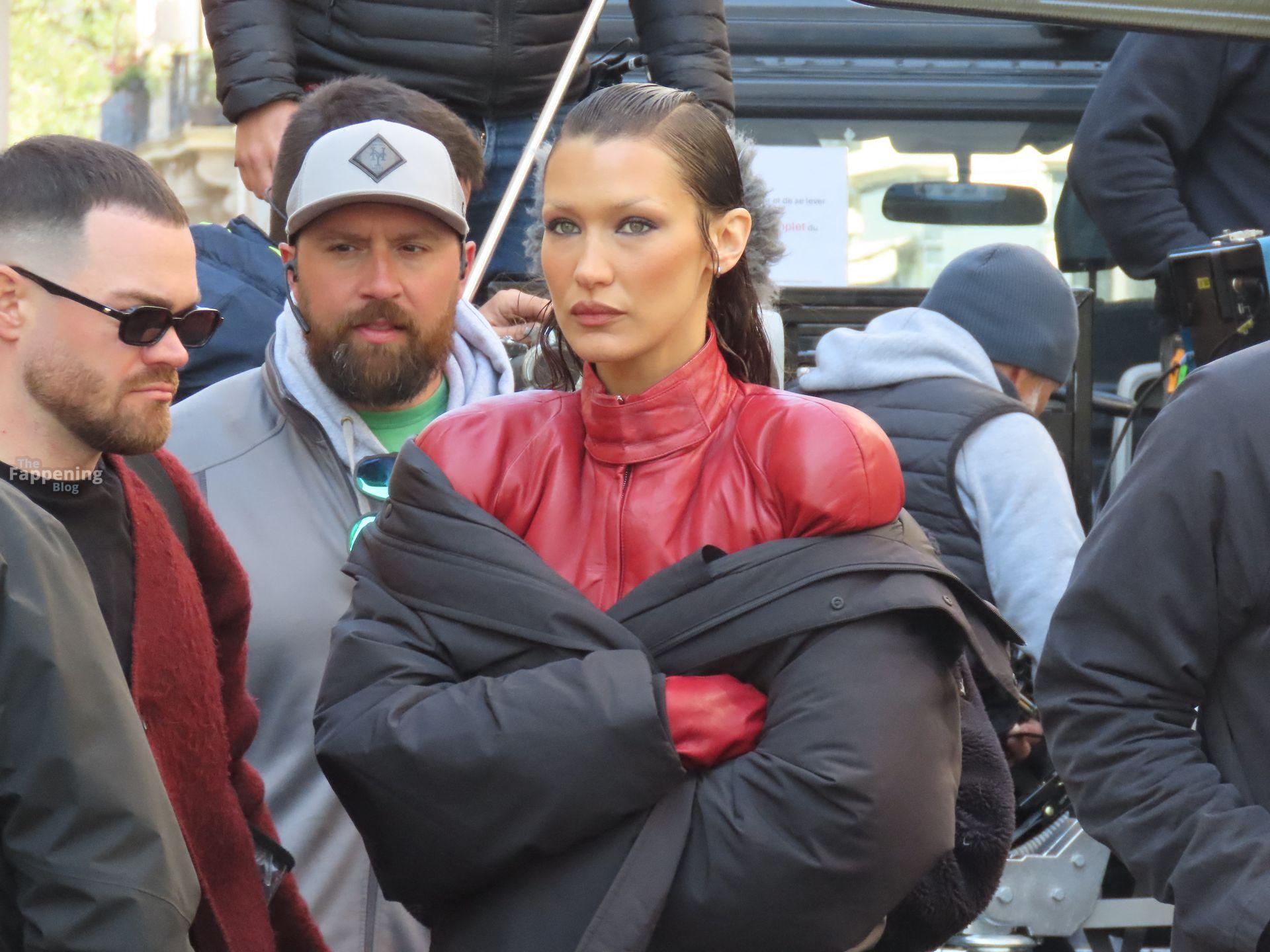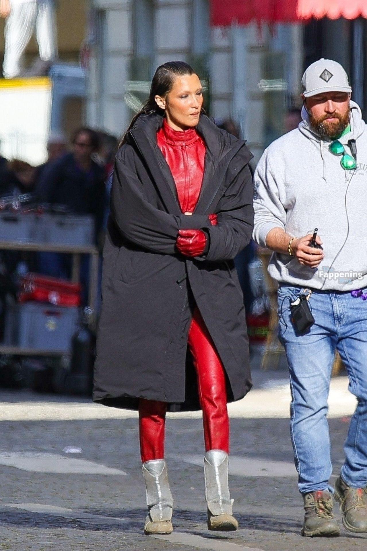 Bella Hadid es fotografiada en París, luciendo un mono de cuero rojo fuego y montando una moto. Después de ese loco accidente con el maniquí, está interpretando un papel duro con una fea lesión en la pierna para una escena en la serie “The Beauty” en París, Francia.
