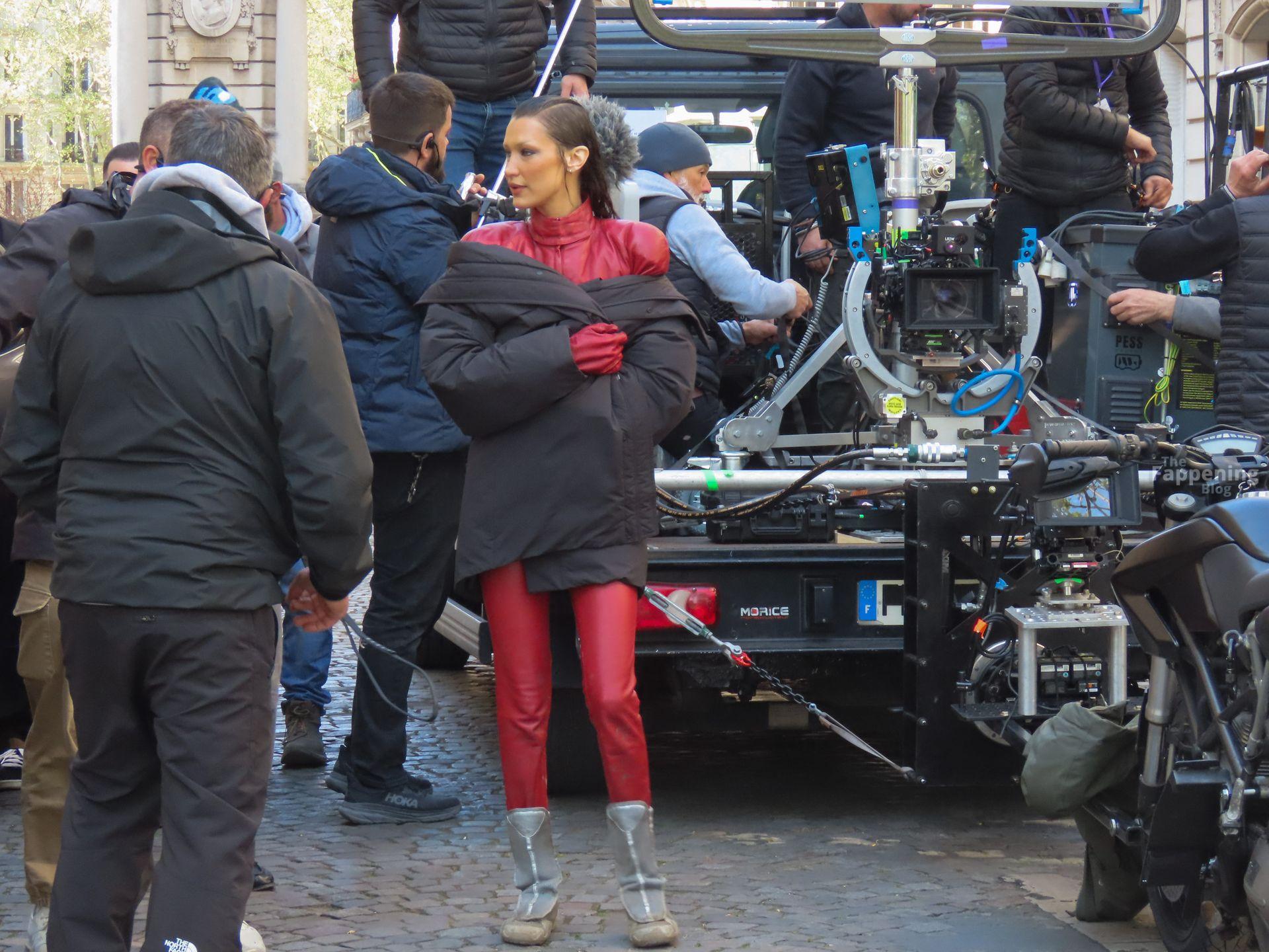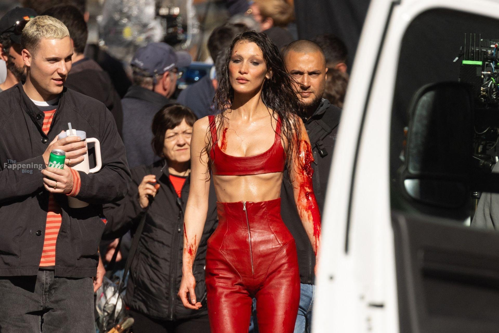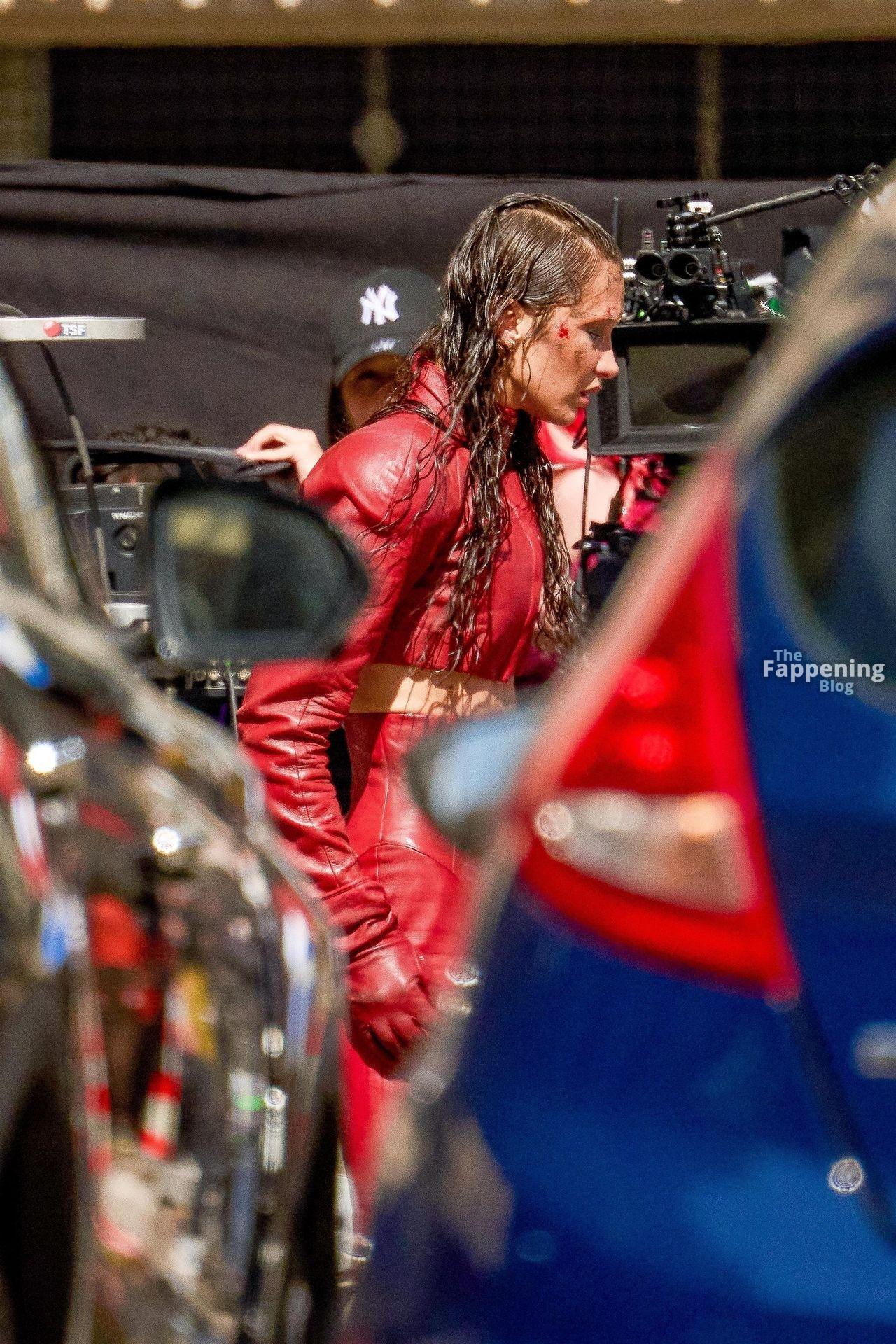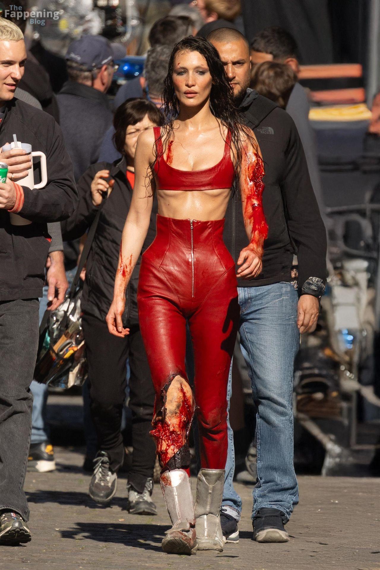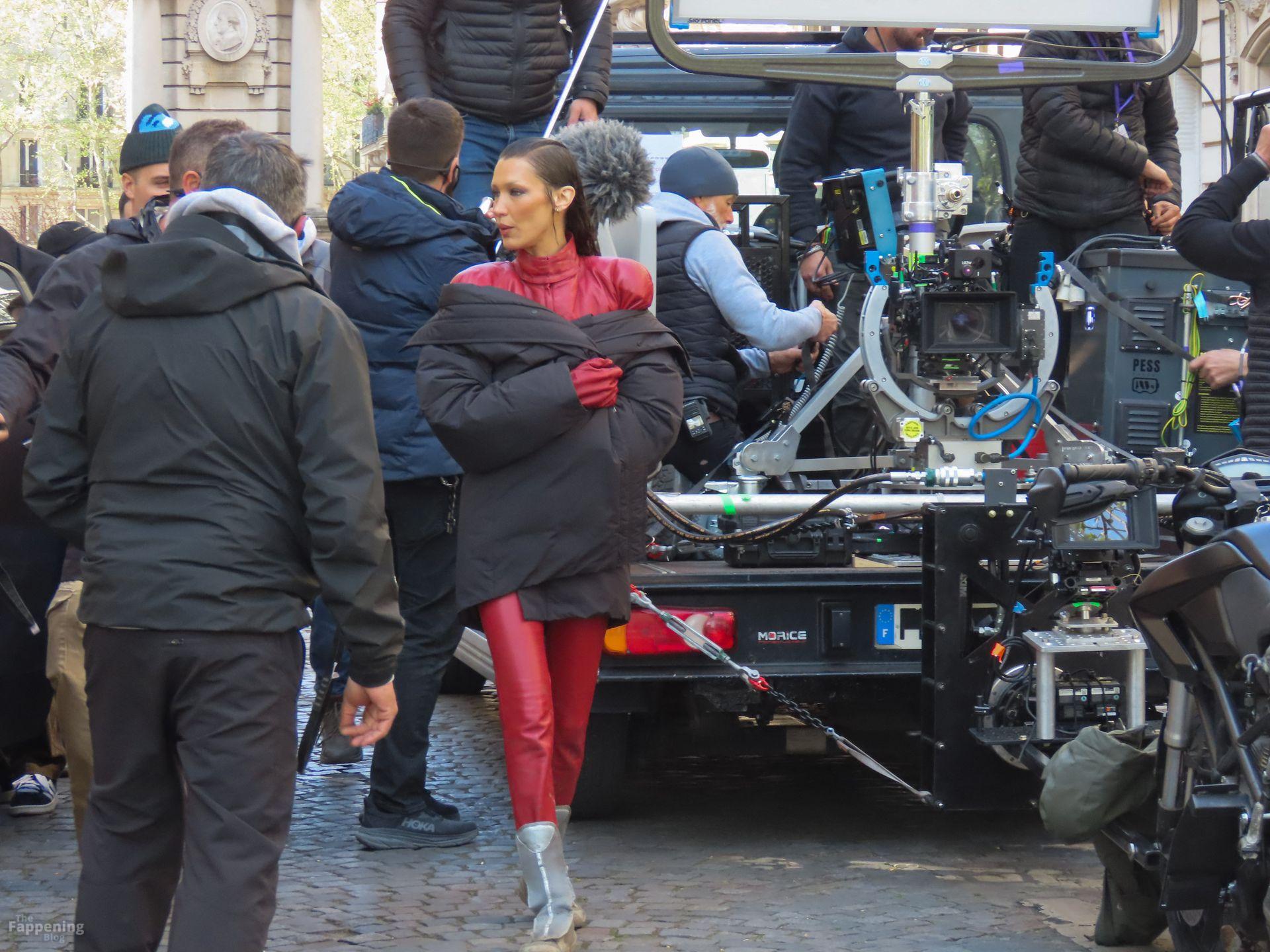 Bella Hadid es fotografiada en París, luciendo un mono de cuero rojo fuego y montando una moto. Después de ese loco accidente con el maniquí, está interpretando un papel duro con una fea lesión en la pierna para una escena en la serie “The Beauty” en París, Francia.