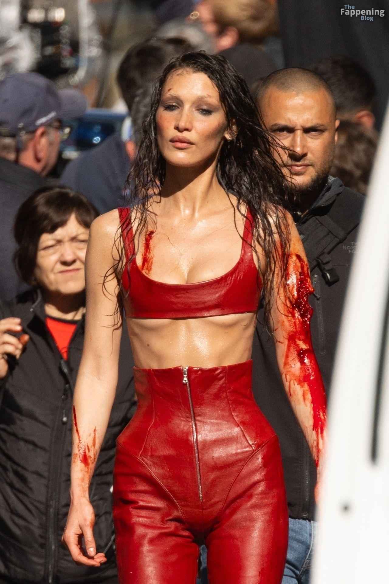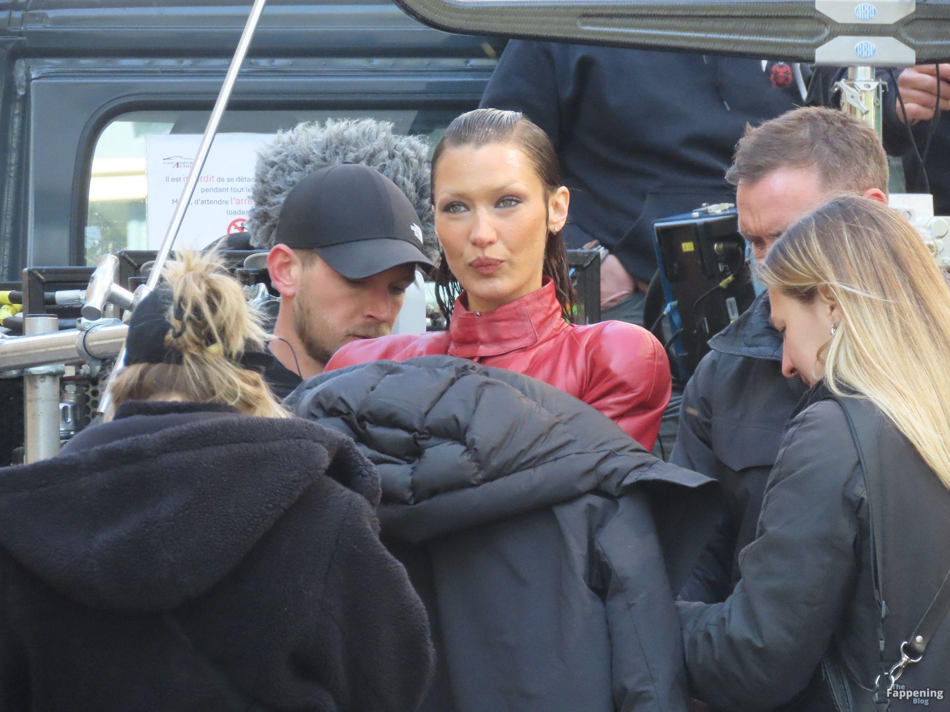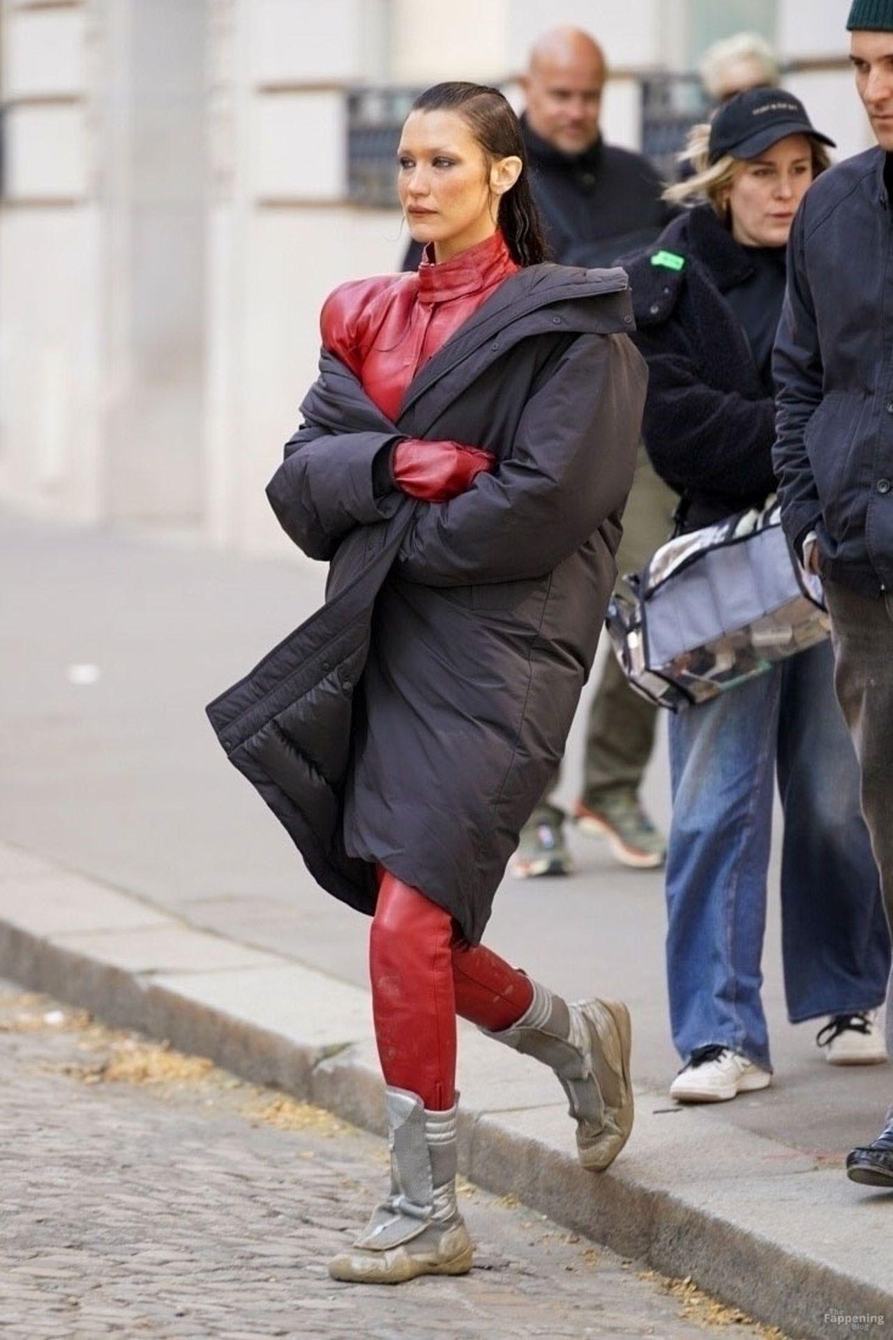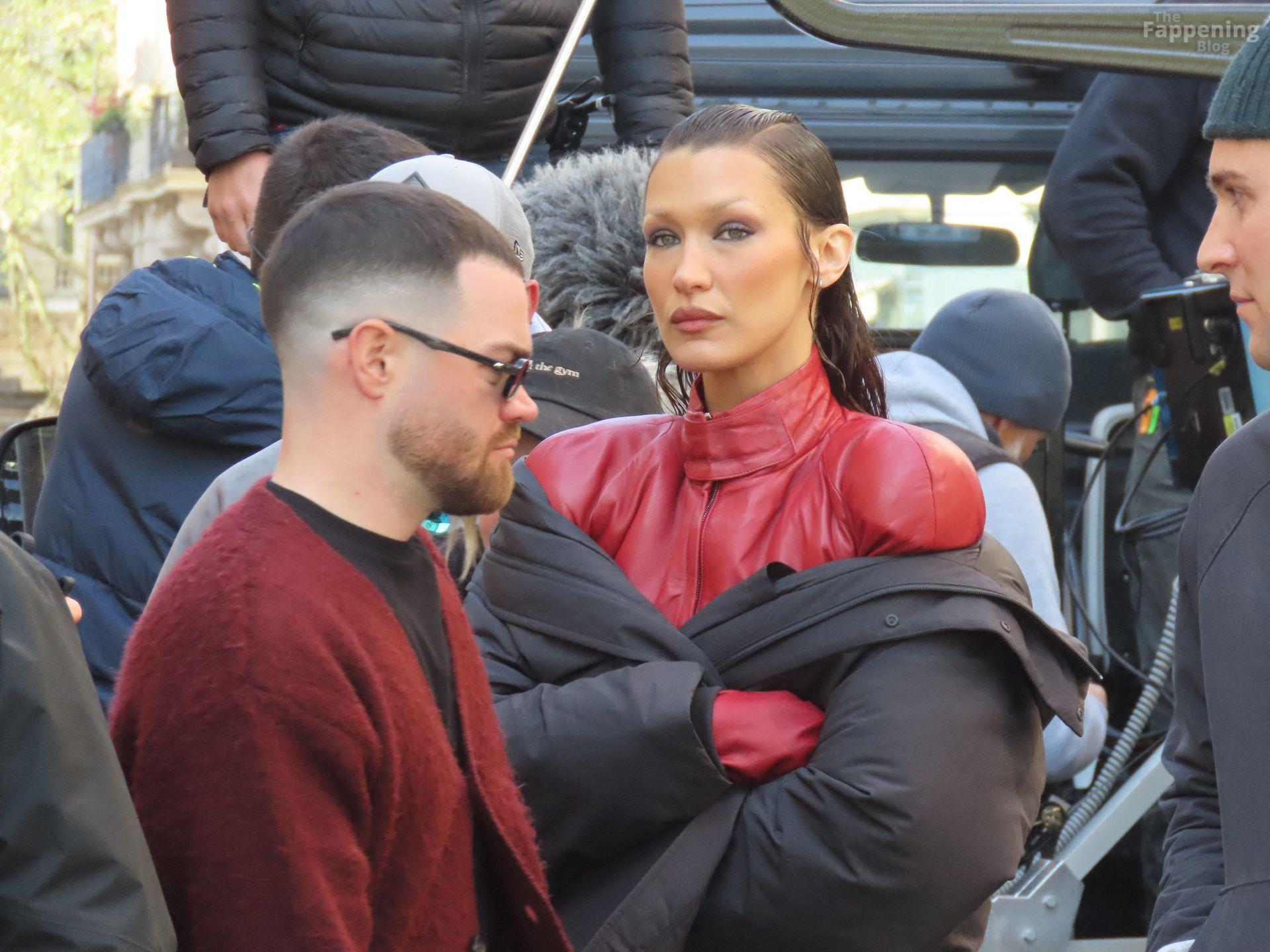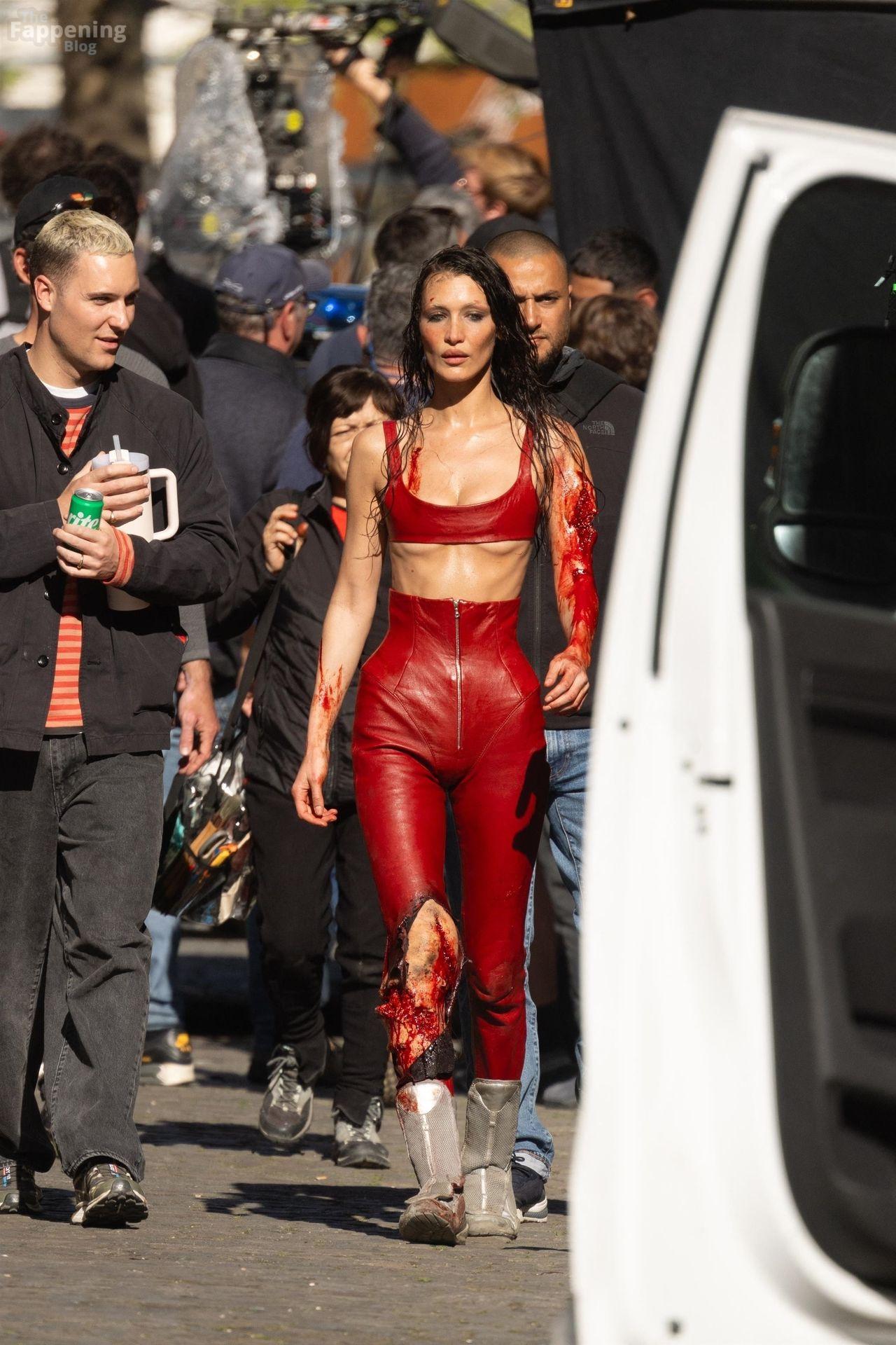 Bella Hadid es fotografiada en París, luciendo un mono de cuero rojo fuego y montando una moto. Después de ese loco accidente con el maniquí, está interpretando un papel duro con una fea lesión en la pierna para una escena en la serie “The Beauty” en París, Francia.