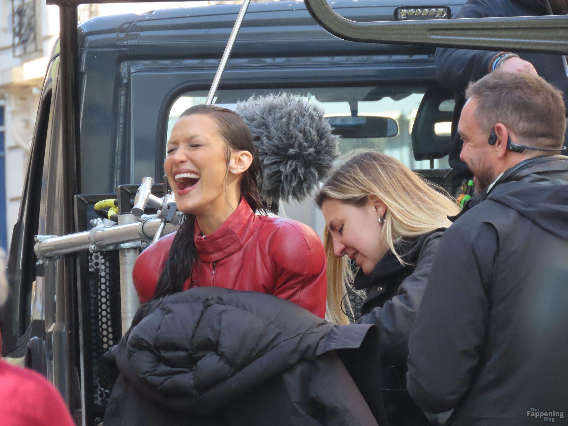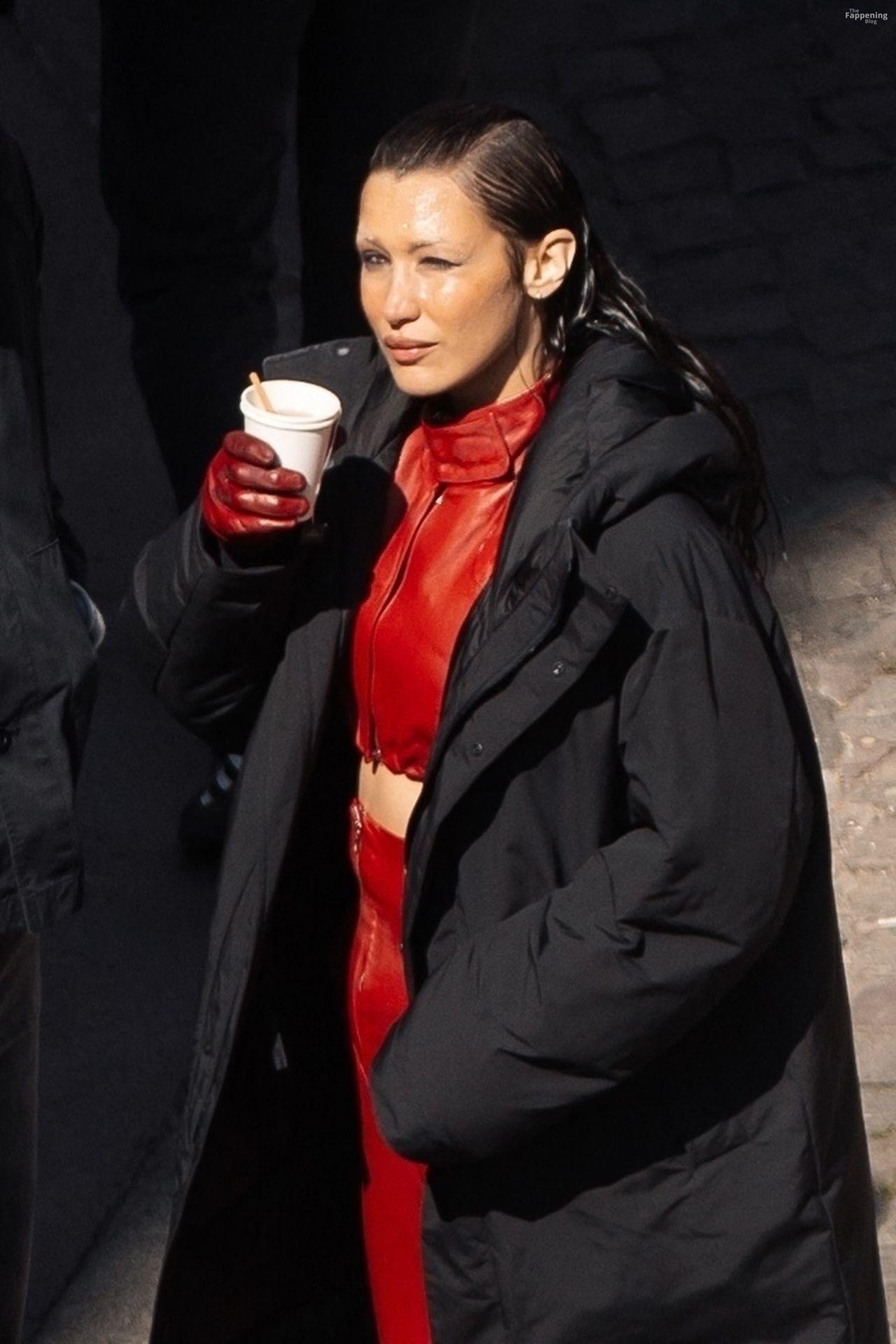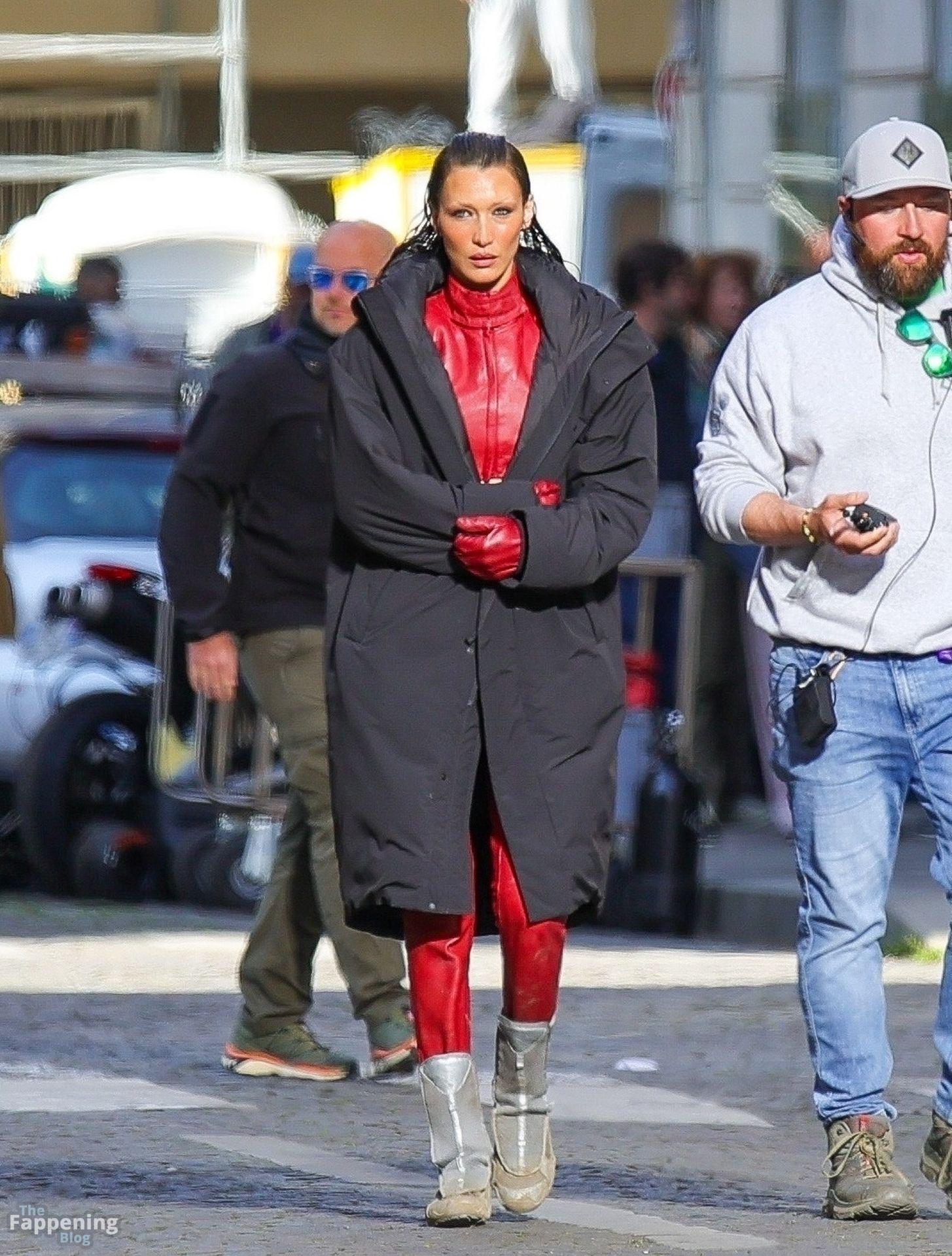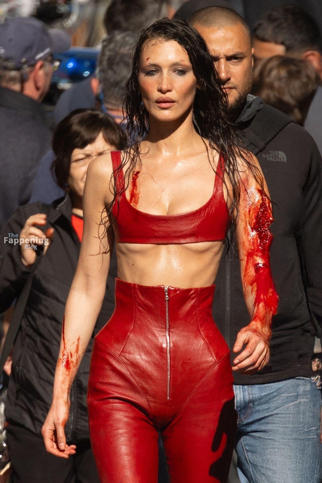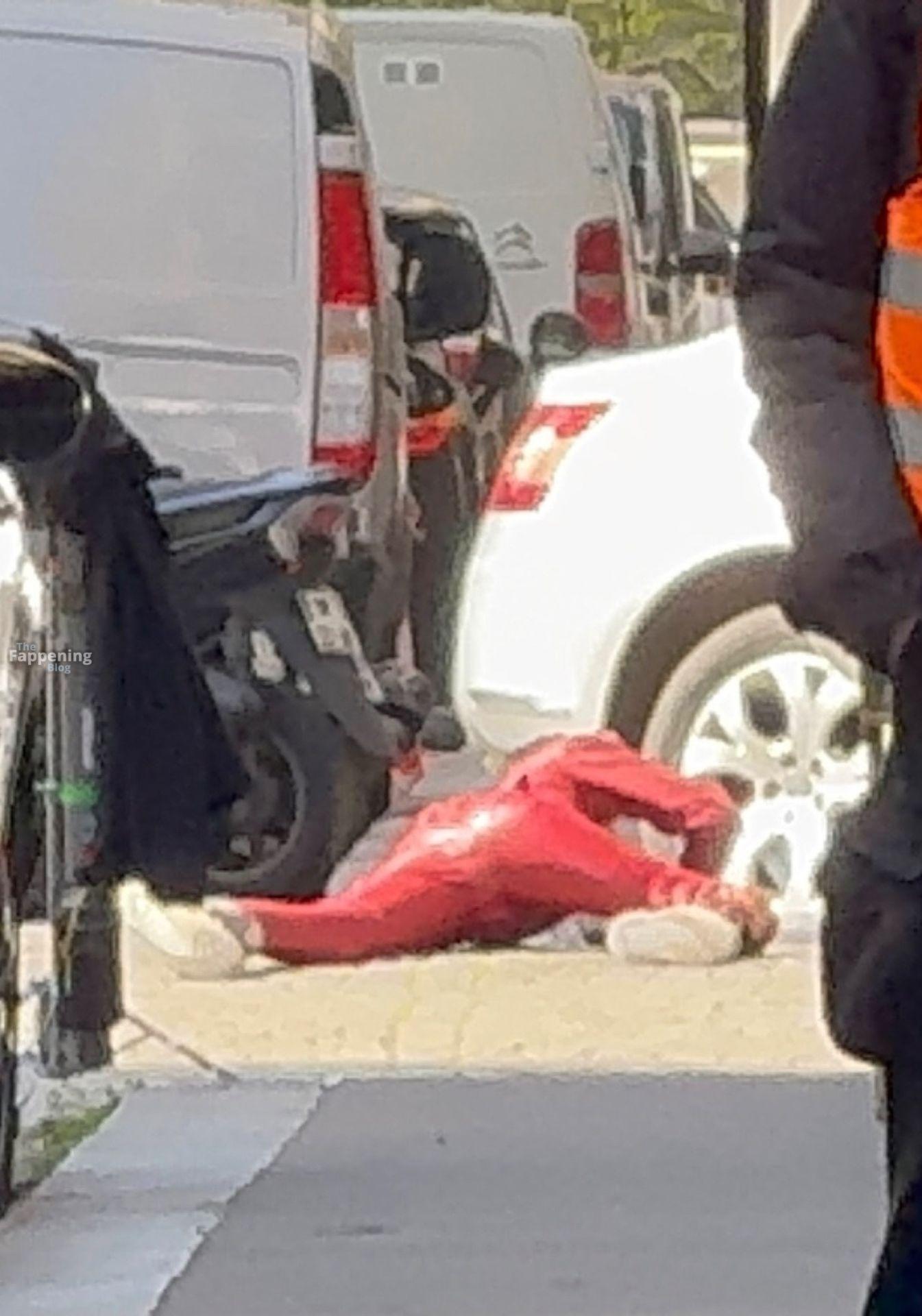 Bella Hadid es fotografiada en París, luciendo un mono de cuero rojo fuego y montando una moto. Después de ese loco accidente con el maniquí, está interpretando un papel duro con una fea lesión en la pierna para una escena en la serie “The Beauty” en París, Francia.