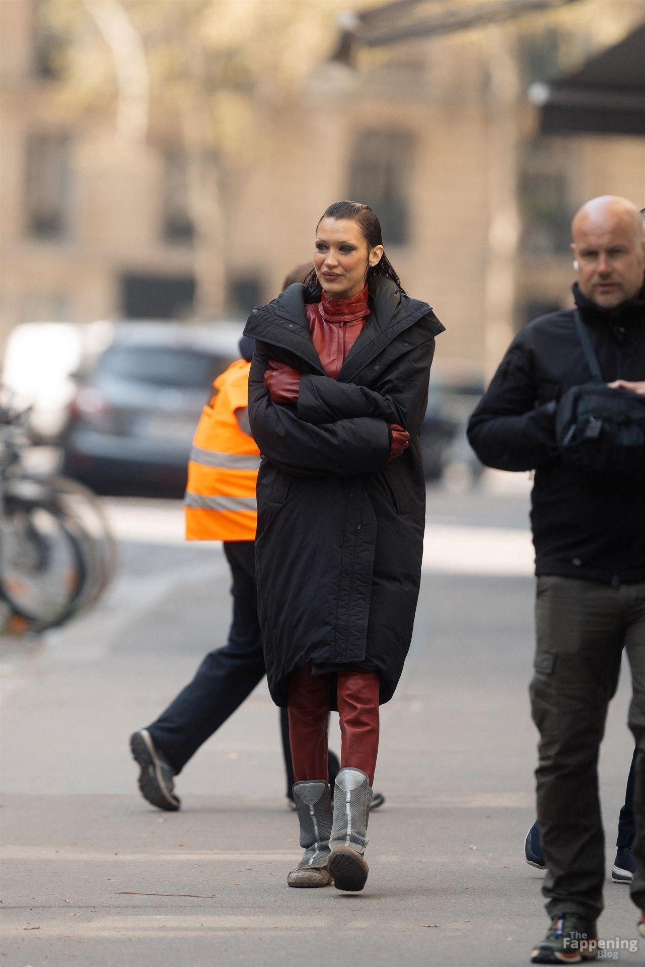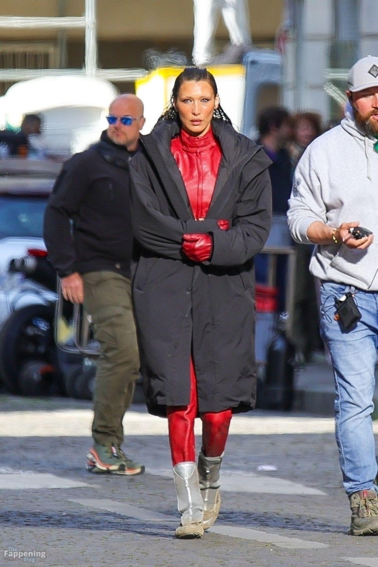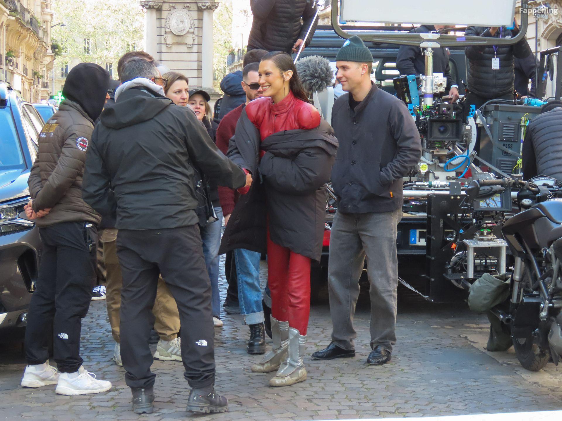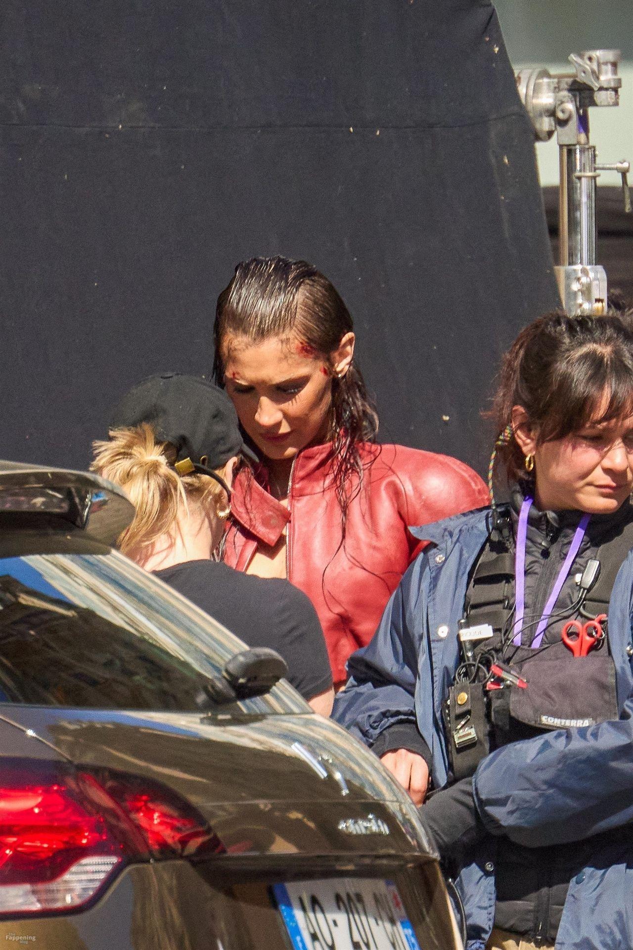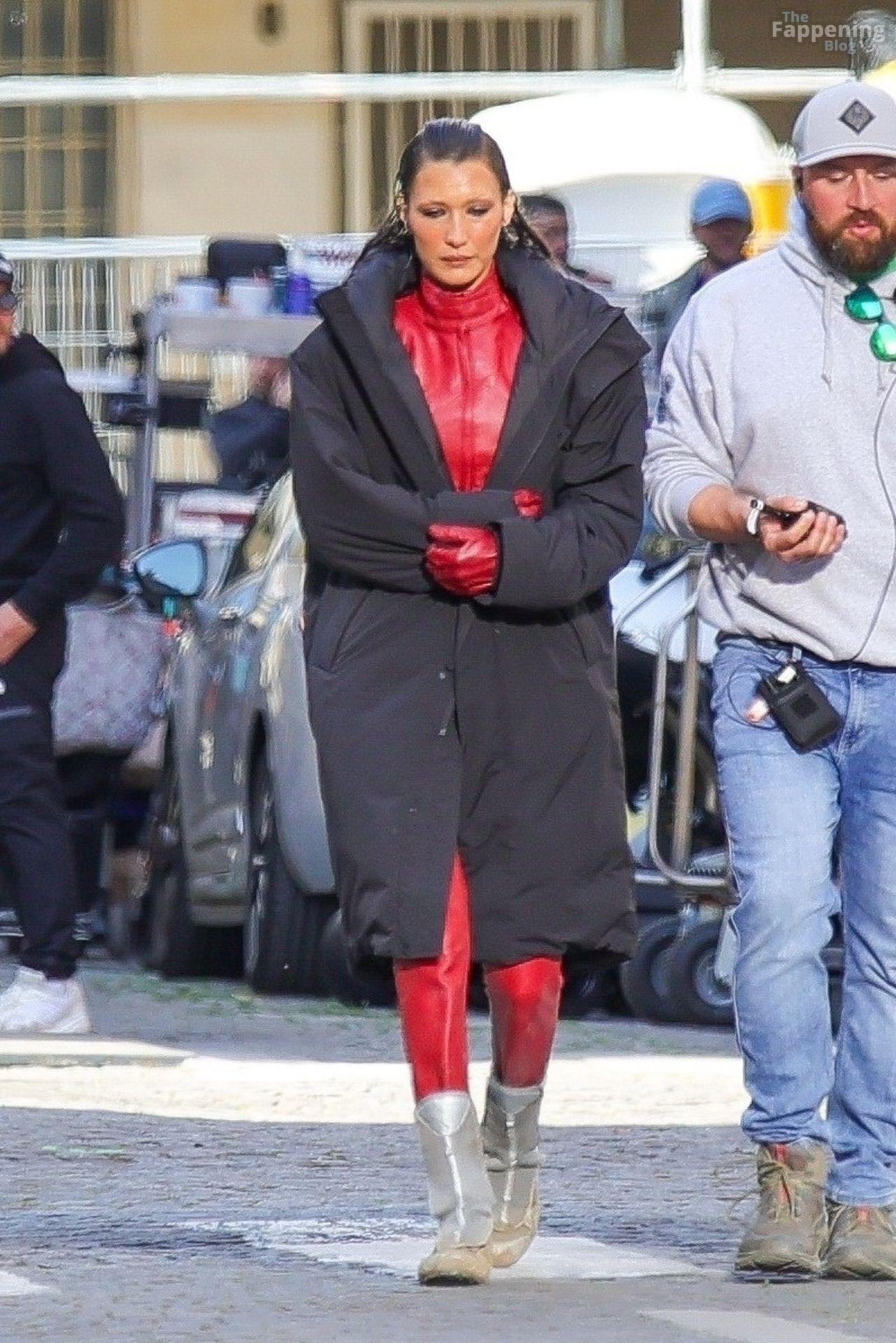 Bella Hadid es fotografiada en París, luciendo un mono de cuero rojo fuego y montando una moto. Después de ese loco accidente con el maniquí, está interpretando un papel duro con una fea lesión en la pierna para una escena en la serie “The Beauty” en París, Francia.