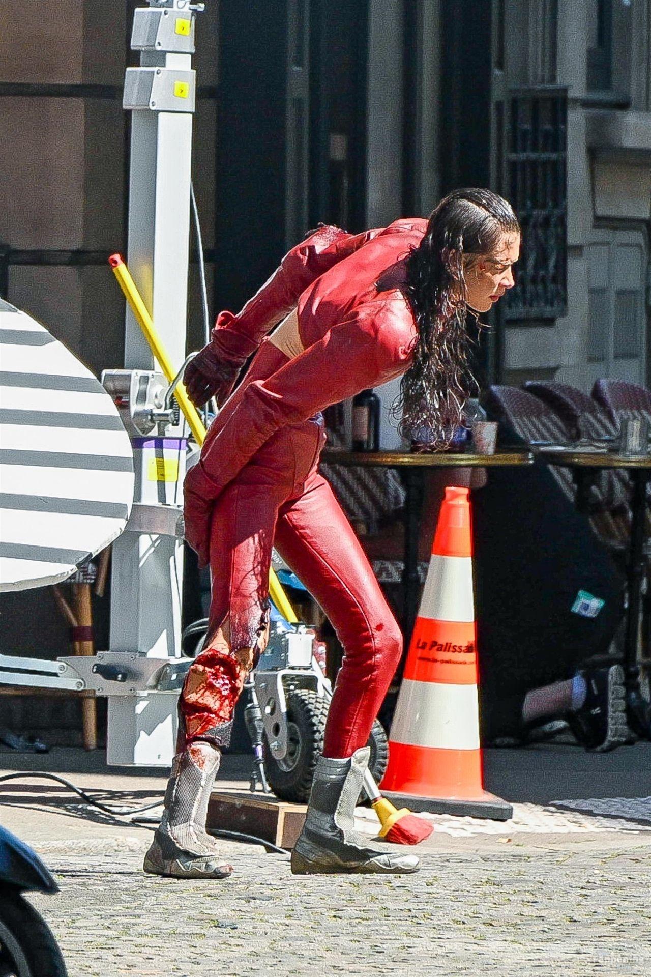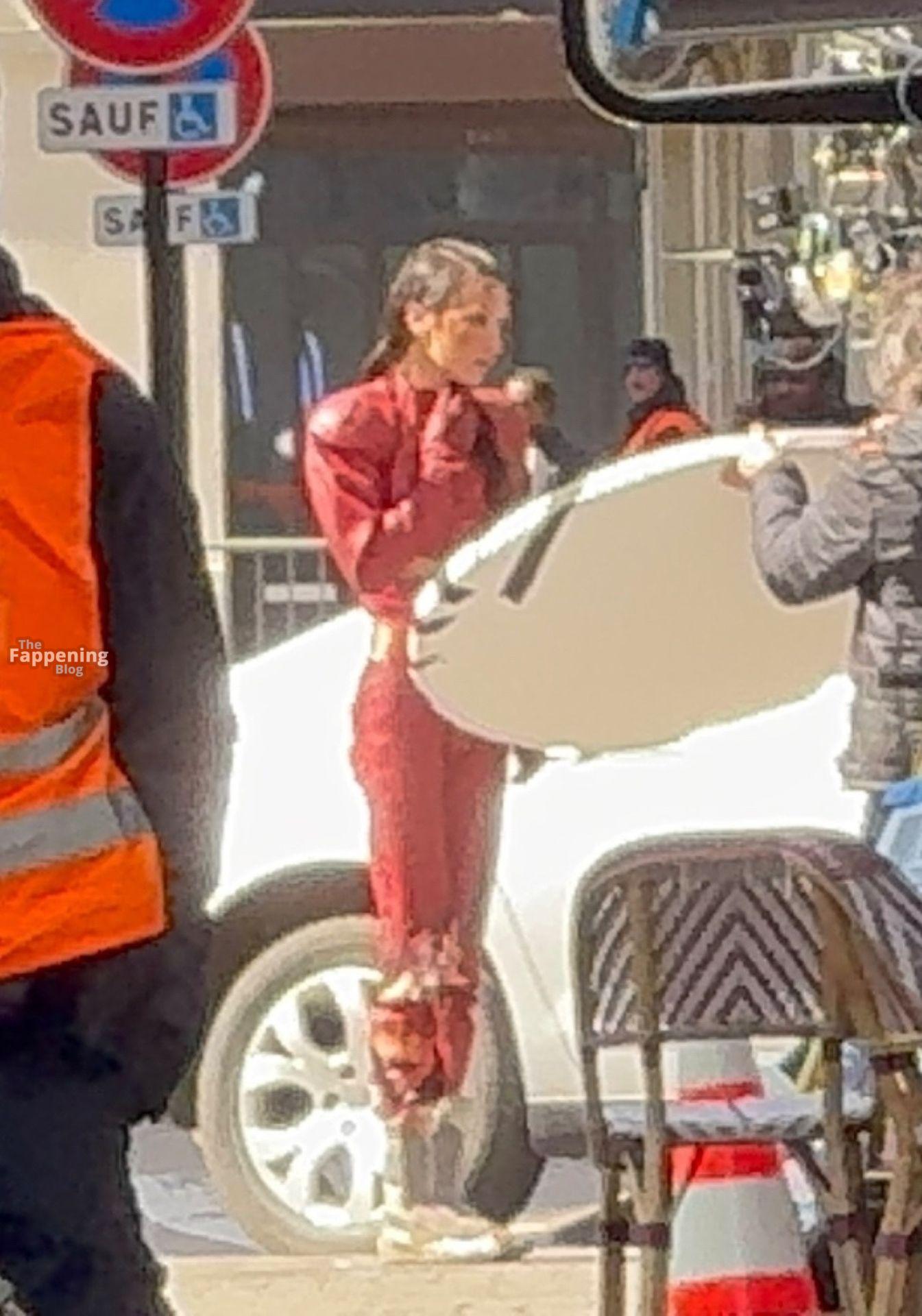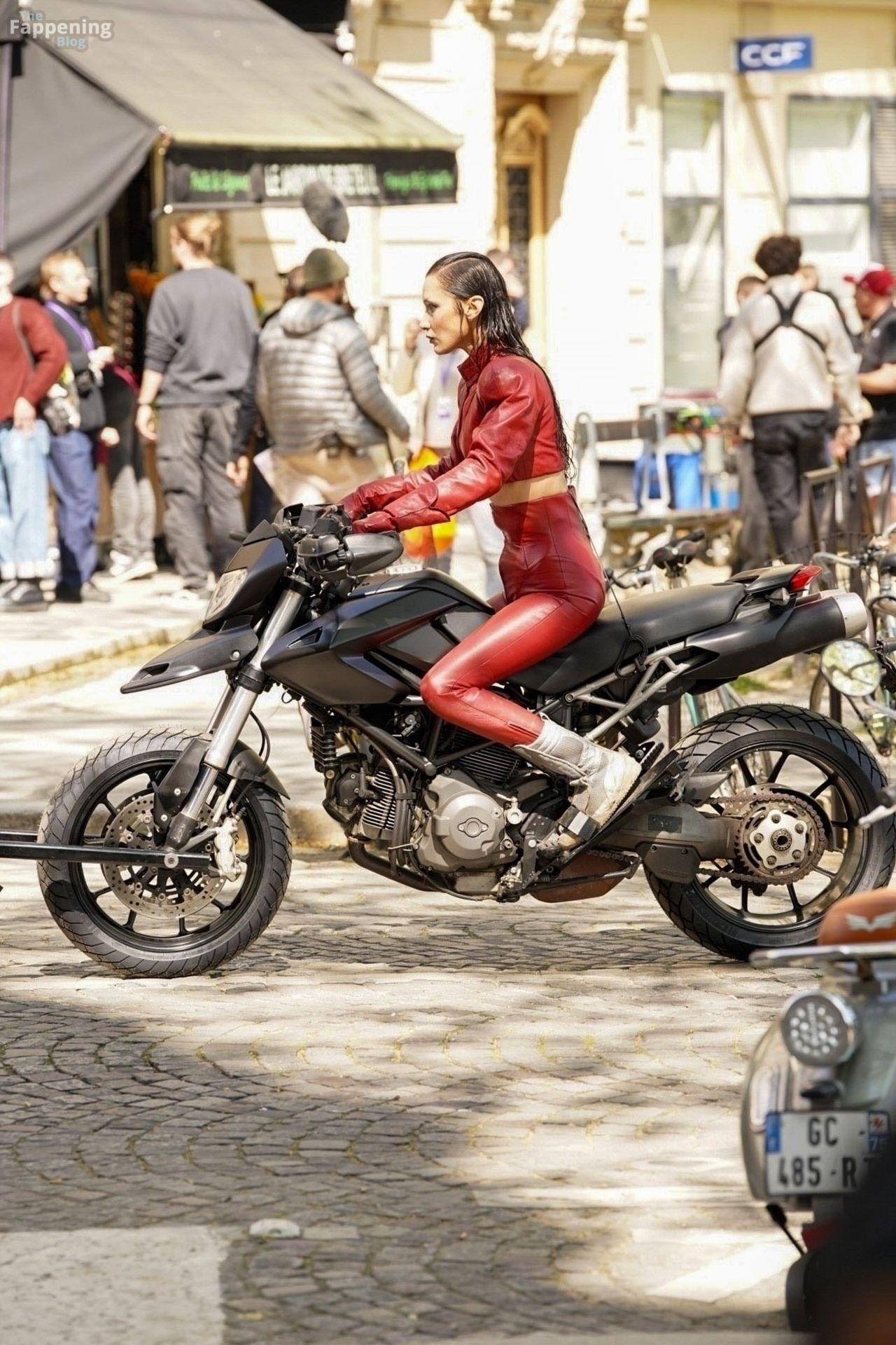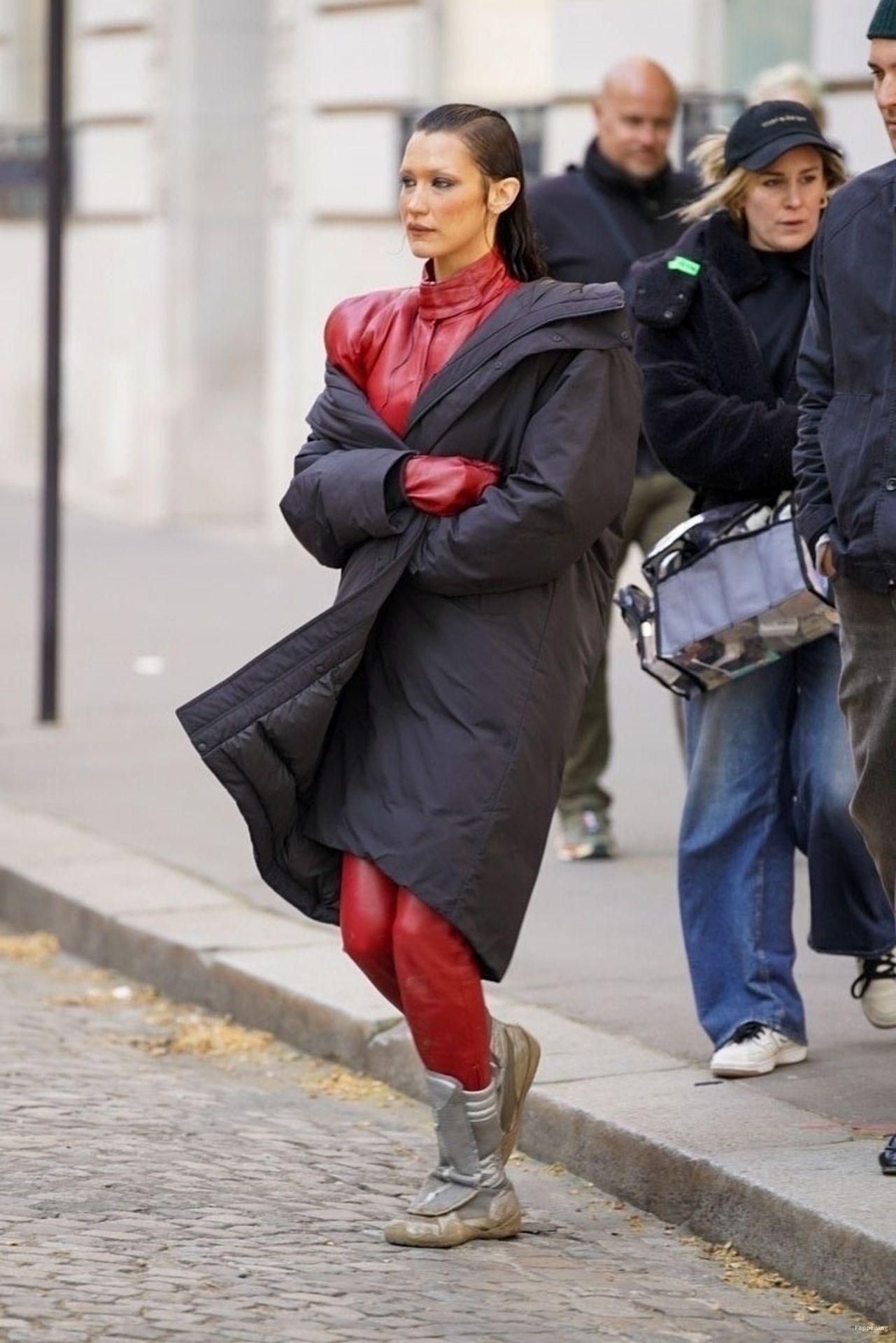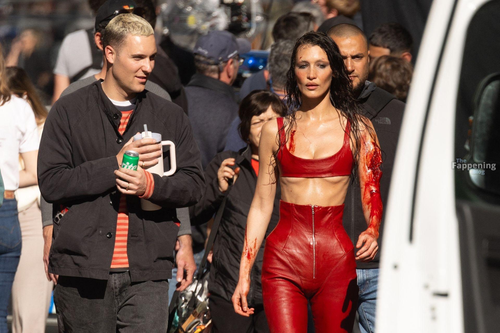 Bella Hadid es fotografiada en París, luciendo un mono de cuero rojo fuego y montando una moto. Después de ese loco accidente con el maniquí, está interpretando un papel duro con una fea lesión en la pierna para una escena en la serie “The Beauty” en París, Francia.