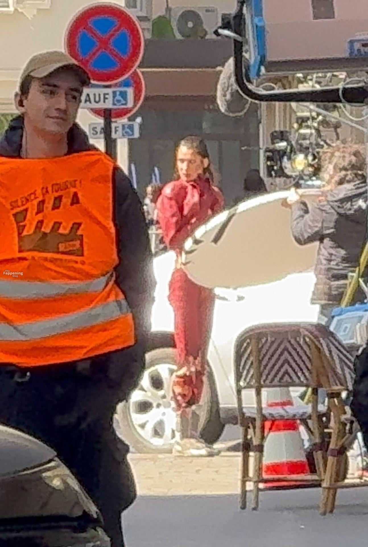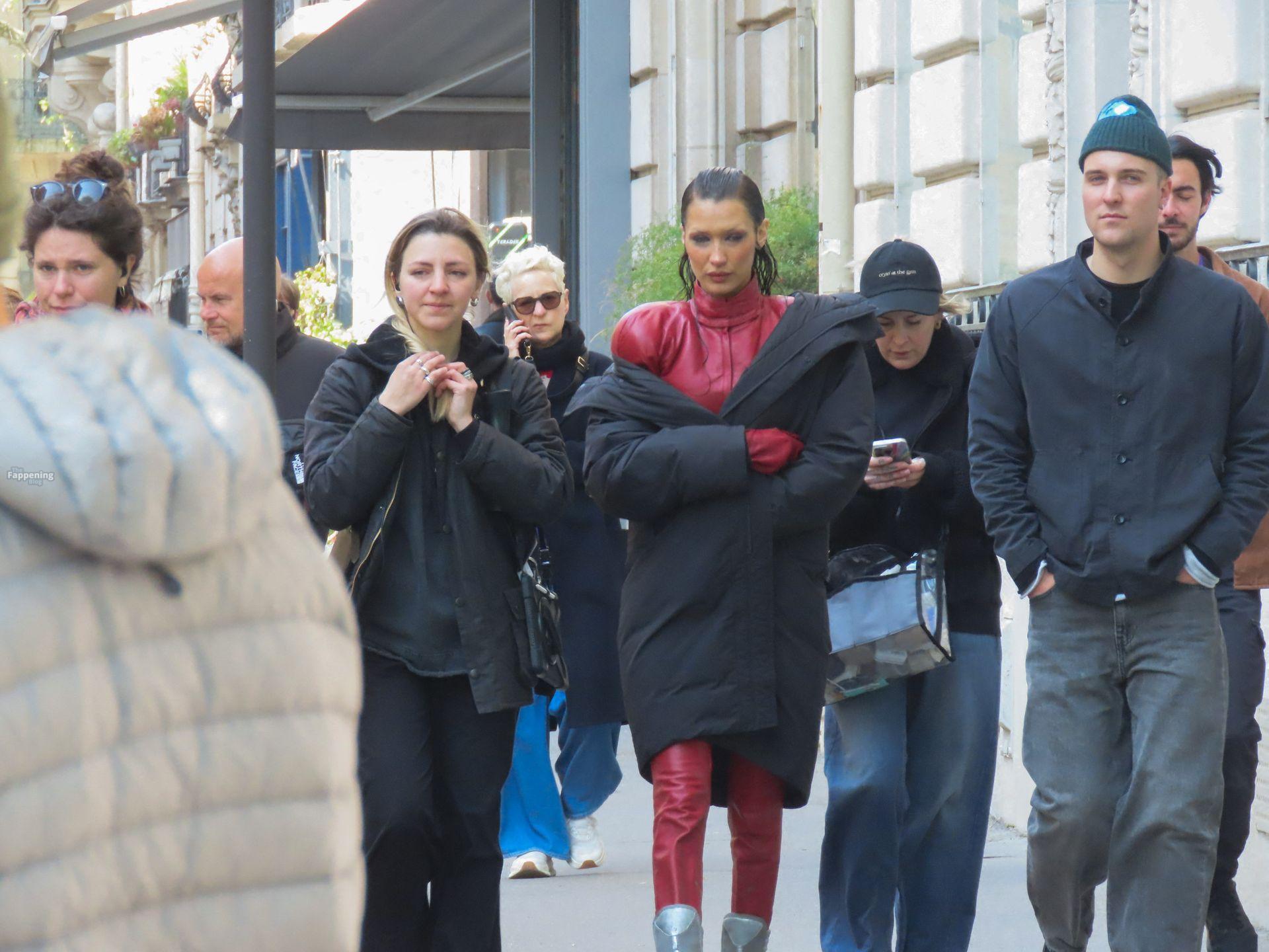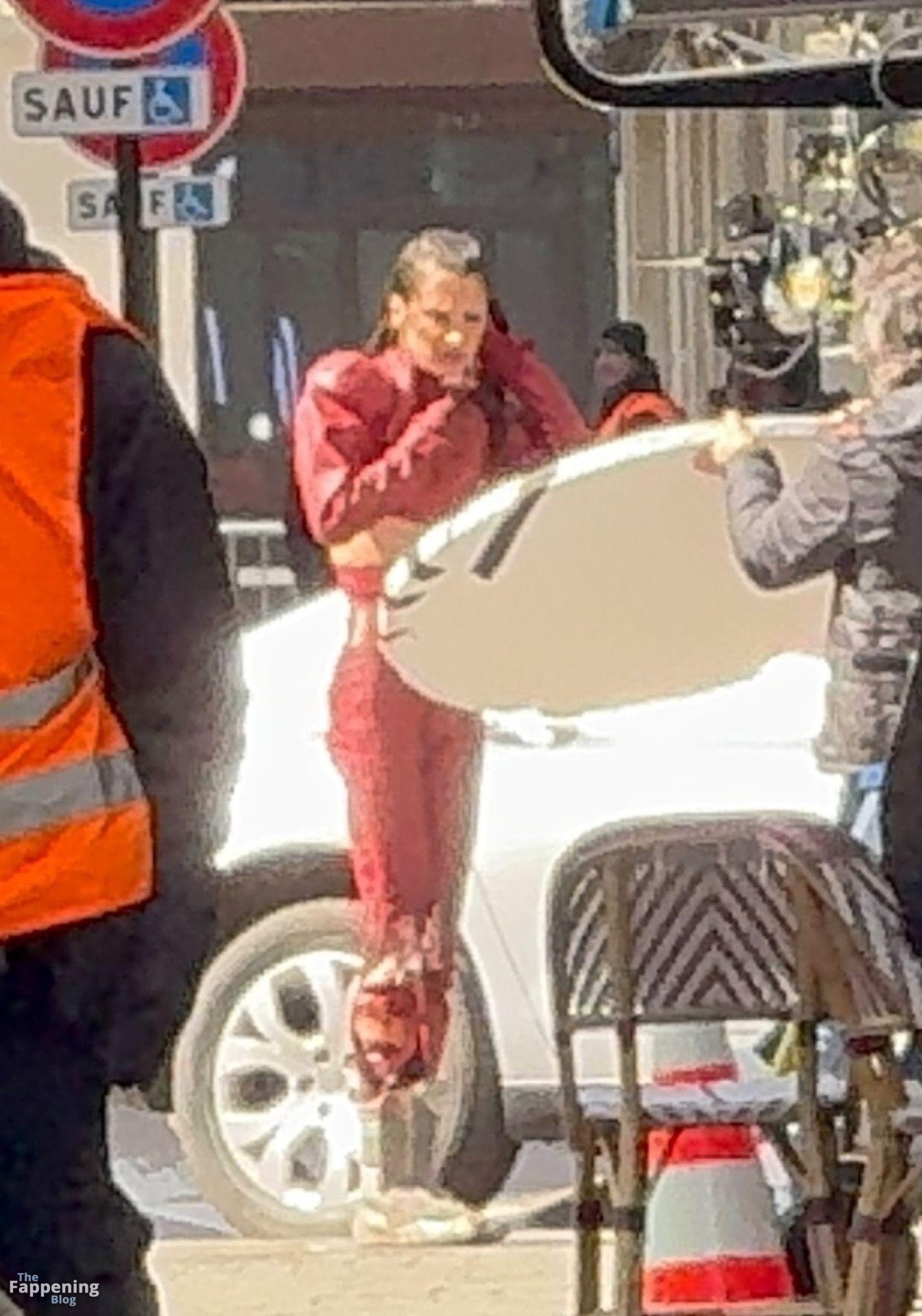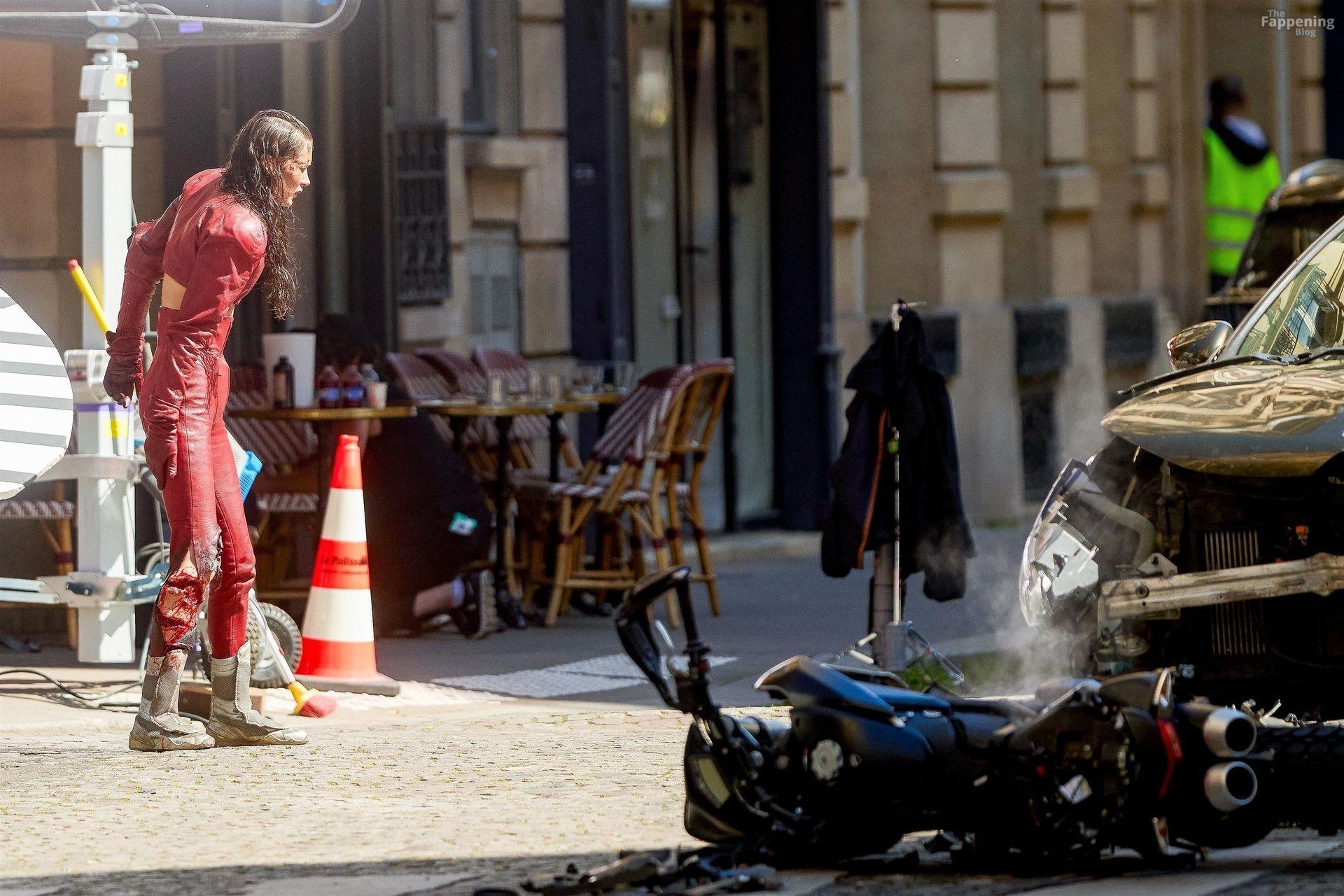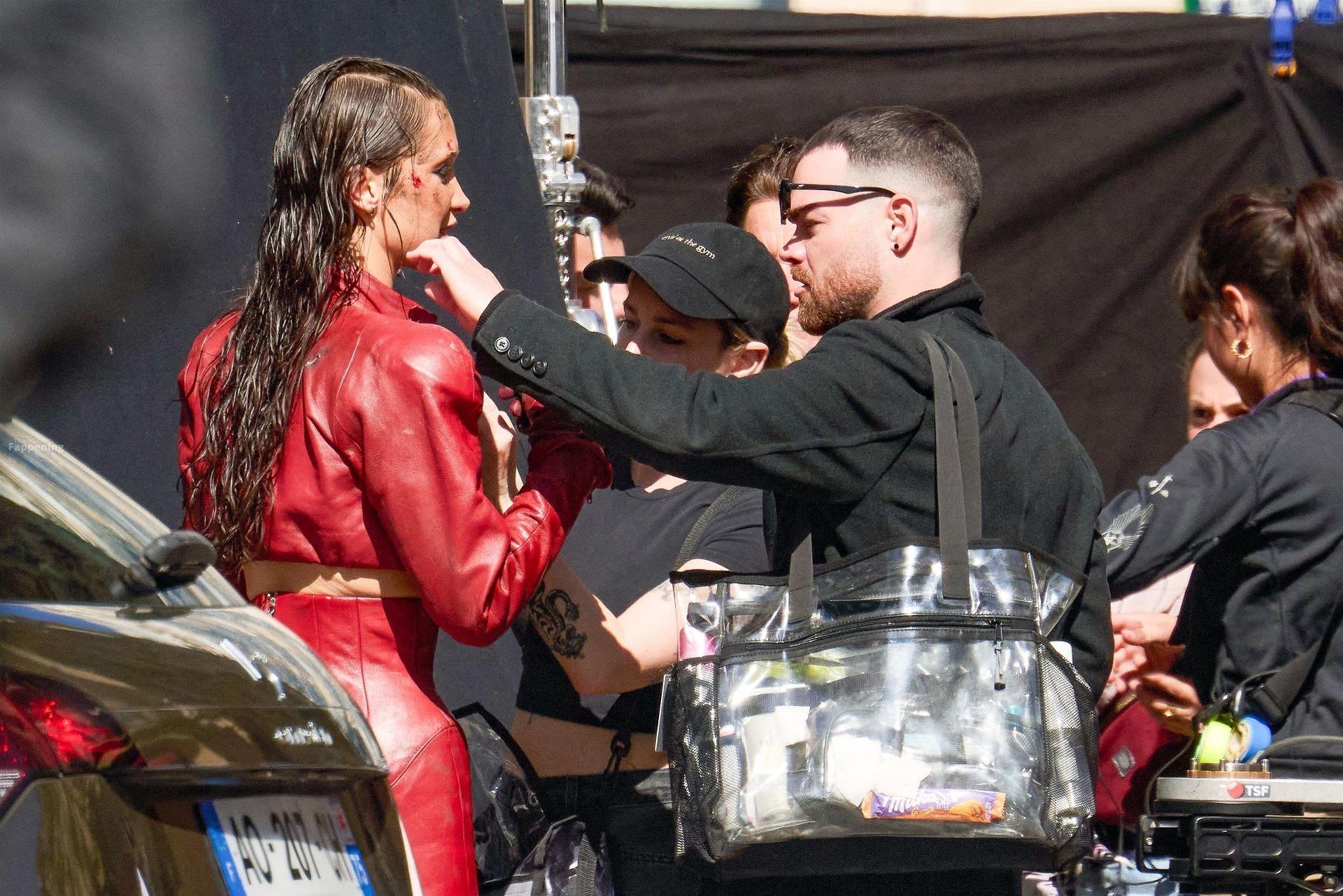 Bella Hadid es fotografiada en París, luciendo un mono de cuero rojo fuego y montando una moto. Después de ese loco accidente con el maniquí, está interpretando un papel duro con una fea lesión en la pierna para una escena en la serie “The Beauty” en París, Francia.