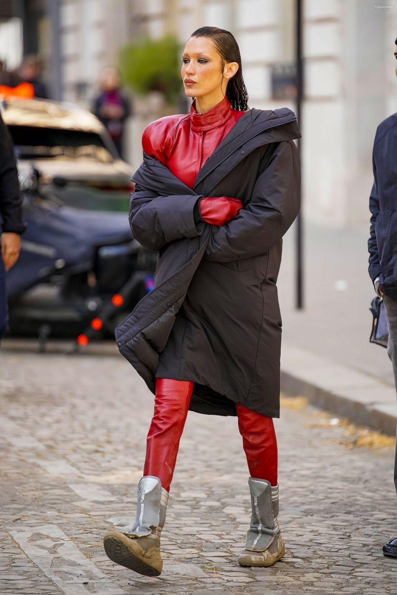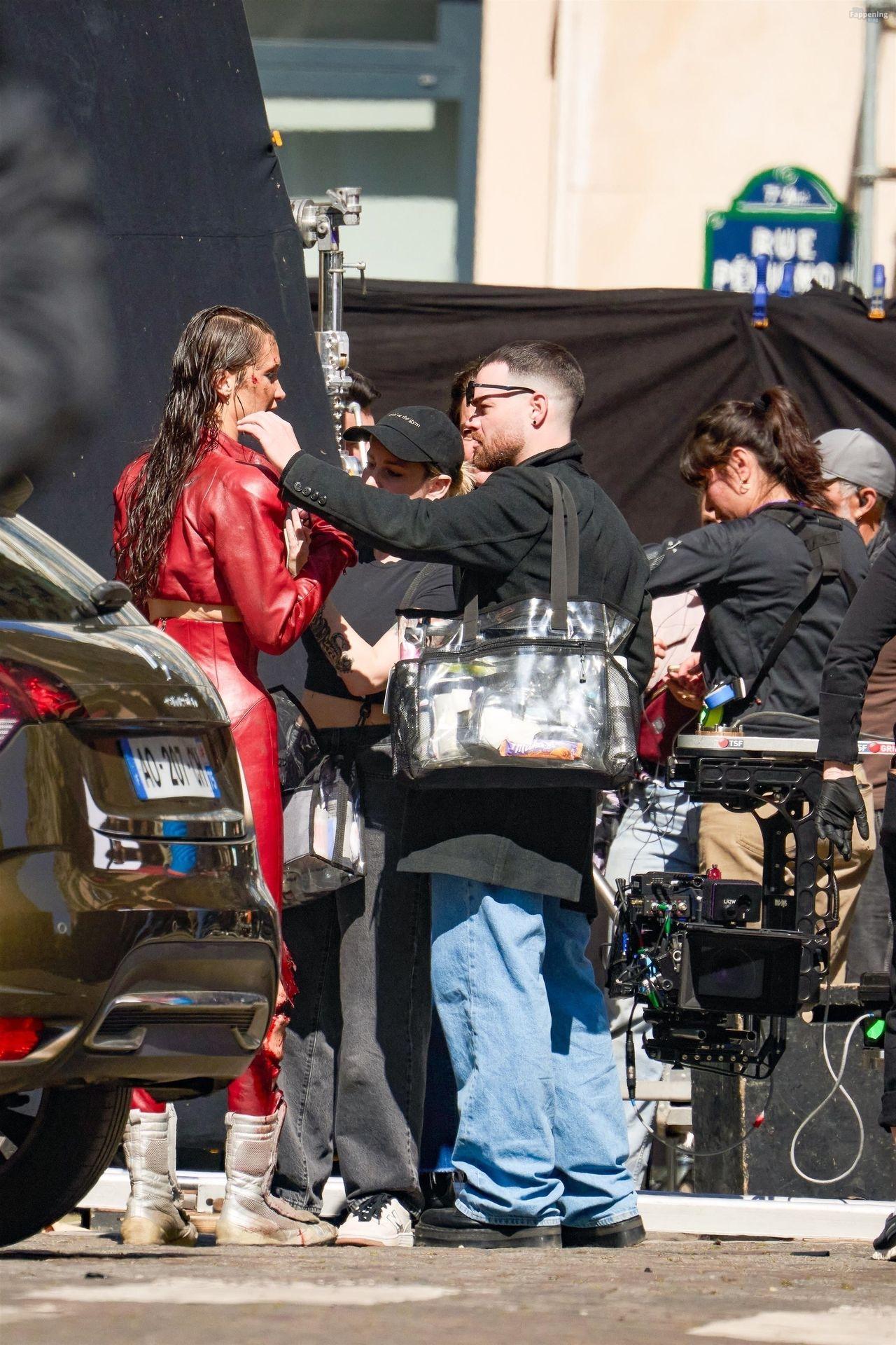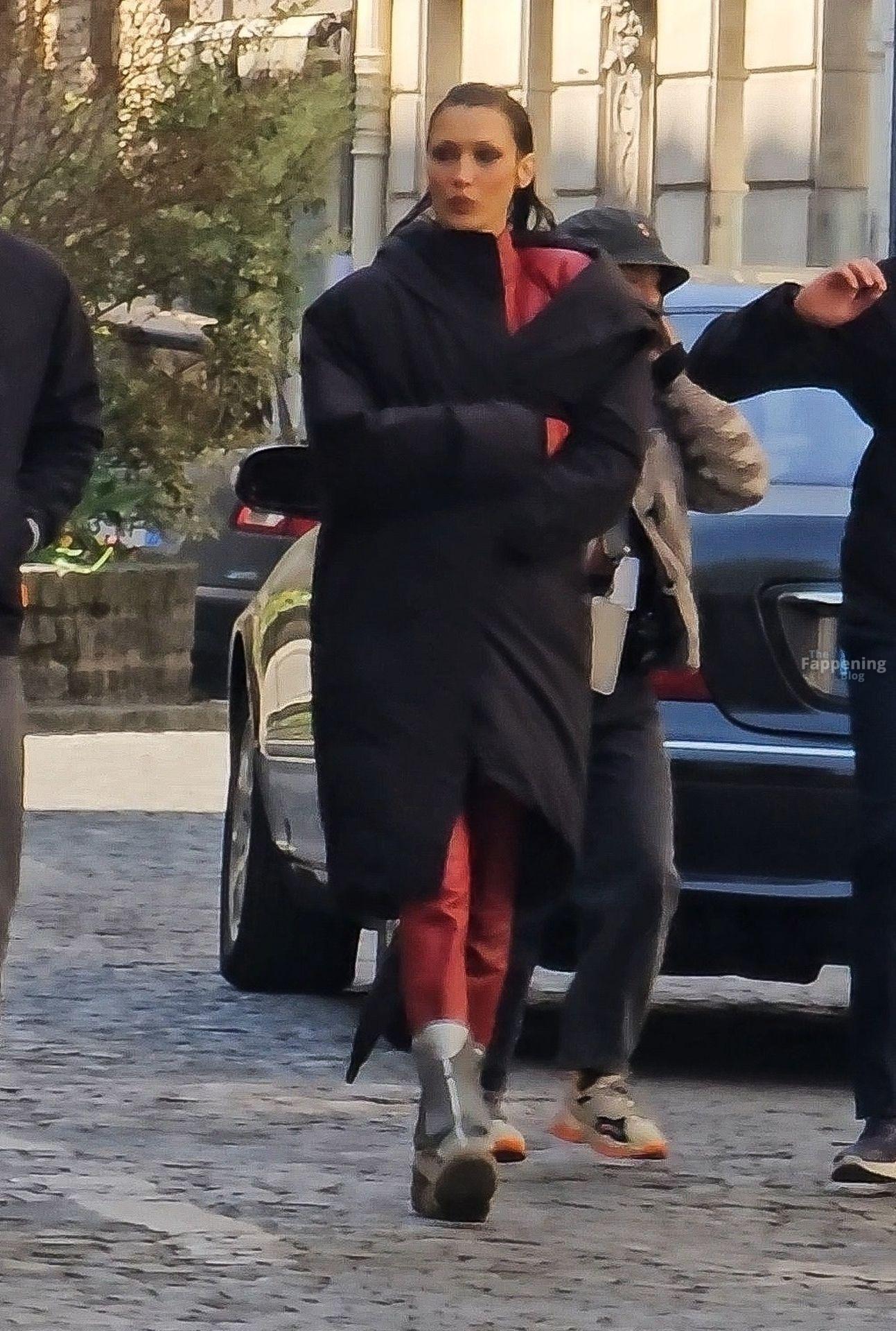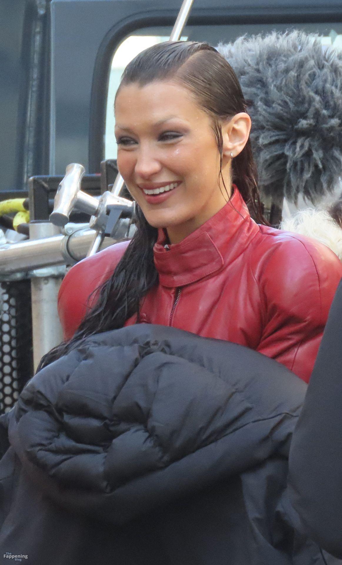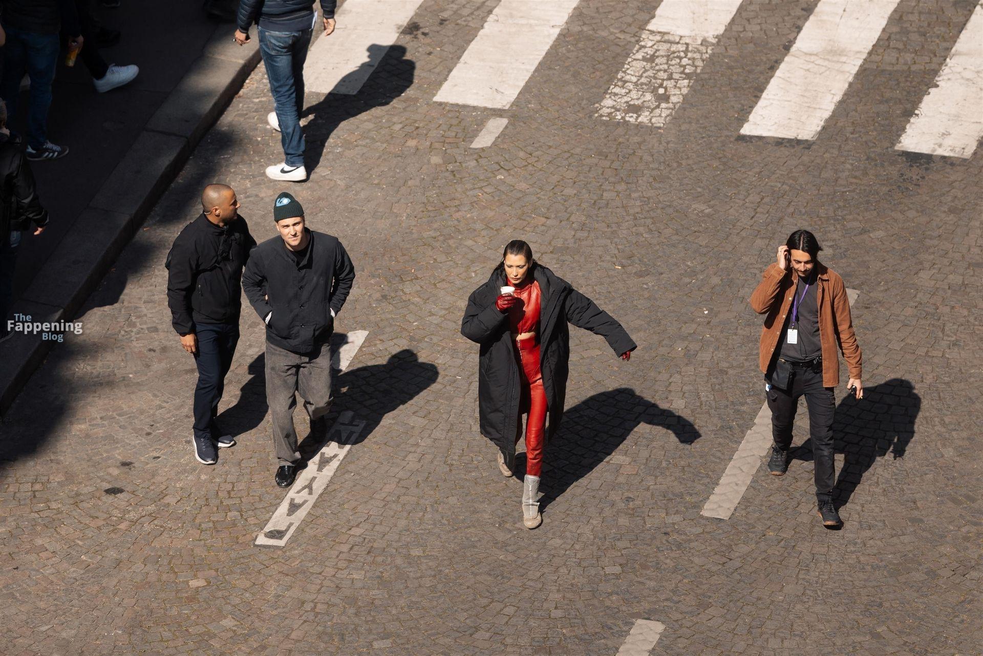 Bella Hadid es fotografiada en París, luciendo un mono de cuero rojo fuego y montando una moto. Después de ese loco accidente con el maniquí, está interpretando un papel duro con una fea lesión en la pierna para una escena en la serie “The Beauty” en París, Francia.