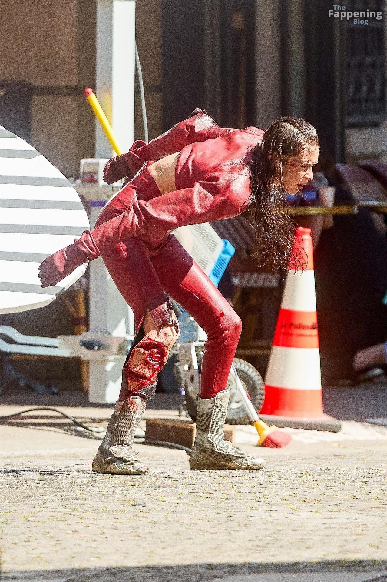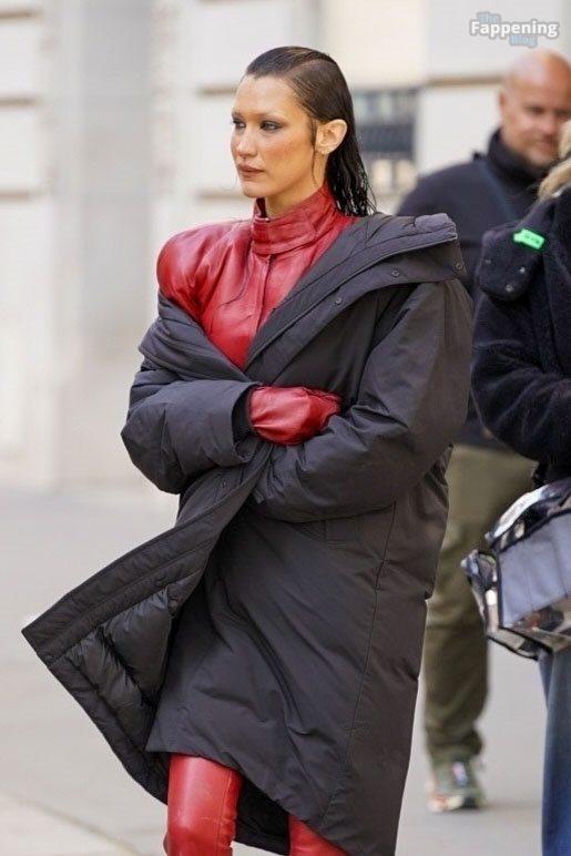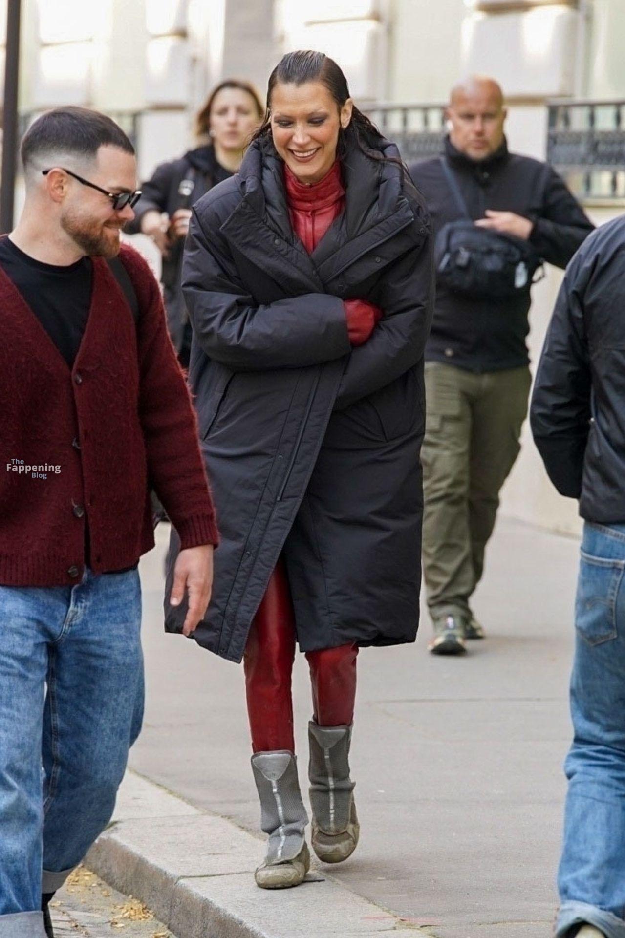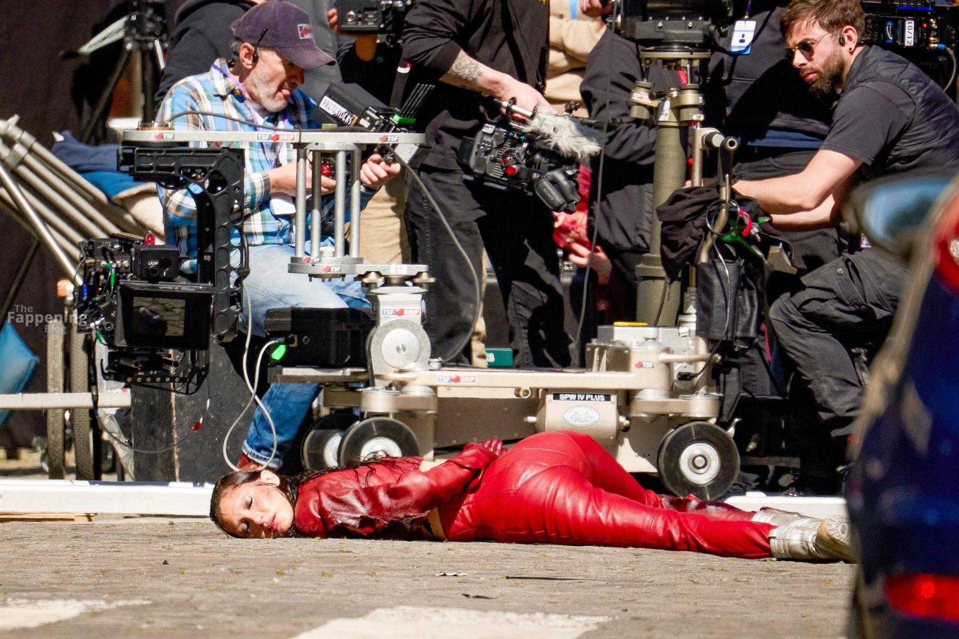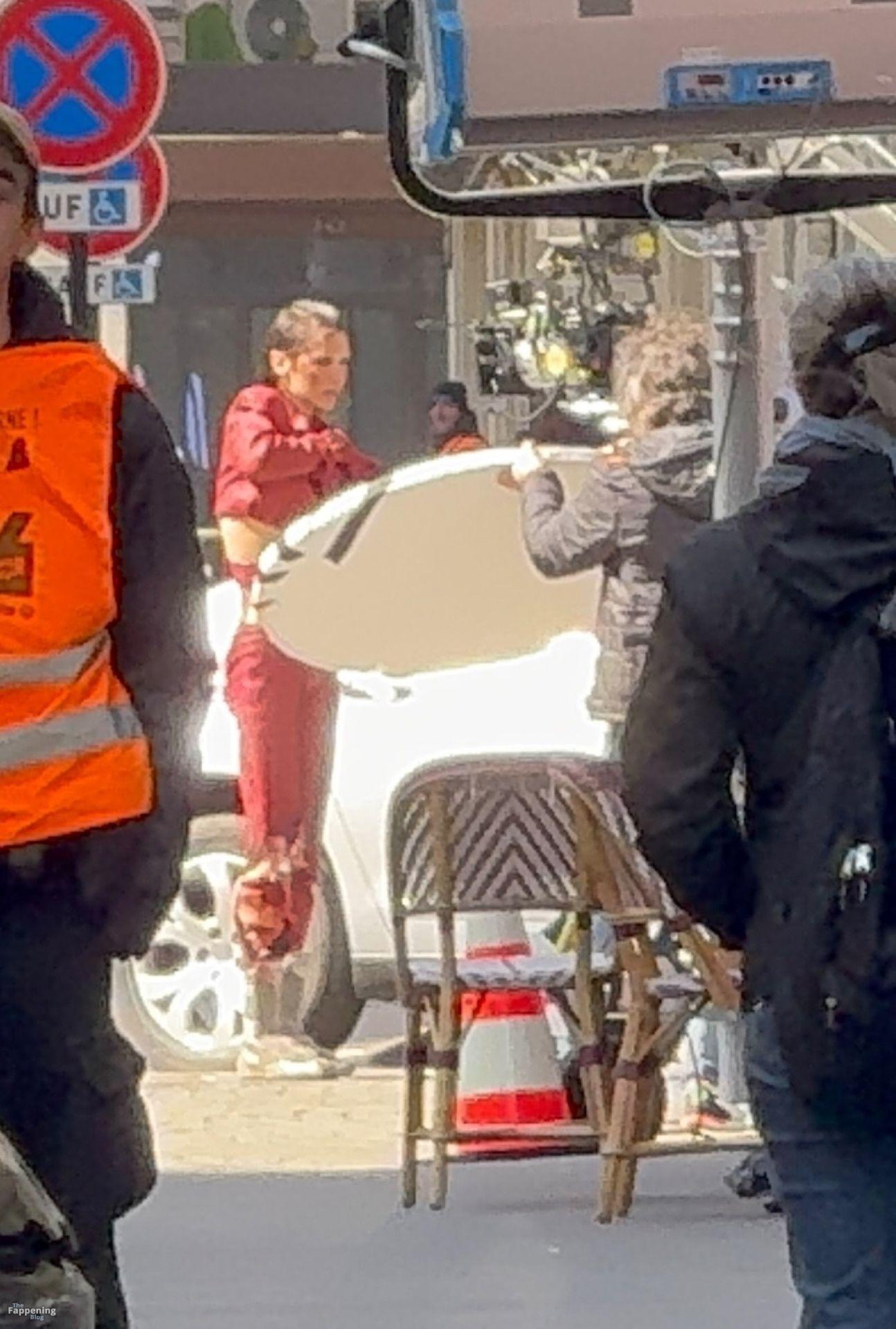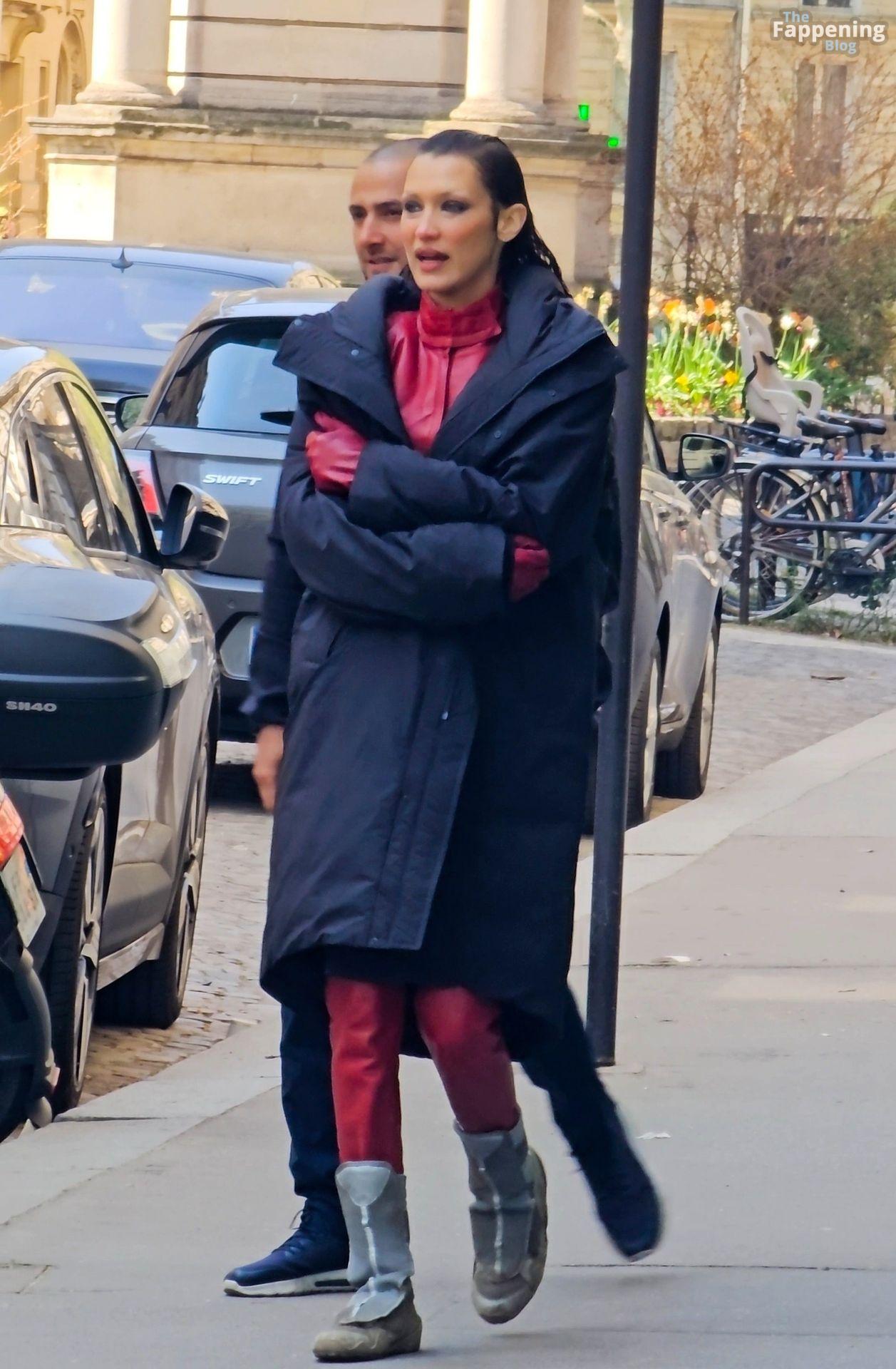 Bella Hadid es fotografiada en París, luciendo un mono de cuero rojo fuego y montando una moto. Después de ese loco accidente con el maniquí, está interpretando un papel duro con una fea lesión en la pierna para una escena en la serie “The Beauty” en París, Francia.