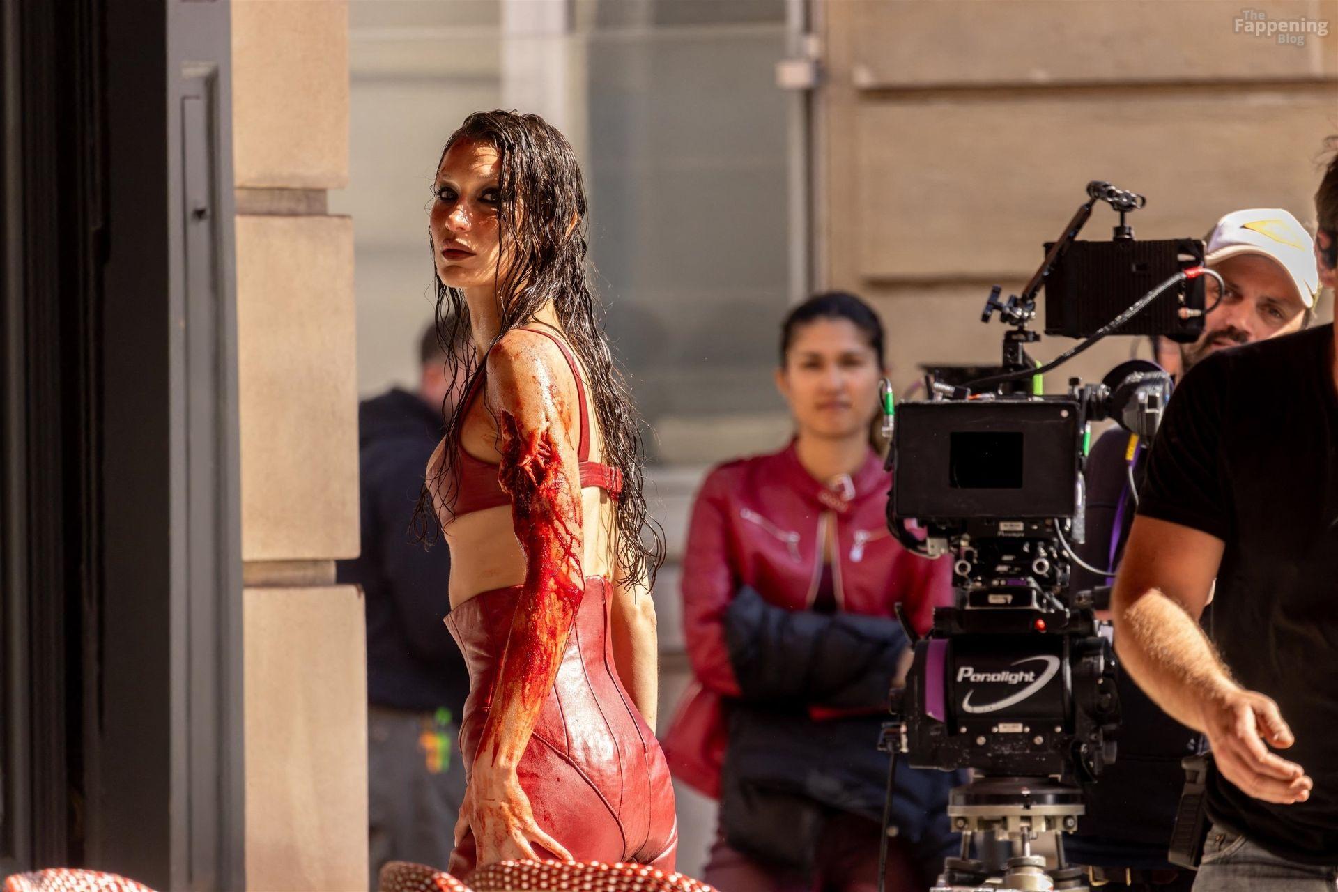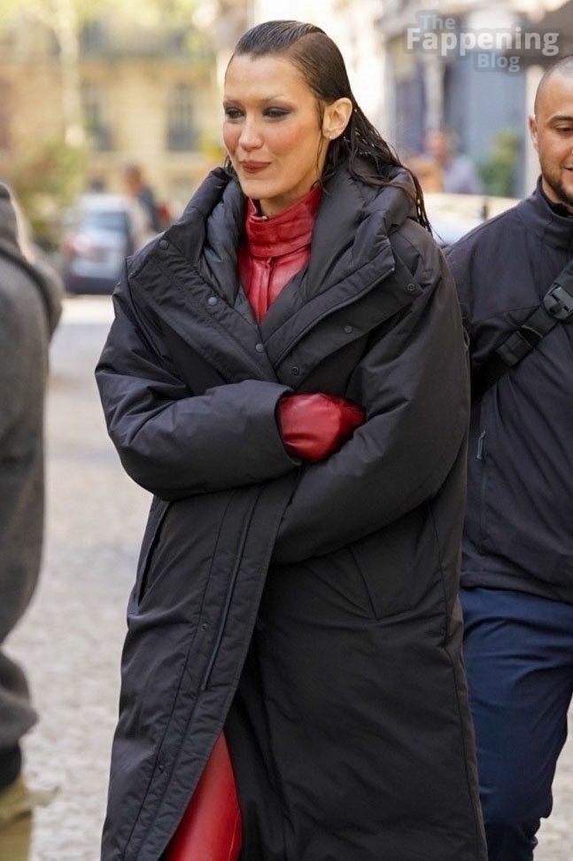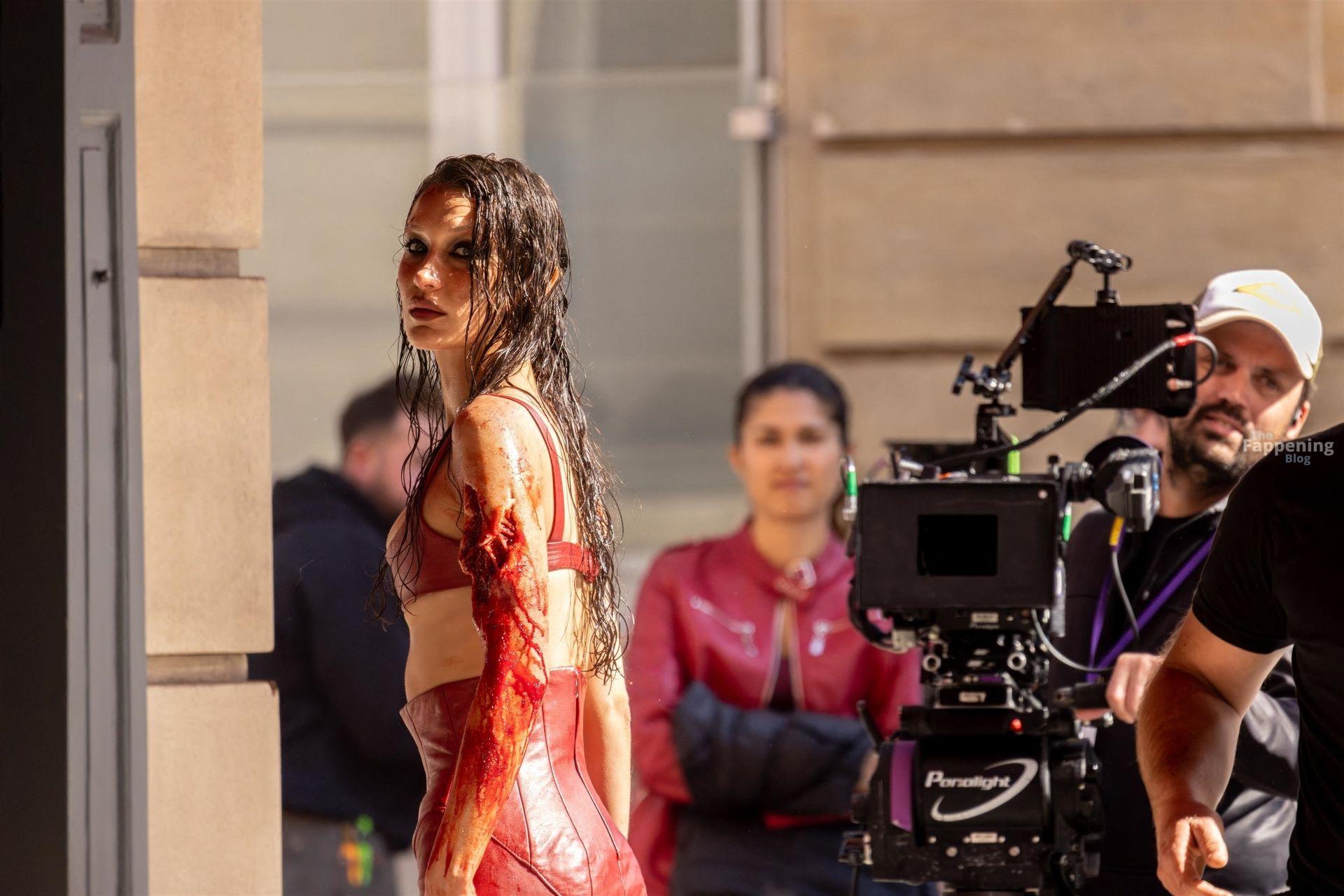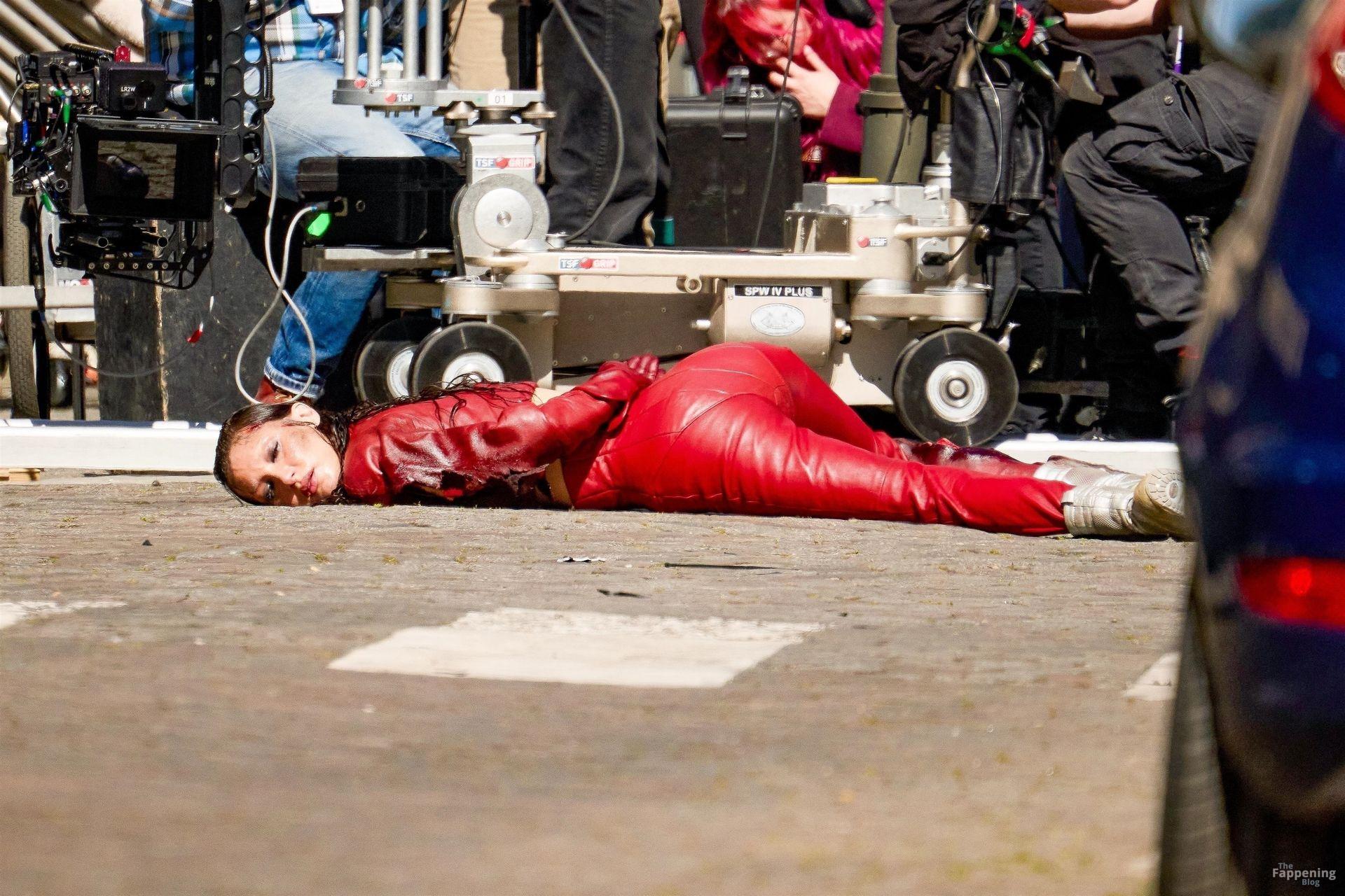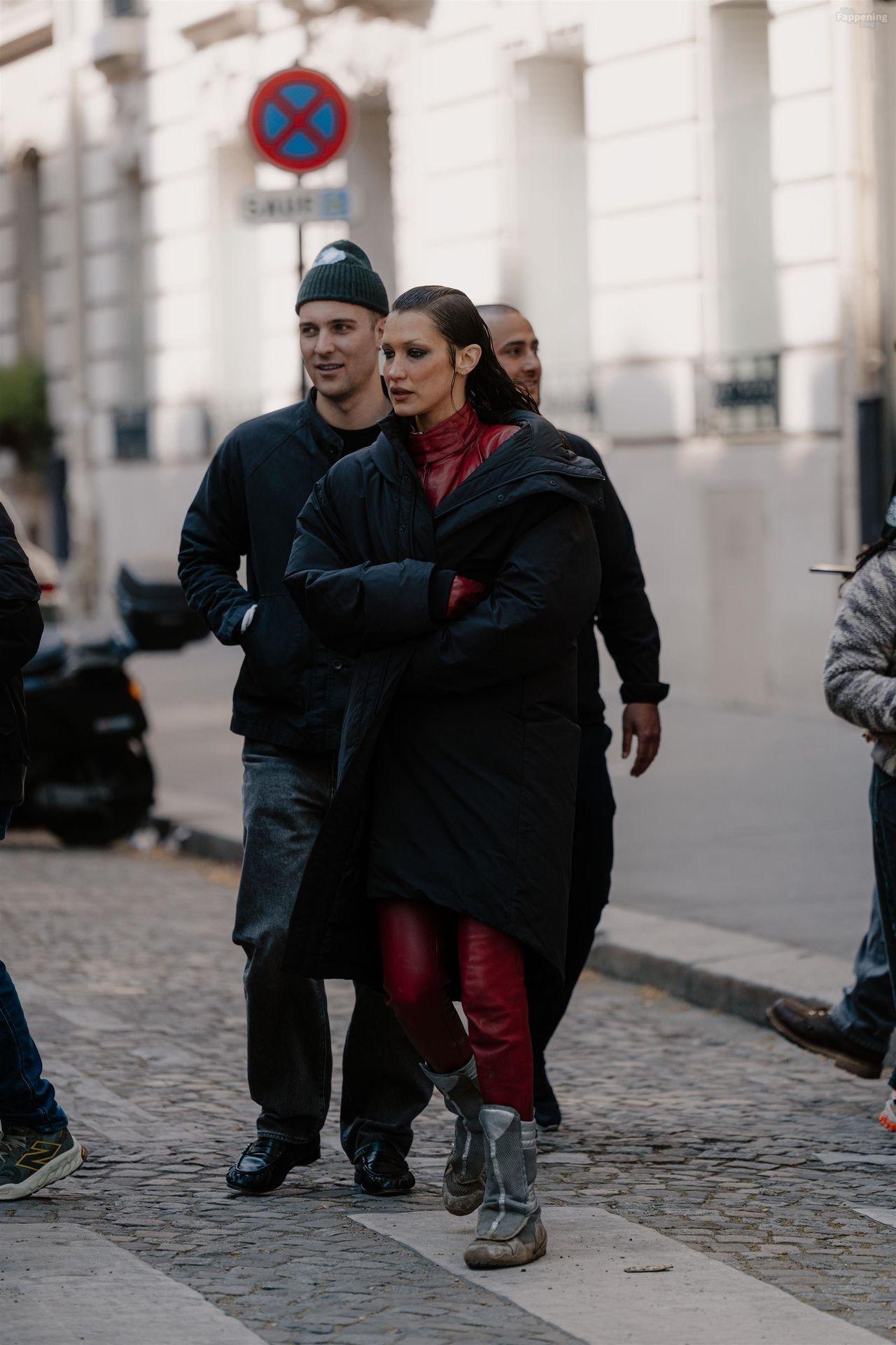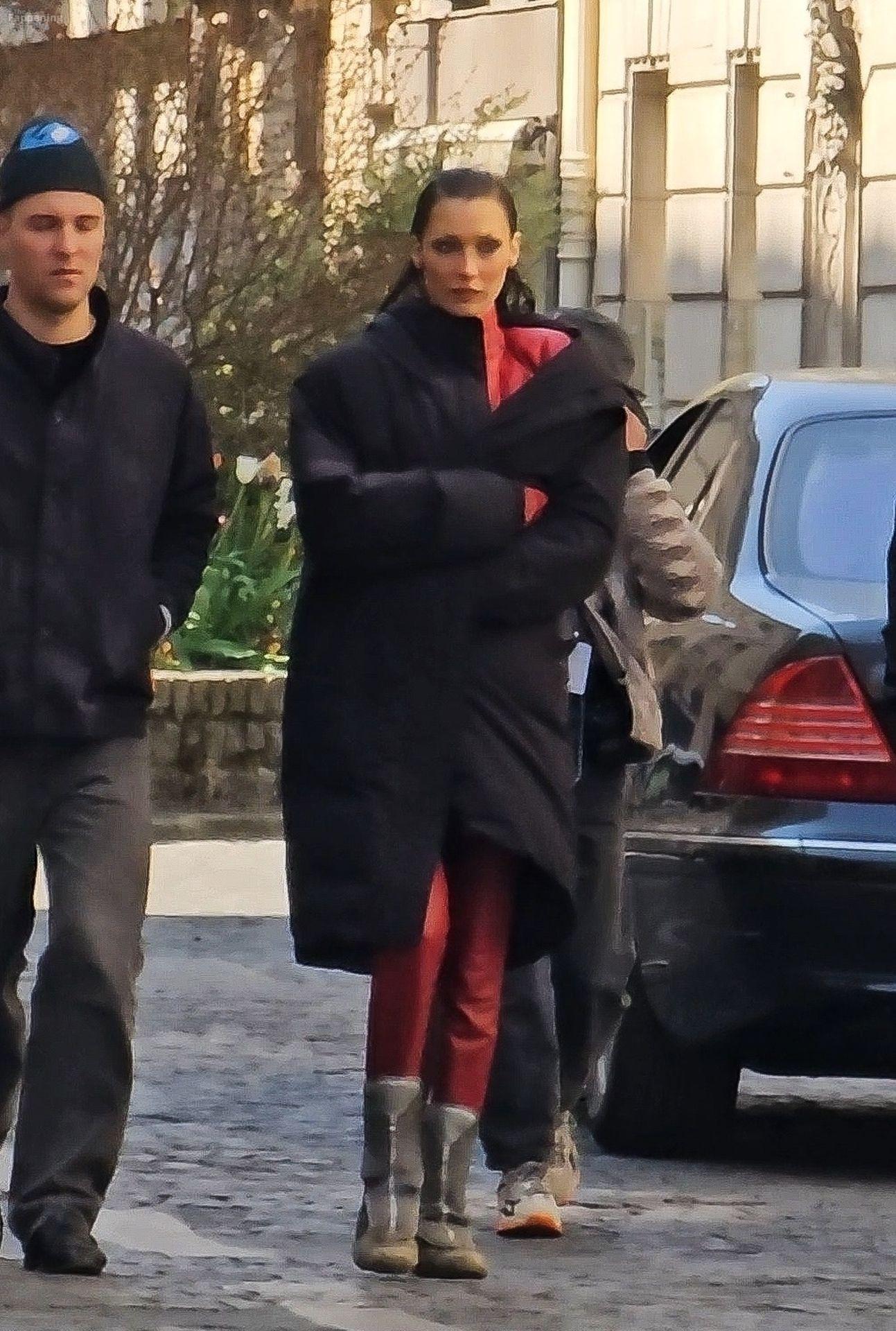 Bella Hadid es fotografiada en París, luciendo un mono de cuero rojo fuego y montando una moto. Después de ese loco accidente con el maniquí, está interpretando un papel duro con una fea lesión en la pierna para una escena en la serie “The Beauty” en París, Francia.