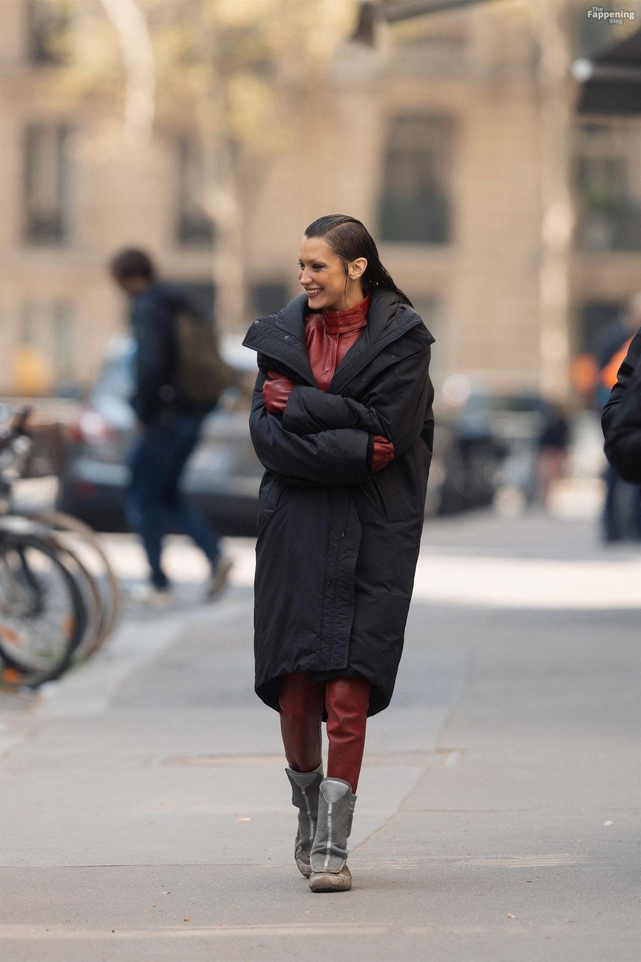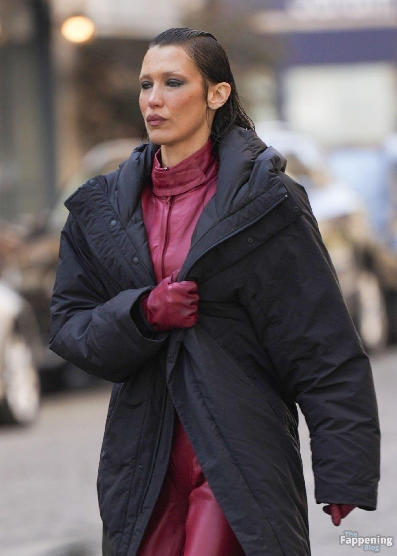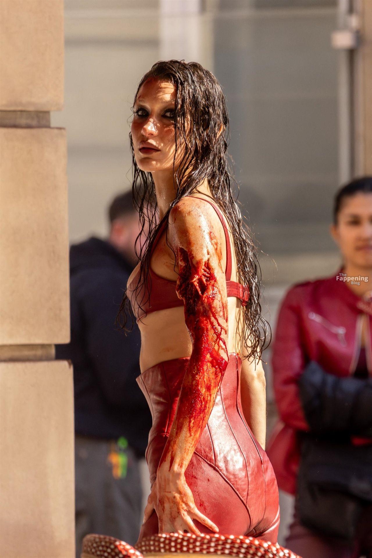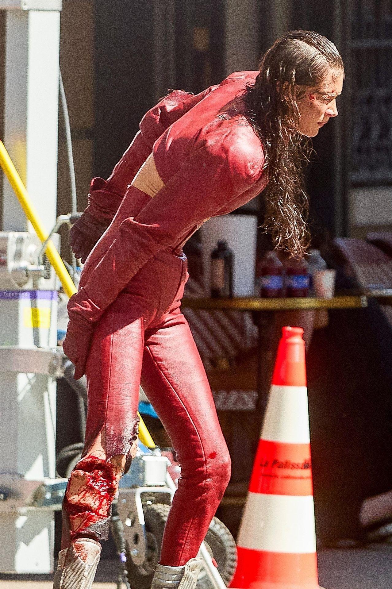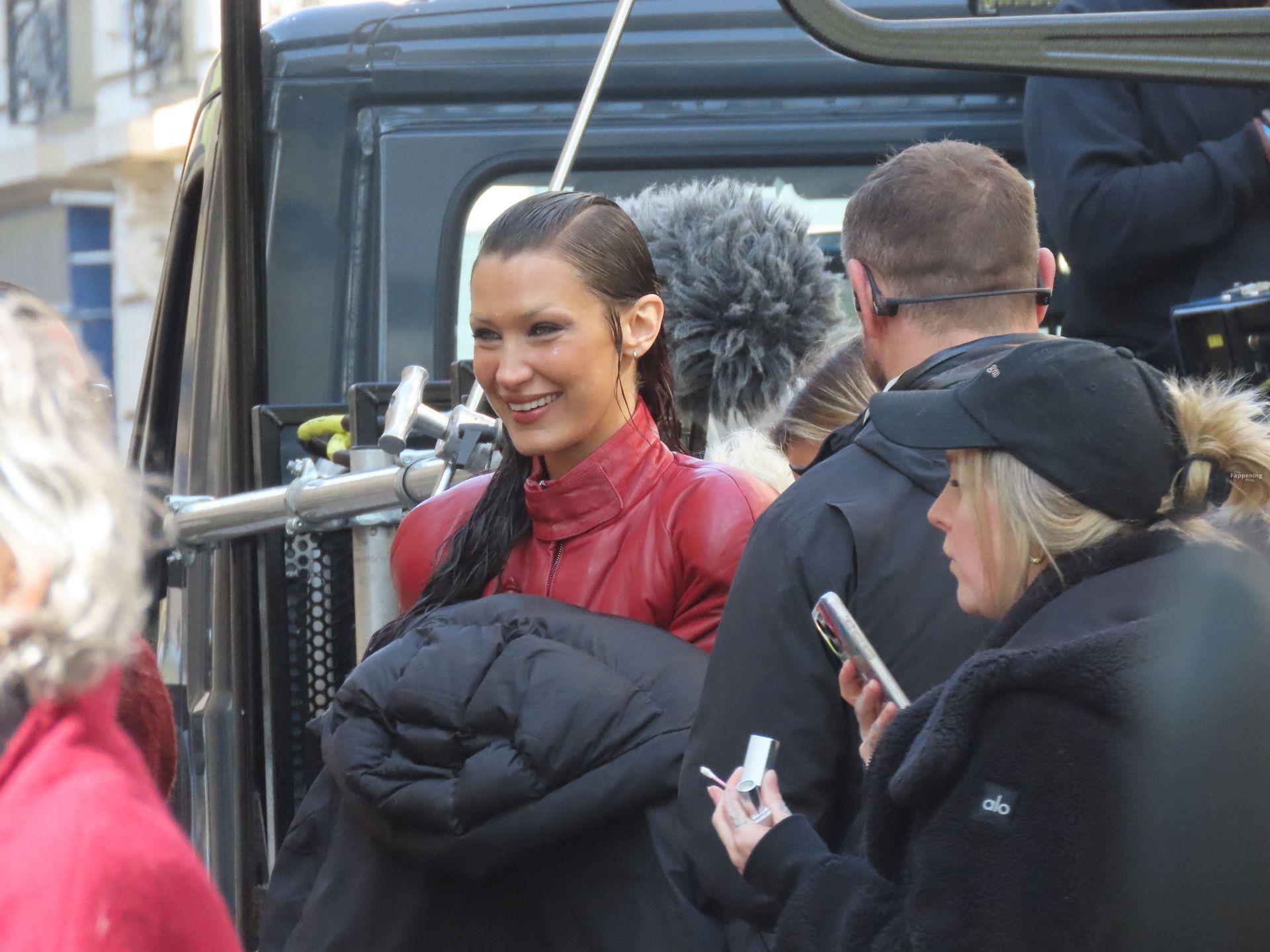 Bella Hadid es fotografiada en París, luciendo un mono de cuero rojo fuego y montando una moto. Después de ese loco accidente con el maniquí, está interpretando un papel duro con una fea lesión en la pierna para una escena en la serie “The Beauty” en París, Francia.
