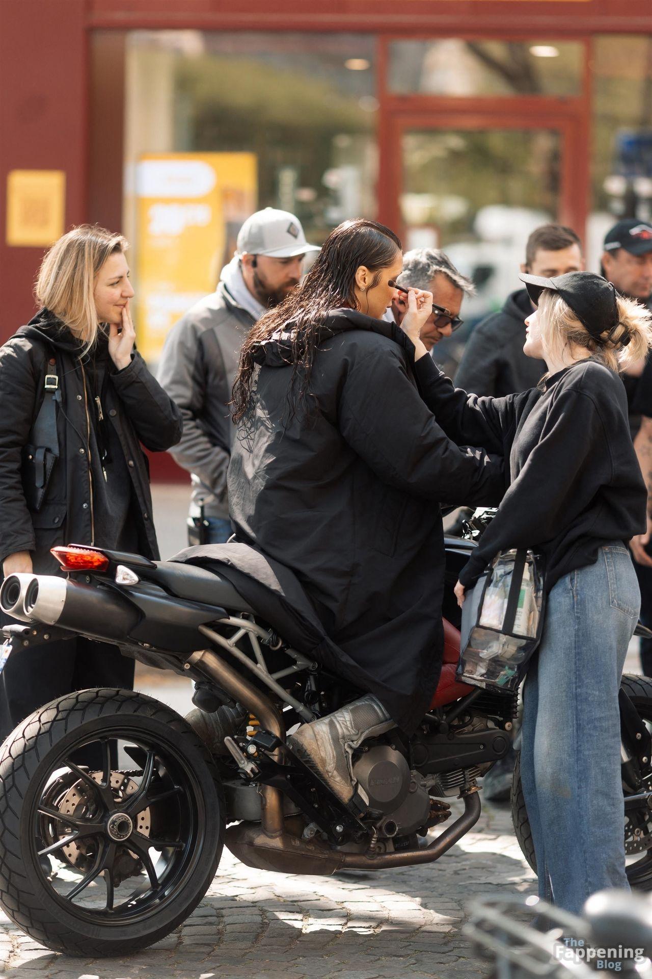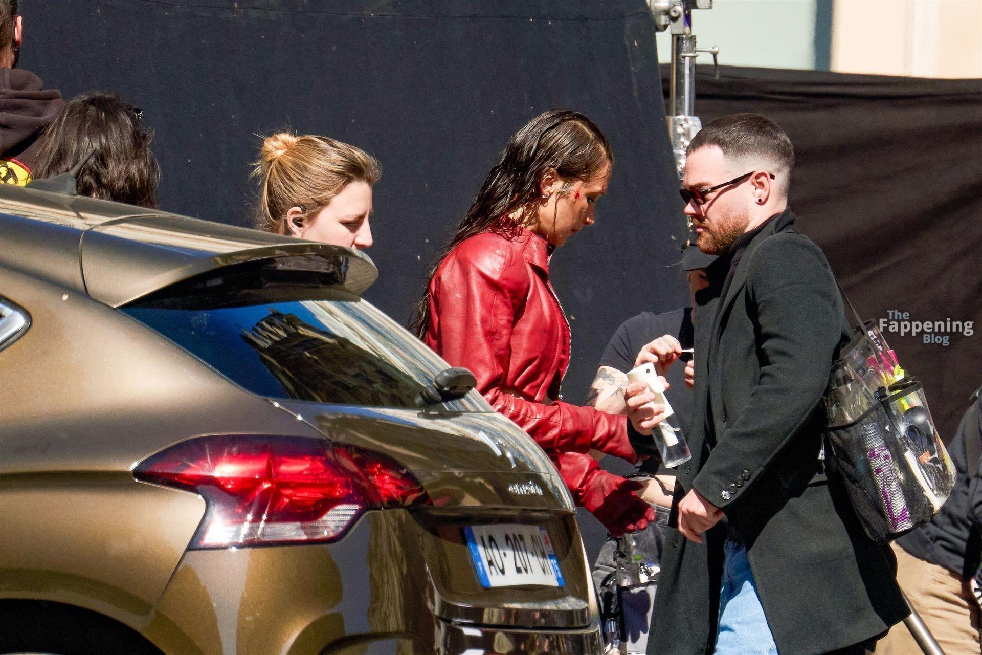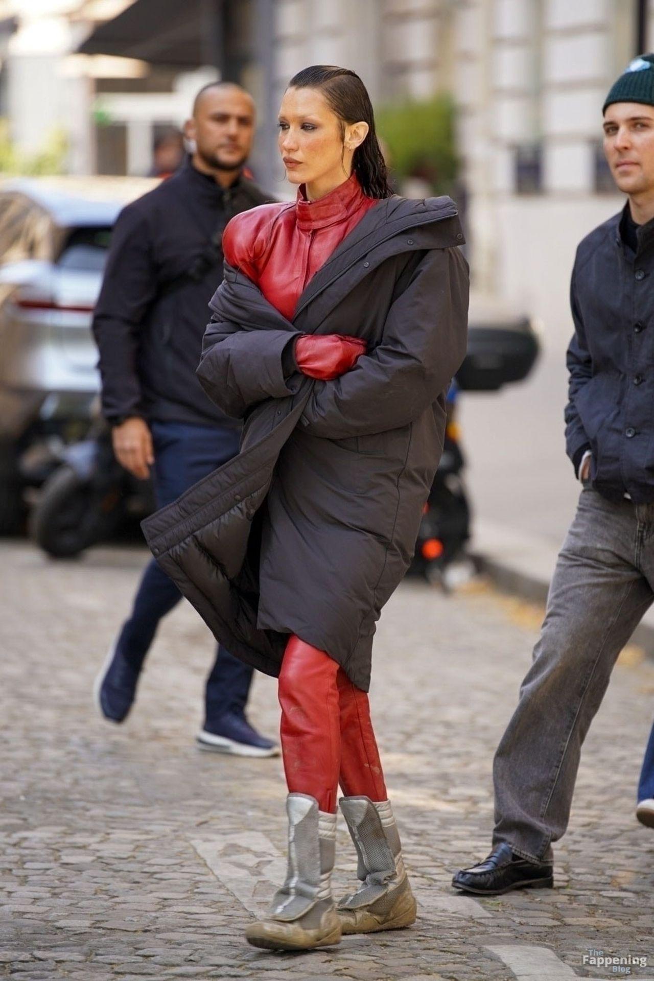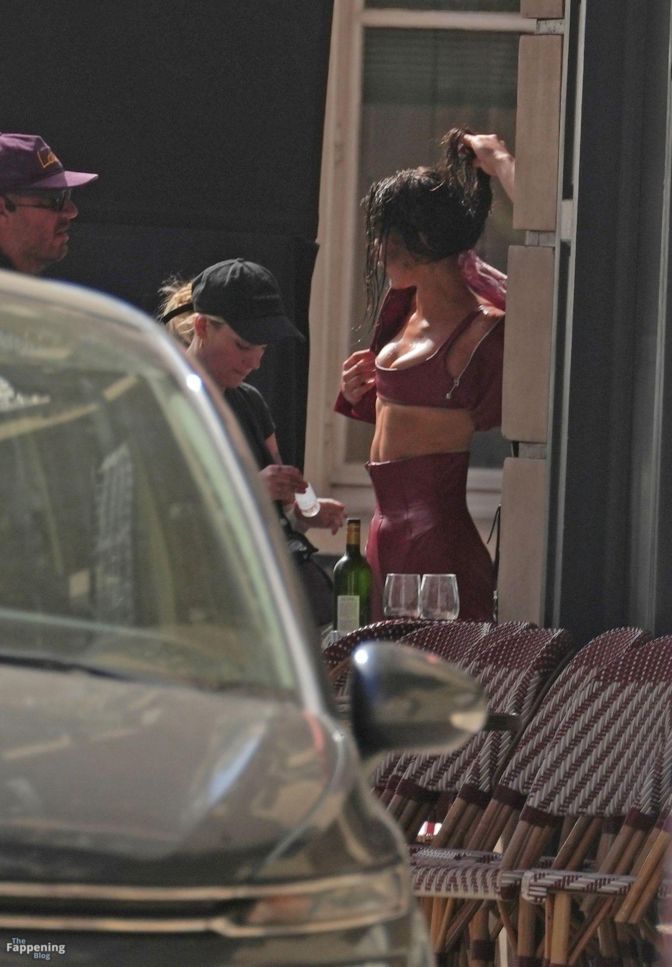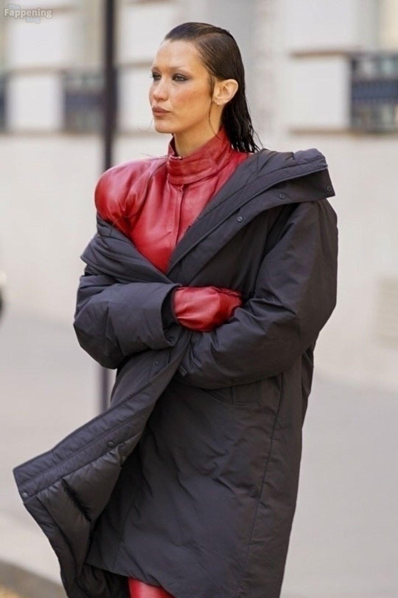 Bella Hadid es fotografiada en París, luciendo un mono de cuero rojo fuego y montando una moto. Después de ese loco accidente con el maniquí, está interpretando un papel duro con una fea lesión en la pierna para una escena en la serie “The Beauty” en París, Francia.