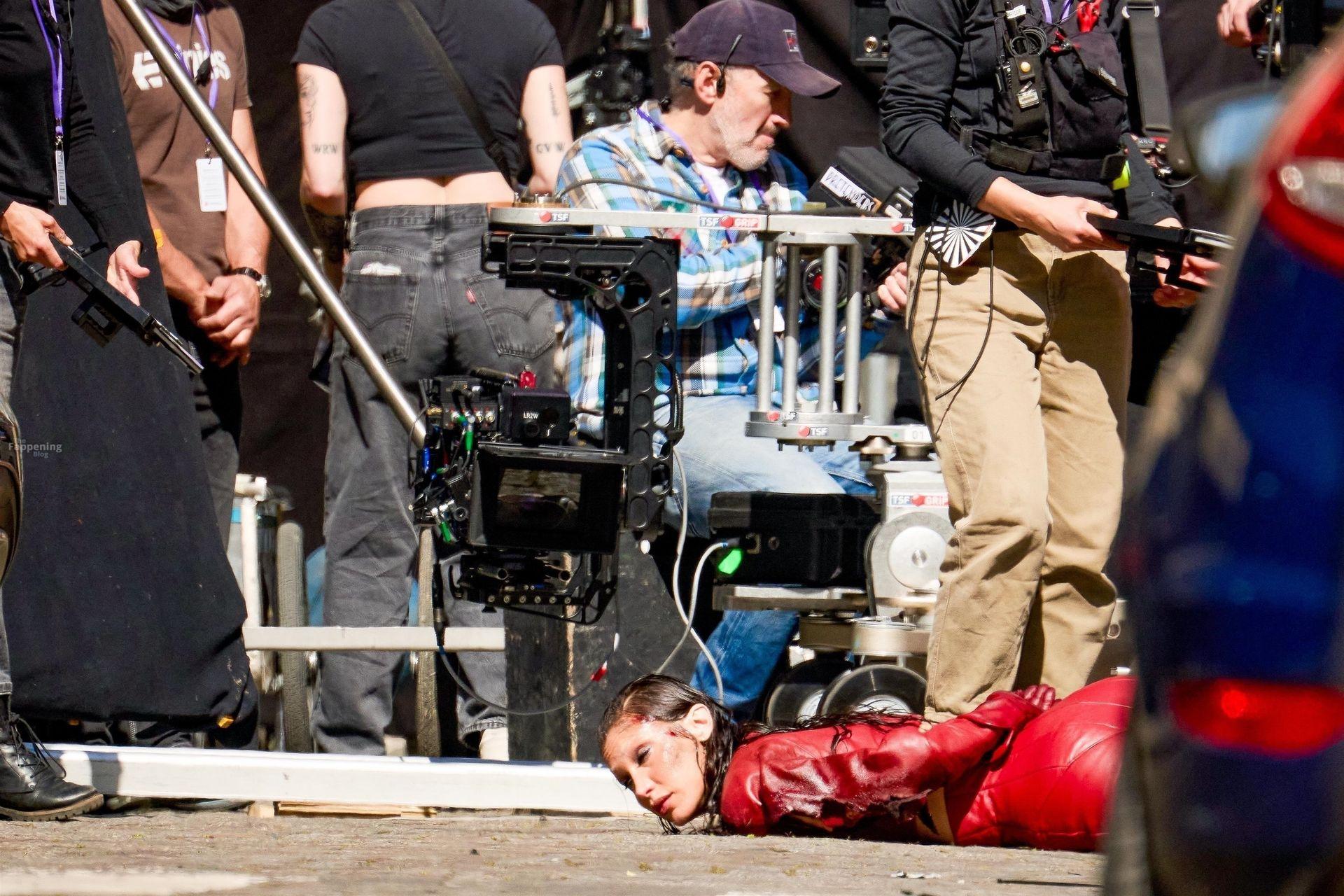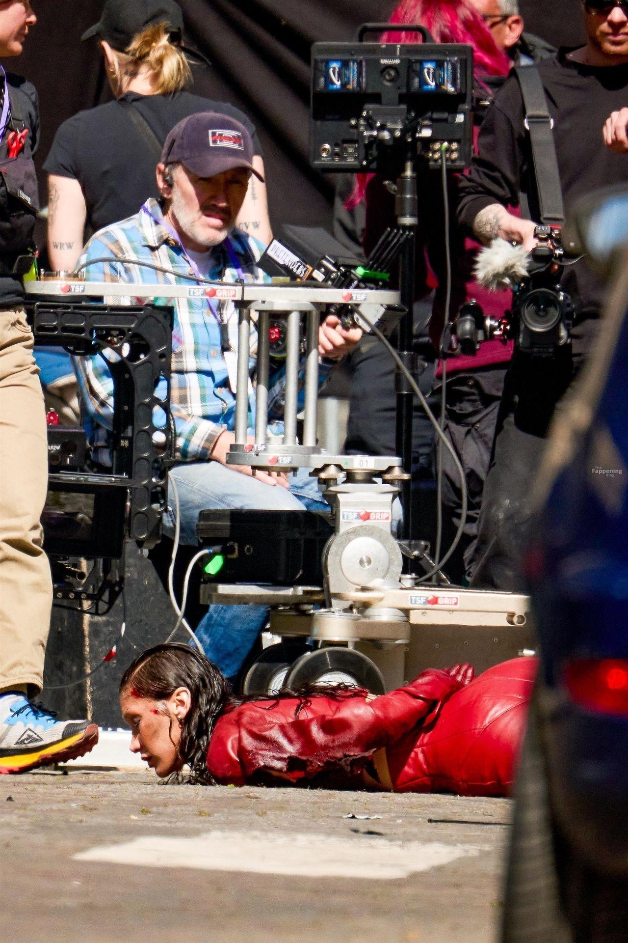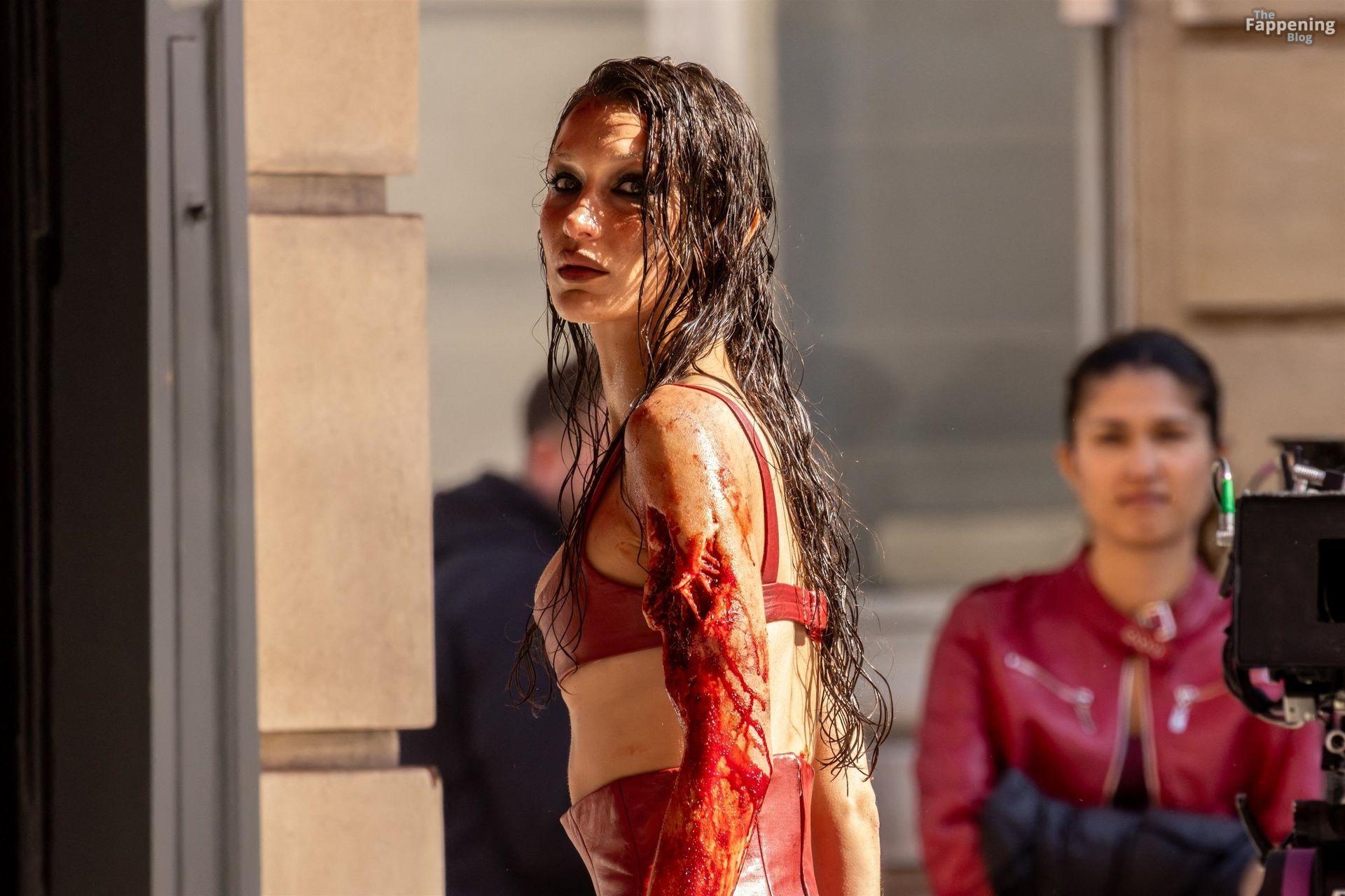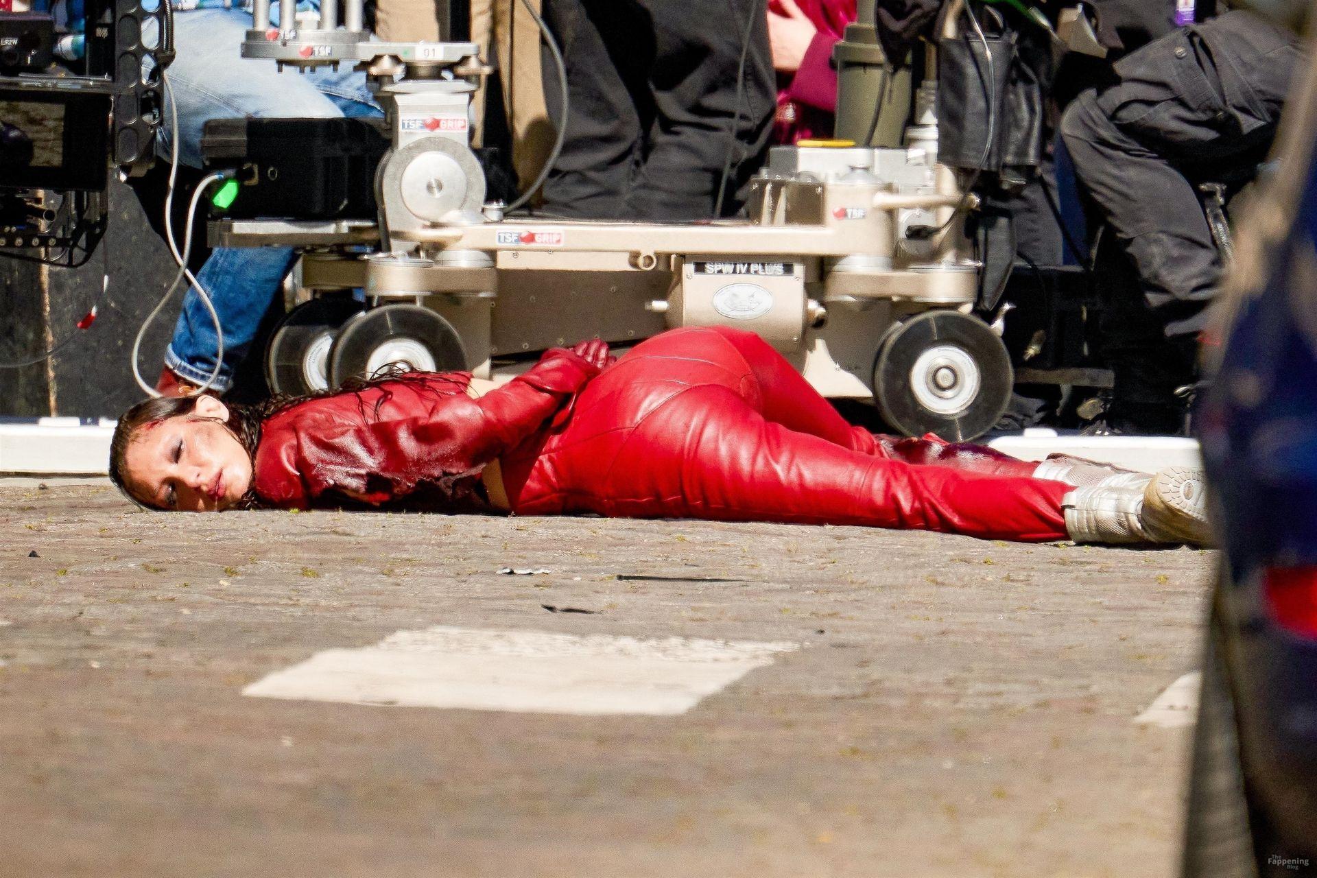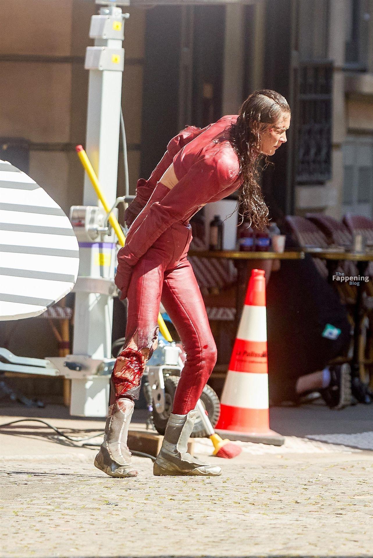 Bella Hadid es fotografiada en París, luciendo un mono de cuero rojo fuego y montando una moto. Después de ese loco accidente con el maniquí, está interpretando un papel duro con una fea lesión en la pierna para una escena en la serie “The Beauty” en París, Francia.