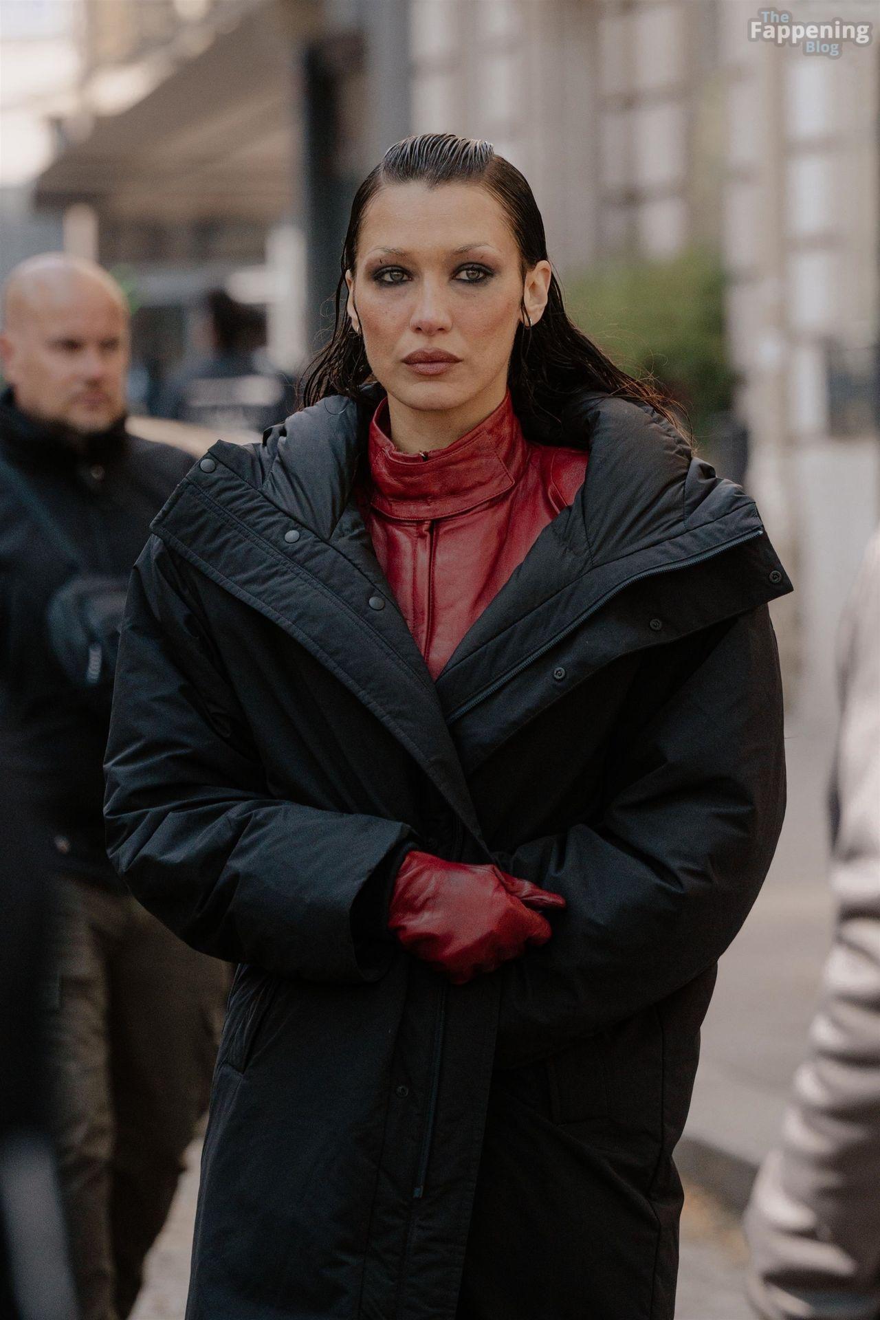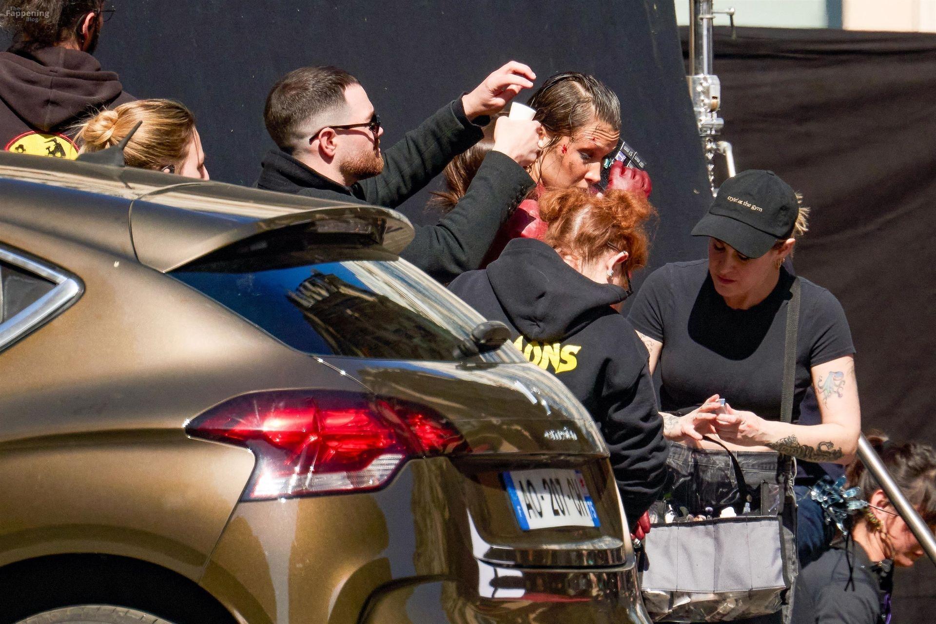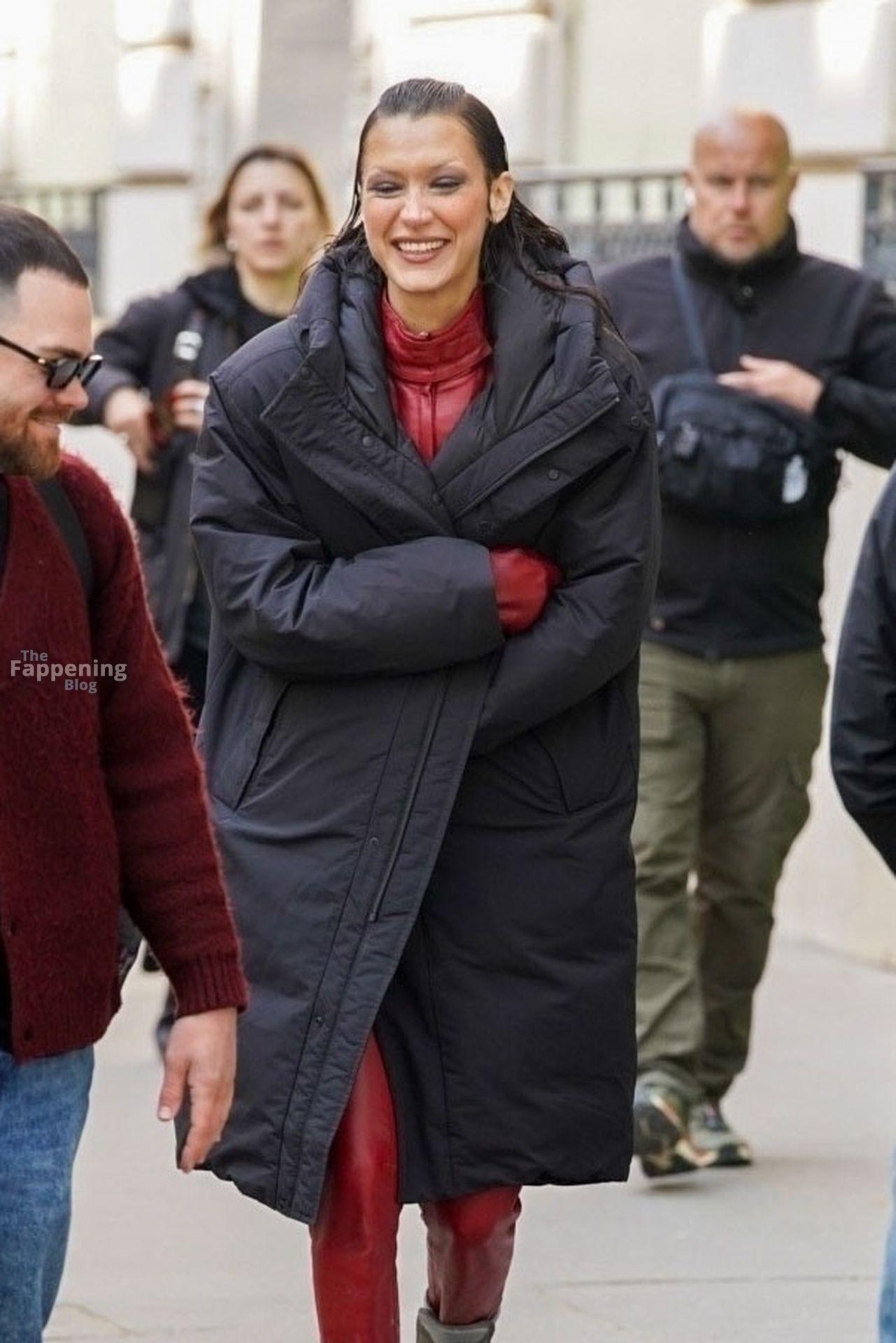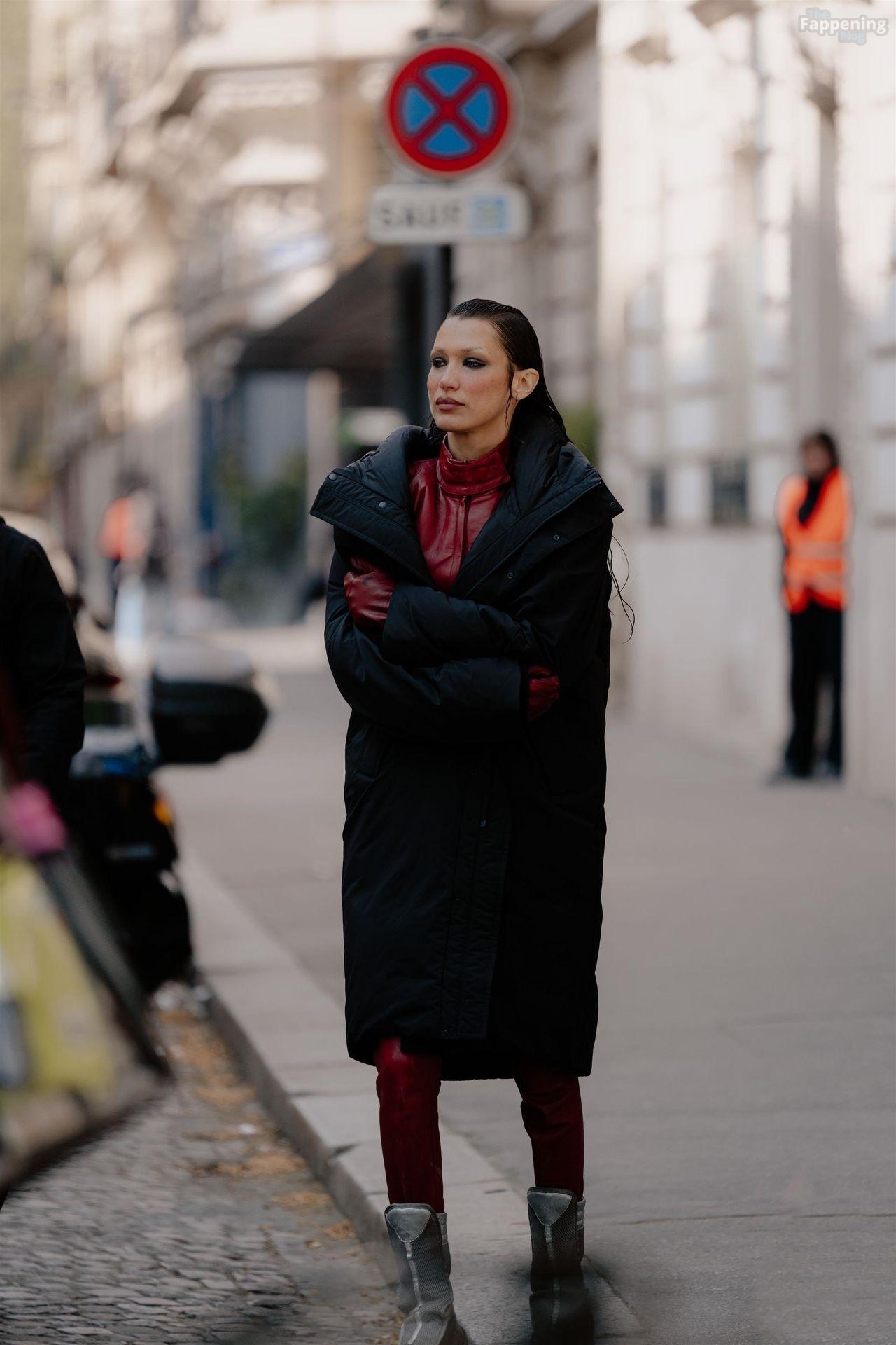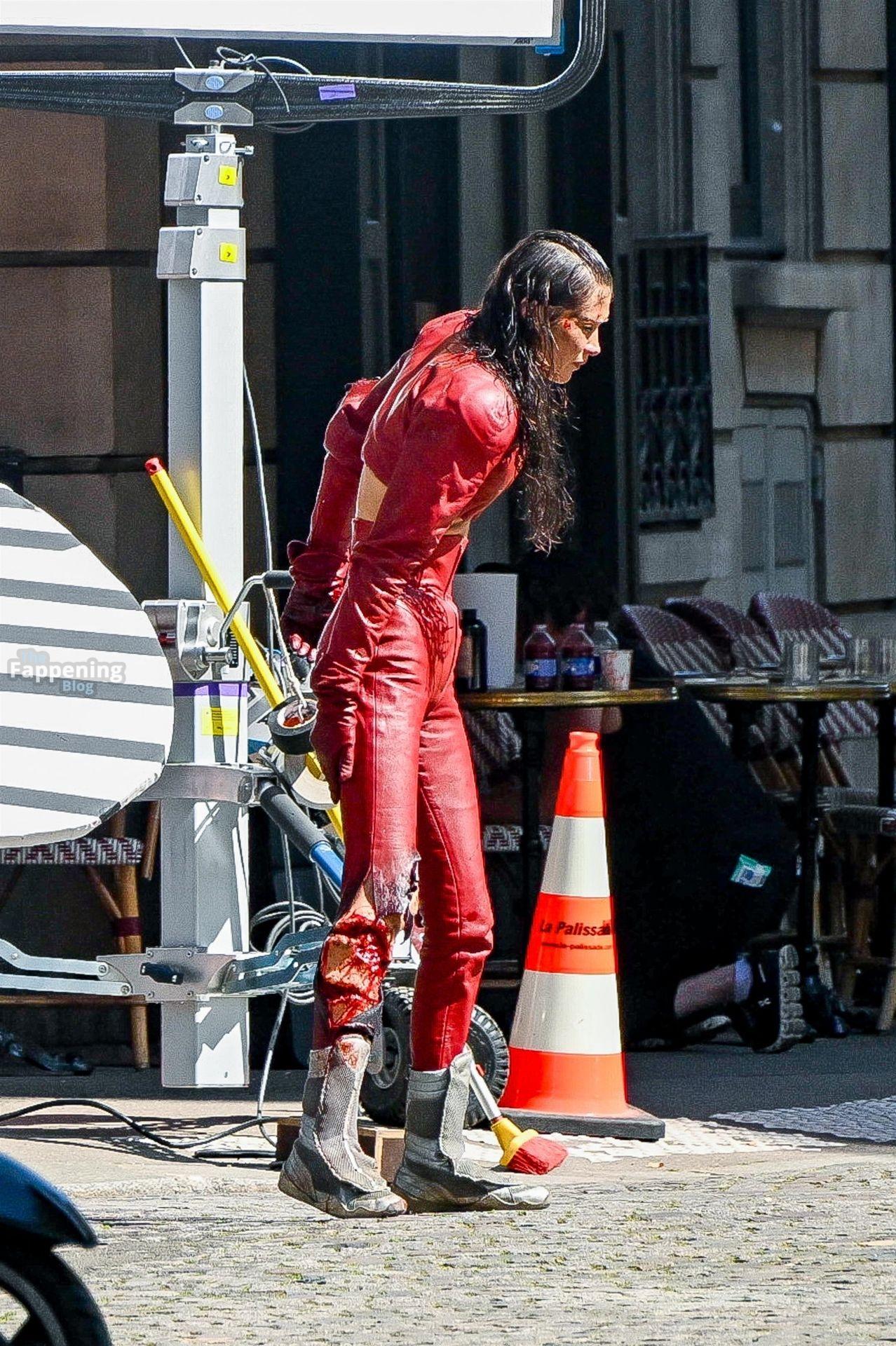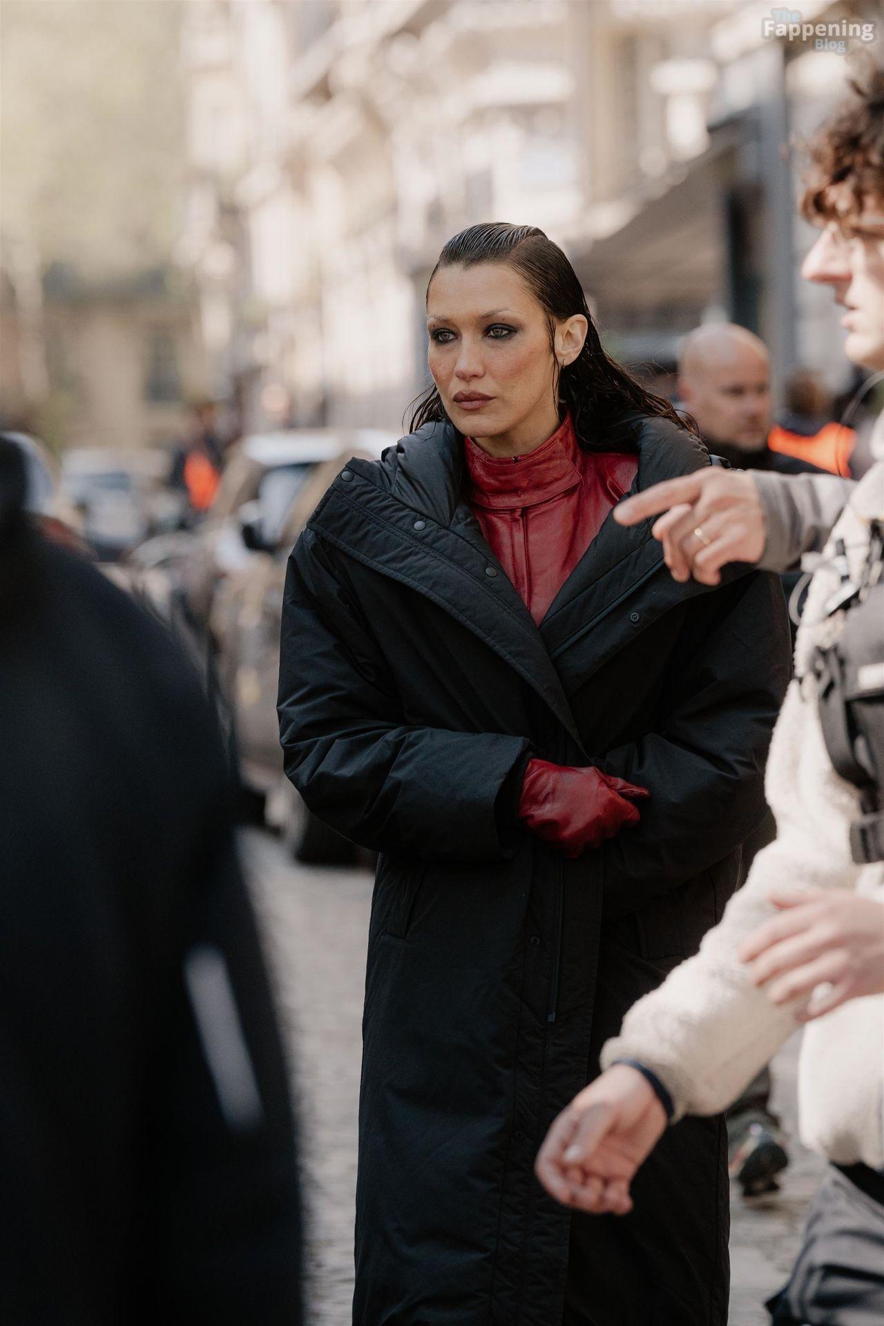 Bella Hadid es fotografiada en París, luciendo un mono de cuero rojo fuego y montando una moto. Después de ese loco accidente con el maniquí, está interpretando un papel duro con una fea lesión en la pierna para una escena en la serie “The Beauty” en París, Francia.