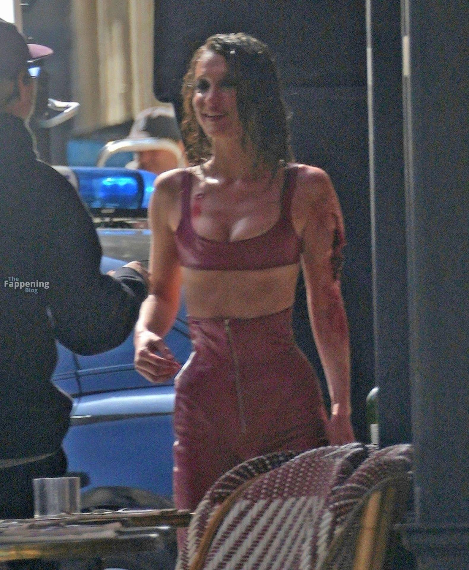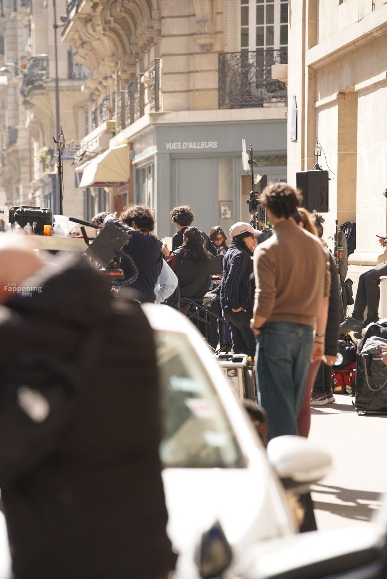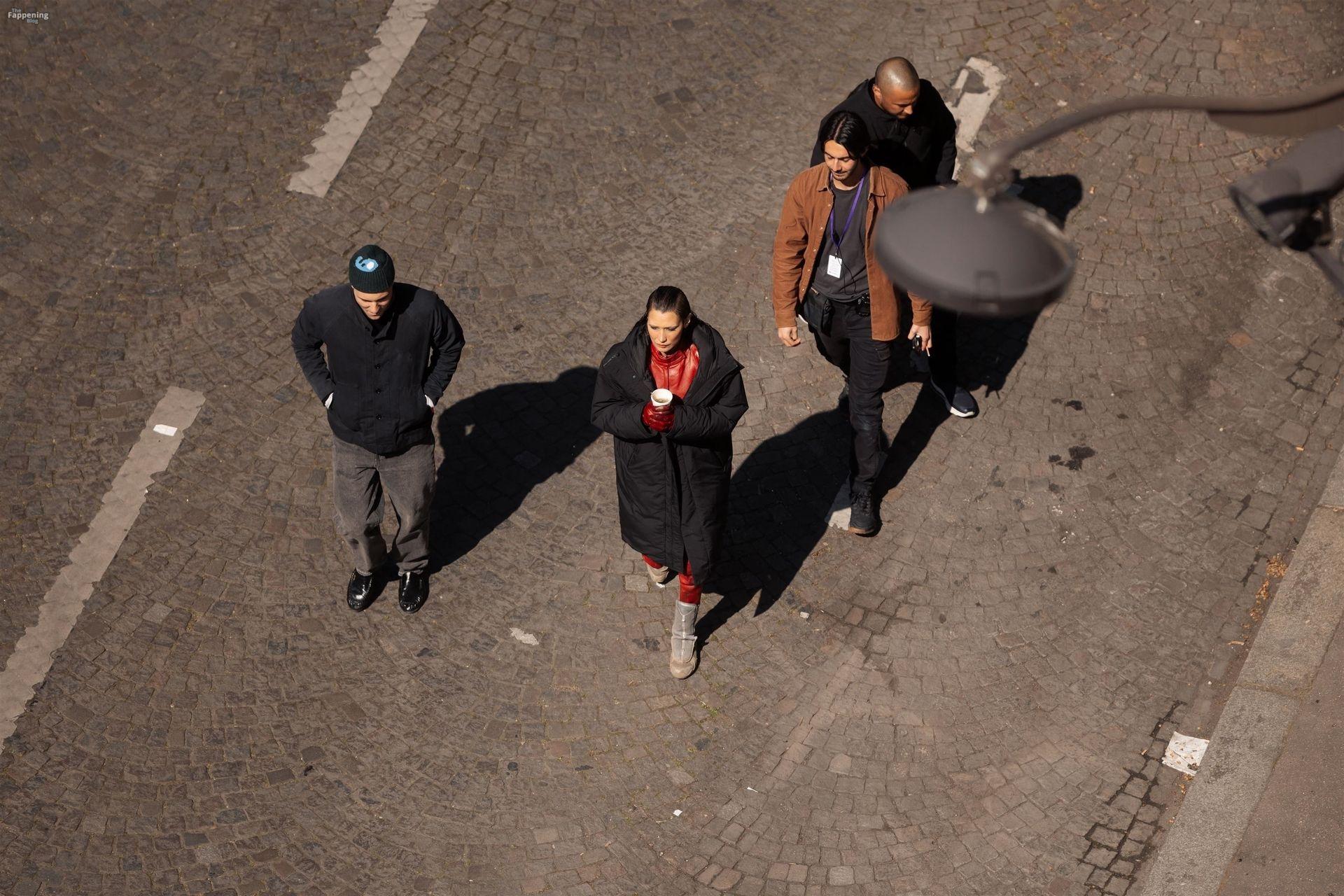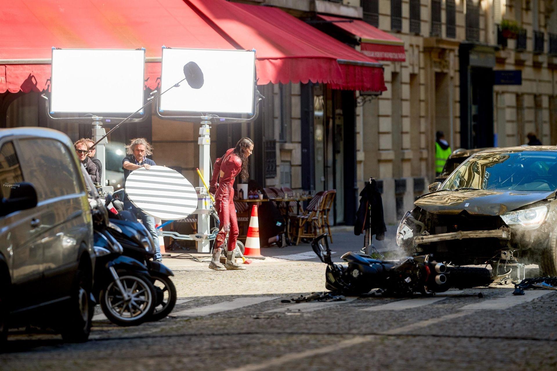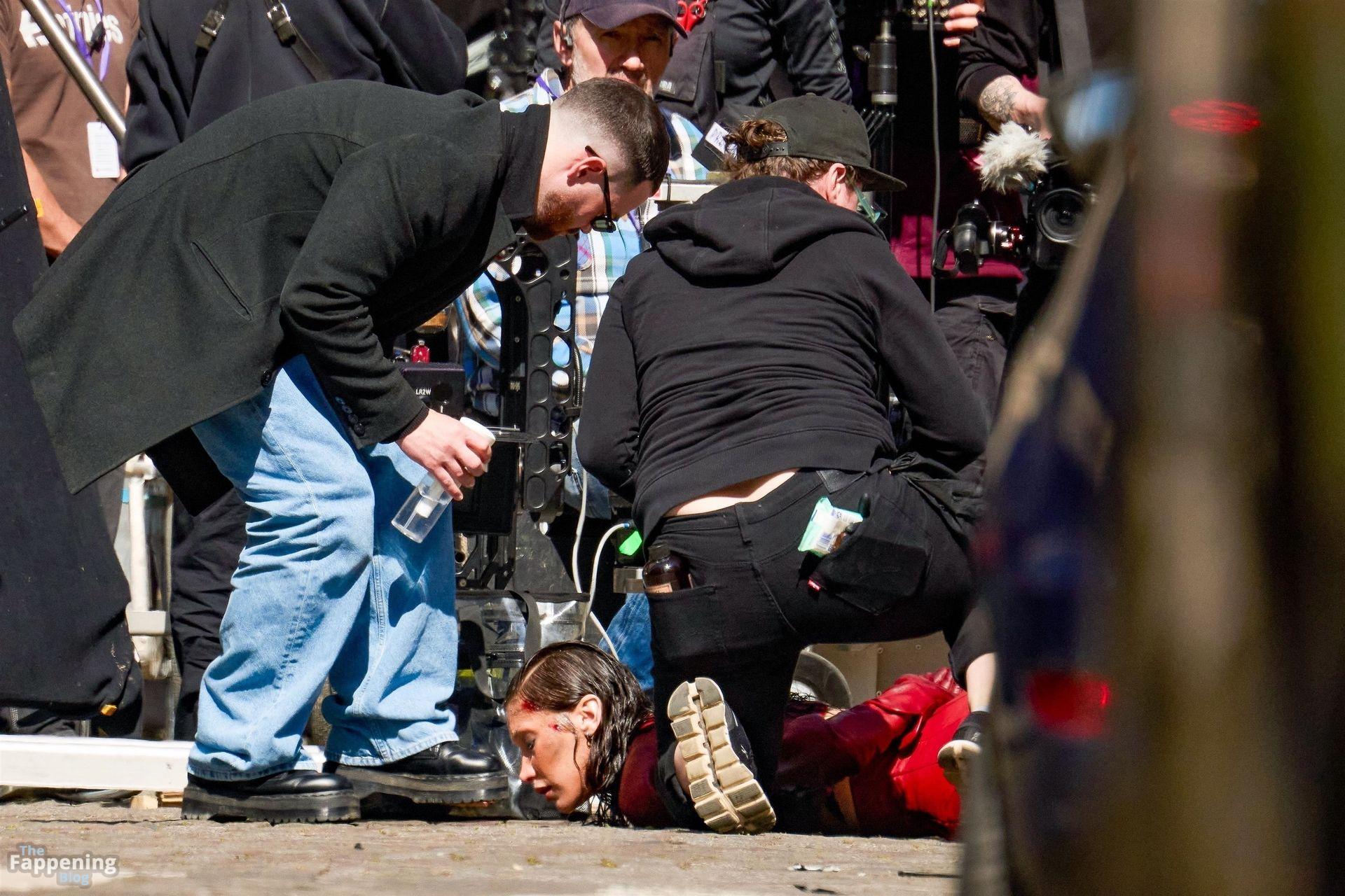 Bella Hadid es fotografiada en París, luciendo un mono de cuero rojo fuego y montando una moto. Después de ese loco accidente con el maniquí, está interpretando un papel duro con una fea lesión en la pierna para una escena en la serie “The Beauty” en París, Francia.